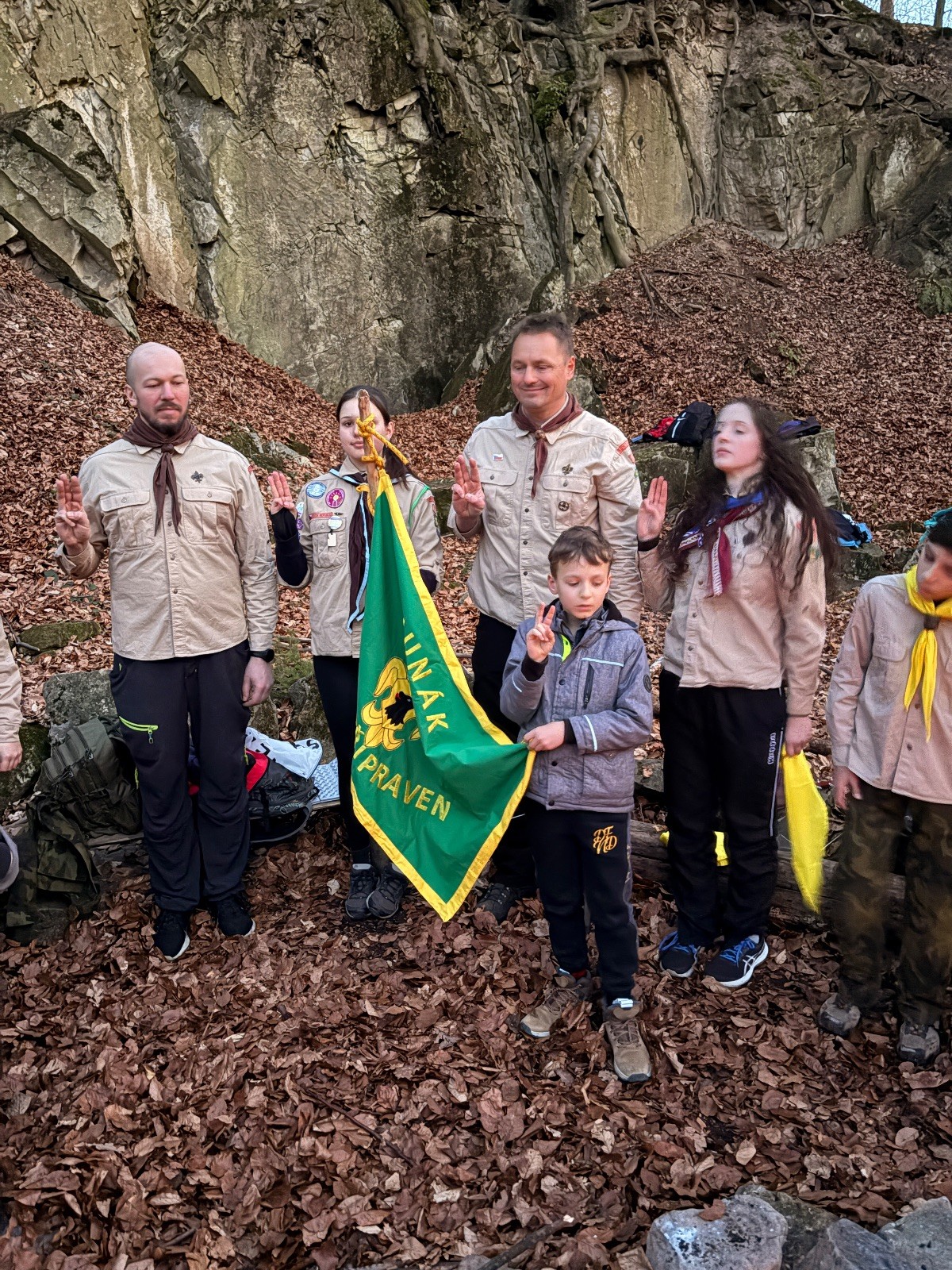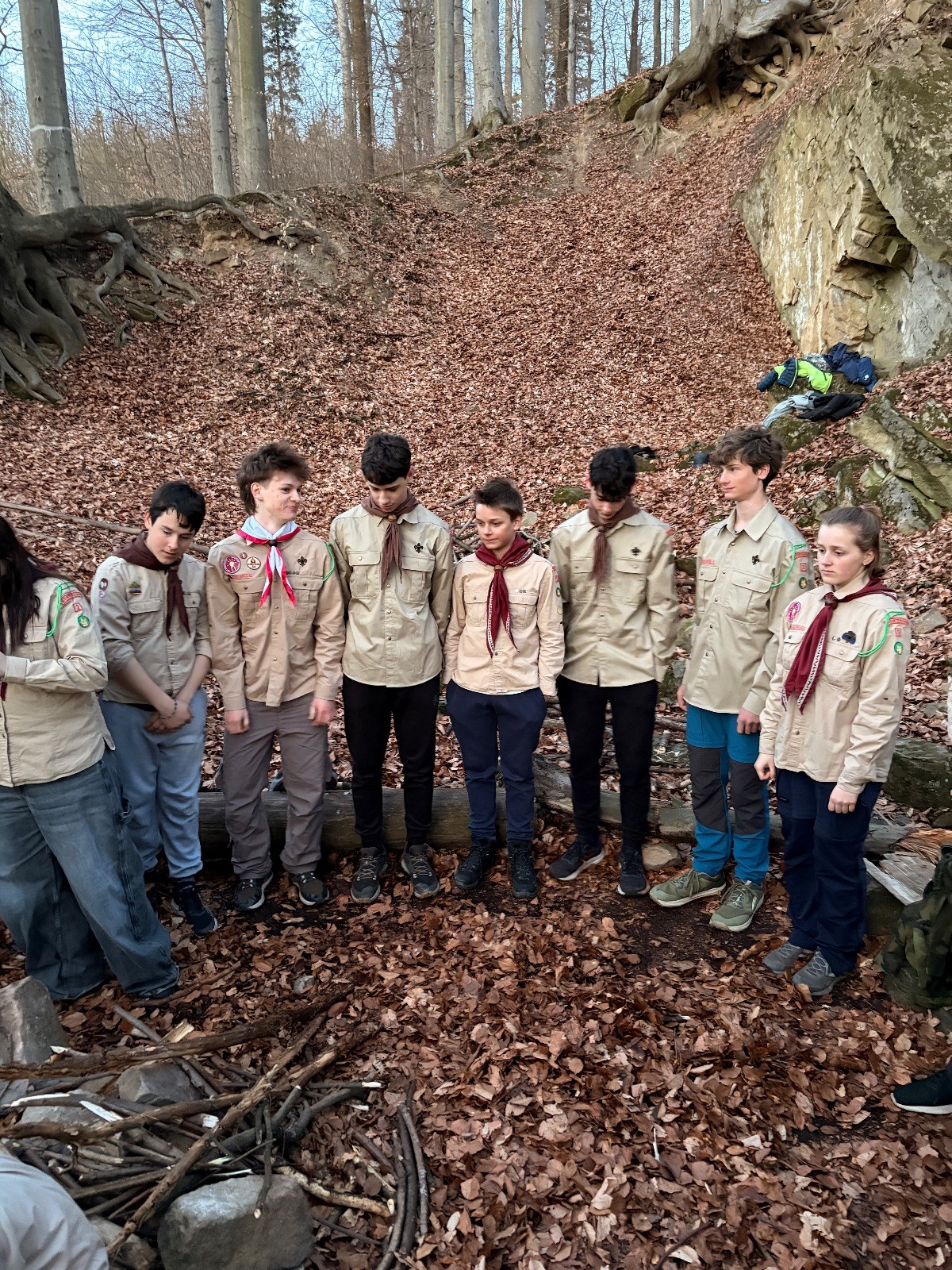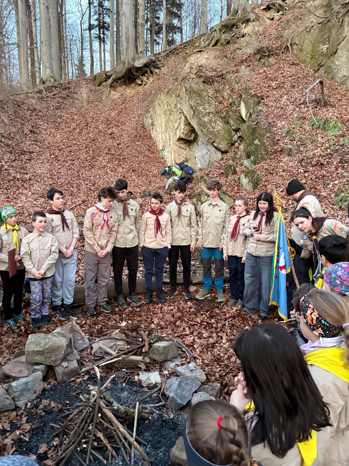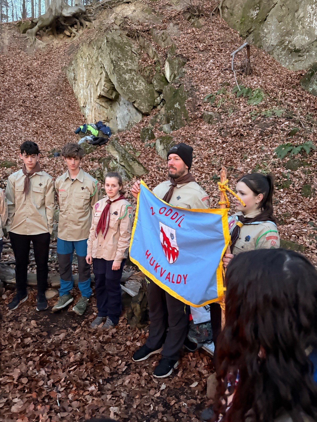 Čas nás lehce tlačil, takže bylo potřeba vyběhnout krpál nahoru do kopce a zase hezky dolů směrem do lomu. Zde všichni kdo mohli, posbírali okolní suché dřevo a mohlo se jít na oheň. Při znění skautské písně Tulácký ráno se nám krásně rozhoříval táborák a po slibu všech malých světlušek, vlčat a jednoho skauta se z malého ohýnku stal užitkový oheň pro hermelíny a špekáčky. Také Klepí se opět činil a na rošt hodil zelí, které se zde dělalo až do posledního uhlíku. Valča si vzala na starost Hágena, hru, která tvořila v tmavém lese tajemnou atmosféru.Zhasili jsme žhavé uhlíky a po družinkách se vydali směr myslivecká chata. Zde si všichni poctivci vydrhli zoubky a při Uzlem puštěném táborovém filmu 2025 jsme se všichni pomalu oddali spánku.