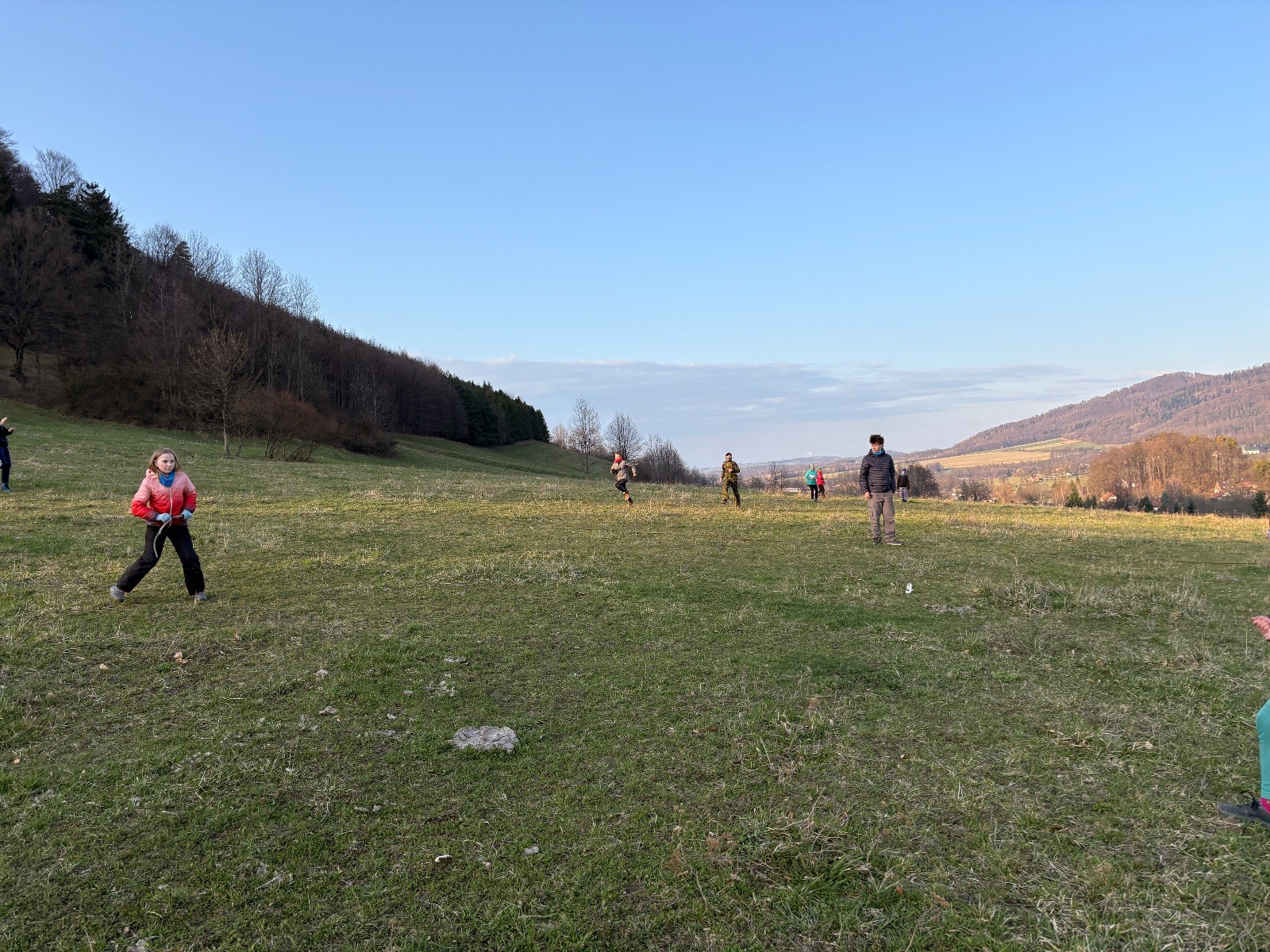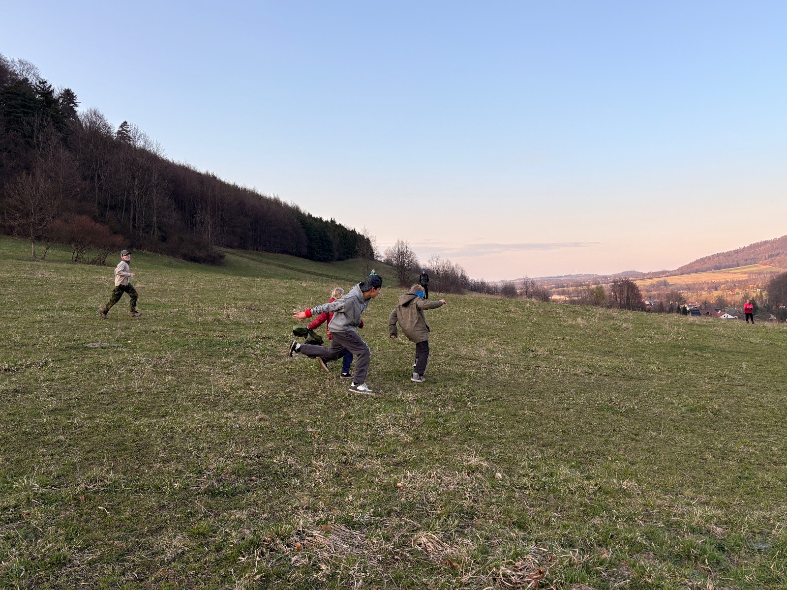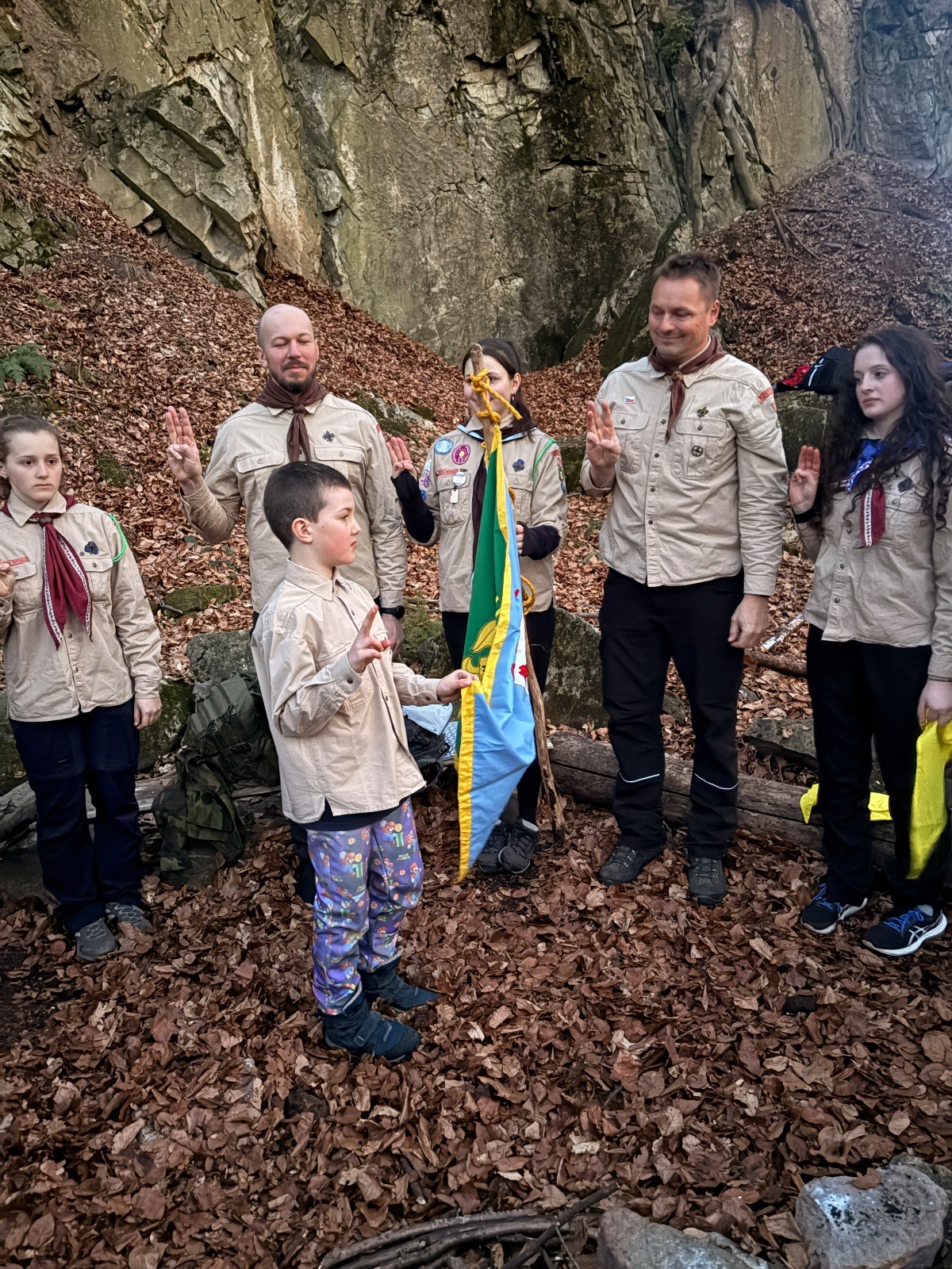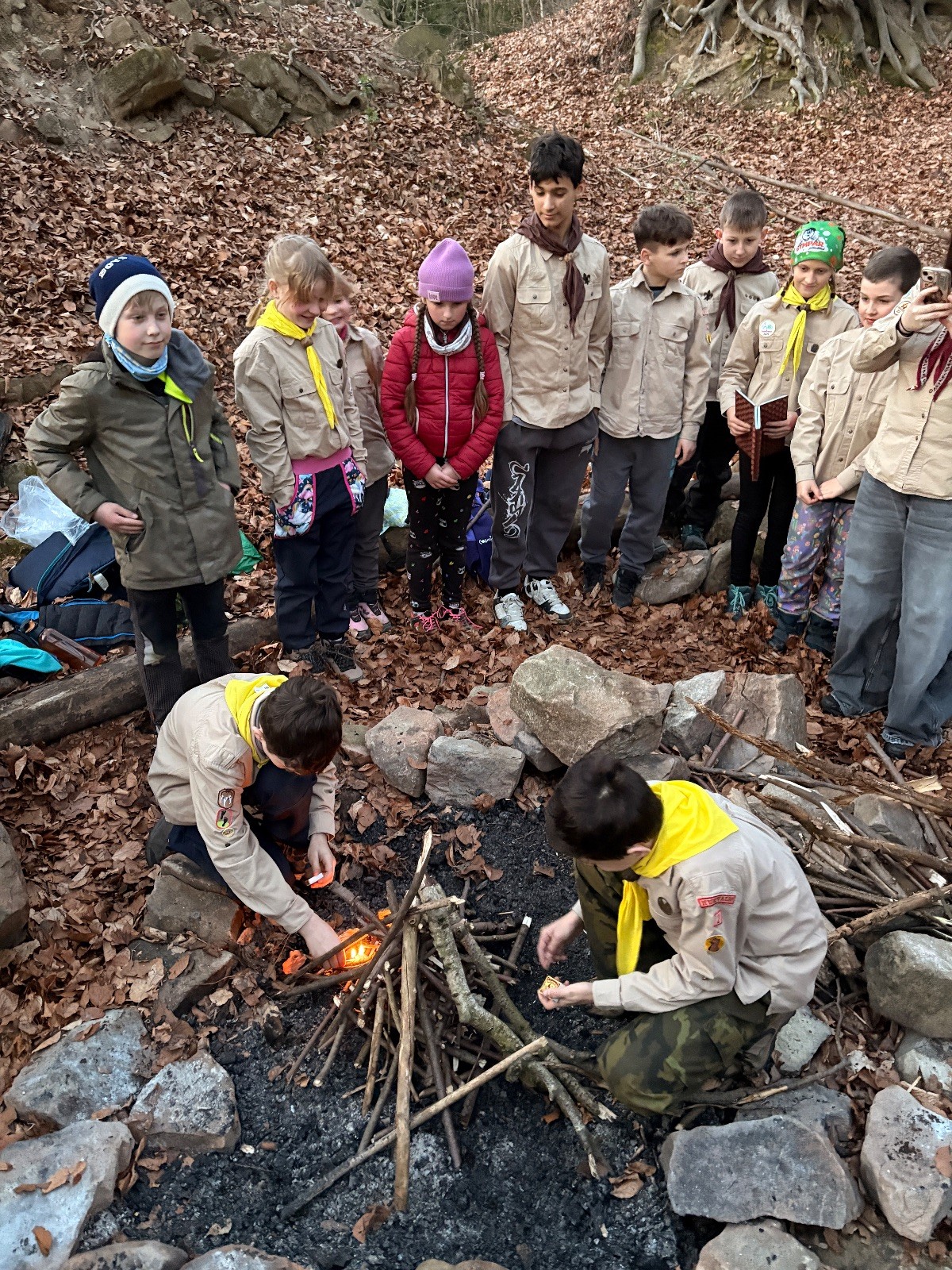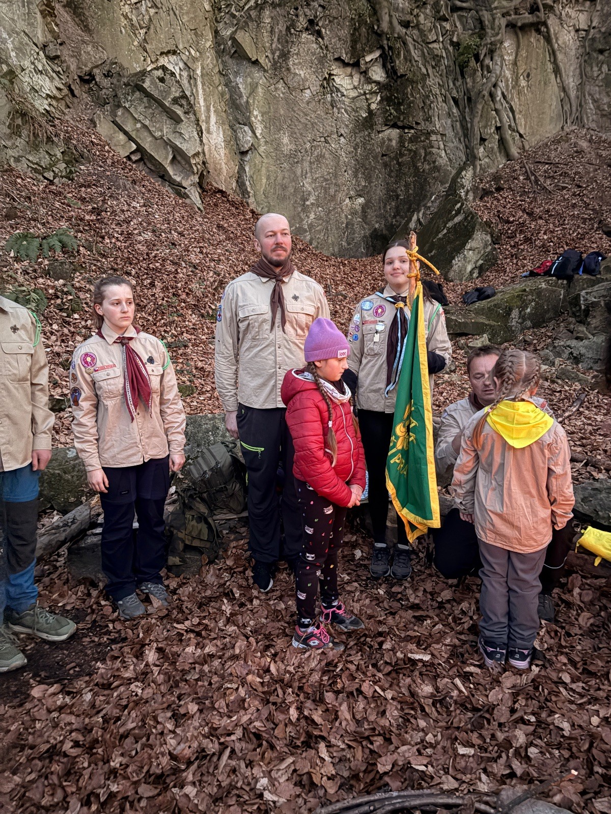 Čas nás lehce tlačil, takže bylo potřeba vyběhnout krpál nahoru do kopce a zase hezky dolů směrem do lomu. Zde všichni kdo mohli, posbírali okolní suché dřevo a mohlo se jít na oheň. Při znění skautské písně Tulácký ráno se nám krásně rozhoříval táborák a po slibu všech malých světlušek, vlčat a jednoho skauta se z malého ohýnku stal užitkový oheň pro hermelíny a špekáčky. Také Klepí se opět činil a na rošt hodil zelí, které se zde dělalo až do posledního uhlíku. Valča si vzala na starost Hágena, hru, která tvořila v tmavém lese tajemnou atmosféru.Zhasili jsme žhavé uhlíky a po družinkách se vydali směr myslivecká chata. Zde si všichni poctivci vydrhli zoubky a při Uzlem puštěném táborovém filmu 2025 jsme se všichni pomalu oddali spánku.