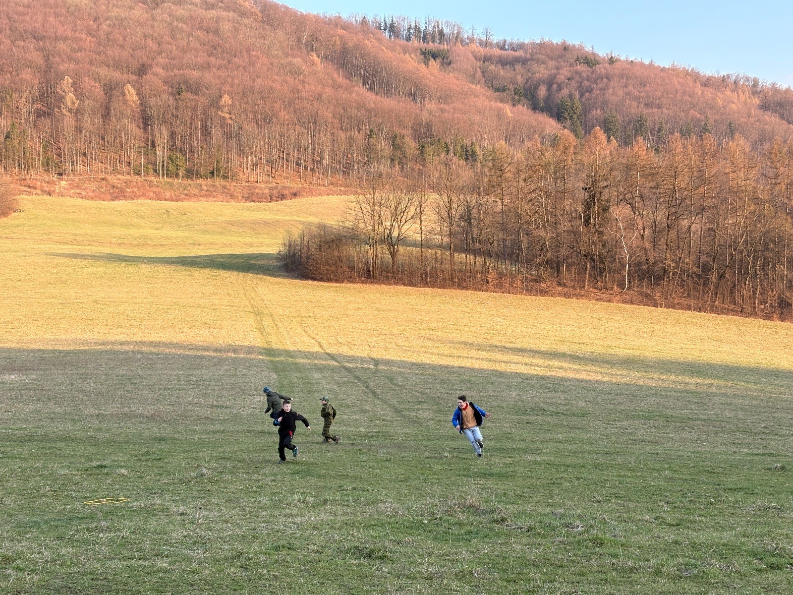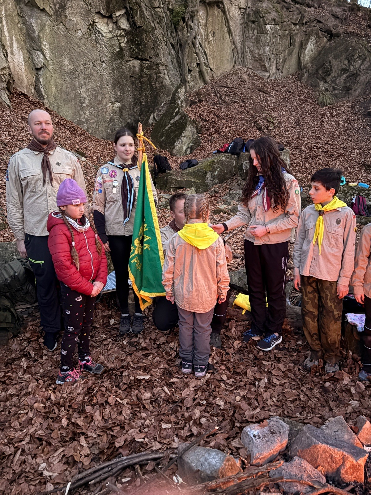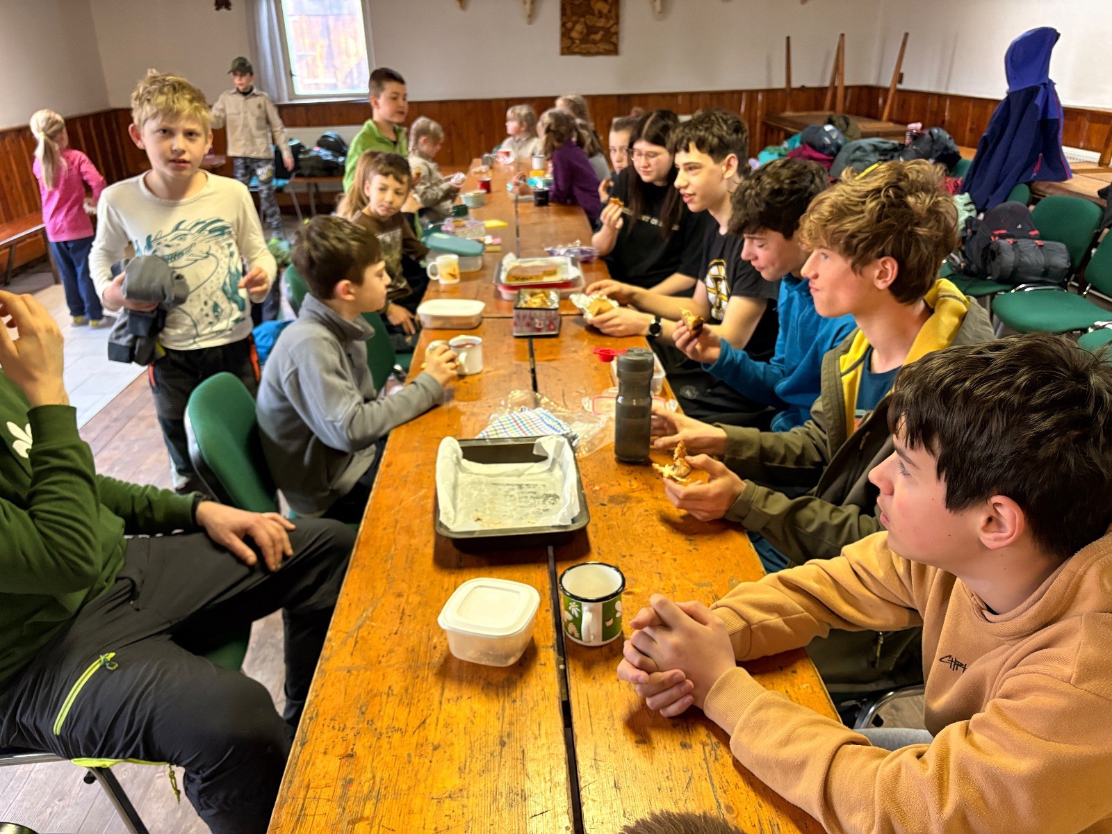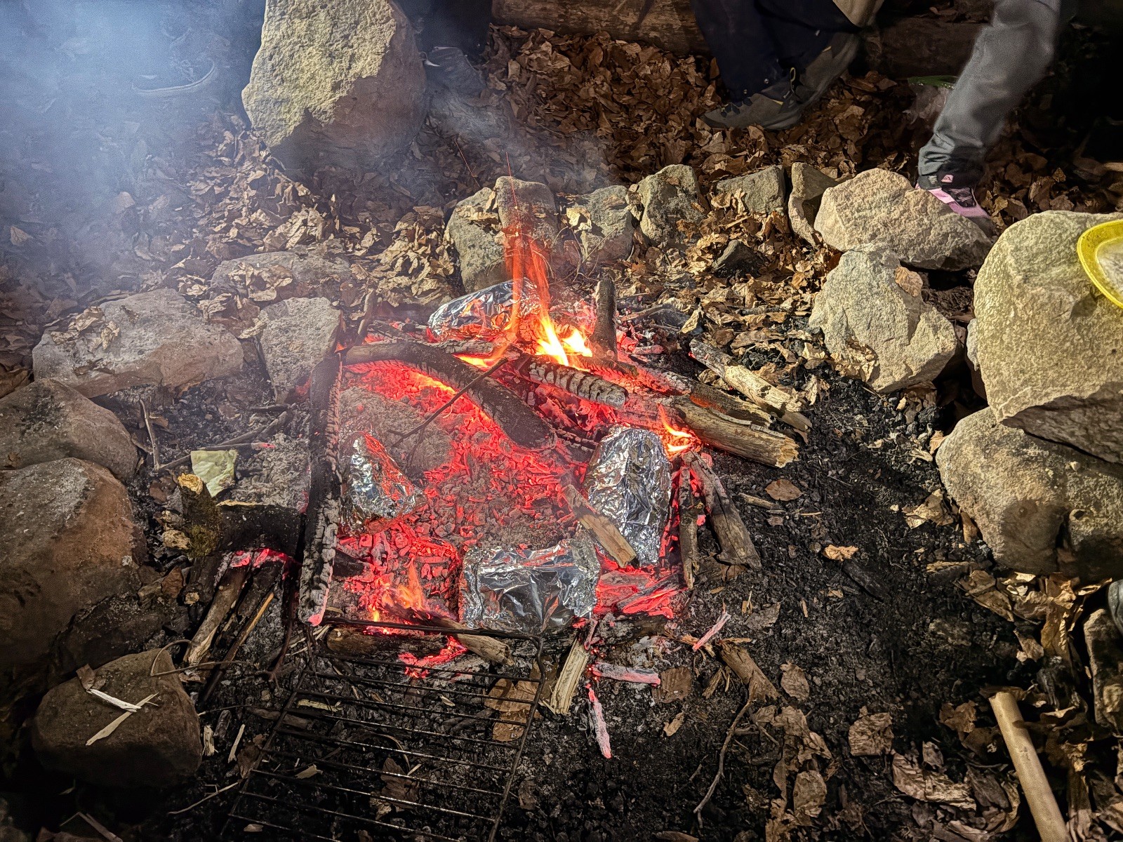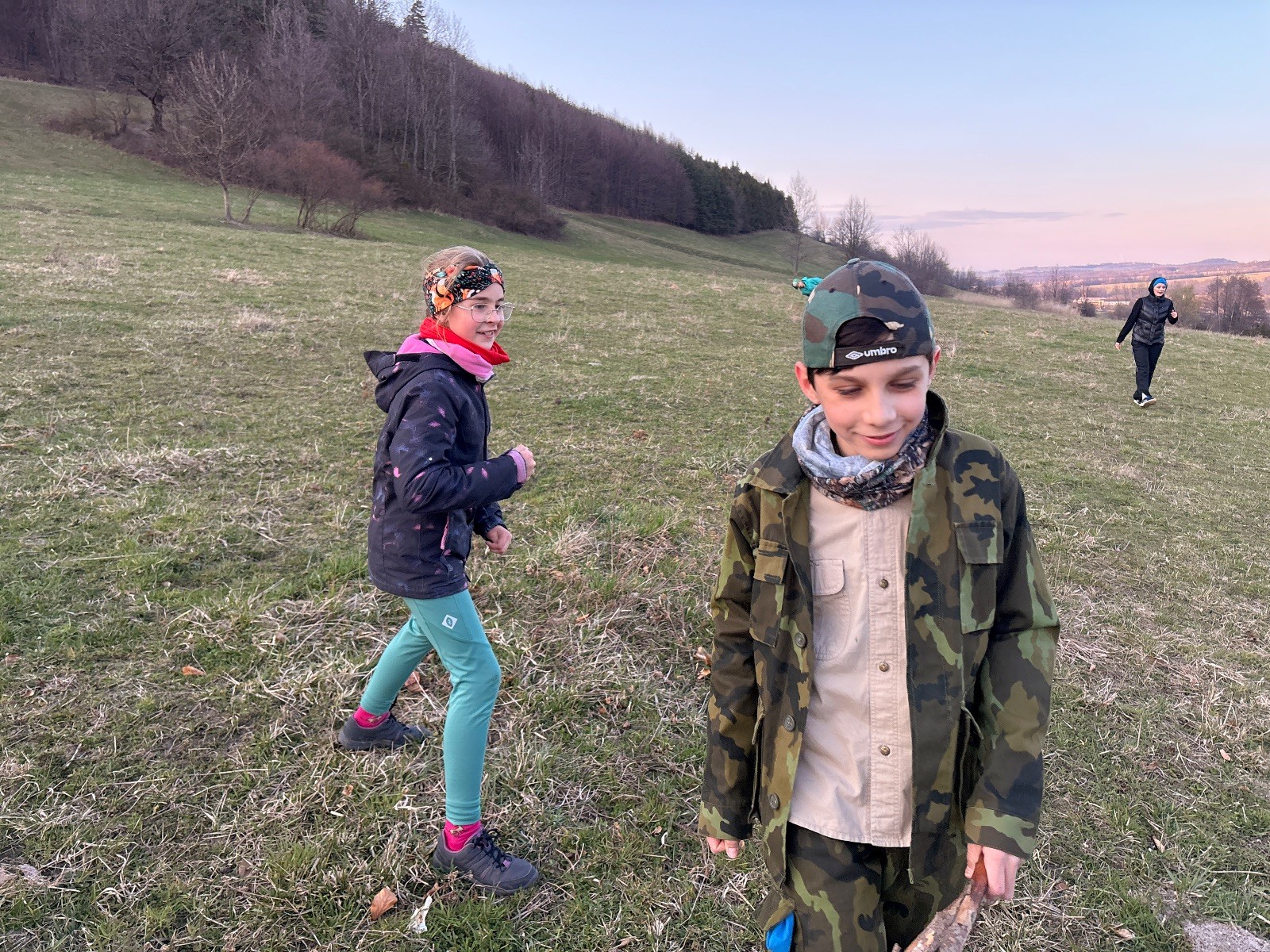 Čas nás lehce tlačil, takže bylo potřeba vyběhnout krpál nahoru do kopce a zase hezky dolů směrem do lomu. Zde všichni kdo mohli, posbírali okolní suché dřevo a mohlo se jít na oheň. Při znění skautské písně Tulácký ráno se nám krásně rozhoříval táborák a po slibu všech malých světlušek, vlčat a jednoho skauta se z malého ohýnku stal užitkový oheň pro hermelíny a špekáčky. Také Klepí se opět činil a na rošt hodil zelí, které se zde dělalo až do posledního uhlíku. Valča si vzala na starost Hágena, hru, která tvořila v tmavém lese tajemnou atmosféru.Zhasili jsme žhavé uhlíky a po družinkách se vydali směr myslivecká chata. Zde si všichni poctivci vydrhli zoubky a při Uzlem puštěném táborovém filmu 2025 jsme se všichni pomalu oddali spánku.