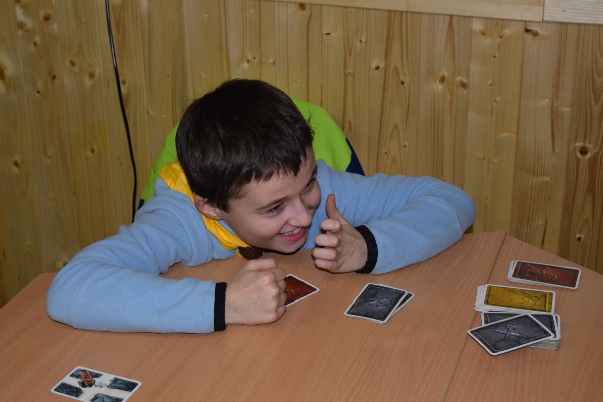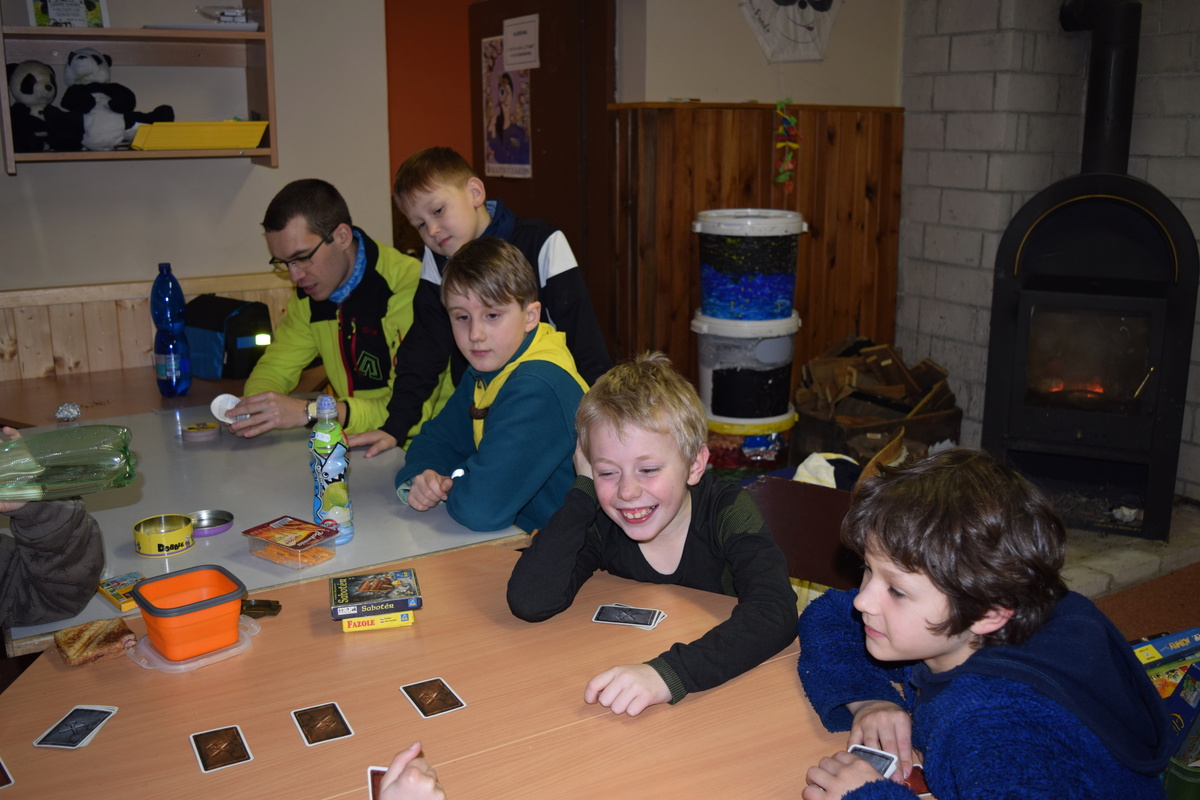 Po příchodu na klubovnu Peťa zatápí, já začínám vařit a kluci hrají deskovky. Po hodině mučení s vařením (nutno dodat, že majitelé klubovny nejsou zrovna na pořádek důslední) v hezké, ale nepoužitelné kuchyňce se vydává večeře. Máme těstoviny s provensálskou omáčkou, sýrem a opečeným párkem. Klukům se dělají boule za ušima a chválí mi jídlo, což mě ostatně velmi těší :-). Kluci mají spoustu energie a tak pokračují v hraní deskovek. Já pomalu usínám. V půl jedenácté je nakonec vyhlášena večerka.