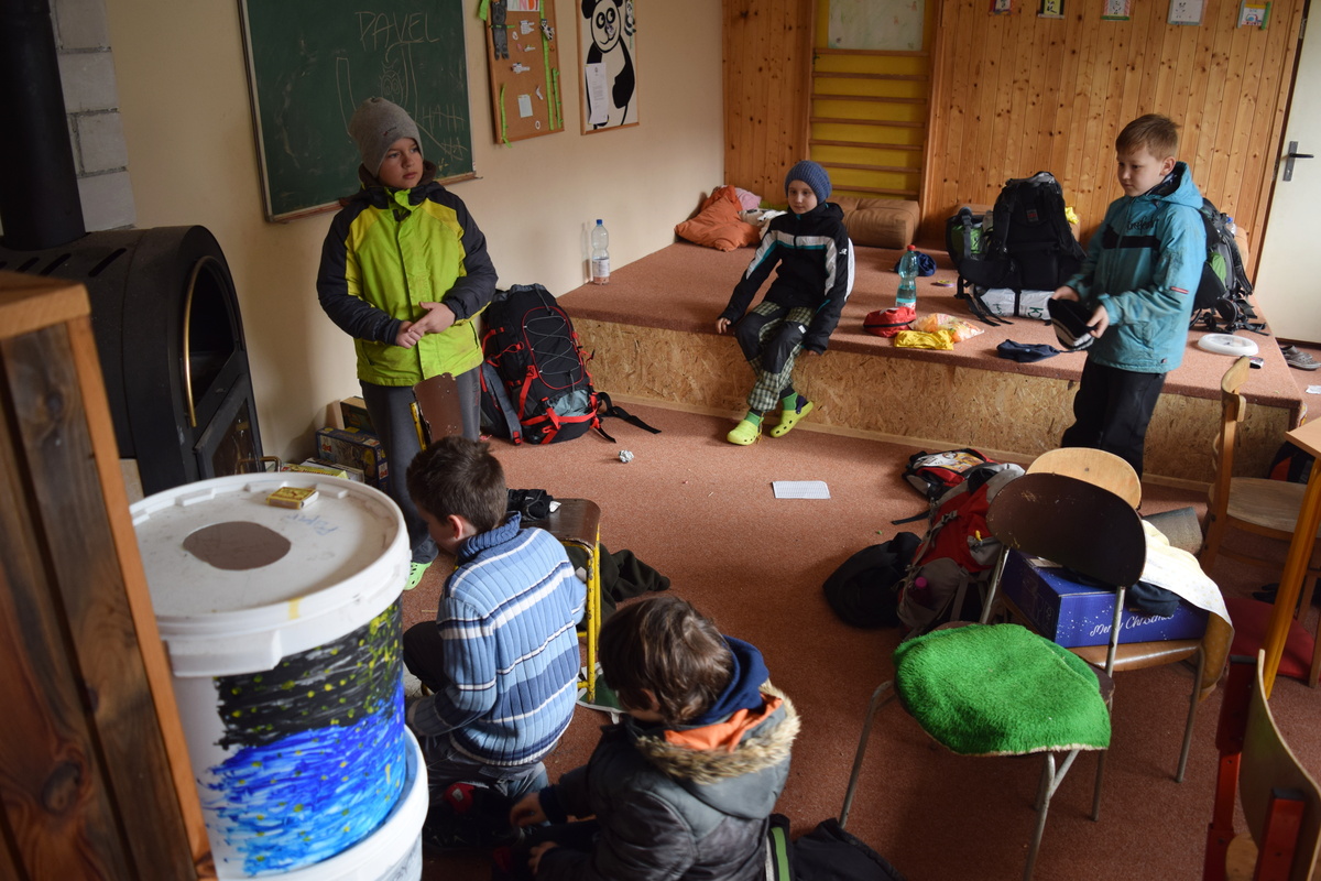 Vystoupili jsme do chladného večera. Nyní jen najít klubovnu zdejších skautů. Bydlí naštěstí necelý kilometr od nádraží, takže po chvíli chůze stojíme před hnědými vraty a já jdu zjistit, jestli někdo není „doma“. Je. Čeká tu na nás Kulďas, správce klubovny. Kluci se zabydlují, prozkoumávají místo a my s Petrem dostáváme instrukce. Klubovna je to pěkně vybavená. Dvě místnosti, kuchyňka a dokonce splachovací záchody s umyvadlem. Pro naši družinu „výpravový nadstandard“. Poté co nás Kulďas opouští, vytahujeme večeře v podobě toustů, pomazánek a jiných dobrot. Kluci plní energie se vrhají po večeři do deskovek a my s Peťou se přidáváme. Spát jdeme okolo půl jedenácté – dříve než chtějí kluci, později než chceme my. A ráno je to znát.