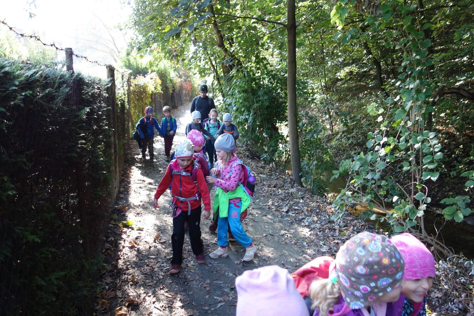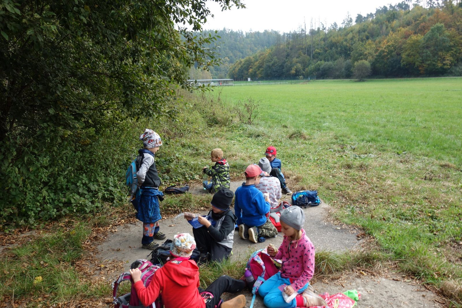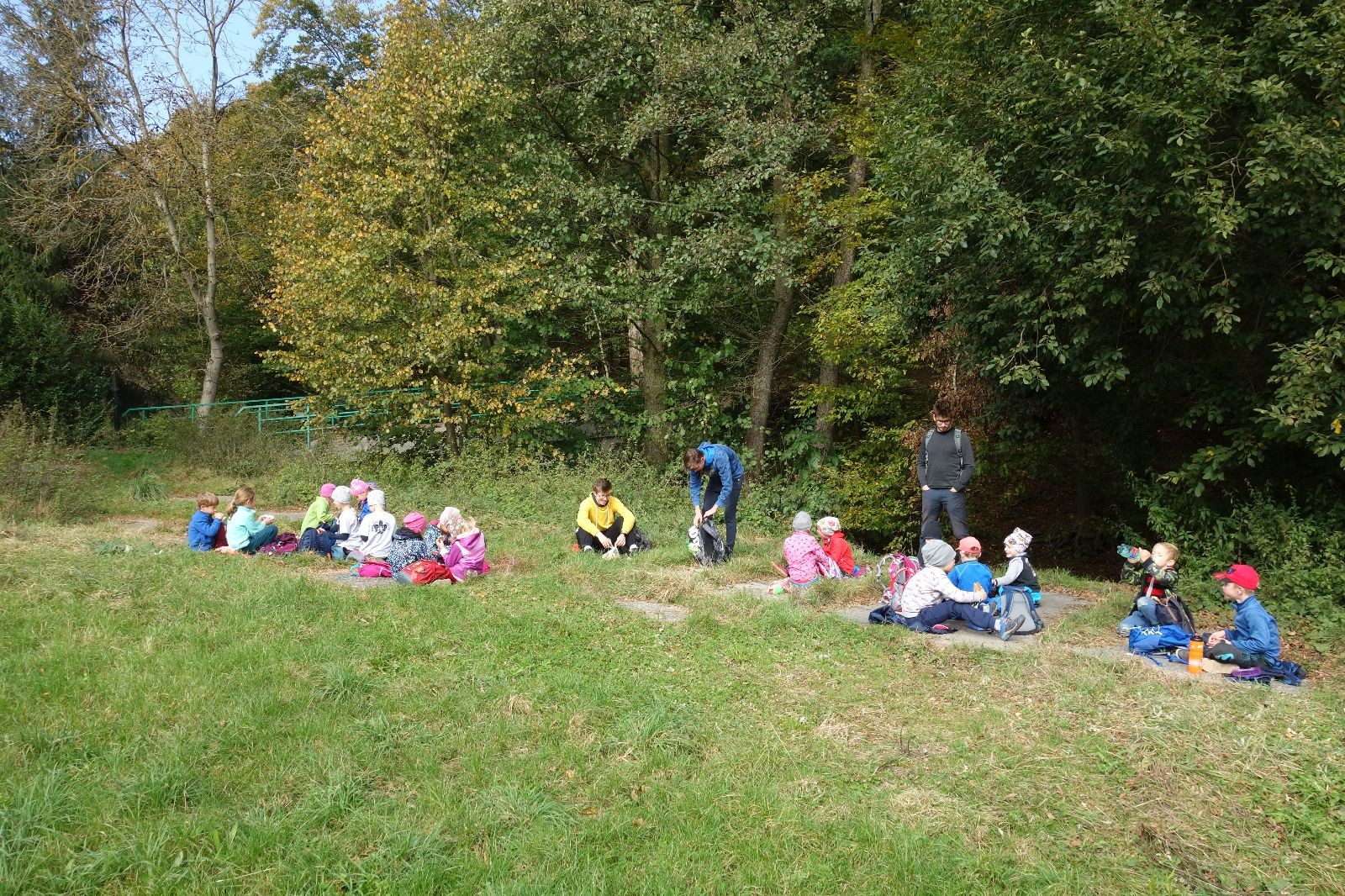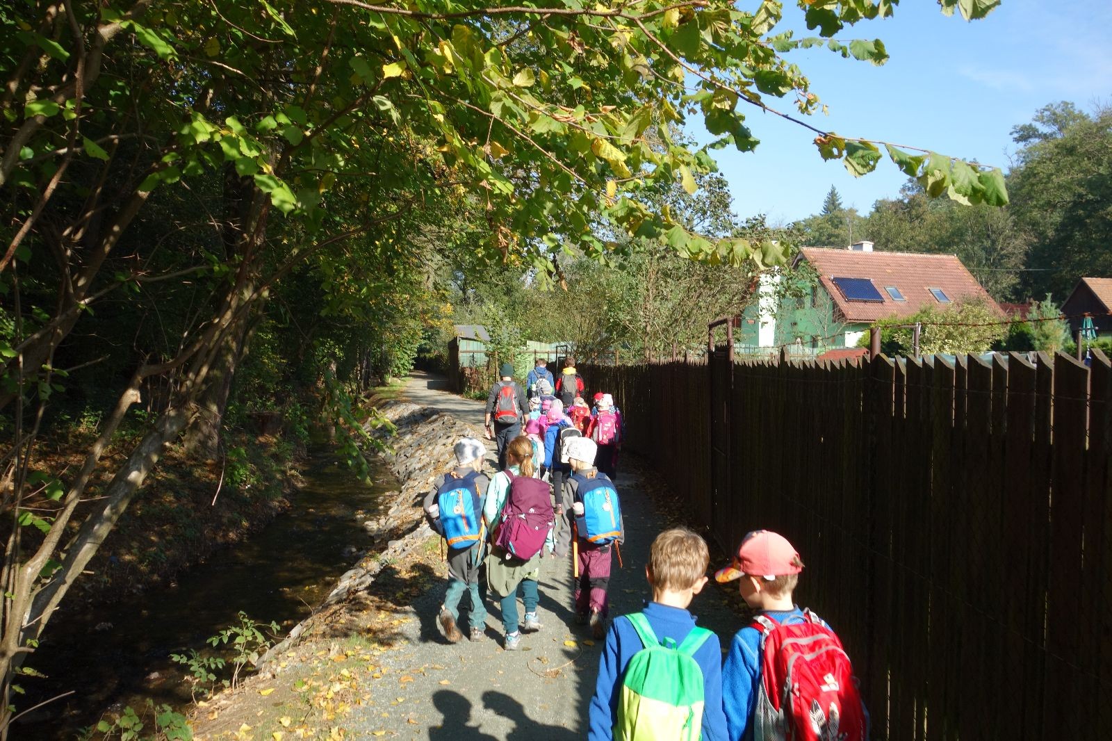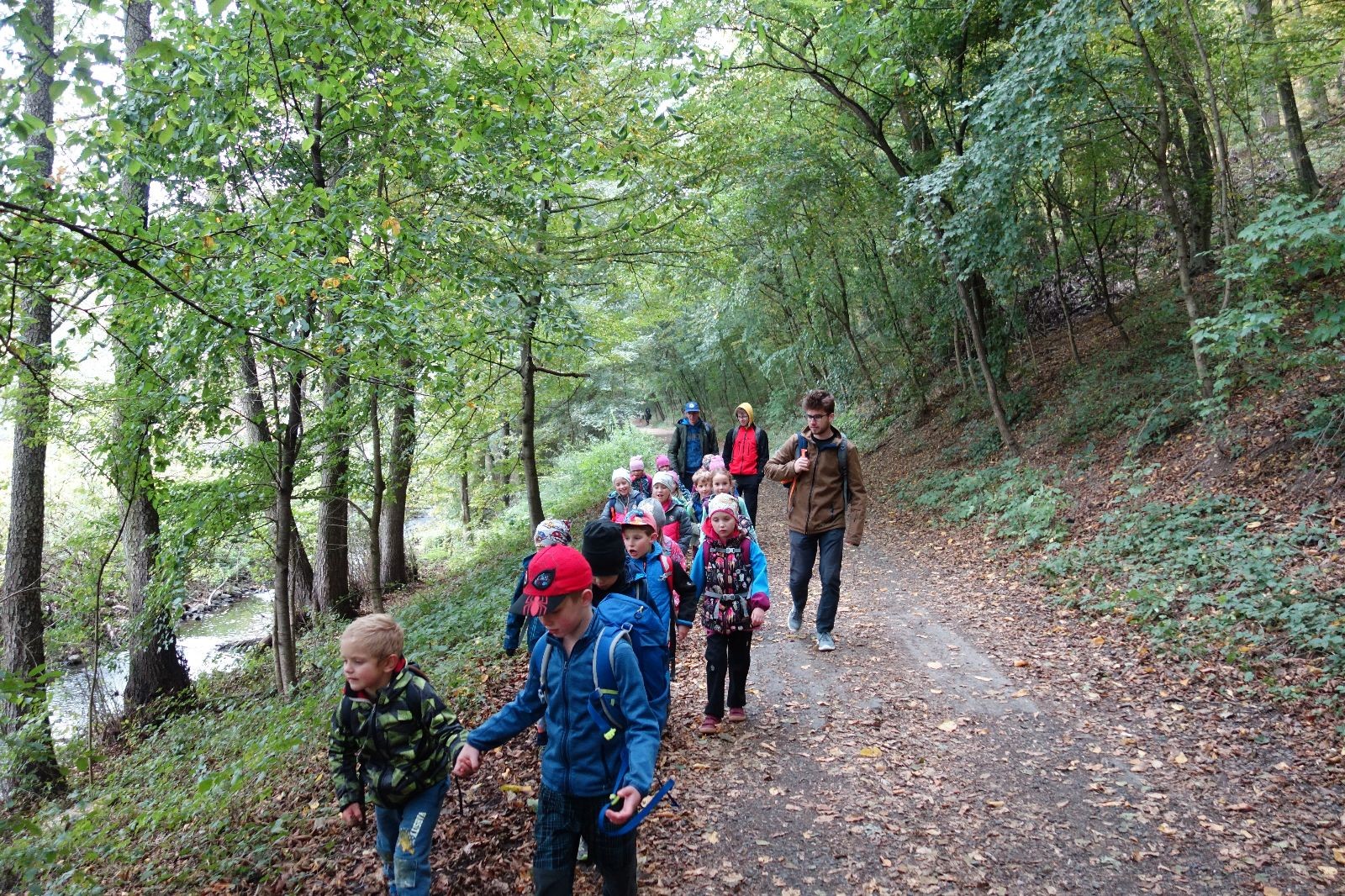 Po prvotních zmatcích a adaptaci na počasí, protože bylo opravdu krásně, jsme nasadili slušné tempo a přes pauzu na pití v Bedřichovicích jsme se dostali do Podolí, kde se všichni nasvačili. Pokus o hru na slepou bábu vzal rychle za své, jelikož všichni chtěli být slepá bába, takže jsme se rozhodli pokračovat proti proudu Říčky a okolo Zukalova mlýna až za Eldorado, kde byl takzvaný cíl naší výpravy. Kolem půl druhé hodiny odpolední si na louce uprostřed Mariánského údolí všichni snědli své obědy z domova a odpočinuli si. Ovšem ne na dlouho, protože jen co se doobědvalo, byli všichni opět plní energie a začali pobíhat po louce. Po chvíli jsme zorganizovali nejoblíbenější hru v naší družince, mrazíka, kterou by tam děti nejraději hrály až do večera. Aby se příliš neunavily a zvládly cestu zpátky, tak jsme mrazíka ukončili, hodili batohy na záda a vyrazili zpátky.