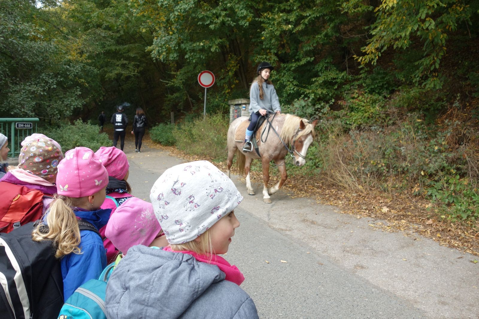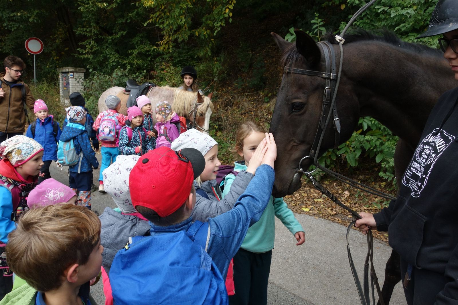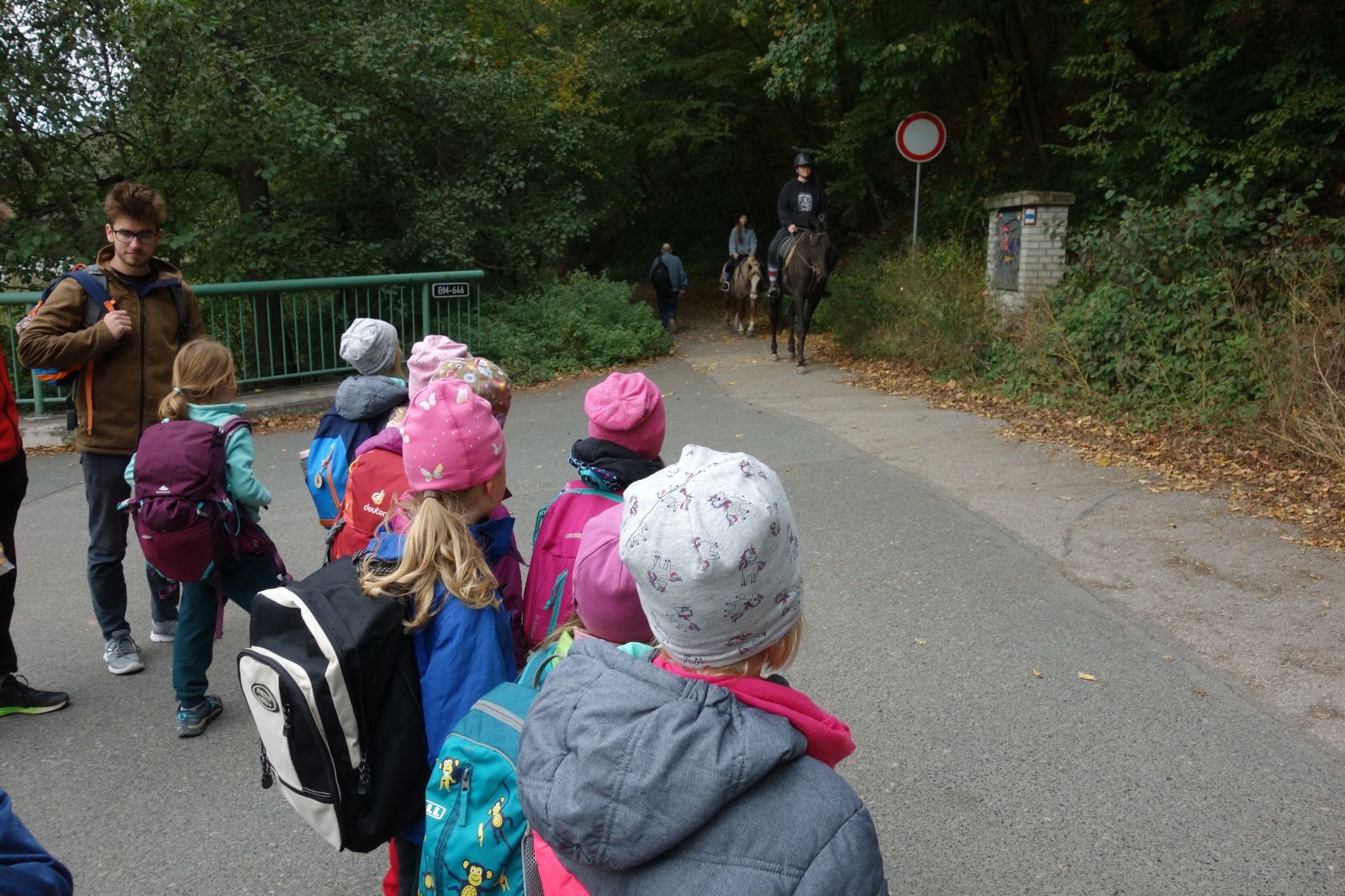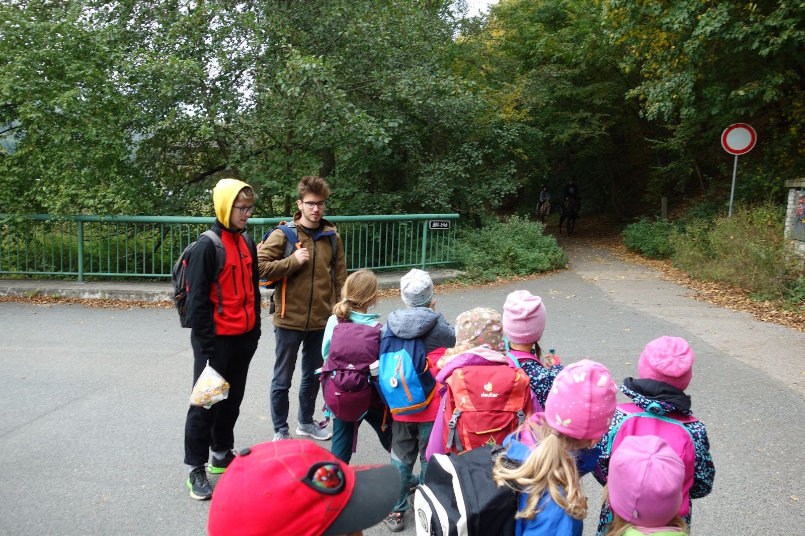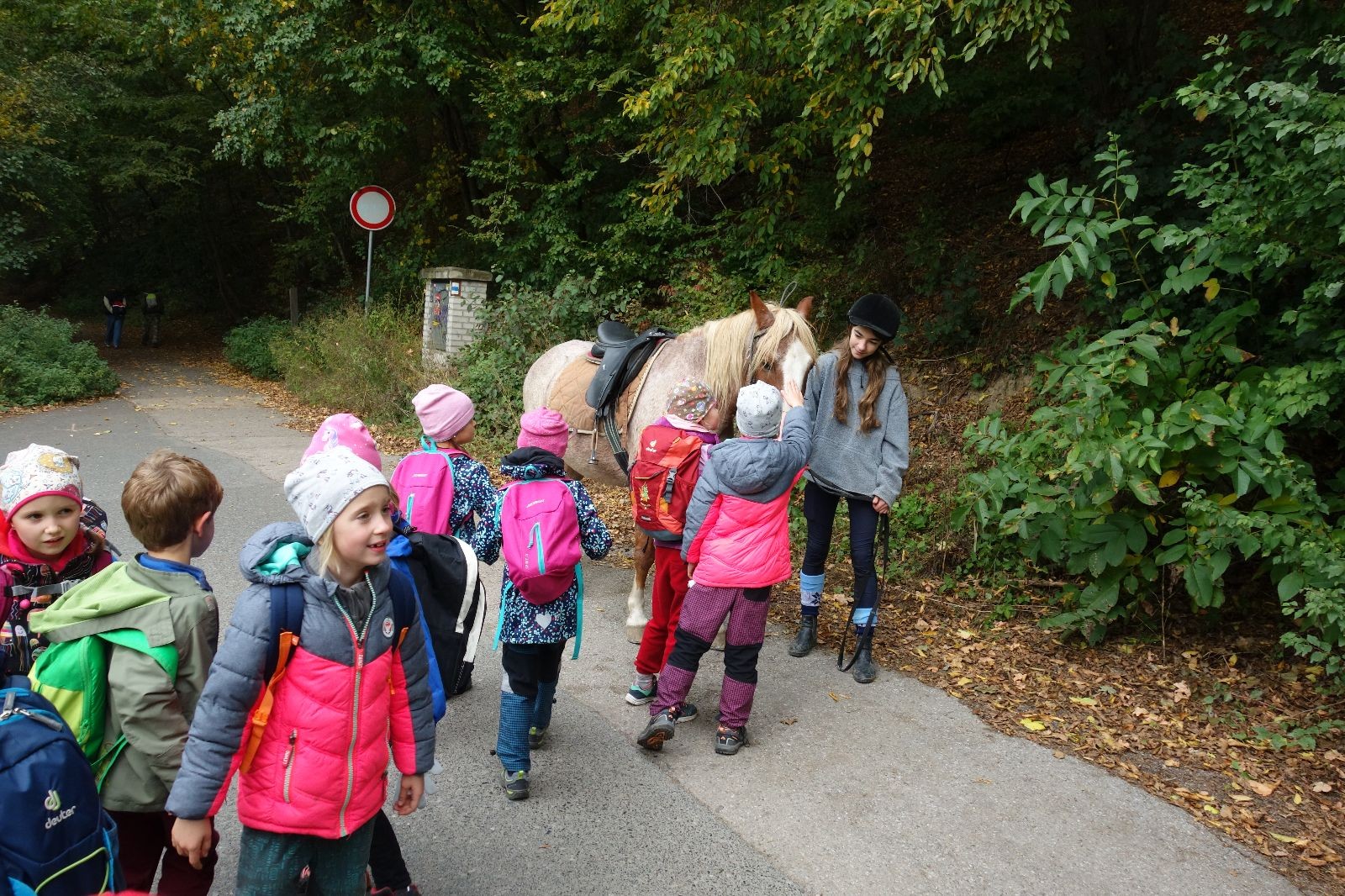 Ještě než jsme opustili Mariánské údolí, zahlédli jsme čirou náhodou dvě paní na koních, což děti značně fascinovalo. Když kolem nás projížděly, všimly si jak se na ně malí skautící nadšeně dívají, sesedly z koní a dovolily dětem, aby si je pohladily. Chudáky koníky jsme zdrželi aspoň na pět minut. Cesta zpátky rychle ubíhala a tak jsme mohli zvolnit, více si užívat krajiny. Opět jsme na pauzu zastavili v Podolí, kde se dojedly poslední zbytky svačin, všichni se napili a s přihlédnutím na pár stížností na bolavé nohy jsme pokračovali do Bedřichovic. Tam jsme už věděli, že máme dost času, takže jsme si naposledy sedli a napili se. Ač unavení, tak stejně dlouho v klidu nevydrželi, takže jsme po chvíli vyšli na finální část naší cesty - konečně na boudu. Při posledních pár stech metrech, které jsou slušně do kopce, už všichni vypadali pěkně unavení. Velkým překvapením pro nás vedoucí bylo, že po pár minutách v klidu se děti opět rozutekly po základně. Kdo ví kde tu energii vzali.