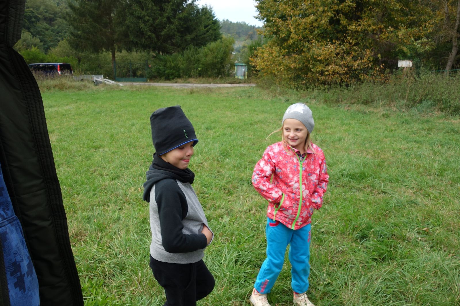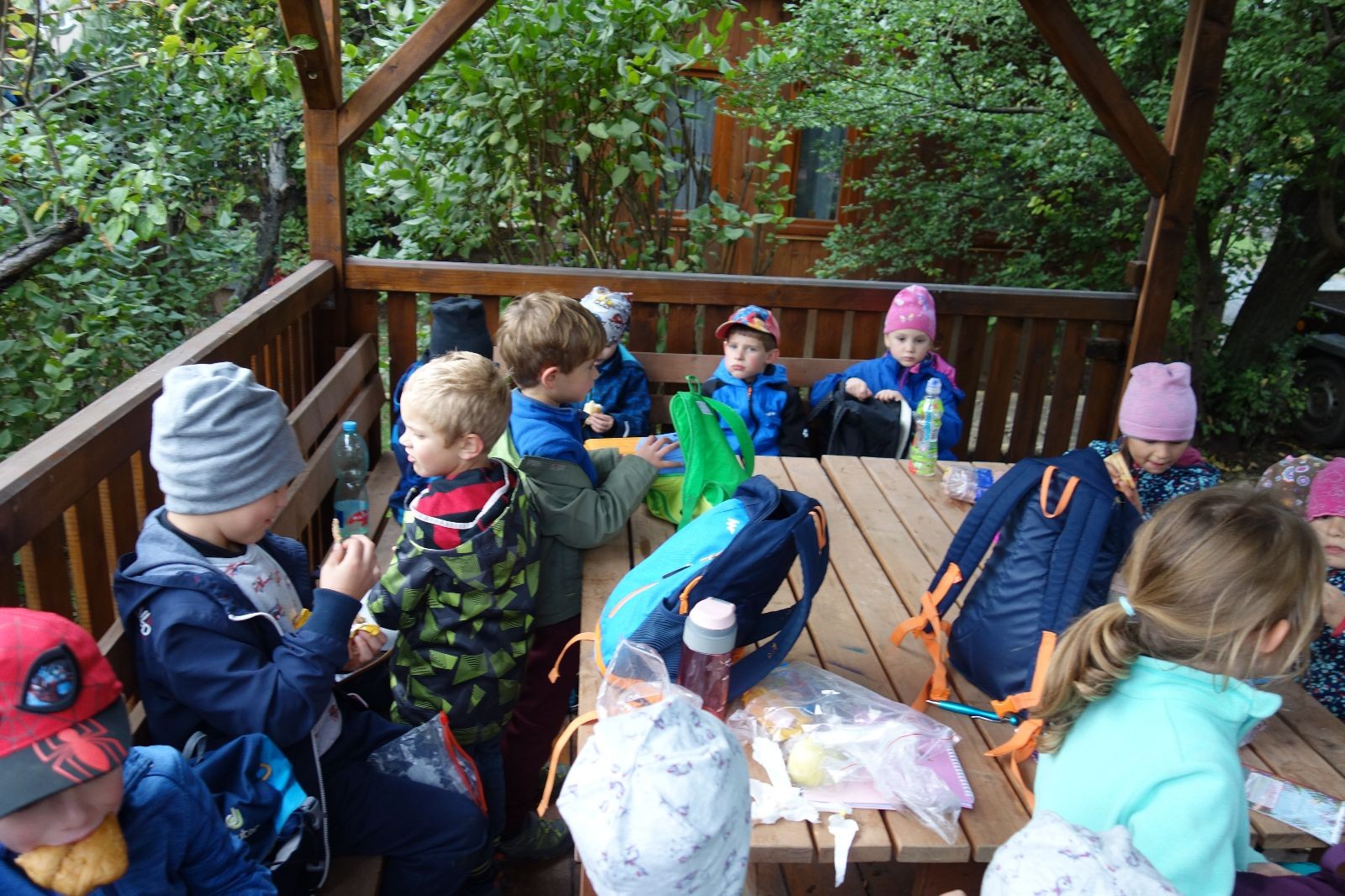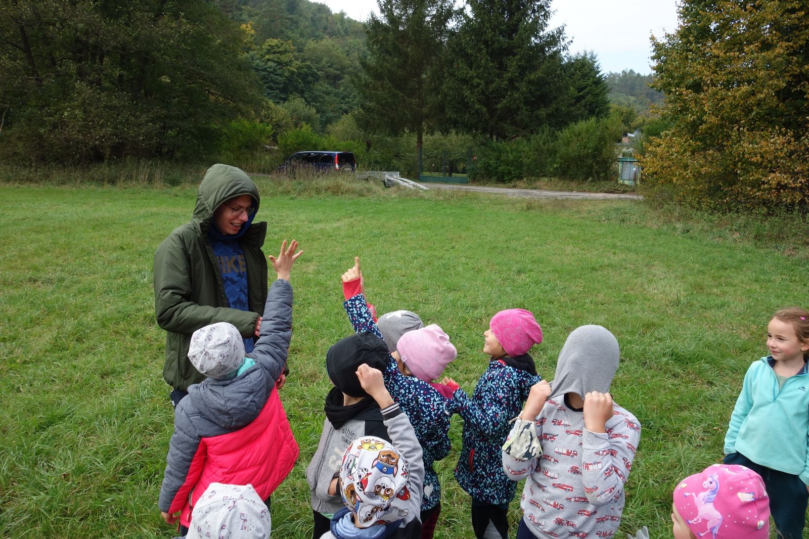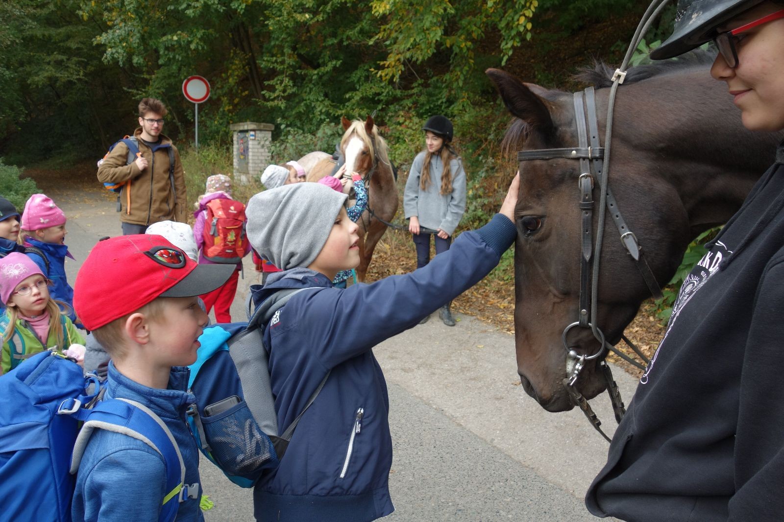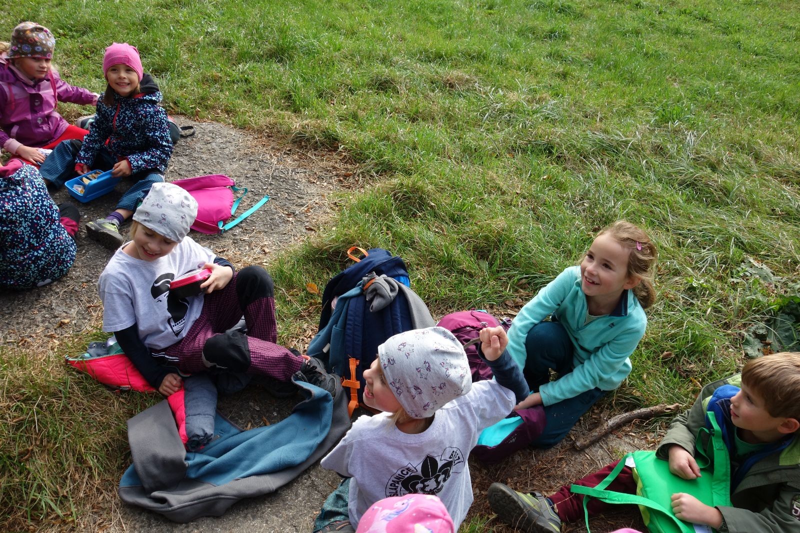 Ještě než jsme opustili Mariánské údolí, zahlédli jsme čirou náhodou dvě paní na koních, což děti značně fascinovalo. Když kolem nás projížděly, všimly si jak se na ně malí skautící nadšeně dívají, sesedly z koní a dovolily dětem, aby si je pohladily. Chudáky koníky jsme zdrželi aspoň na pět minut. Cesta zpátky rychle ubíhala a tak jsme mohli zvolnit, více si užívat krajiny. Opět jsme na pauzu zastavili v Podolí, kde se dojedly poslední zbytky svačin, všichni se napili a s přihlédnutím na pár stížností na bolavé nohy jsme pokračovali do Bedřichovic. Tam jsme už věděli, že máme dost času, takže jsme si naposledy sedli a napili se. Ač unavení, tak stejně dlouho v klidu nevydrželi, takže jsme po chvíli vyšli na finální část naší cesty - konečně na boudu. Při posledních pár stech metrech, které jsou slušně do kopce, už všichni vypadali pěkně unavení. Velkým překvapením pro nás vedoucí bylo, že po pár minutách v klidu se děti opět rozutekly po základně. Kdo ví kde tu energii vzali.