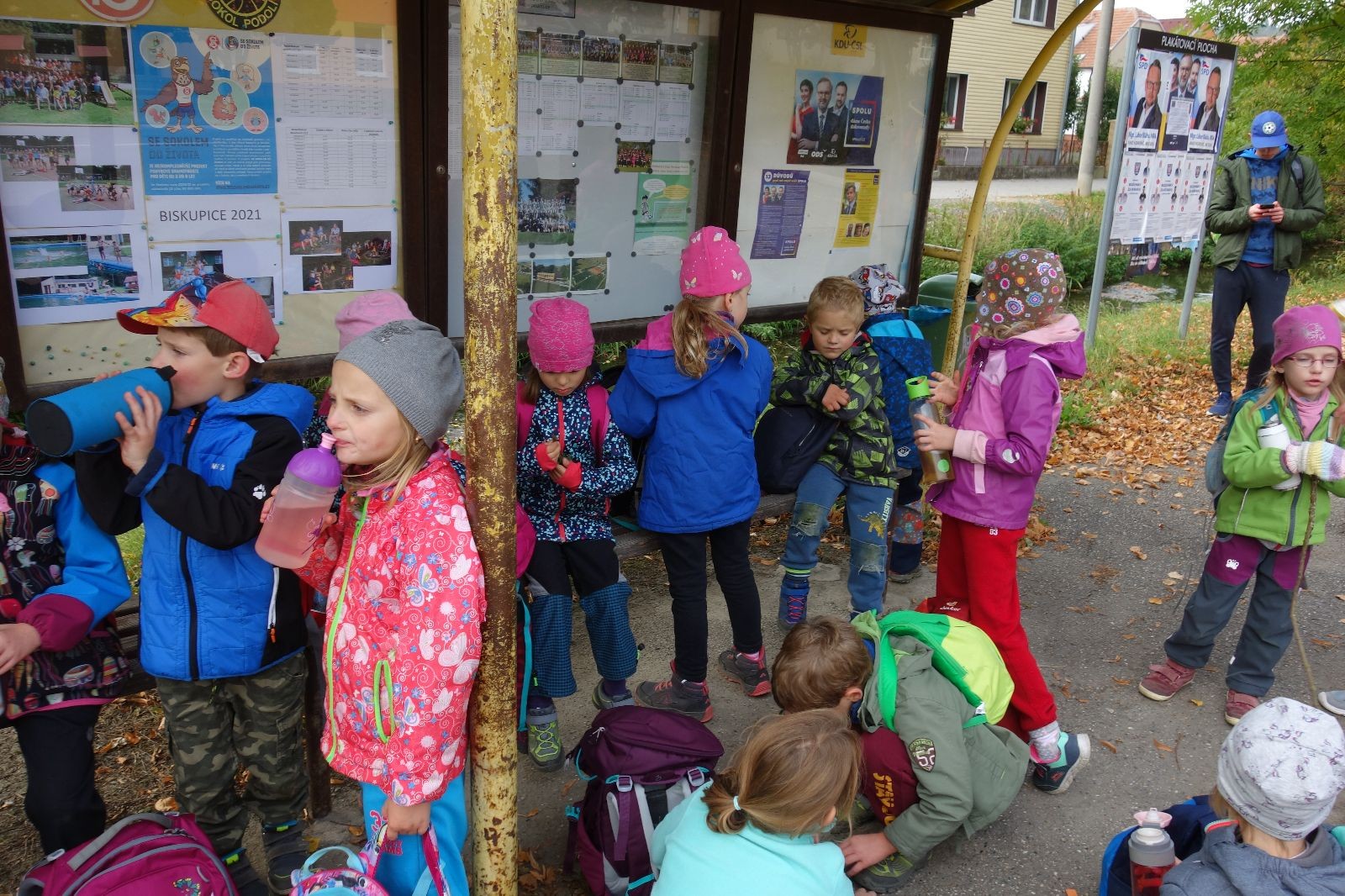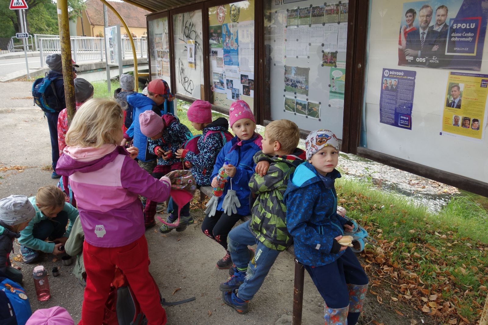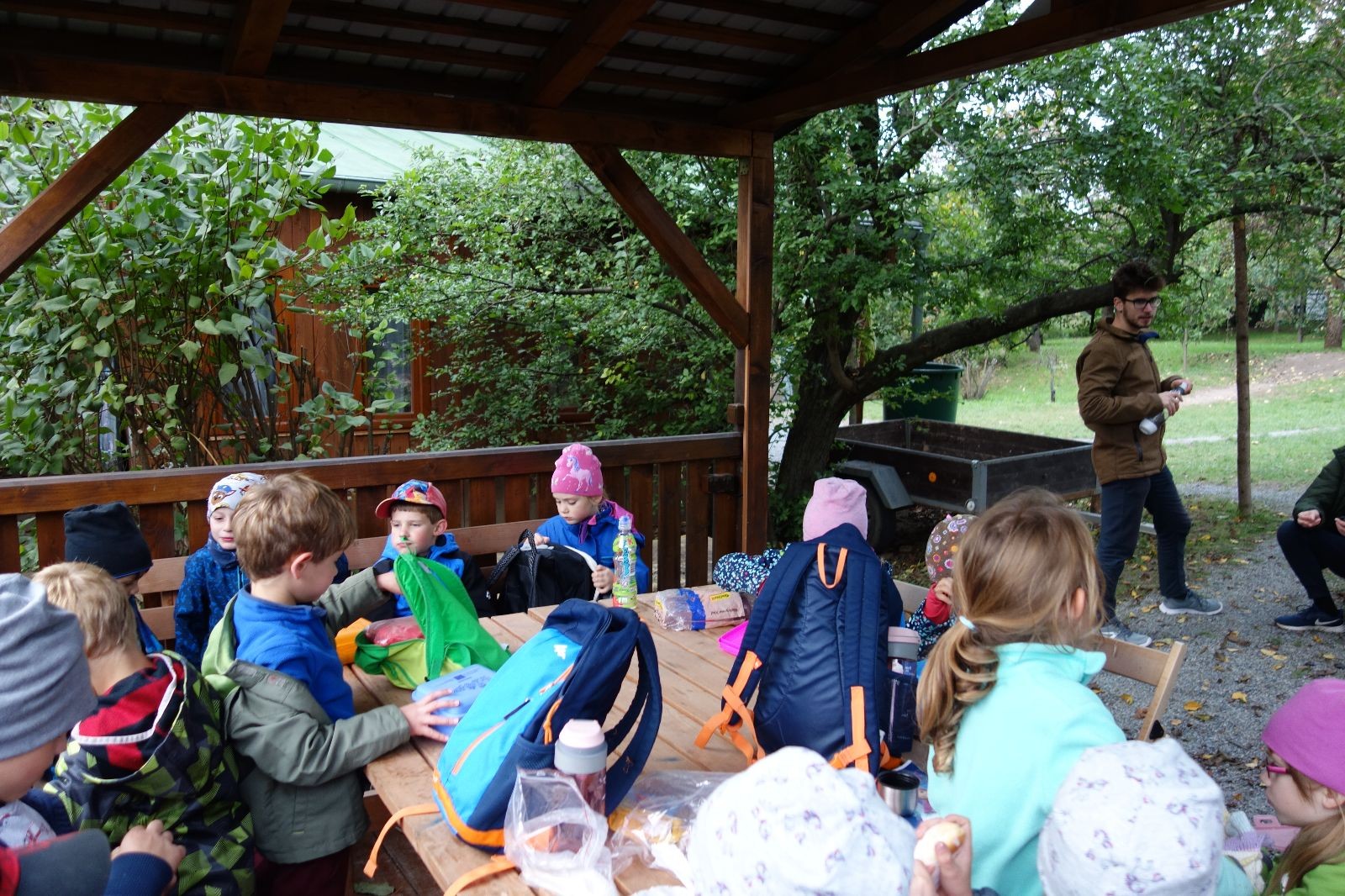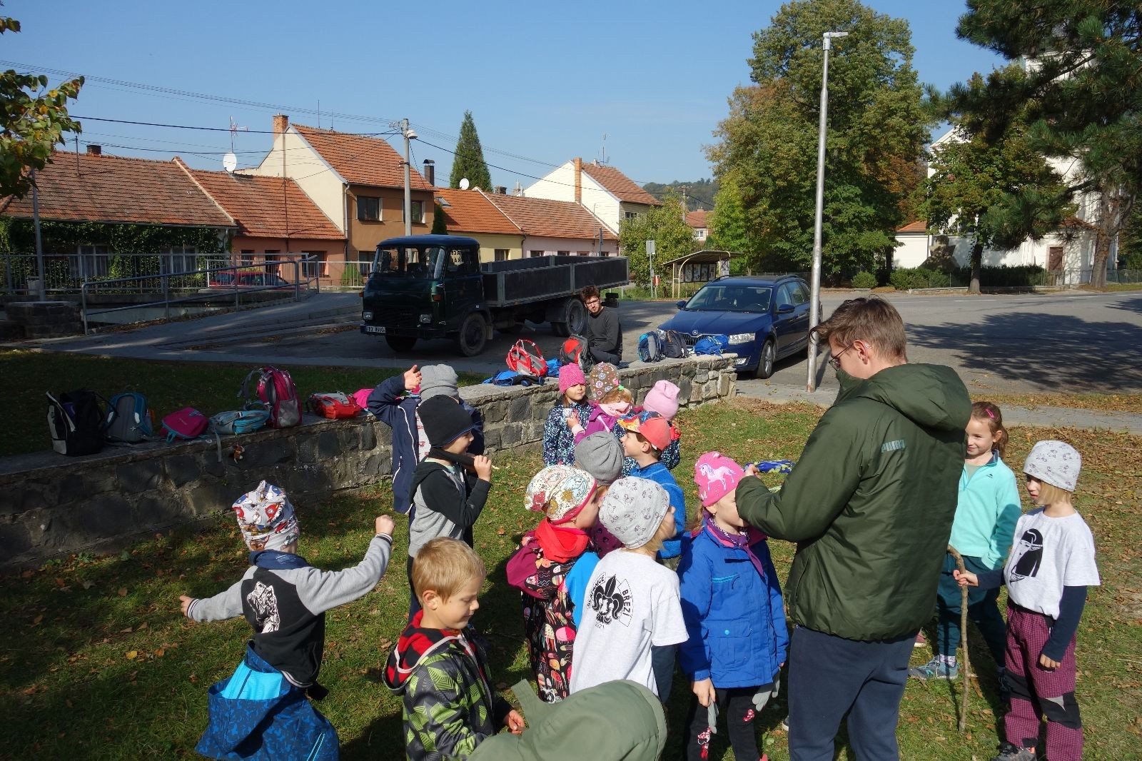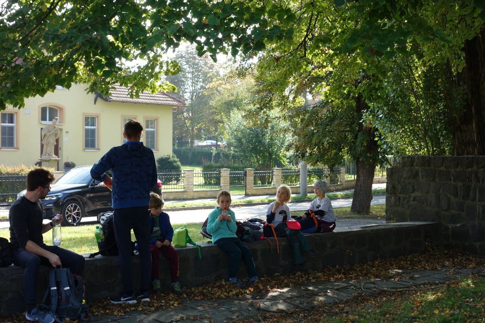 Ještě než jsme opustili Mariánské údolí, zahlédli jsme čirou náhodou dvě paní na koních, což děti značně fascinovalo. Když kolem nás projížděly, všimly si jak se na ně malí skautící nadšeně dívají, sesedly z koní a dovolily dětem, aby si je pohladily. Chudáky koníky jsme zdrželi aspoň na pět minut. Cesta zpátky rychle ubíhala a tak jsme mohli zvolnit, více si užívat krajiny. Opět jsme na pauzu zastavili v Podolí, kde se dojedly poslední zbytky svačin, všichni se napili a s přihlédnutím na pár stížností na bolavé nohy jsme pokračovali do Bedřichovic. Tam jsme už věděli, že máme dost času, takže jsme si naposledy sedli a napili se. Ač unavení, tak stejně dlouho v klidu nevydrželi, takže jsme po chvíli vyšli na finální část naší cesty - konečně na boudu. Při posledních pár stech metrech, které jsou slušně do kopce, už všichni vypadali pěkně unavení. Velkým překvapením pro nás vedoucí bylo, že po pár minutách v klidu se děti opět rozutekly po základně. Kdo ví kde tu energii vzali.