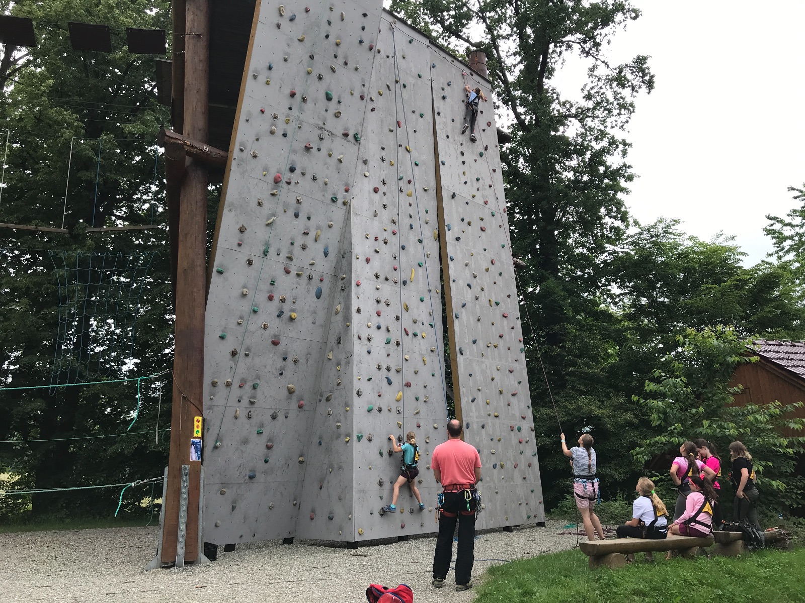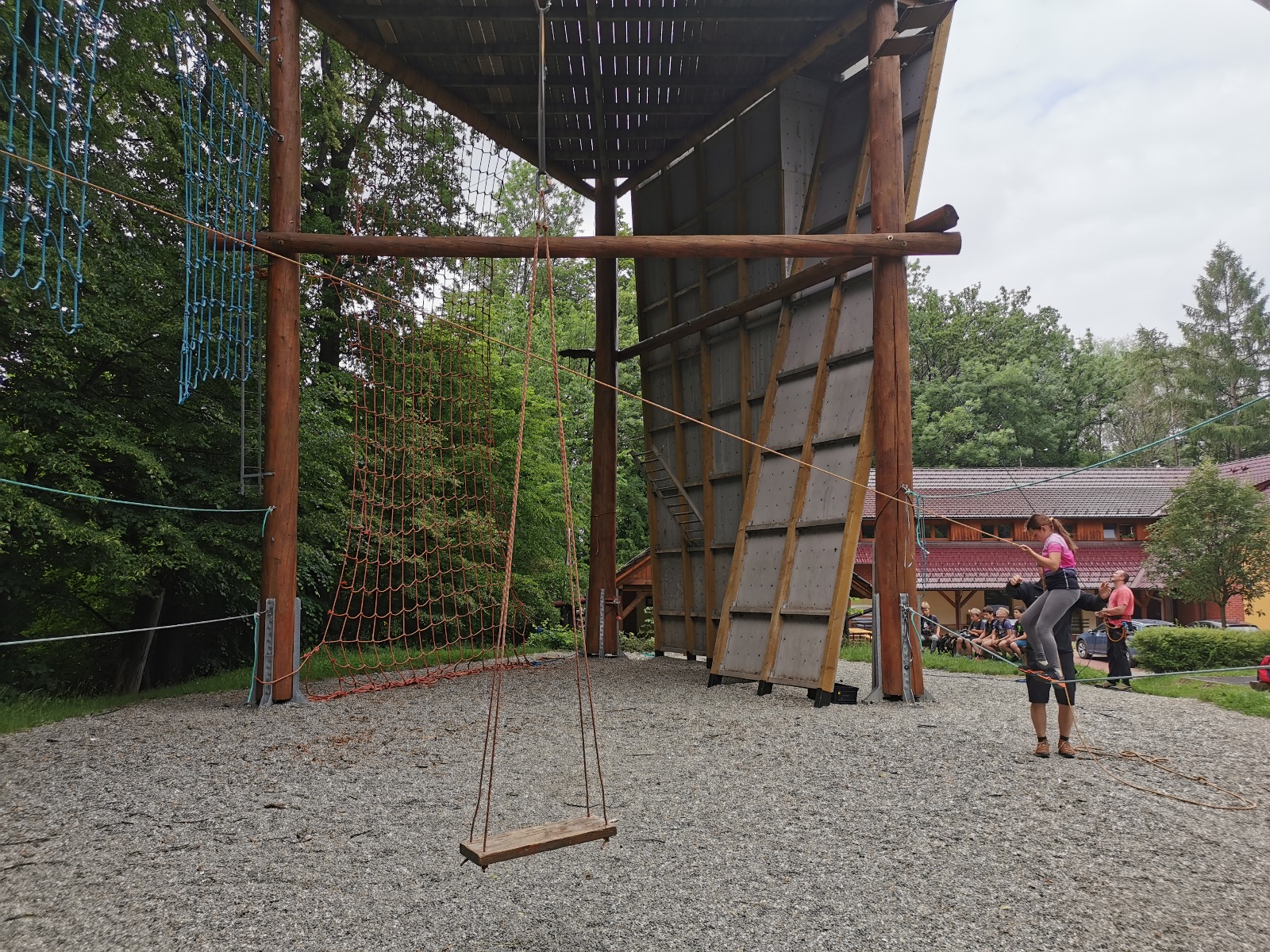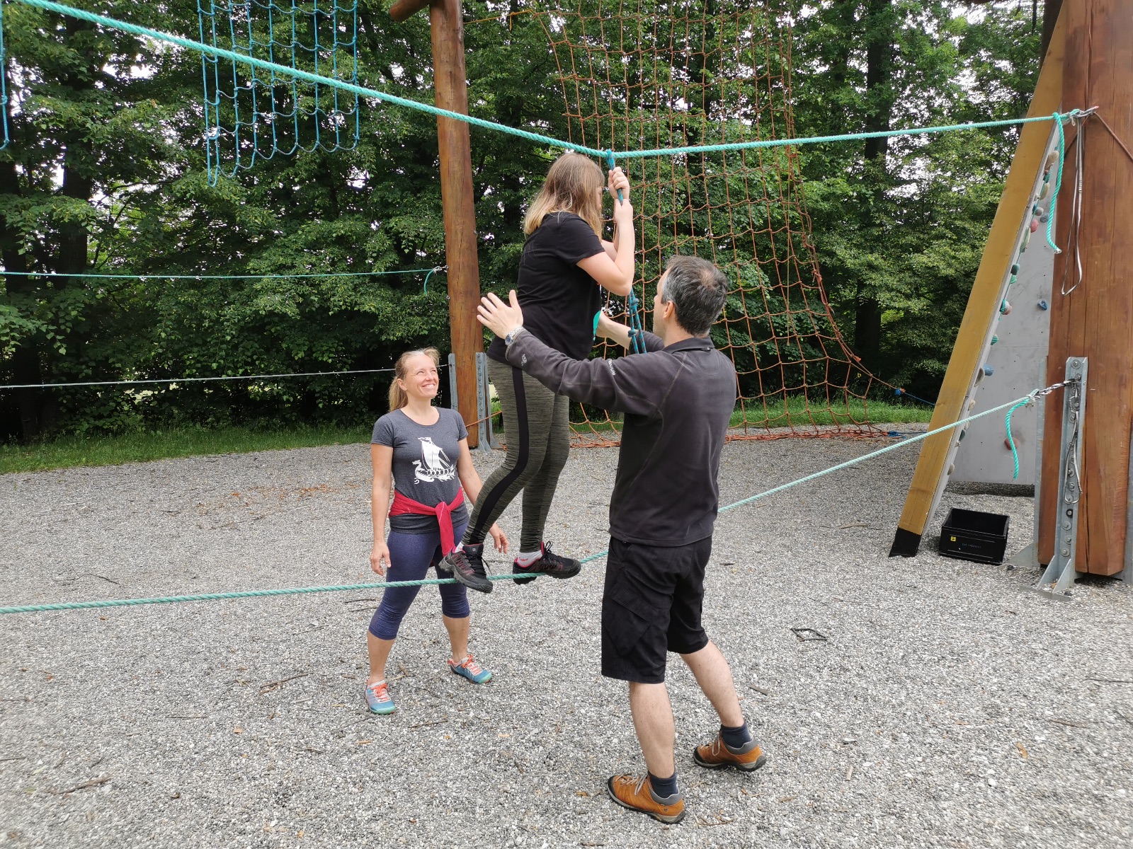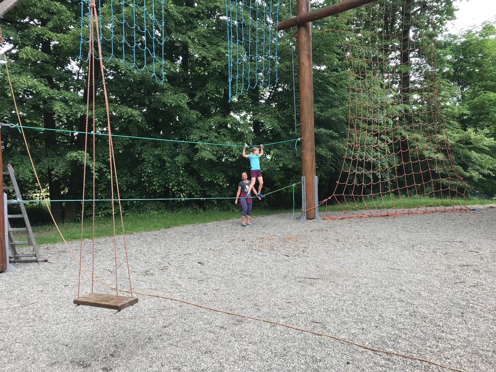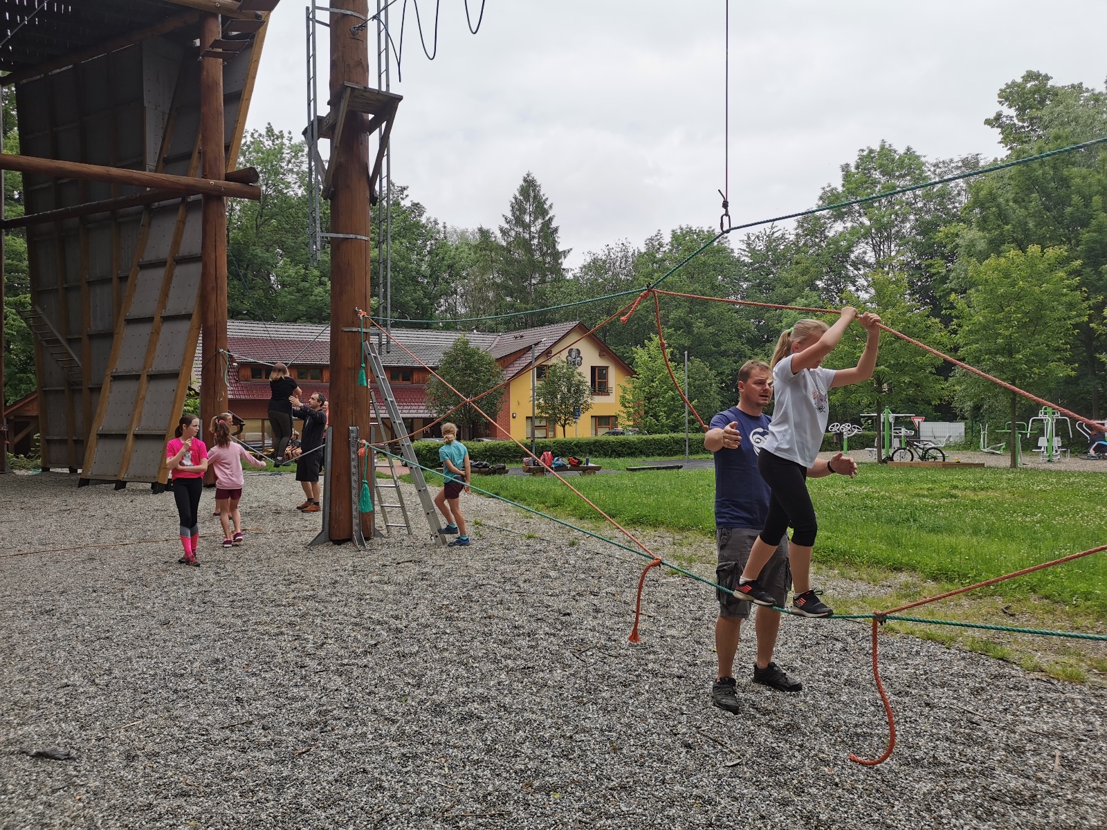 Zůstali jsme rozdělení i dále, kluci se vydali na lezeckou stěnu, holky na nízké lanové překážky. Po hodince se vystřídali. Kdo už byl přelanován, mohl si zahrát bariball, nebo si pocvičit na venkovních mašinách.
