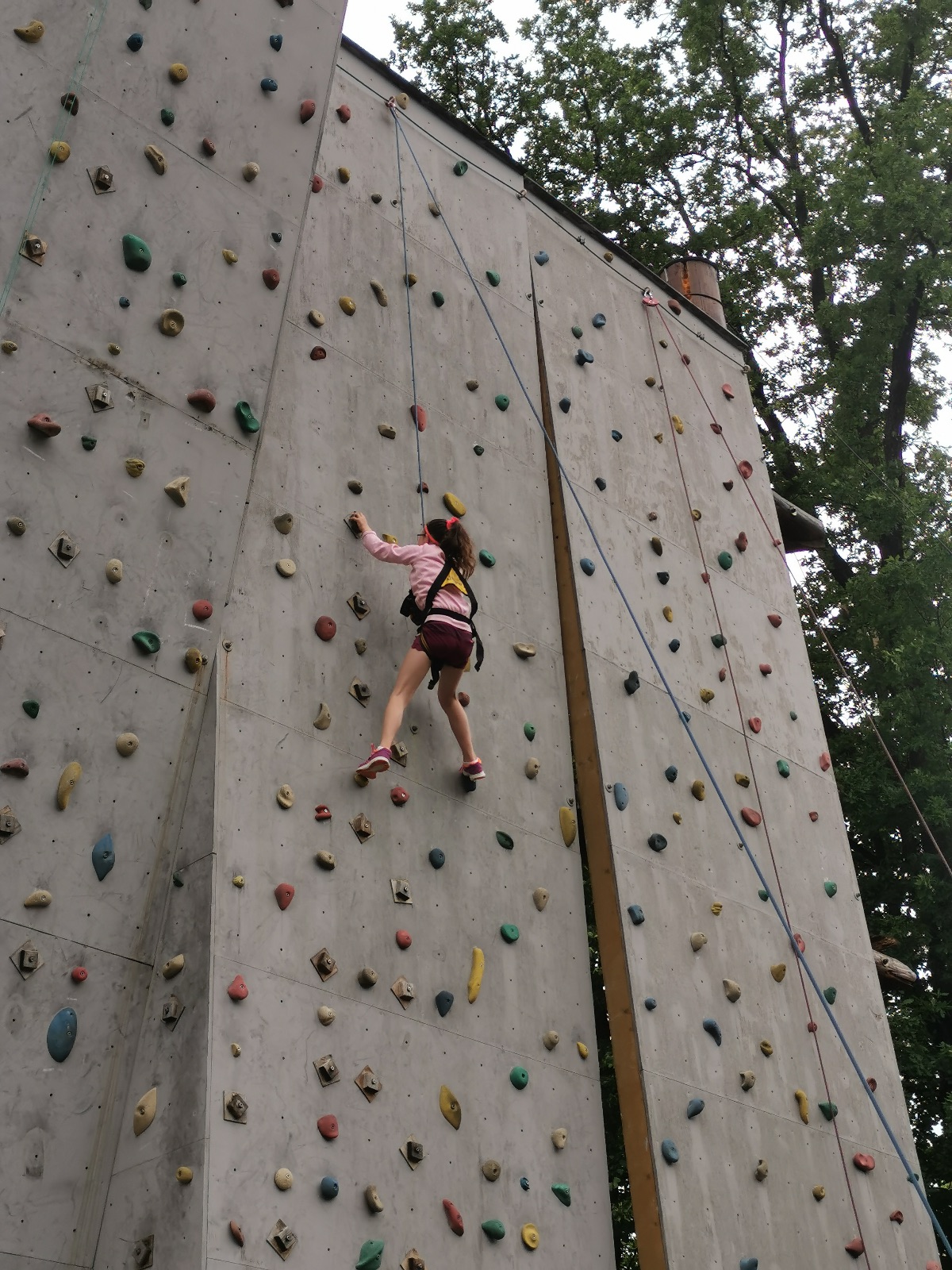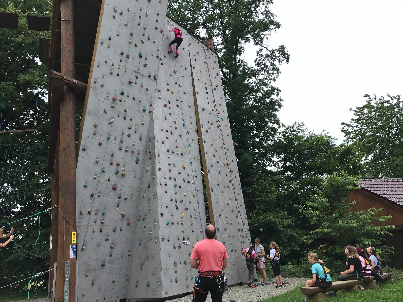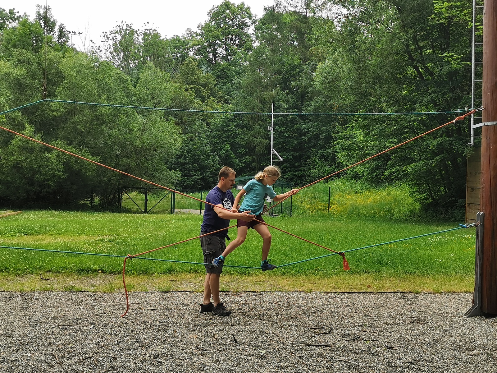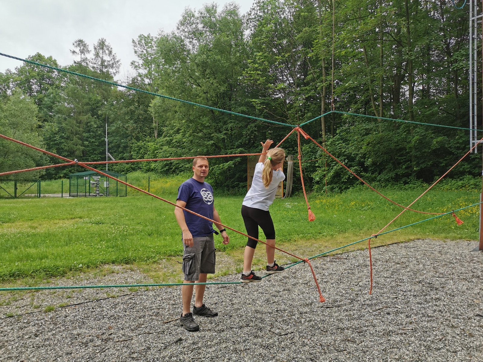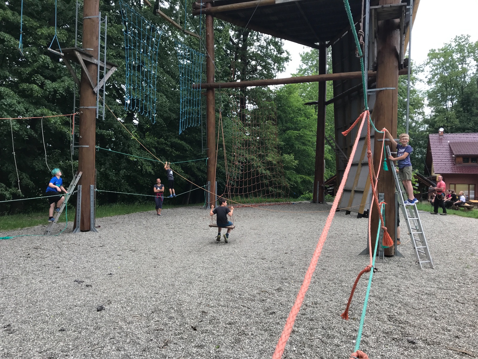 Zůstali jsme rozdělení i dále, kluci se vydali na lezeckou stěnu, holky na nízké lanové překážky. Po hodince se vystřídali. Kdo už byl přelanován, mohl si zahrát bariball, nebo si pocvičit na venkovních mašinách.