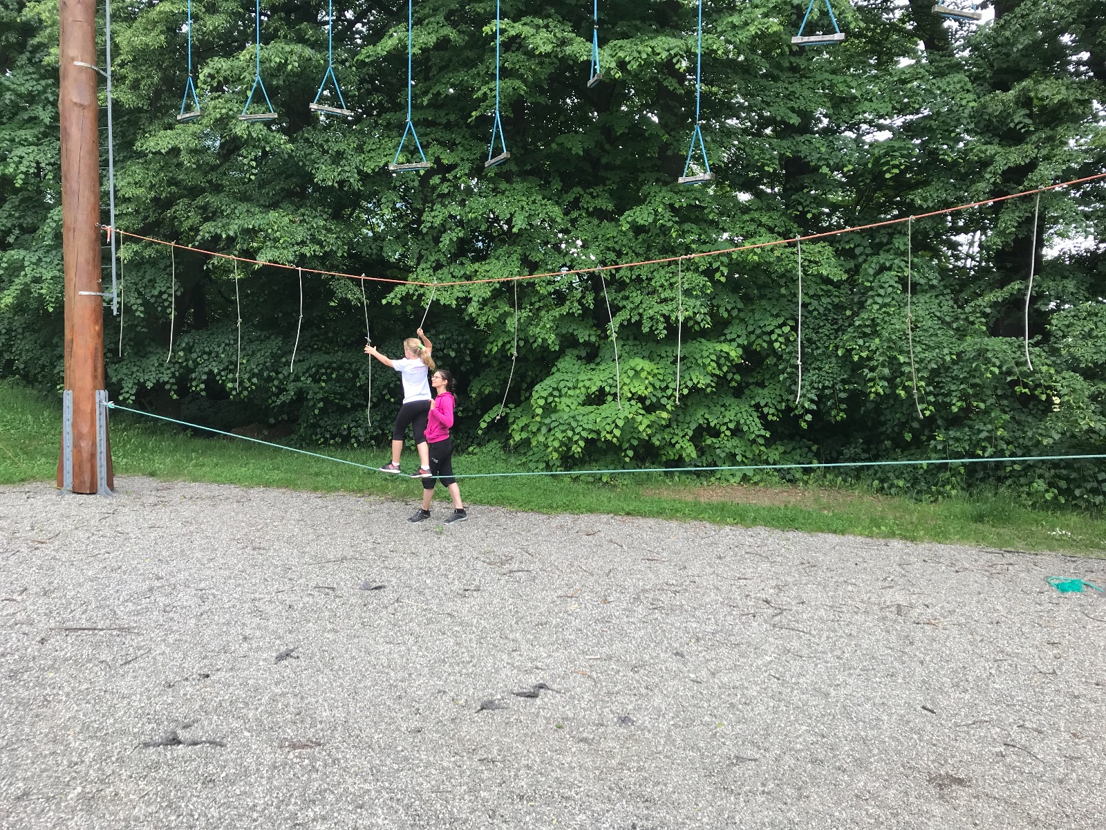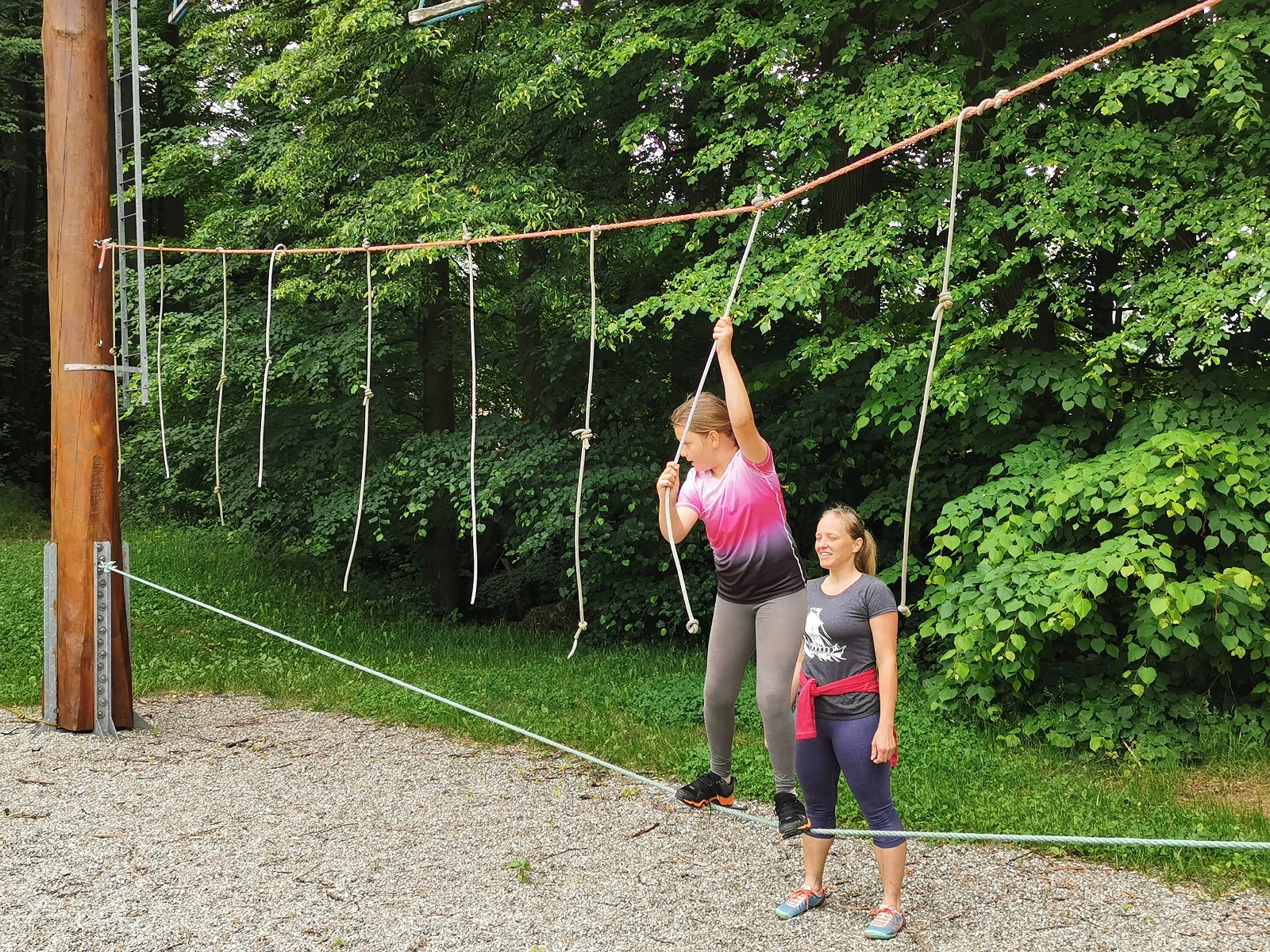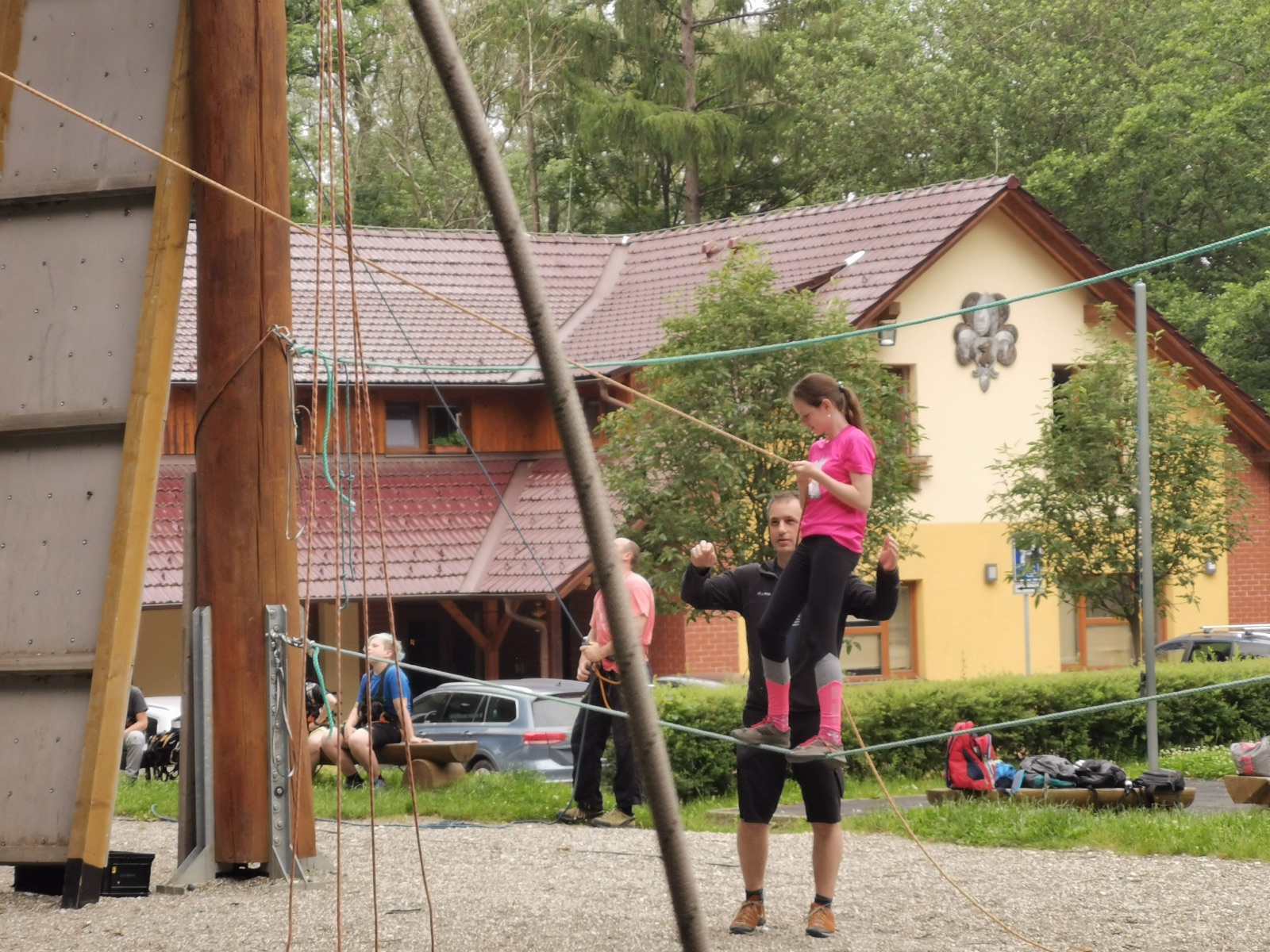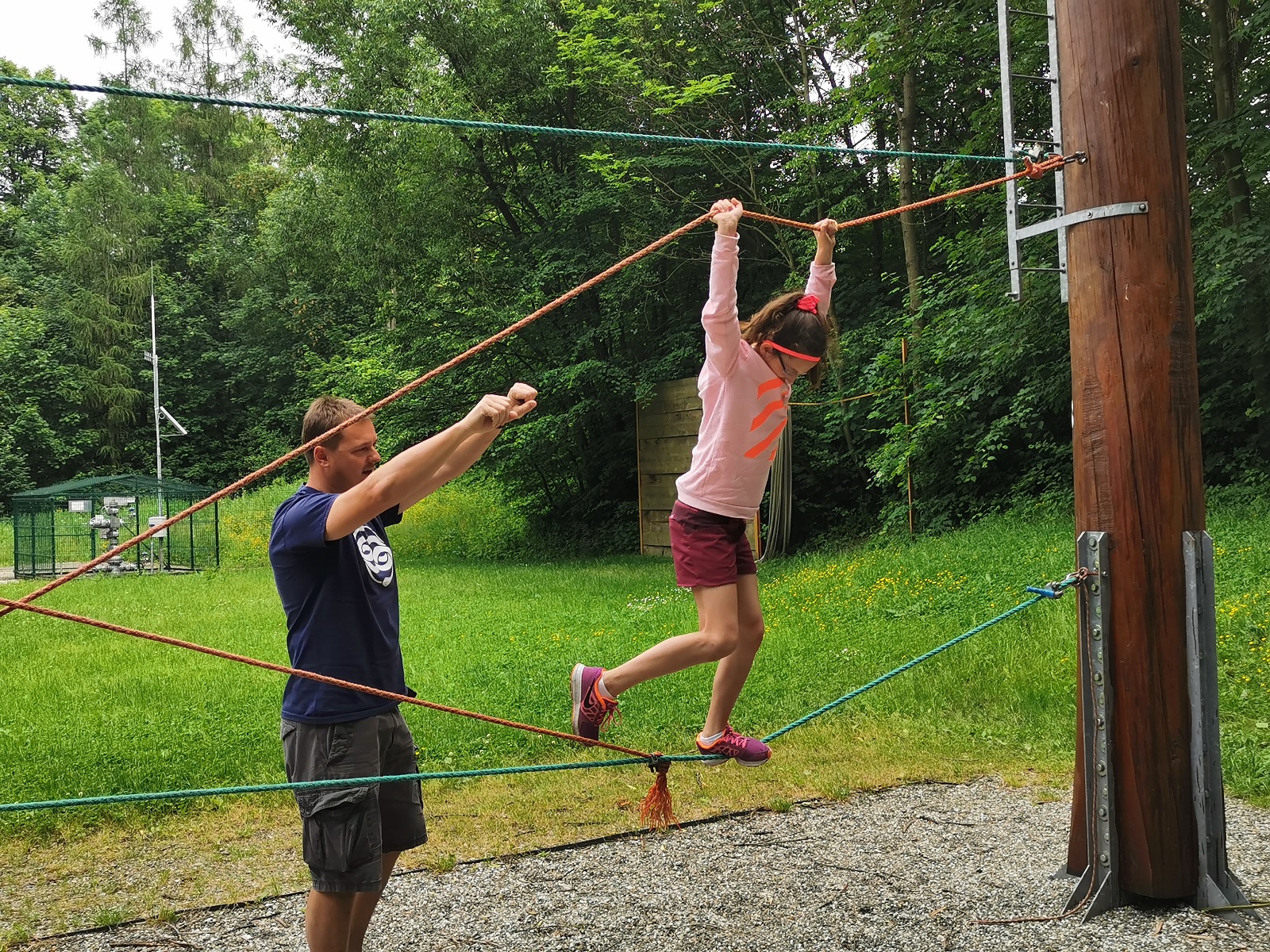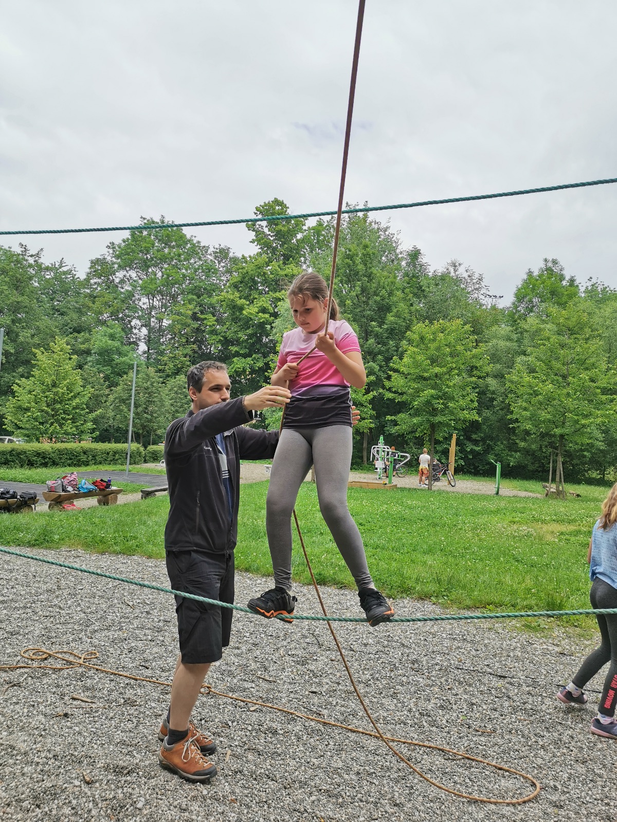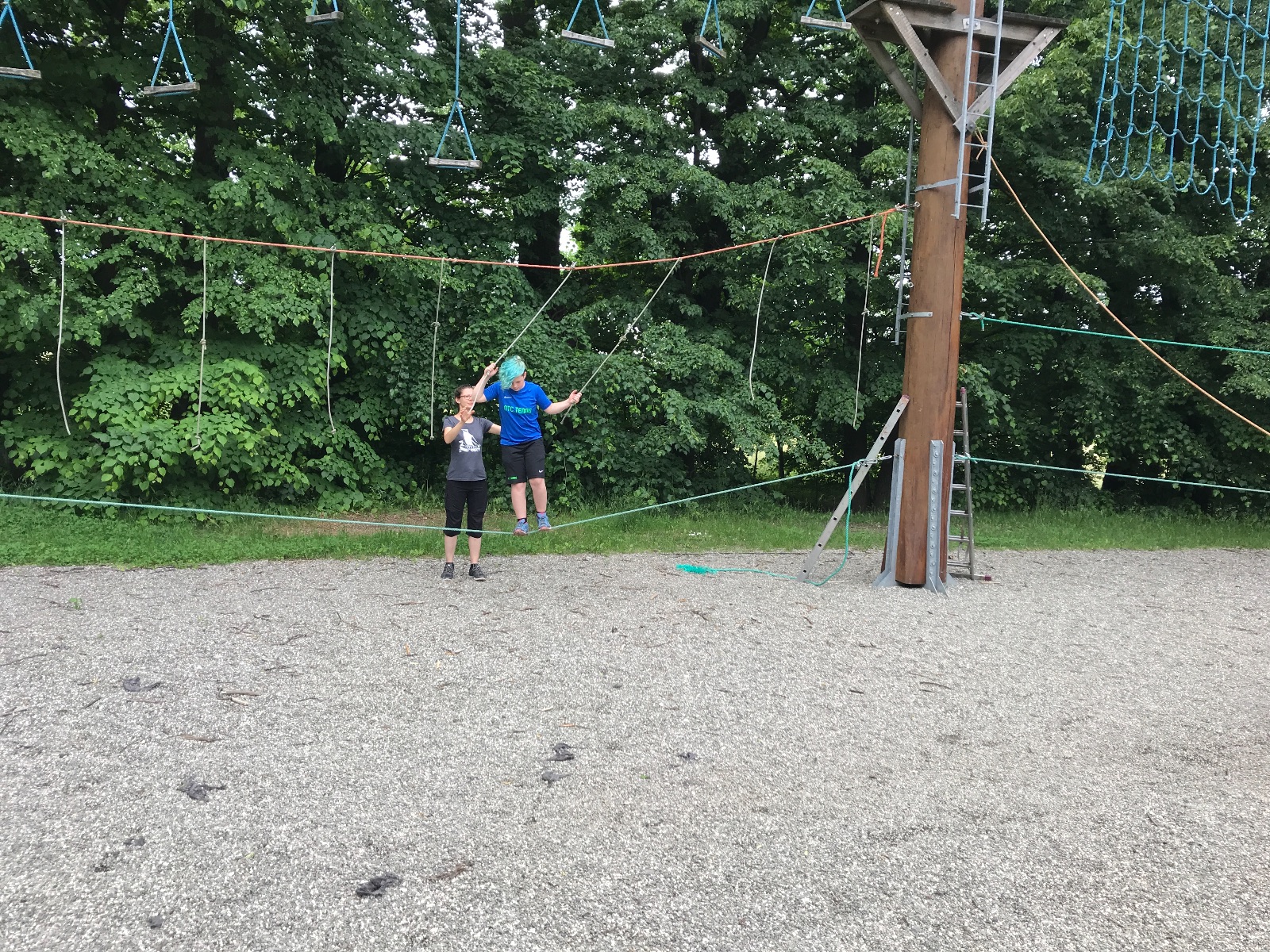 Zůstali jsme rozdělení i dále, kluci se vydali na lezeckou stěnu, holky na nízké lanové překážky. Po hodince se vystřídali. Kdo už byl přelanován, mohl si zahrát bariball, nebo si pocvičit na venkovních mašinách.