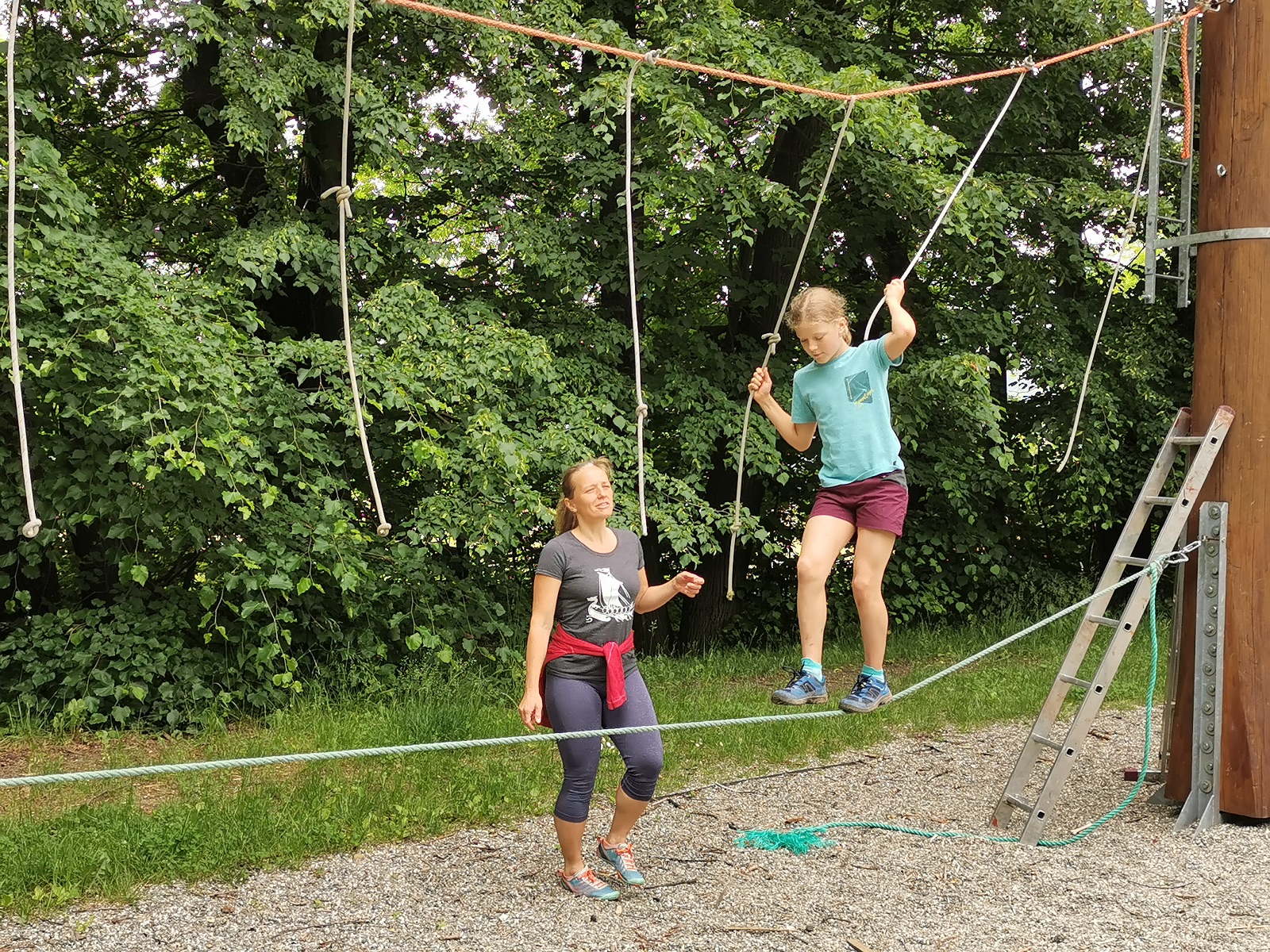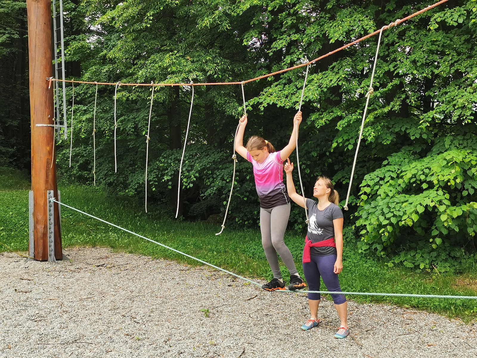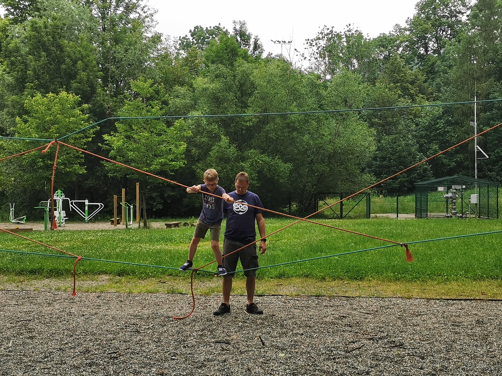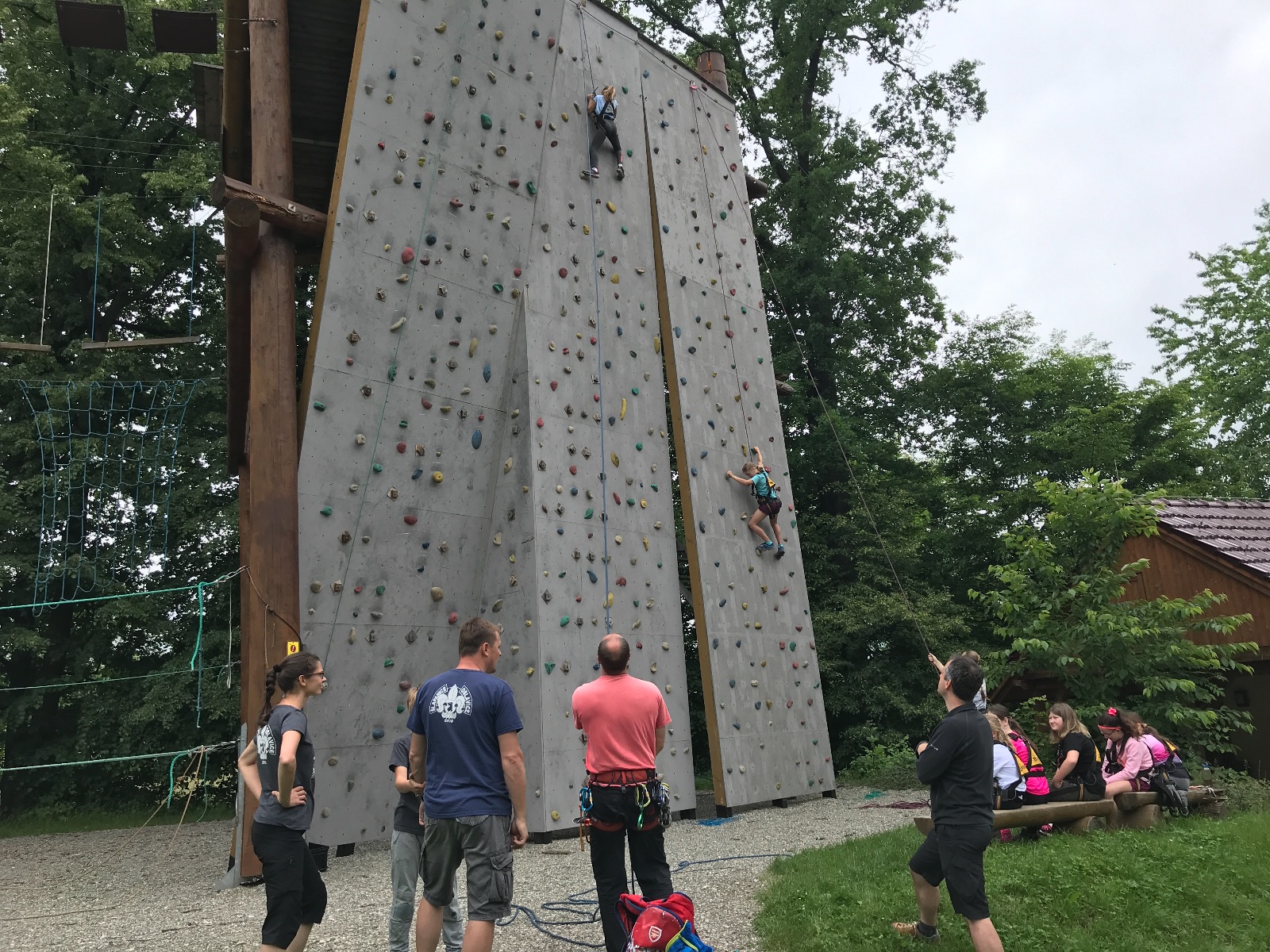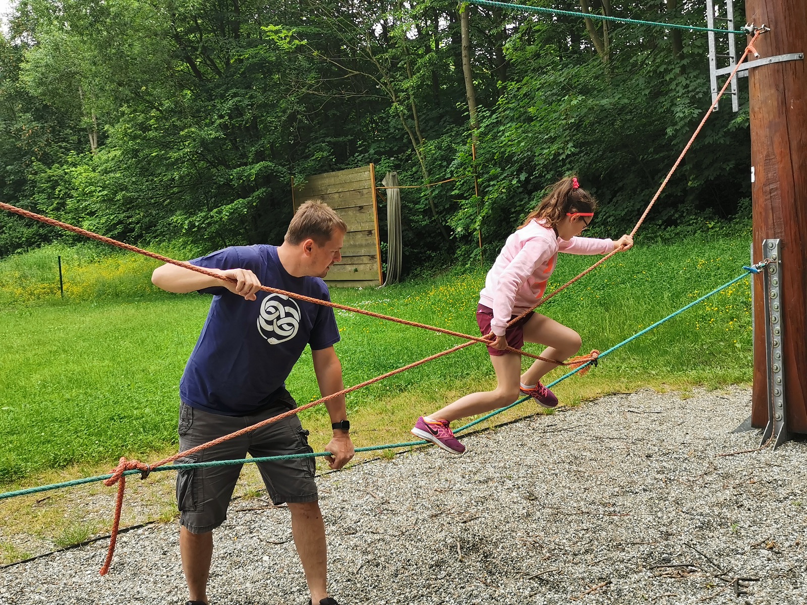 Zůstali jsme rozdělení i dále, kluci se vydali na lezeckou stěnu, holky na nízké lanové překážky. Po hodince se vystřídali. Kdo už byl přelanován, mohl si zahrát bariball, nebo si pocvičit na venkovních mašinách.