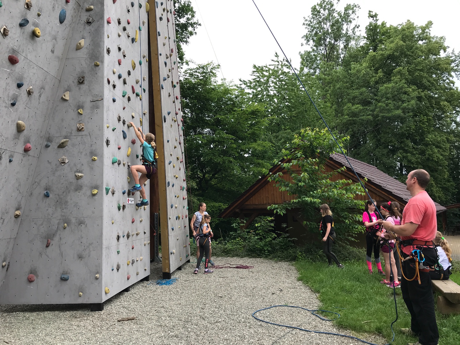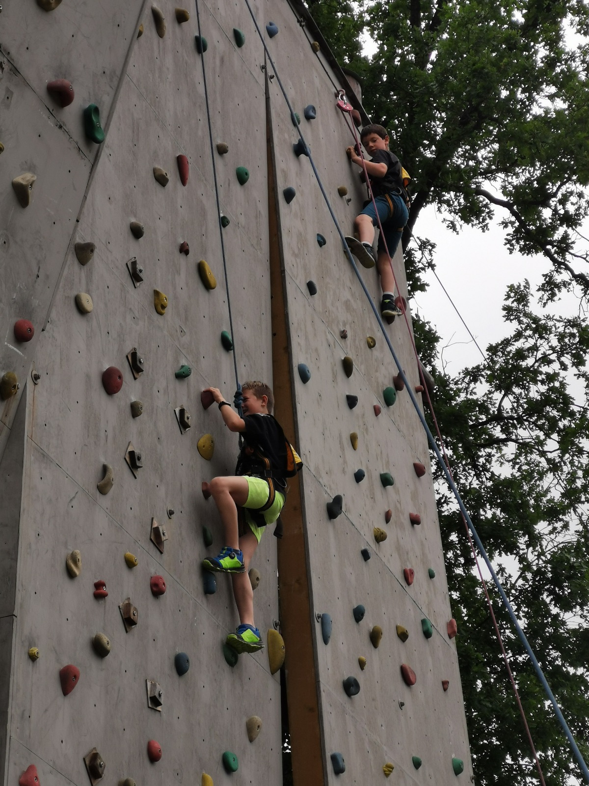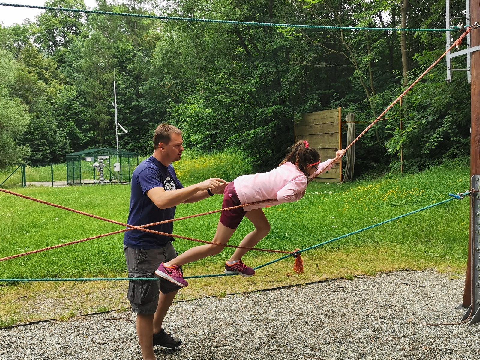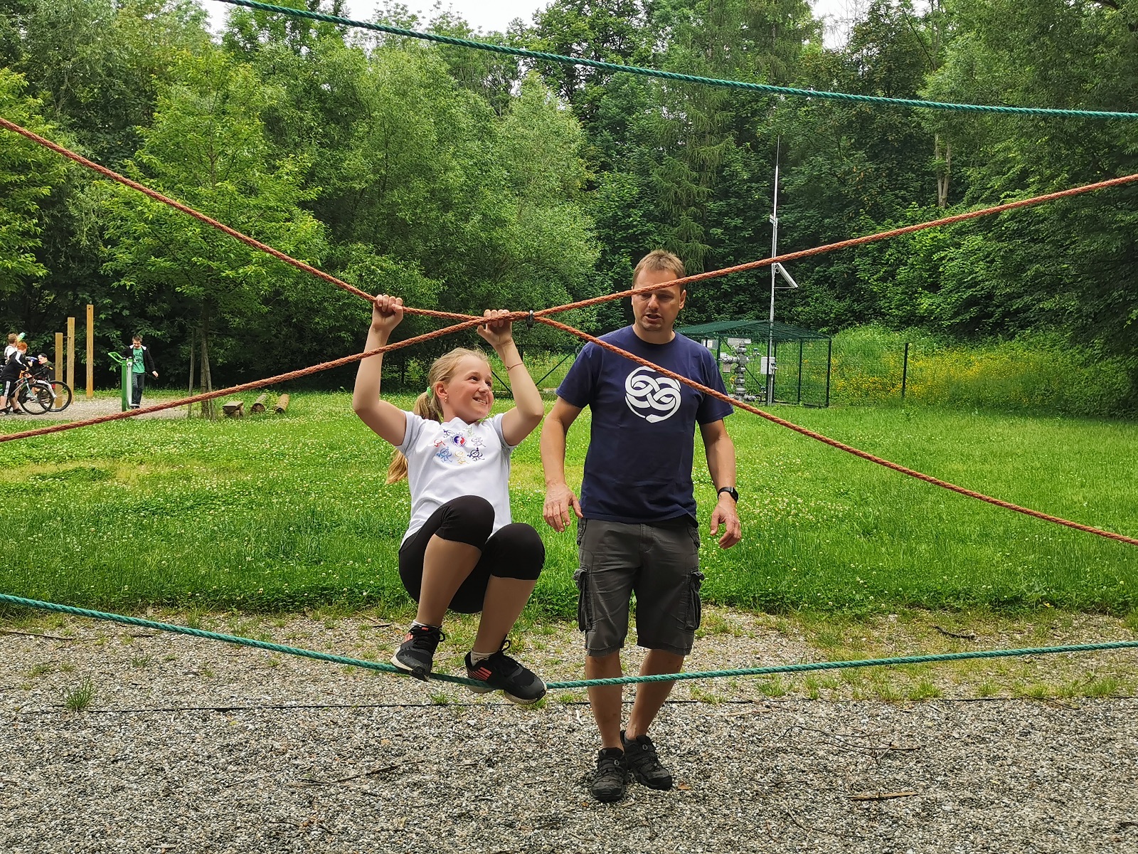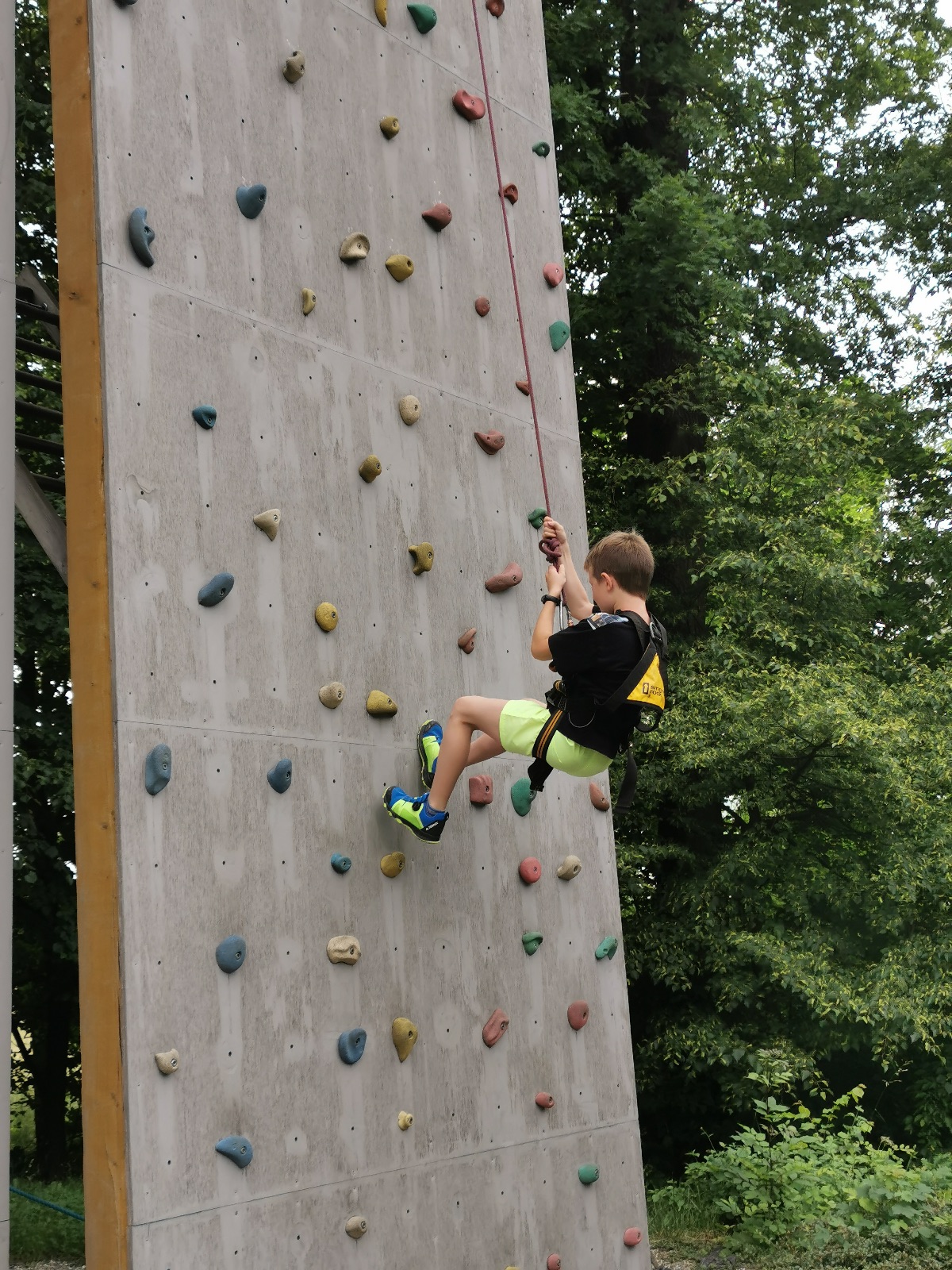 Zůstali jsme rozdělení i dále, kluci se vydali na lezeckou stěnu, holky na nízké lanové překážky. Po hodince se vystřídali. Kdo už byl přelanován, mohl si zahrát bariball, nebo si pocvičit na venkovních mašinách.