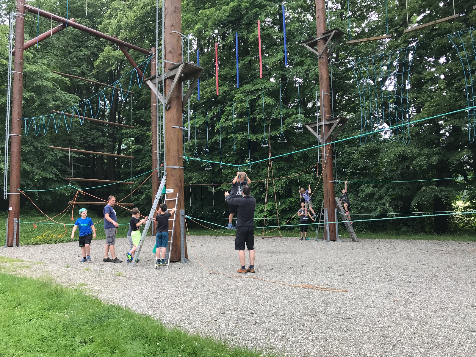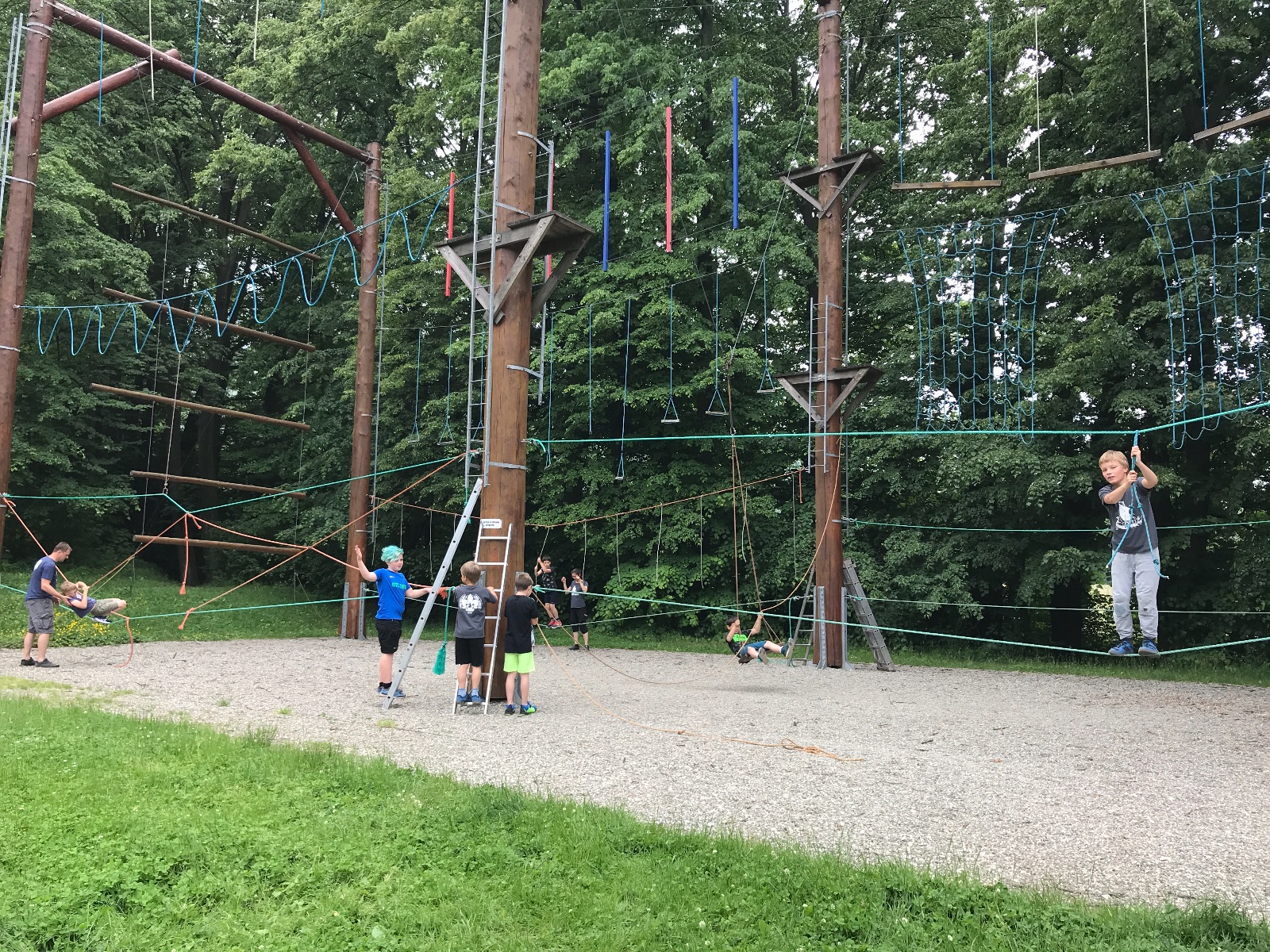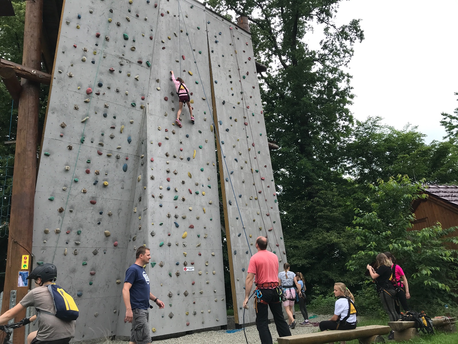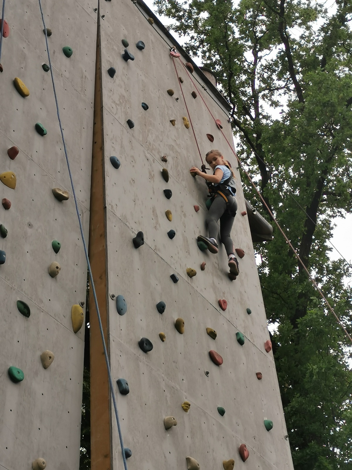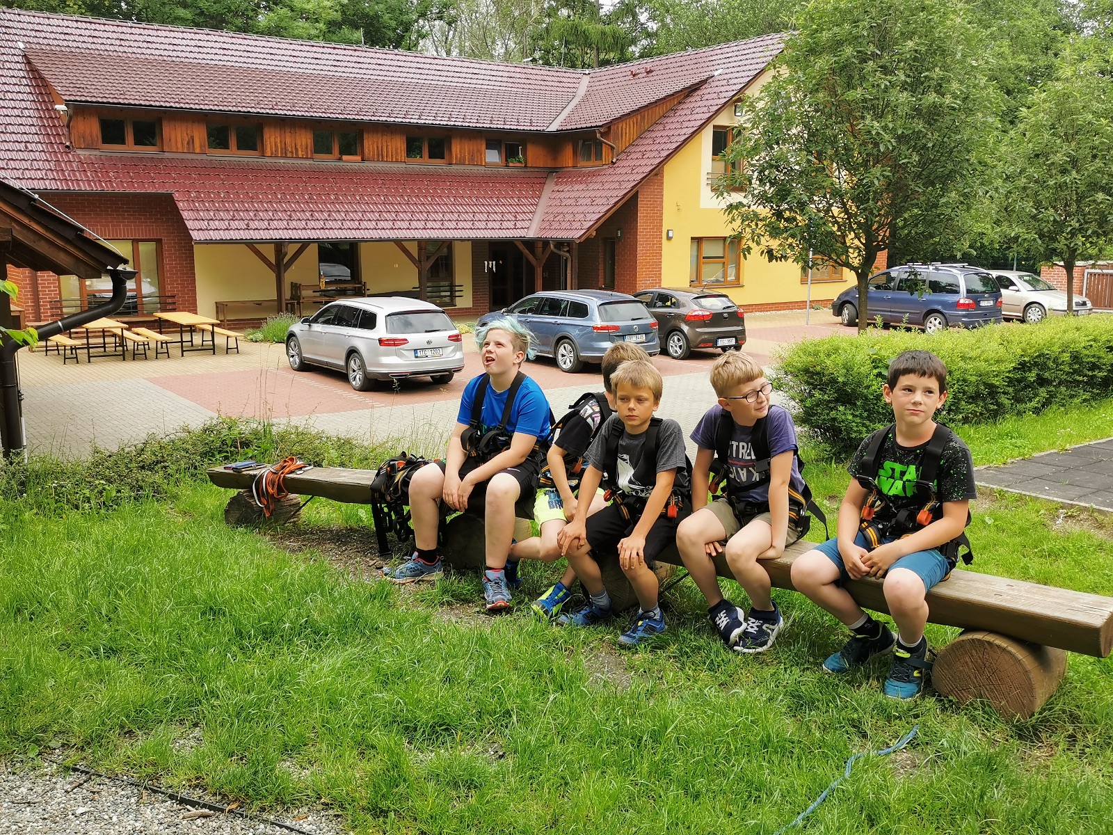 Zůstali jsme rozdělení i dále, kluci se vydali na lezeckou stěnu, holky na nízké lanové překážky. Po hodince se vystřídali. Kdo už byl přelanován, mohl si zahrát bariball, nebo si pocvičit na venkovních mašinách.