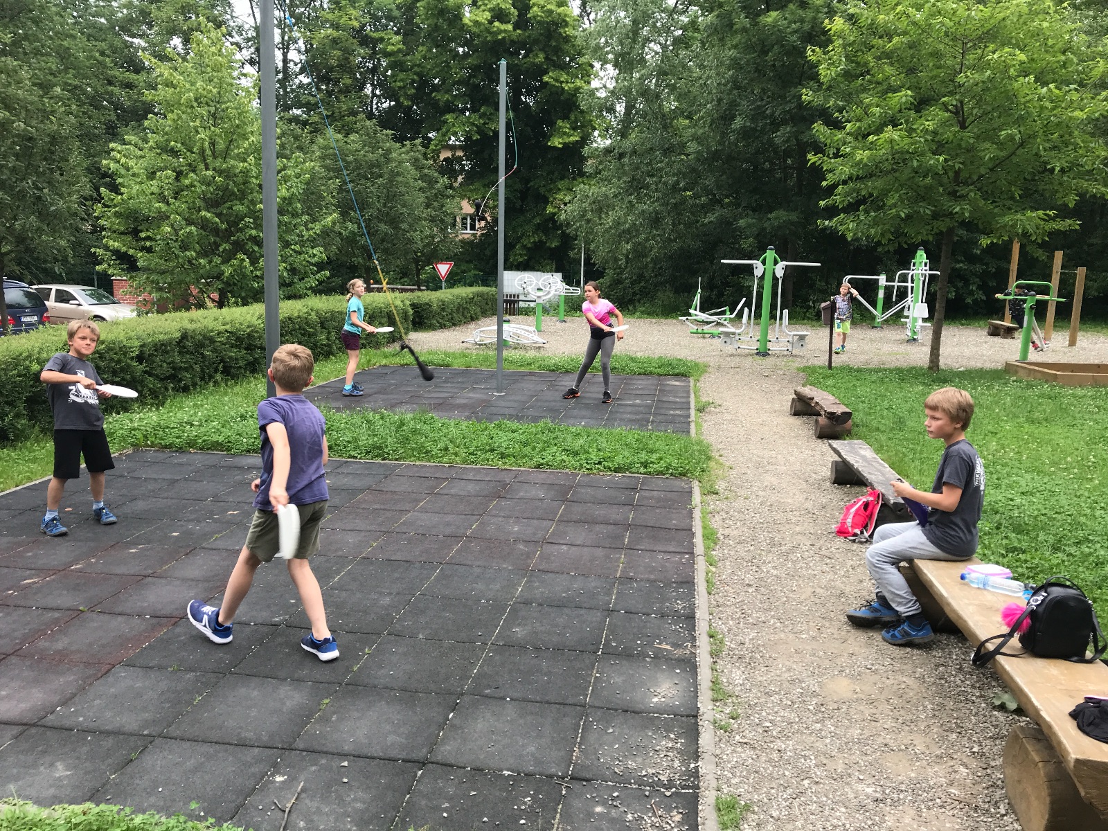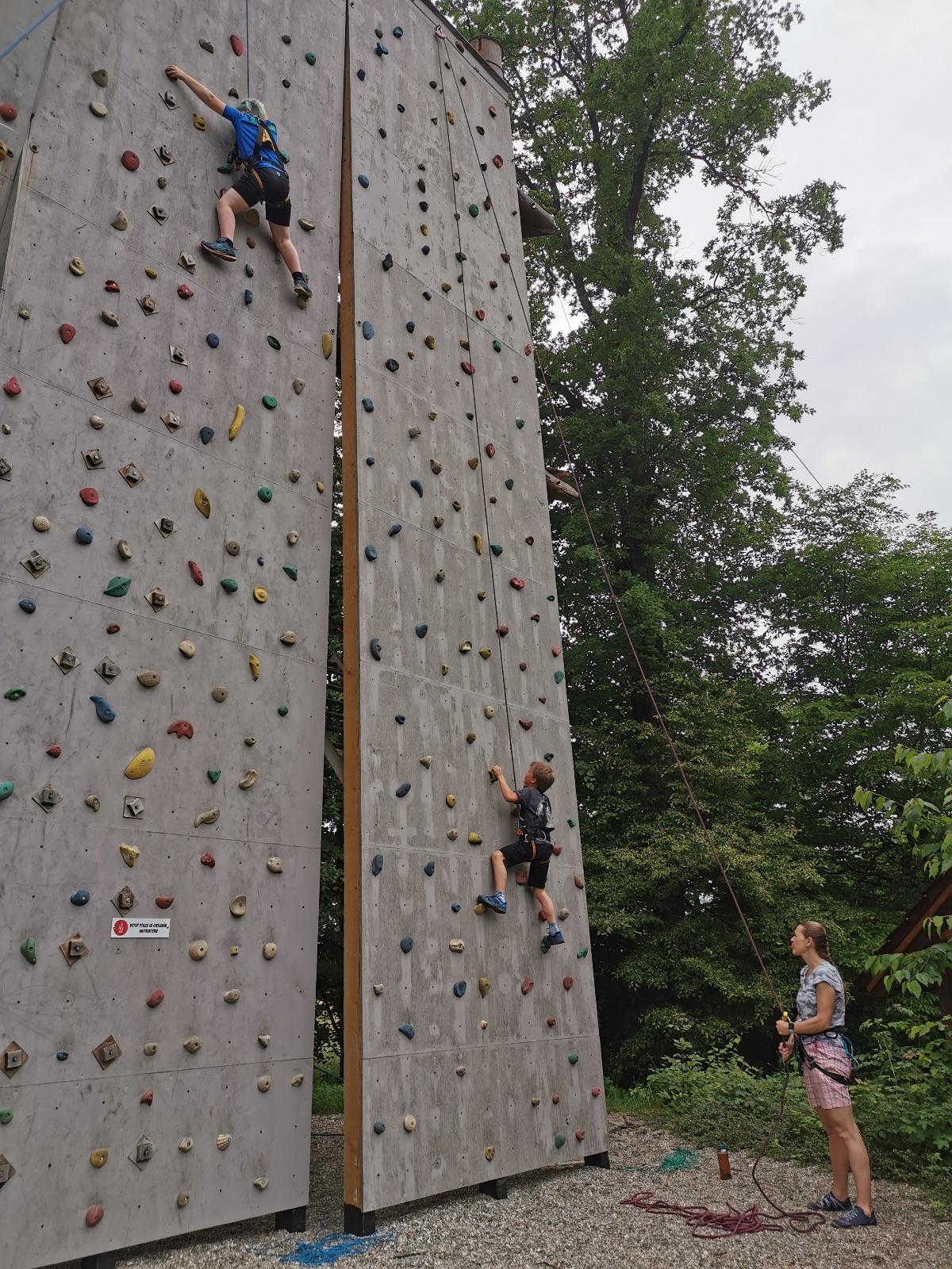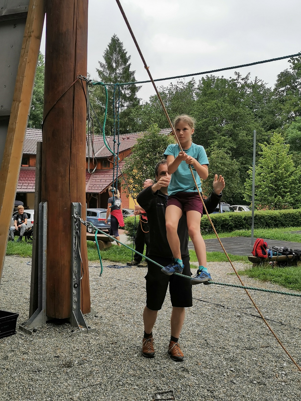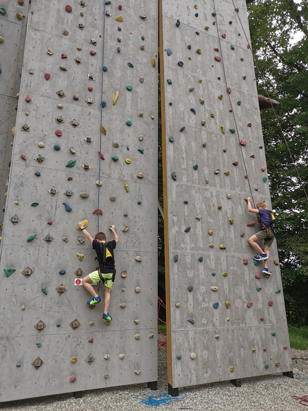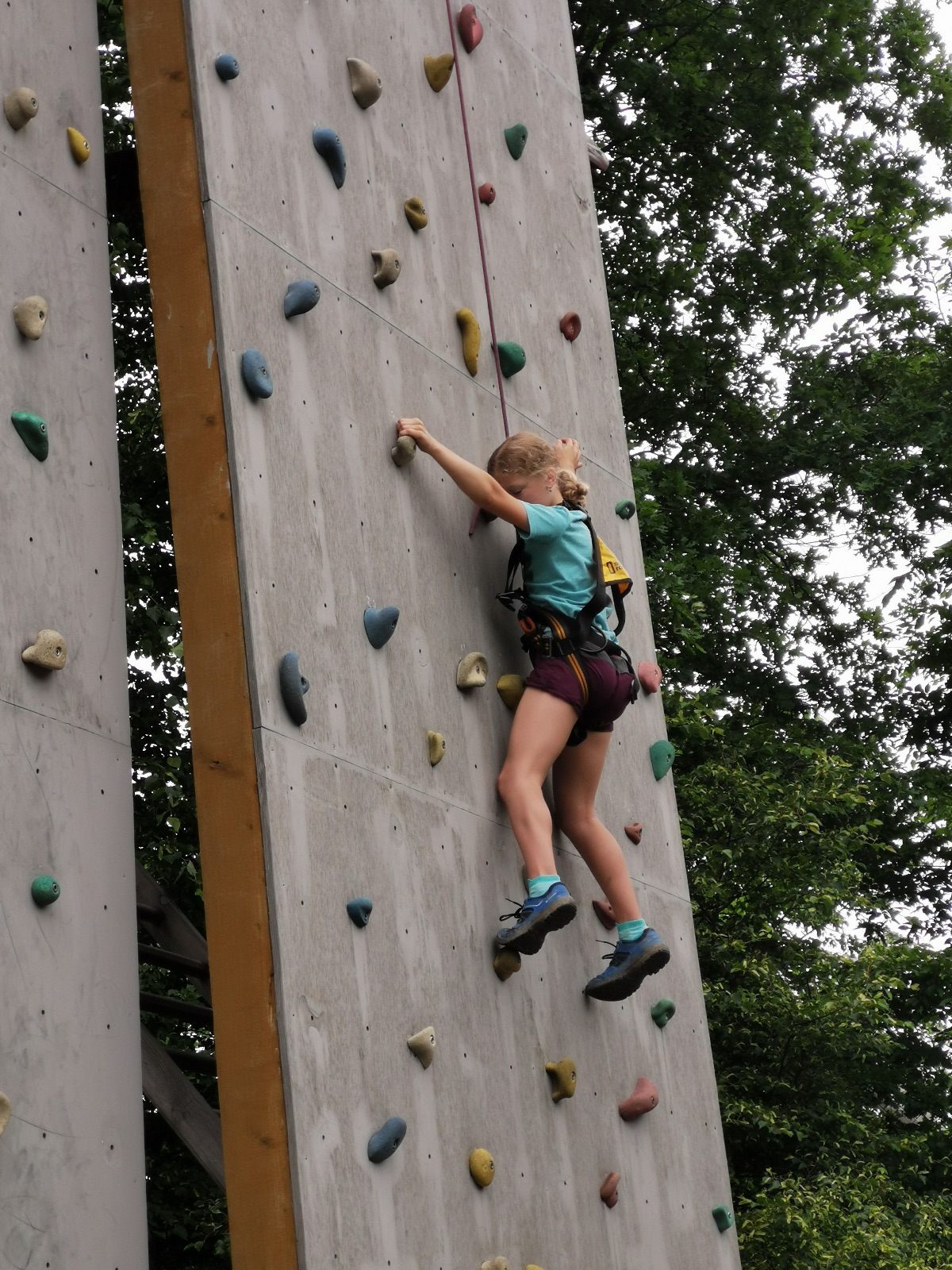 Zůstali jsme rozdělení i dále, kluci se vydali na lezeckou stěnu, holky na nízké lanové překážky. Po hodince se vystřídali. Kdo už byl přelanován, mohl si zahrát bariball, nebo si pocvičit na venkovních mašinách.
