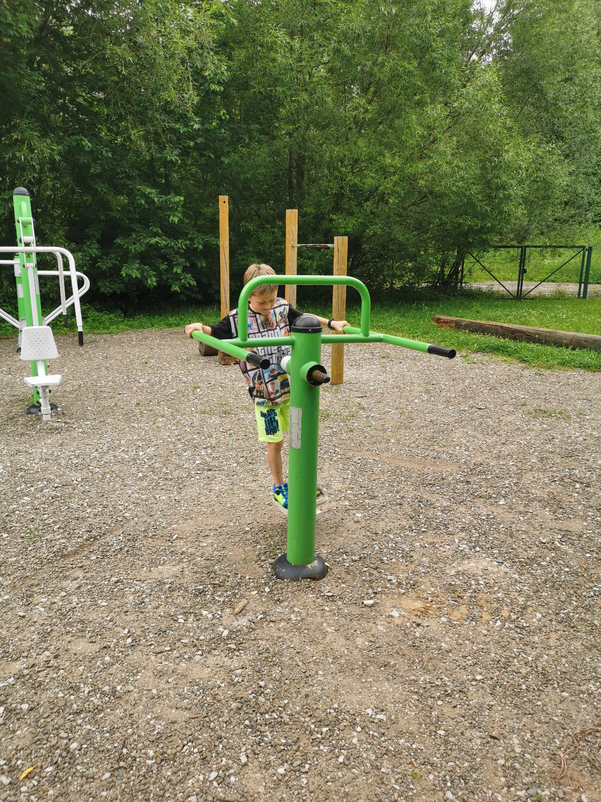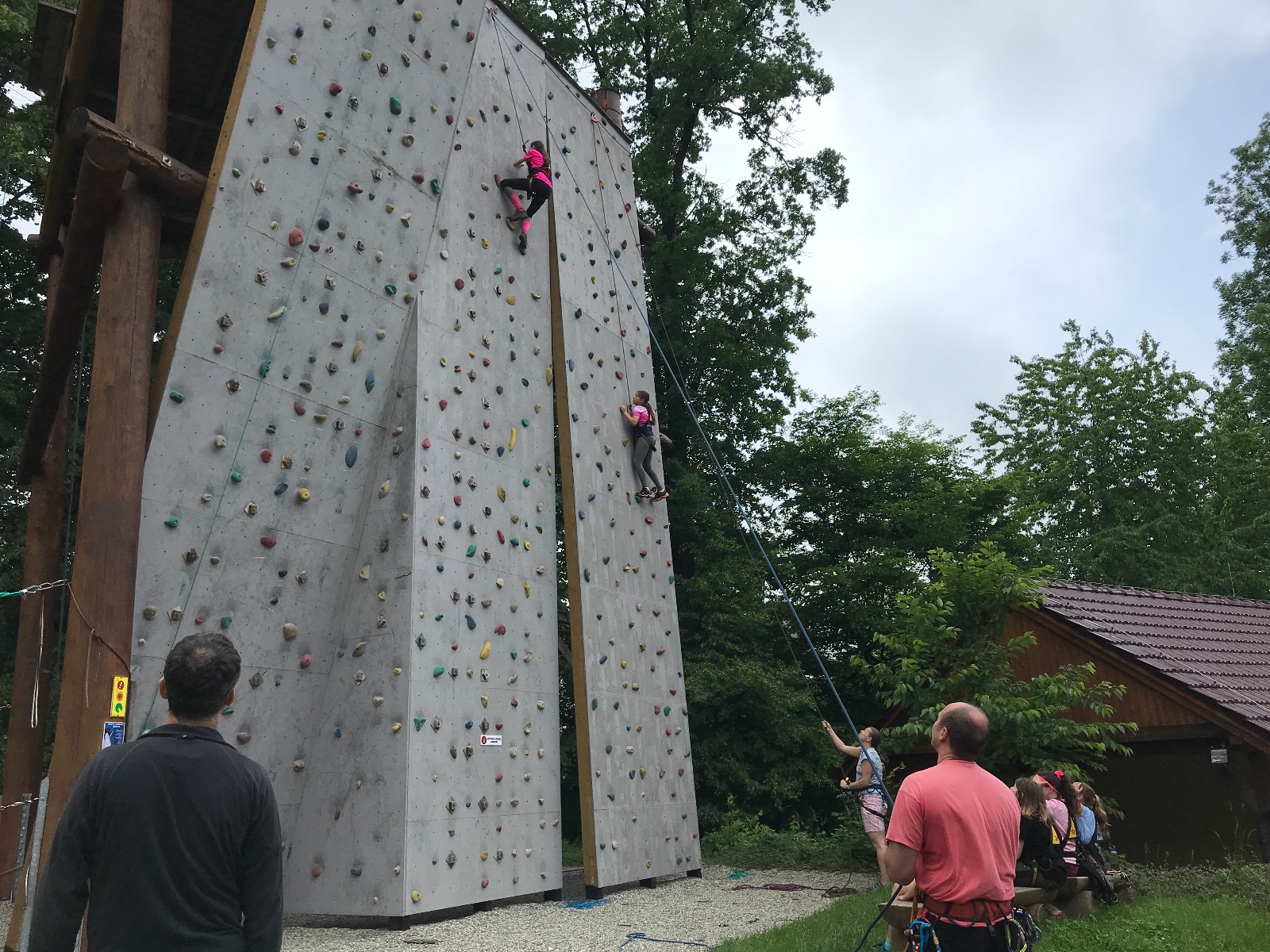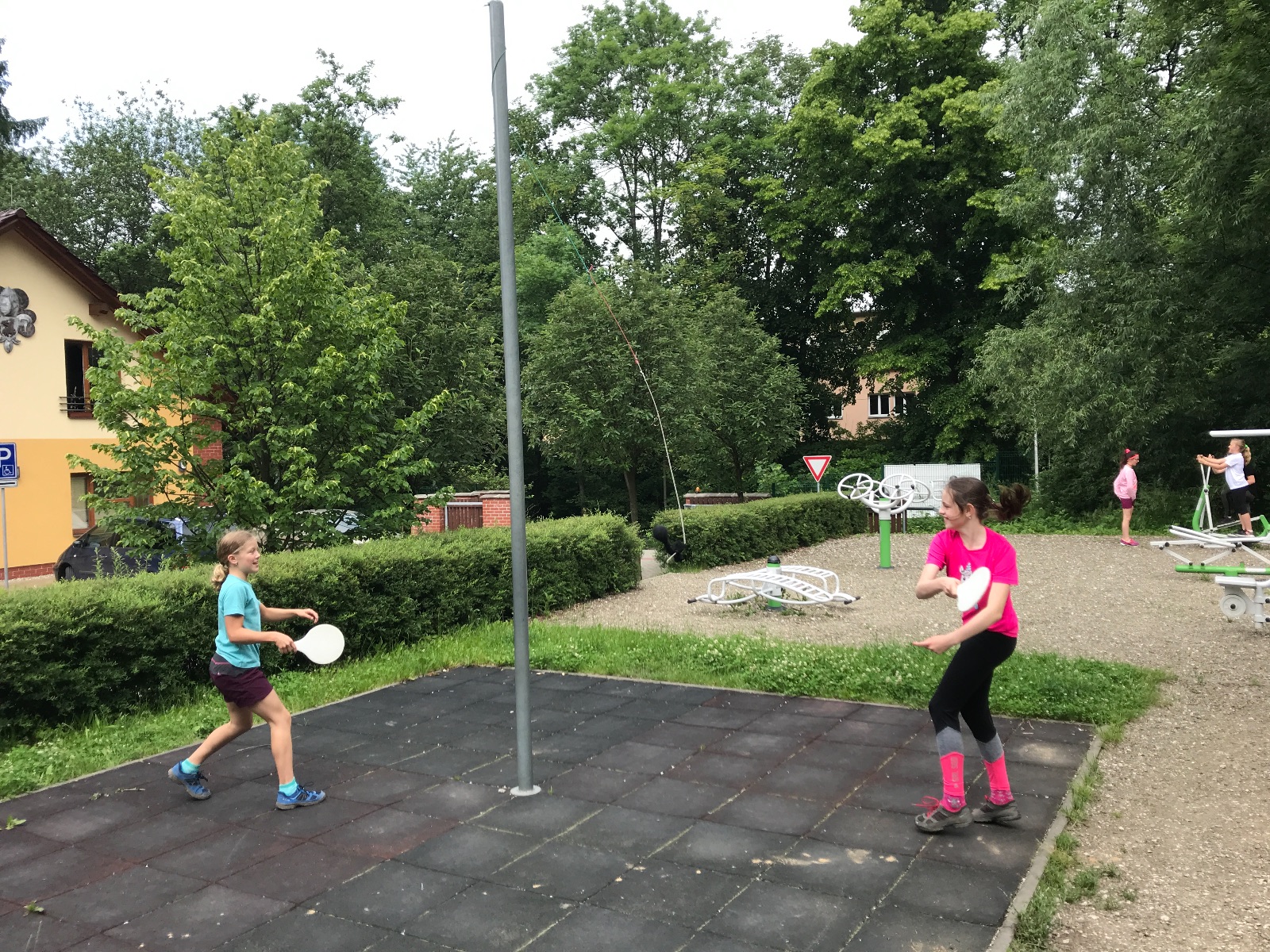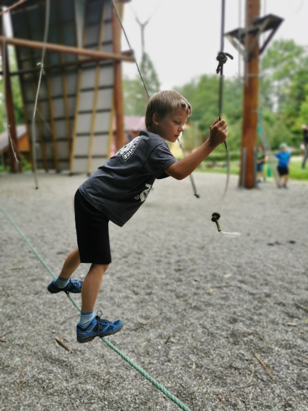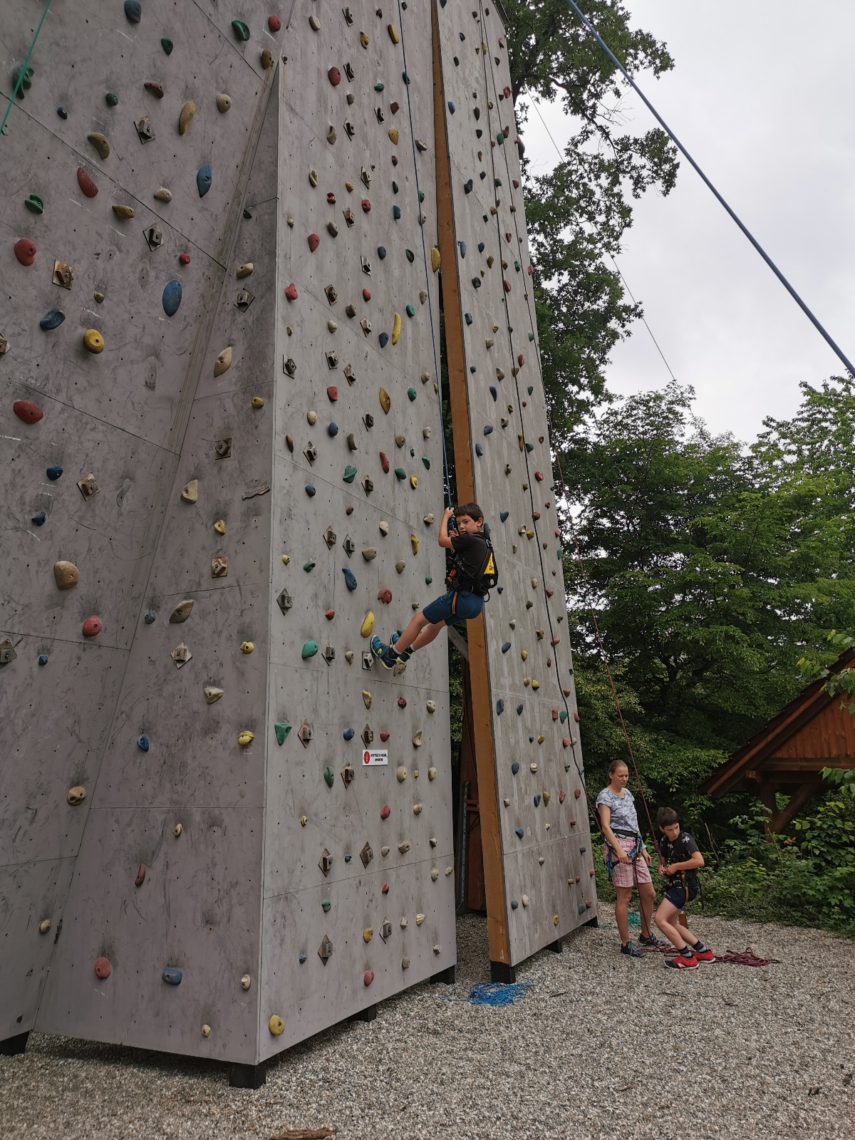 Zůstali jsme rozdělení i dále, kluci se vydali na lezeckou stěnu, holky na nízké lanové překážky. Po hodince se vystřídali. Kdo už byl přelanován, mohl si zahrát bariball, nebo si pocvičit na venkovních mašinách.