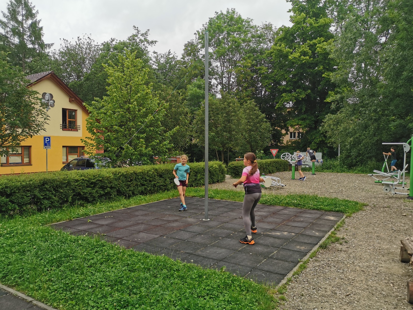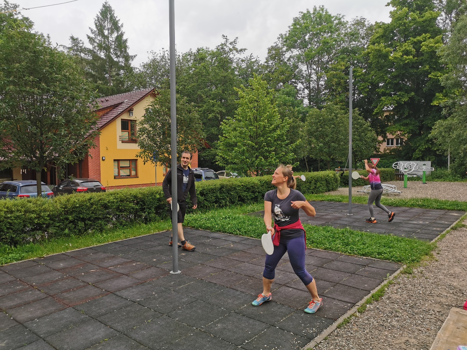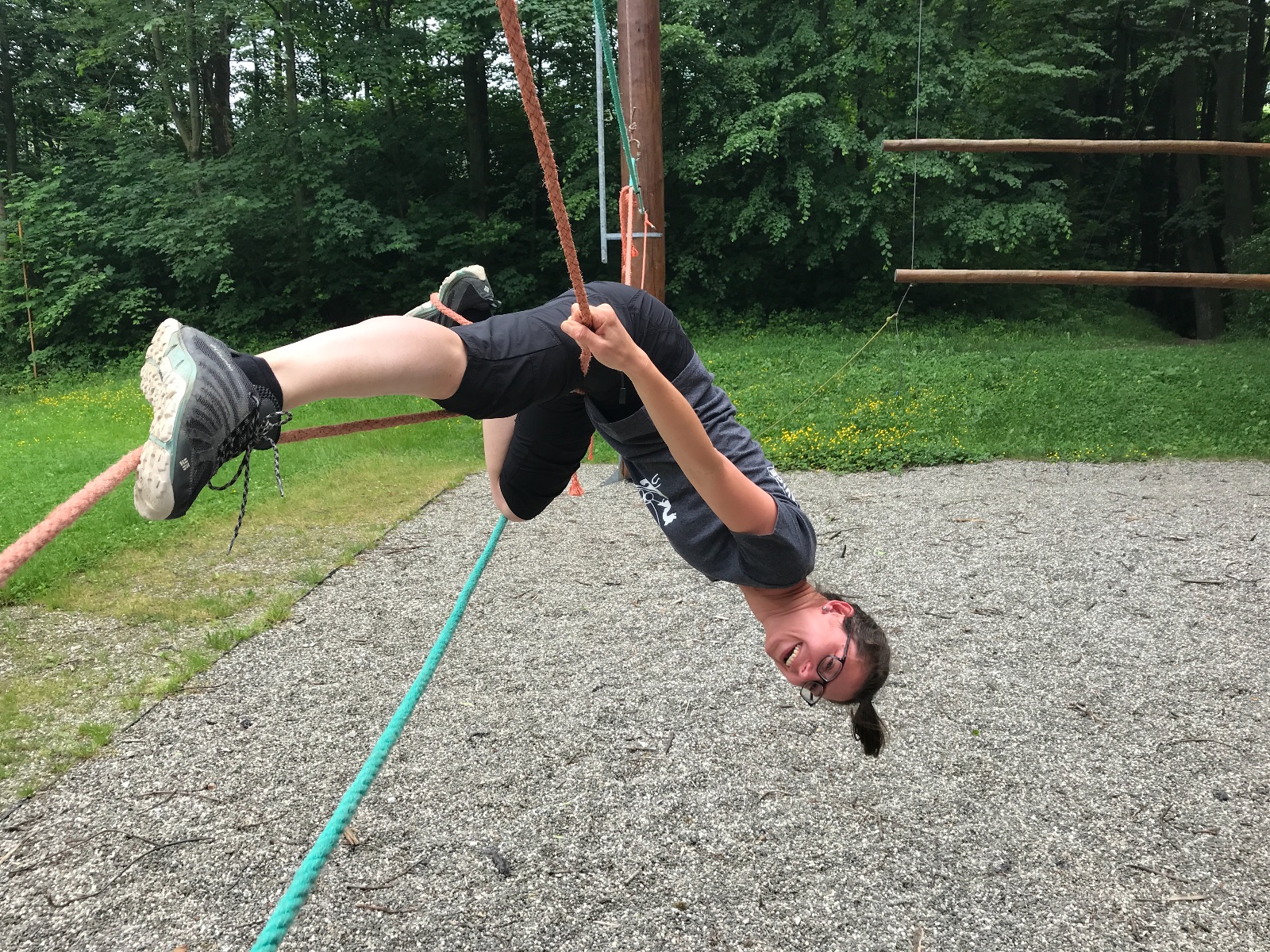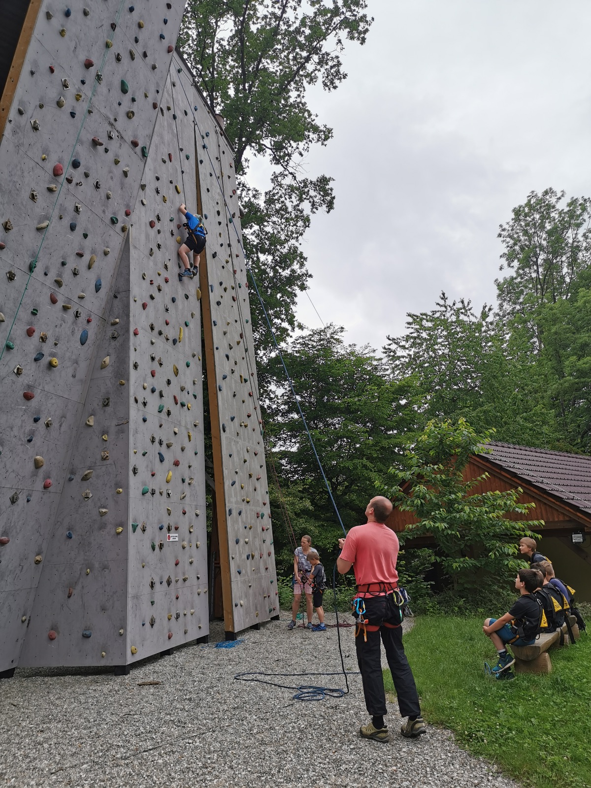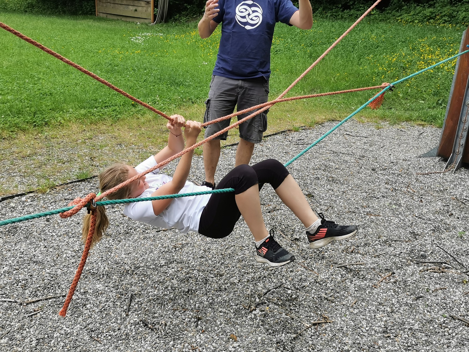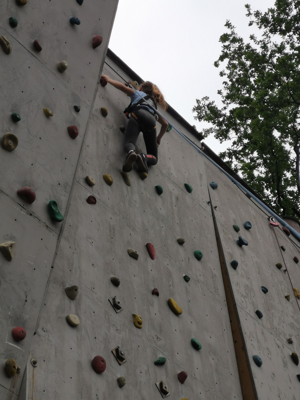 Zůstali jsme rozdělení i dále, kluci se vydali na lezeckou stěnu, holky na nízké lanové překážky. Po hodince se vystřídali. Kdo už byl přelanován, mohl si zahrát bariball, nebo si pocvičit na venkovních mašinách.