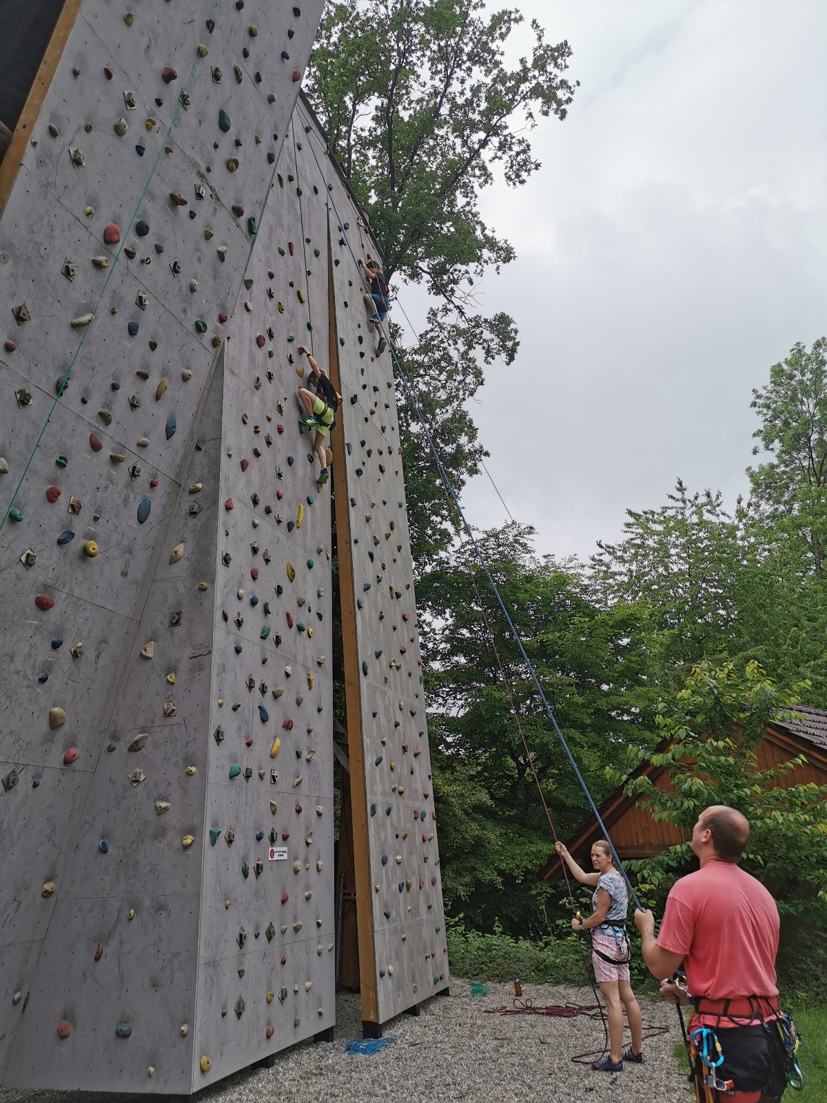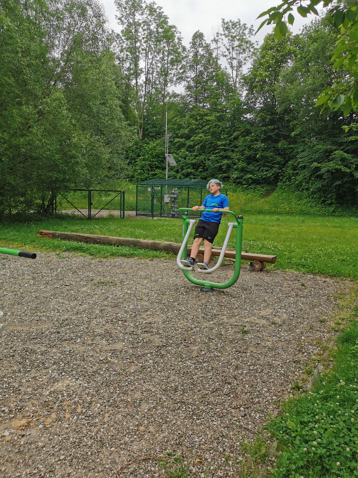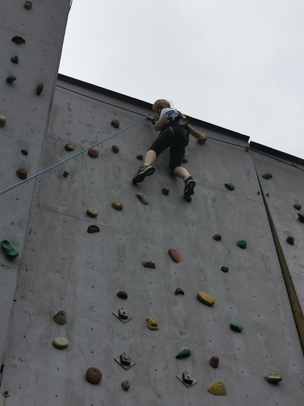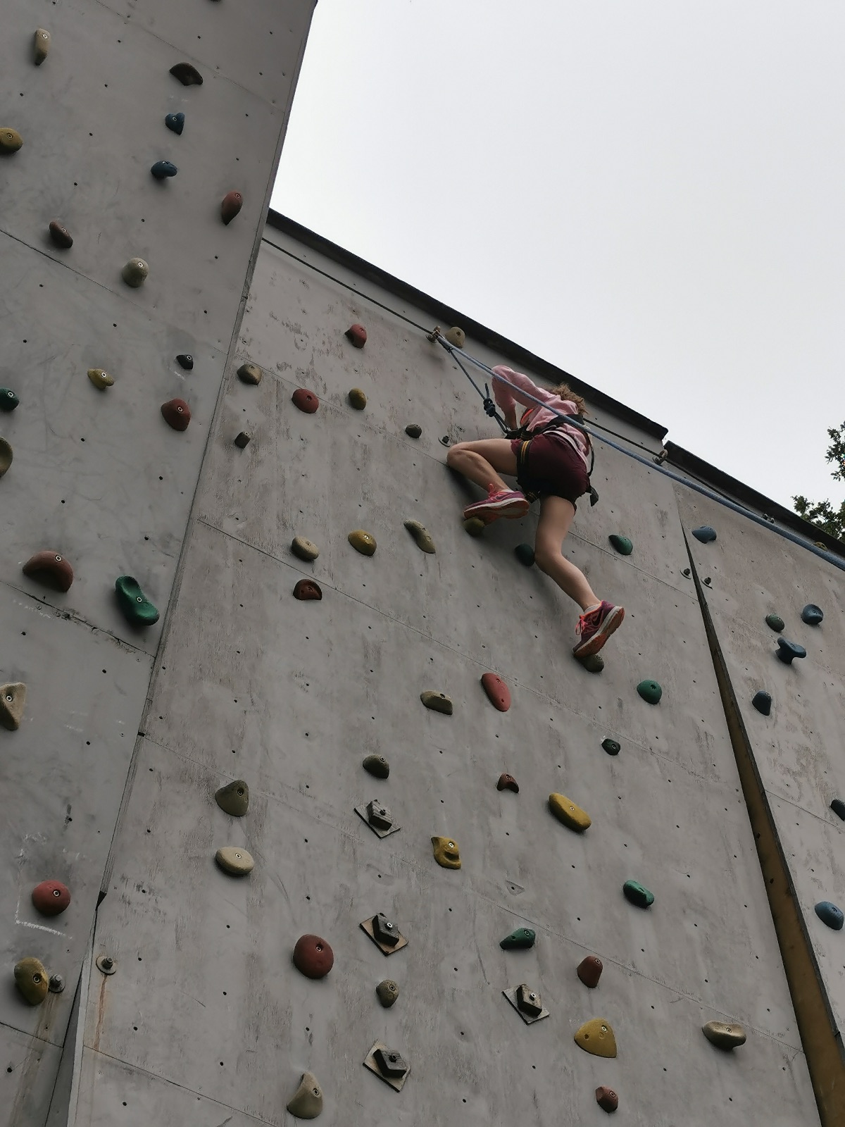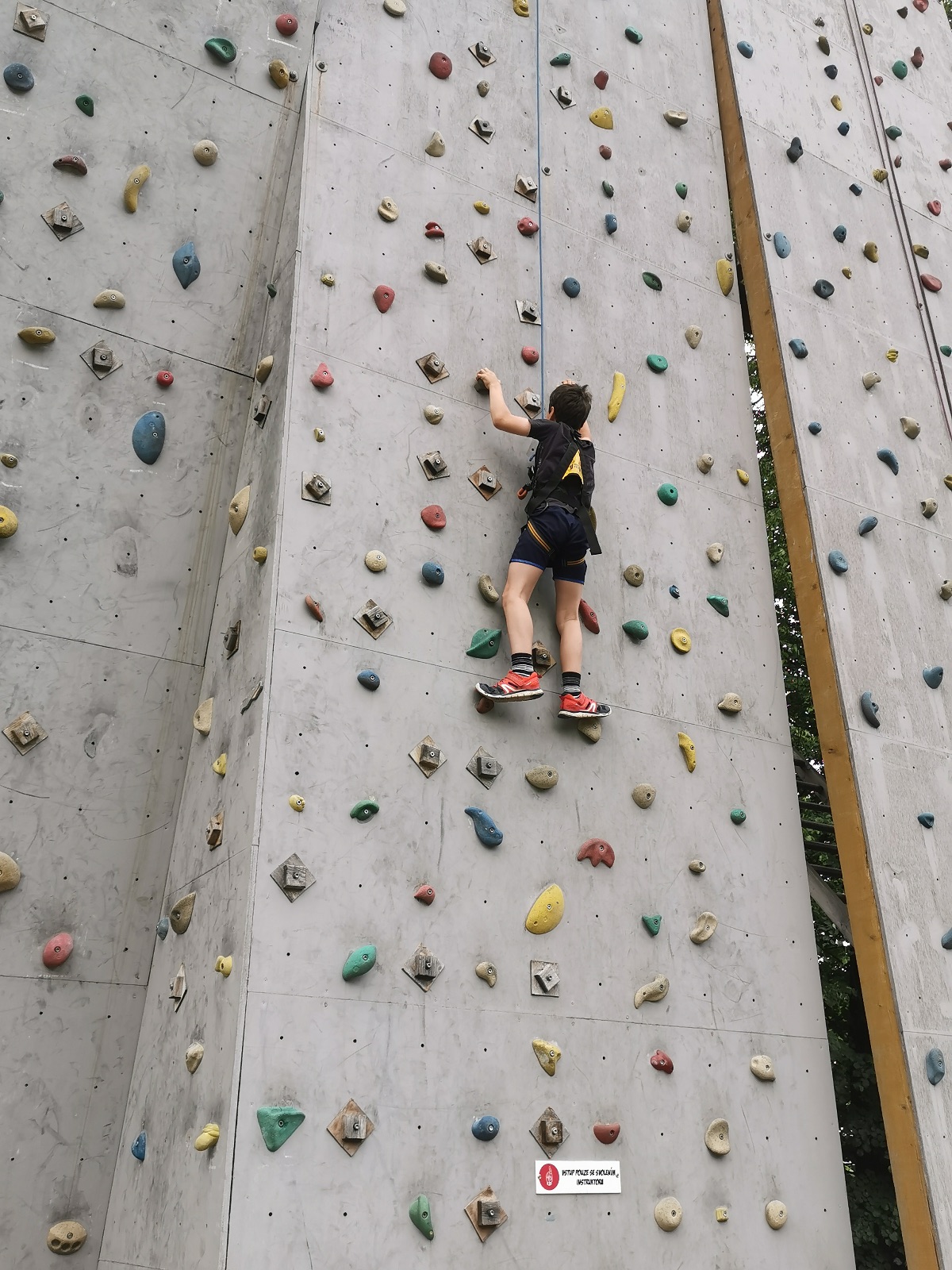 Zůstali jsme rozdělení i dále, kluci se vydali na lezeckou stěnu, holky na nízké lanové překážky. Po hodince se vystřídali. Kdo už byl přelanován, mohl si zahrát bariball, nebo si pocvičit na venkovních mašinách.