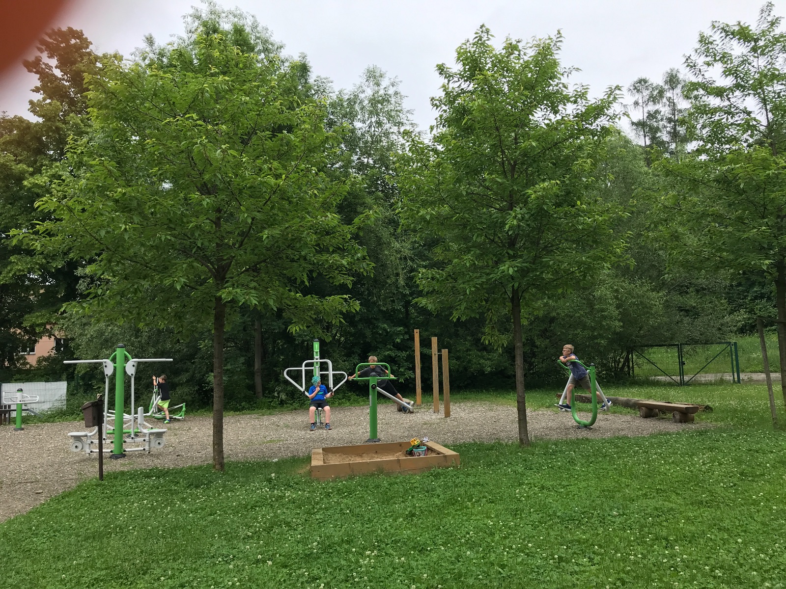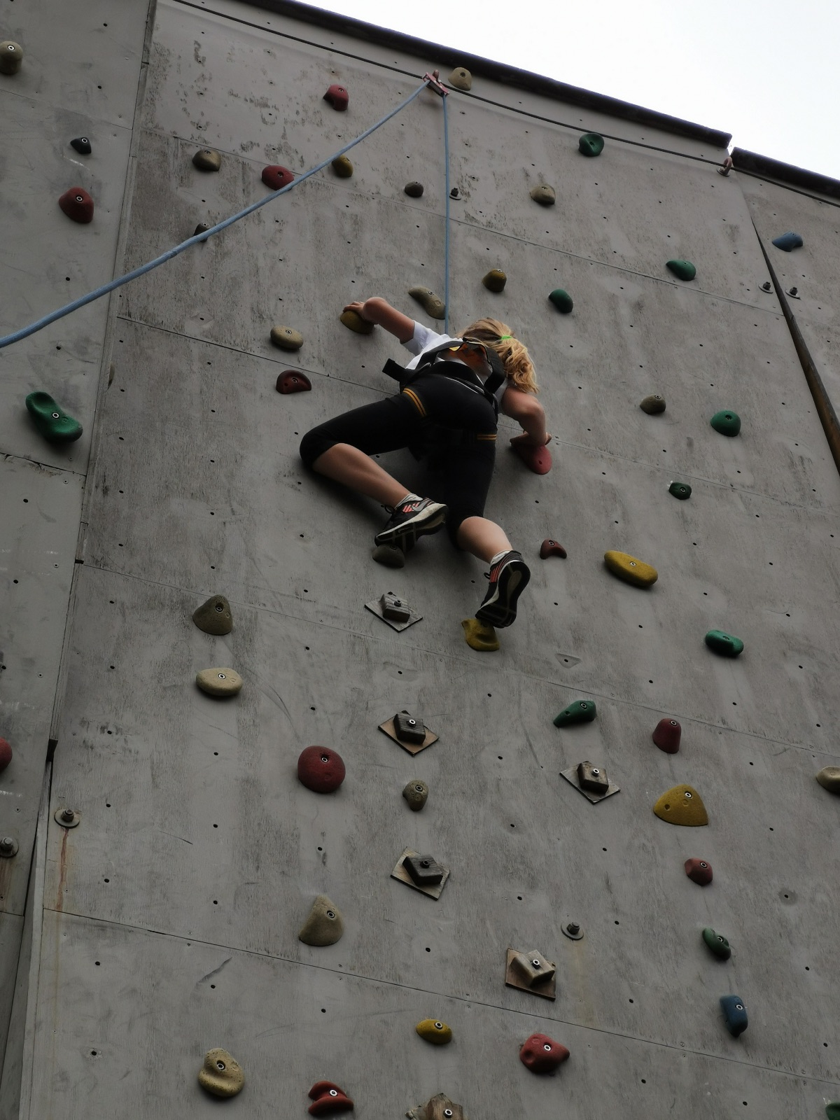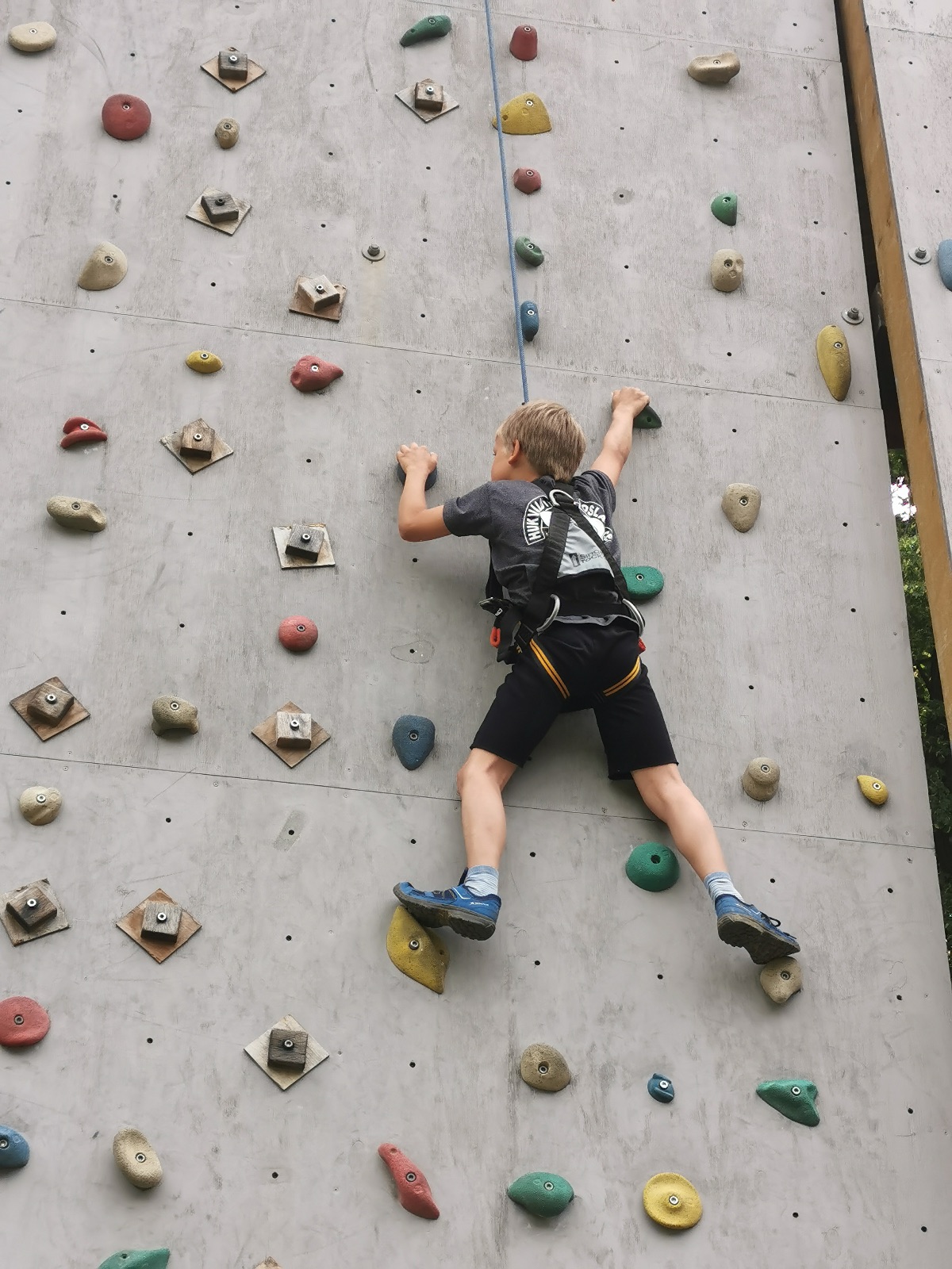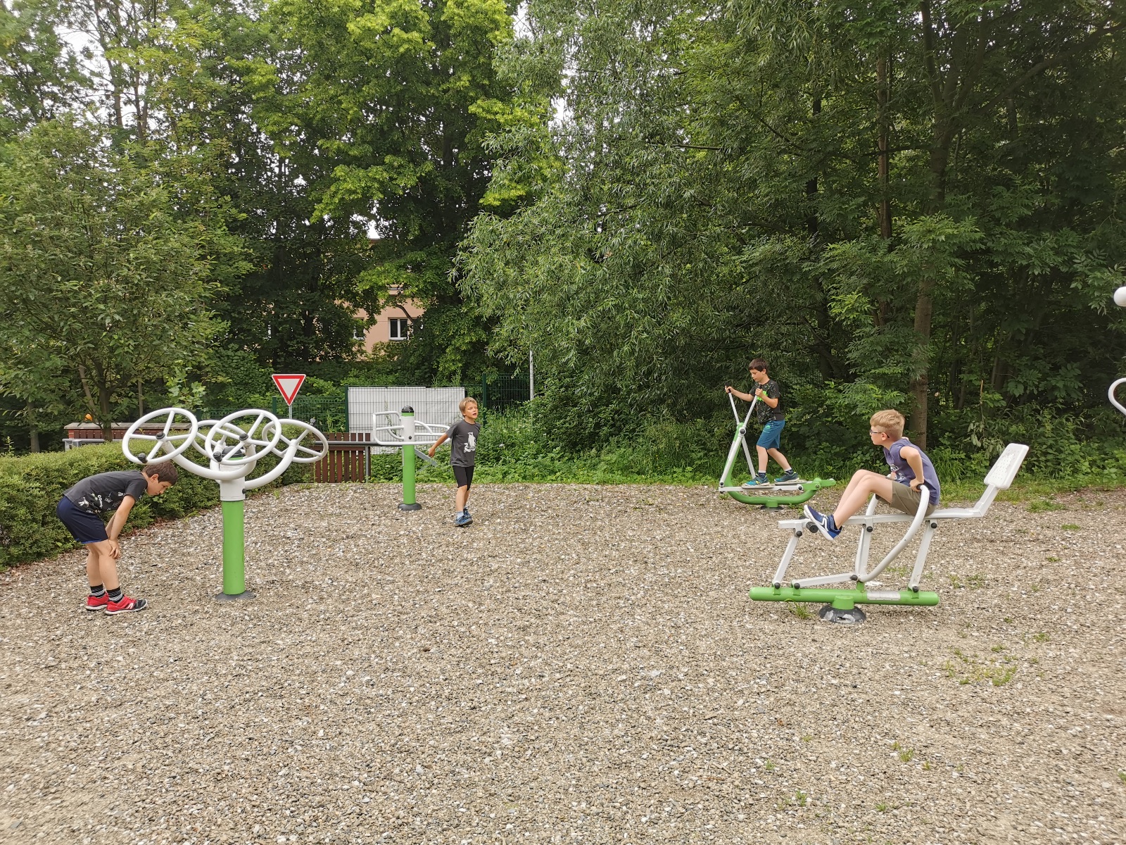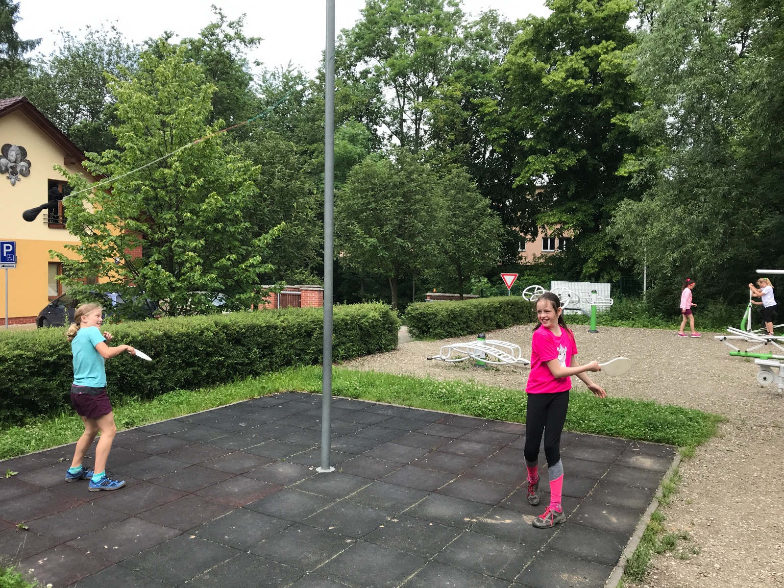 Zůstali jsme rozdělení i dále, kluci se vydali na lezeckou stěnu, holky na nízké lanové překážky. Po hodince se vystřídali. Kdo už byl přelanován, mohl si zahrát bariball, nebo si pocvičit na venkovních mašinách.