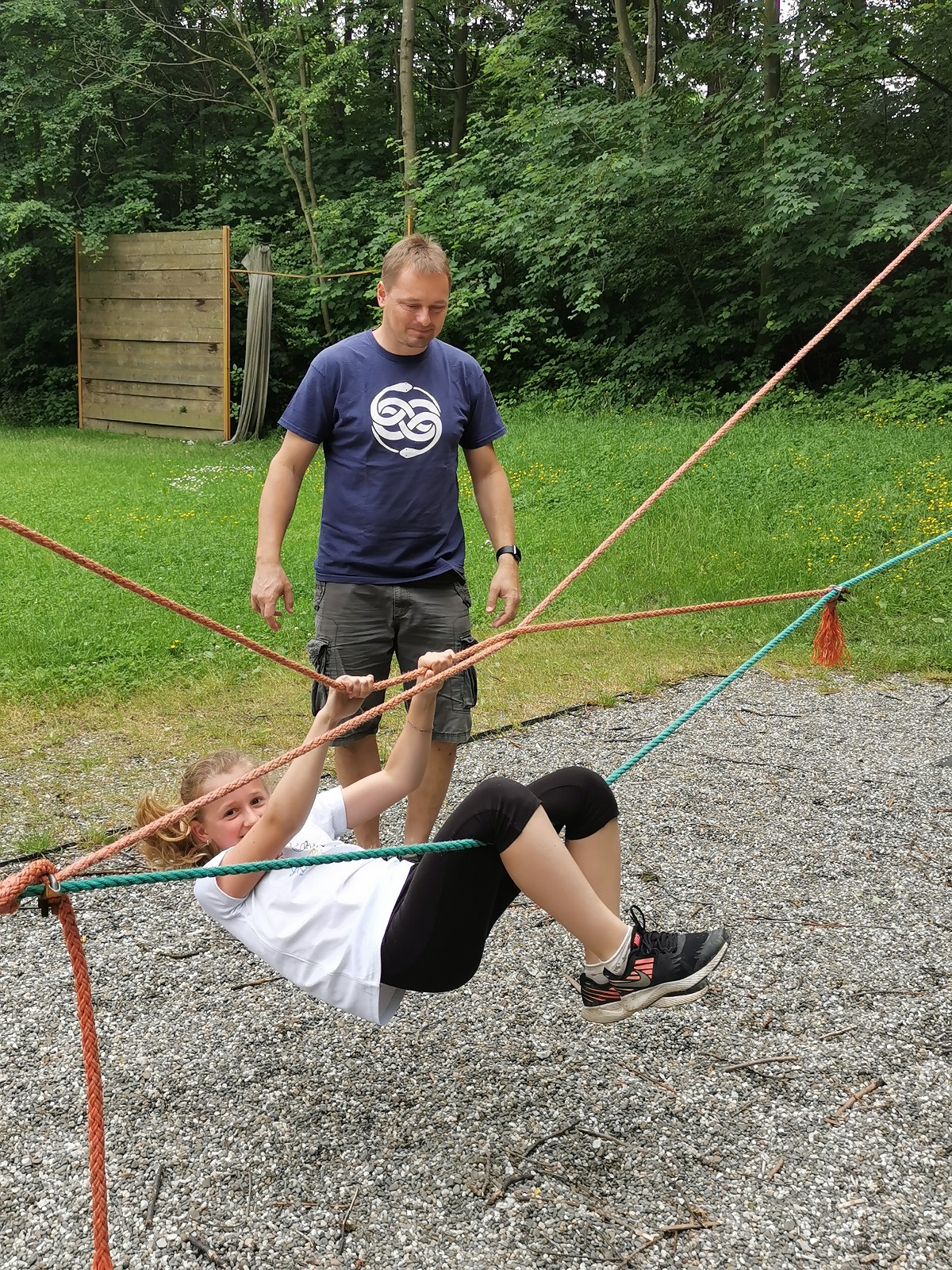 Vytvořili jsme dva samostatné, ale spojené kruhy a soutěžili, která skupinka rychleji provlékne přes všechny svoje členy dvě smyčky. V prvním kole excelovaly holky, ve druhém se kluci nenechali zahanbit a čas stáhli něco nad minutu.