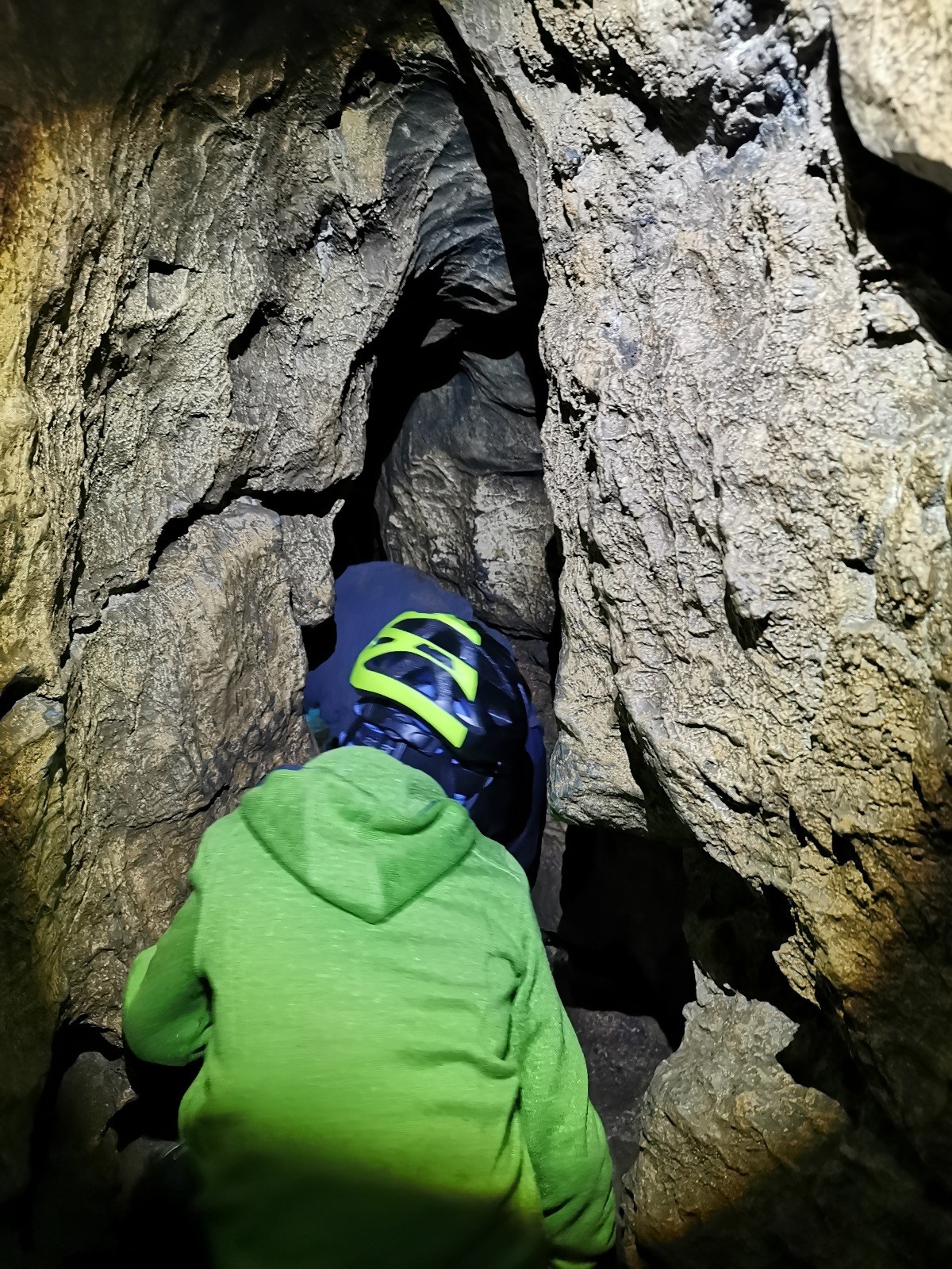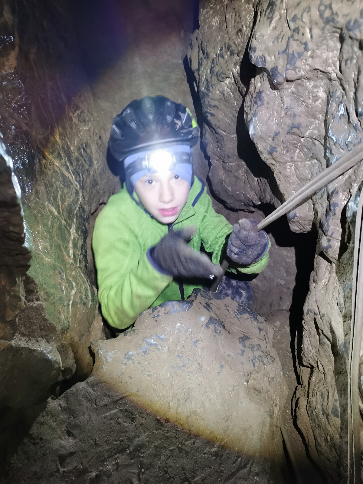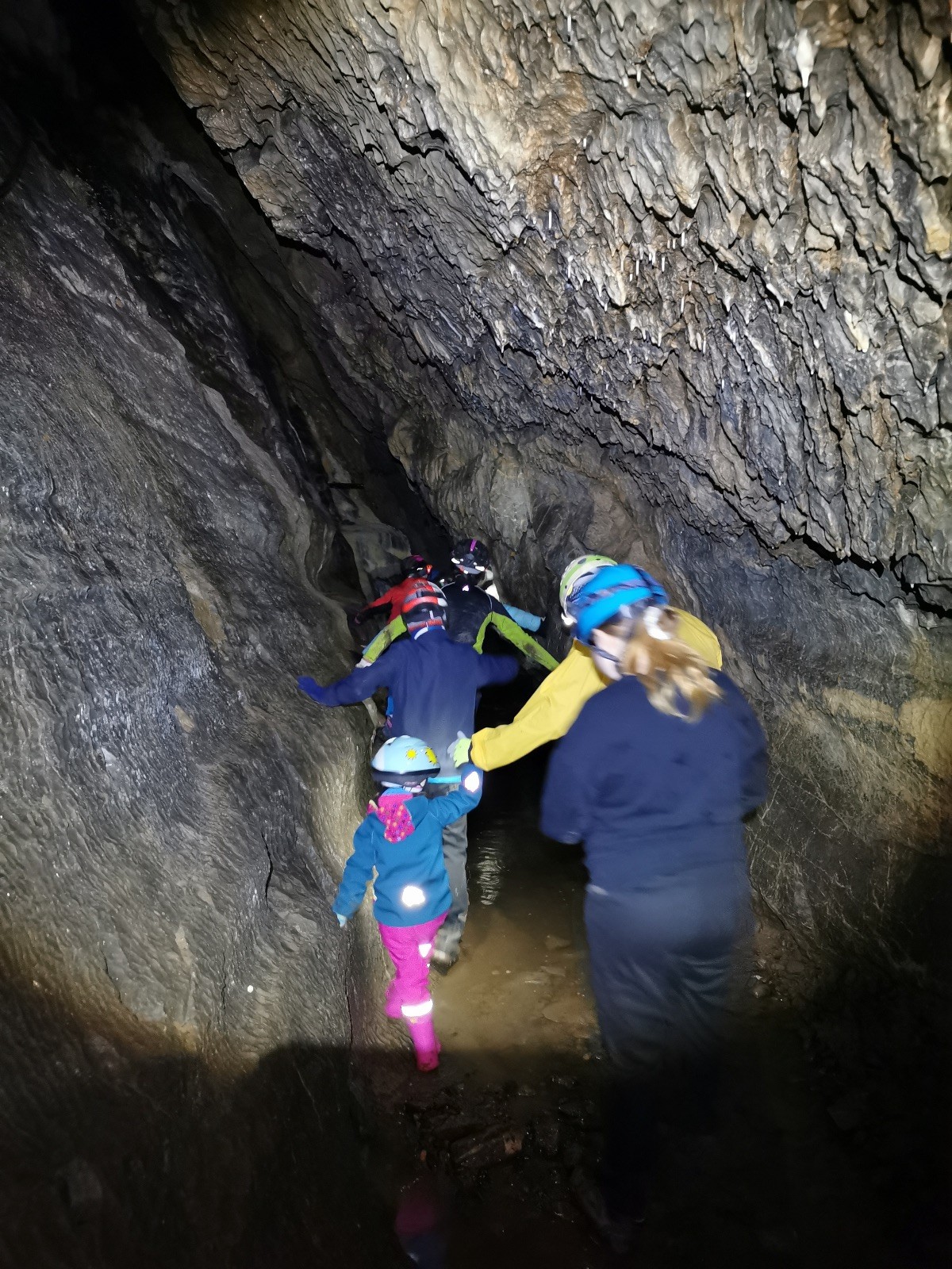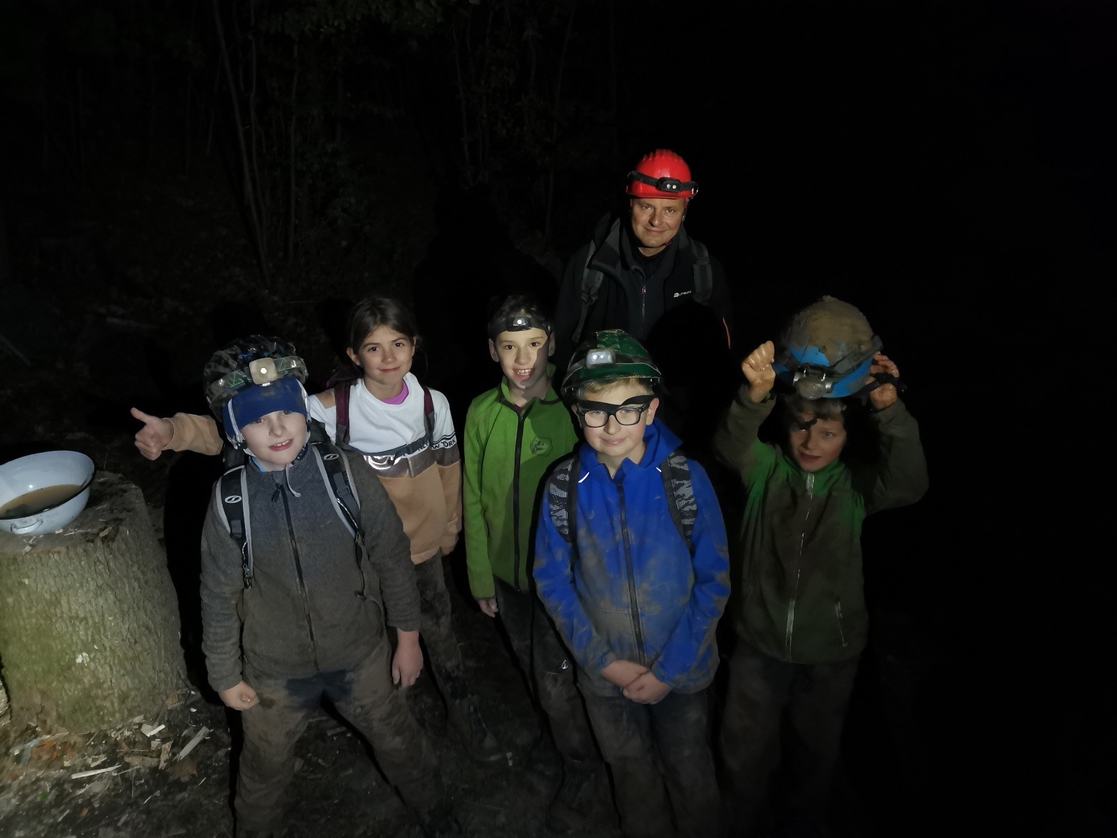 Dvě hodiny utekly jak voda, venku jsme doplnili energii a přesunuli se přes údolíčko do další jeskyně, zvaná Netopýrka – v ní probíhá křest jeskyňářů, kteří musí za co nejrychlejší čas najít správnou cestu dolů do podzemí, kde teče potůček a přinést vodu zpět na povrch. My jsme čas neměřili, rozdělili jsme se na dvě skupiny a vyrazili do hloubi jeskyně. Přidal se k nám i Glum se synkem. Druhá skupinka se zatím posilňovala jídlem, ta se pak vystřídala s první a šla hledat vodu.