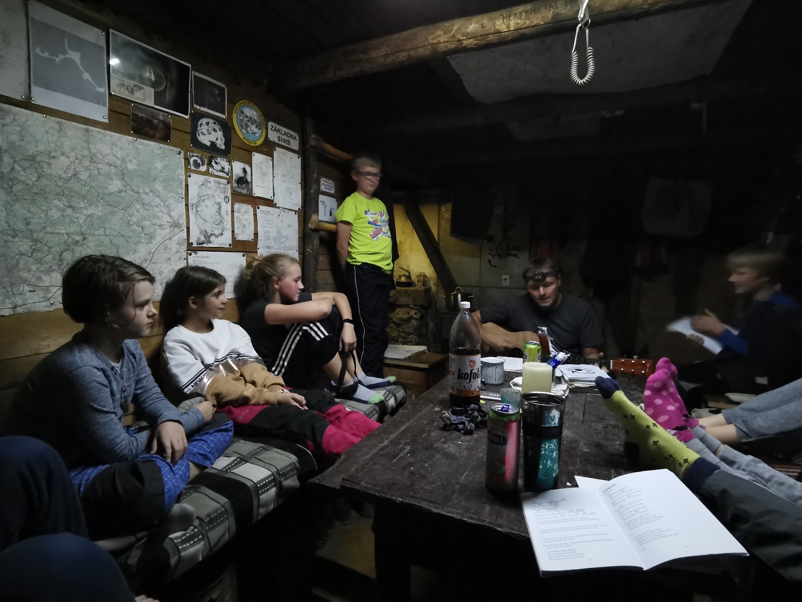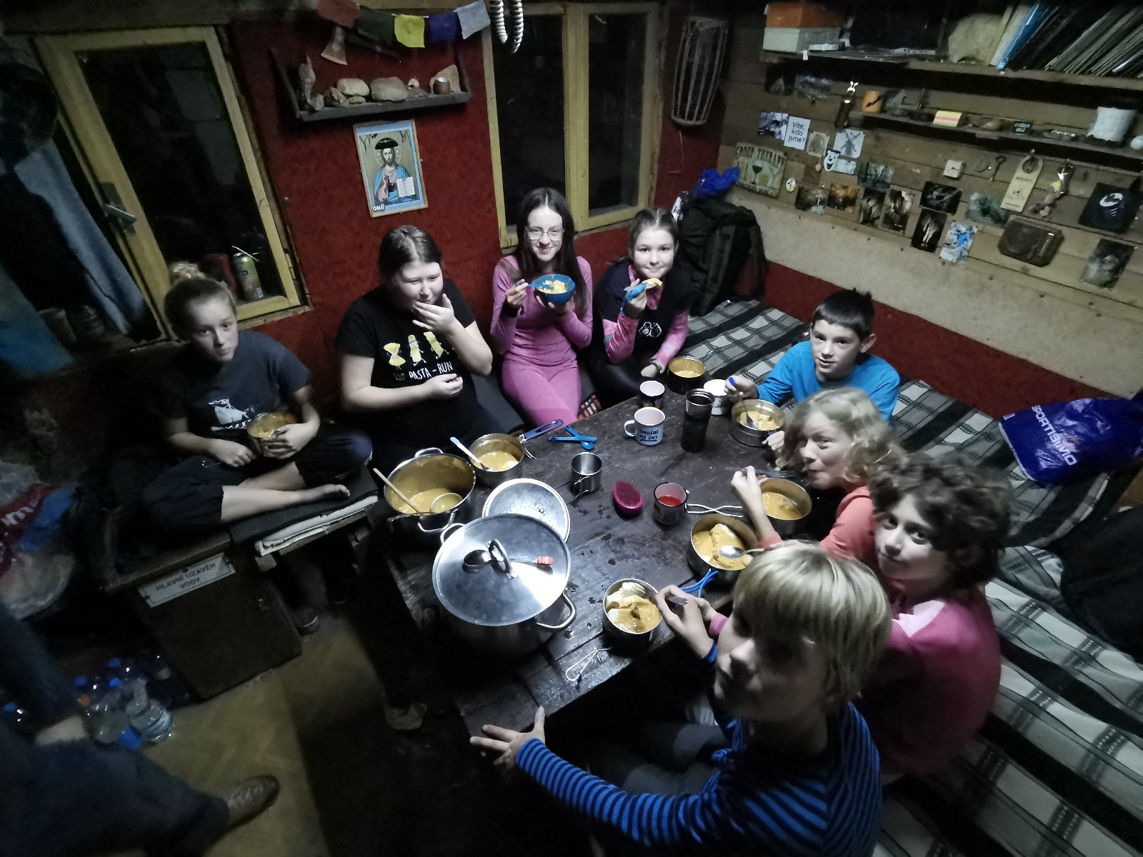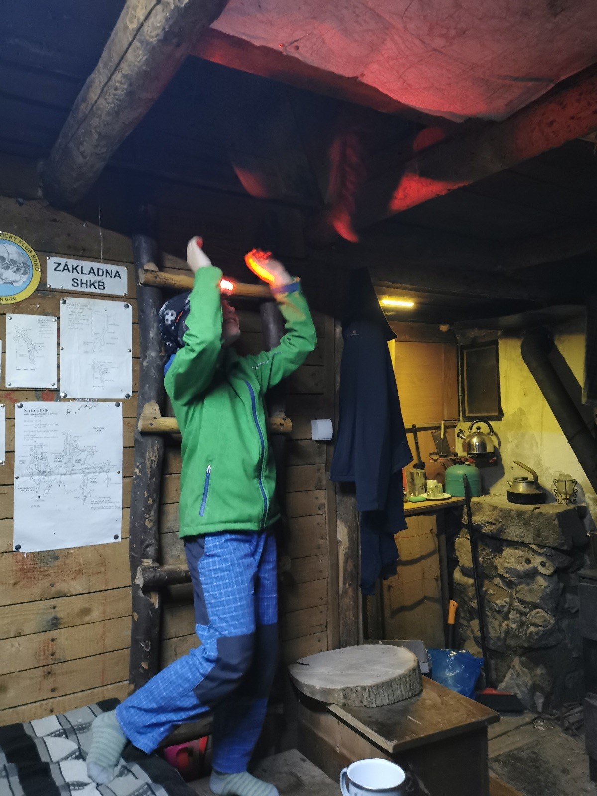 V noci jsme dole u kamen sušili mokré věci a mokré boty, někdy nad ránem nám kamna chcípla, ale to už byla stejně většina oblečení a bot suchá. Klárka si v noci zahrála na pytel brambor a Vojta zase na Sherlocka Holmese 😊