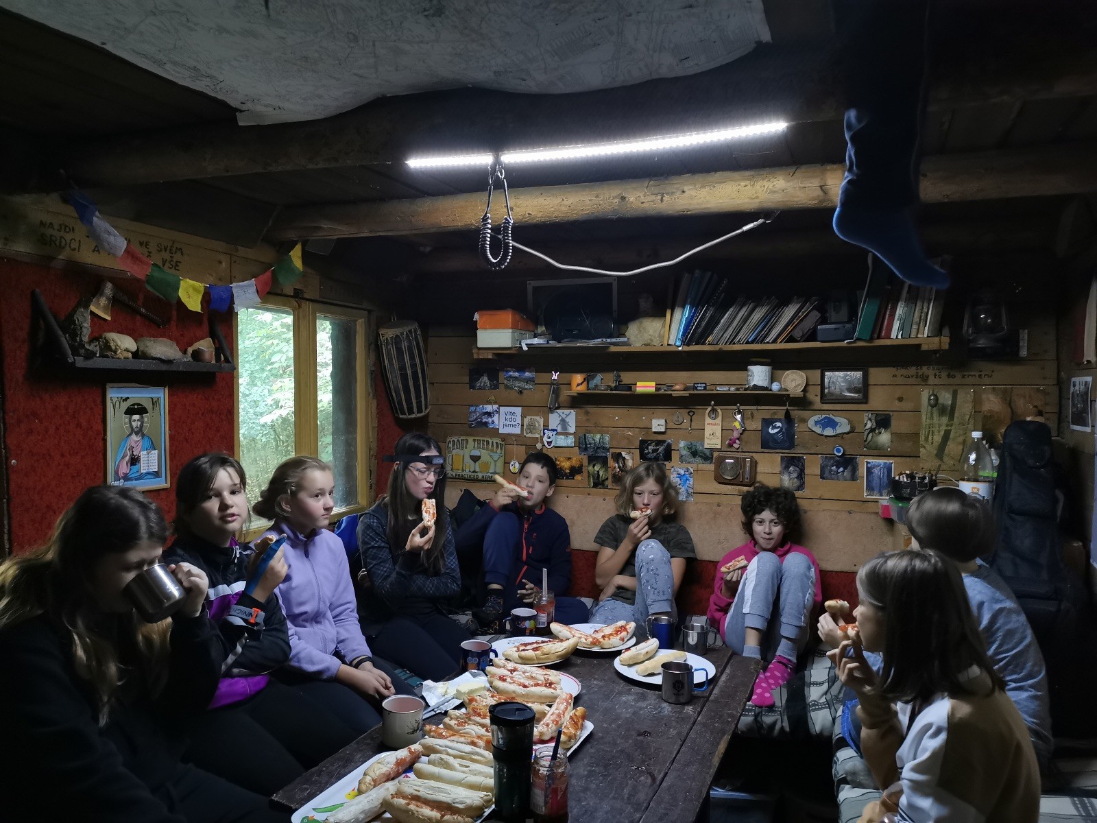 Odemkli jsme, zatopili, ubytovali se, rozdělali venku oheň a opekli špekáčky. Bylo celkem chladno a děcka se začala po jídle sunout do vyhřátého srubu. Následovalo hraní a zpívání nejoblíbenějšího táborového zpěvníku z roku 2019, vyčištění zubů, přesun do spacáků a příběhy o Hágenovi. Loni jsme je na Ditrichu začali číst, ale protože rok je dlouhá doba, započali jsme zase od začátku. Kolem půlnoci ještě byli někteří vzhůru, ale i ti pak usli. V noci jsme topili a ve srubu bylo příjemně 😊 Martin s Lenkou postavili stan venku, a prý byla kosa…