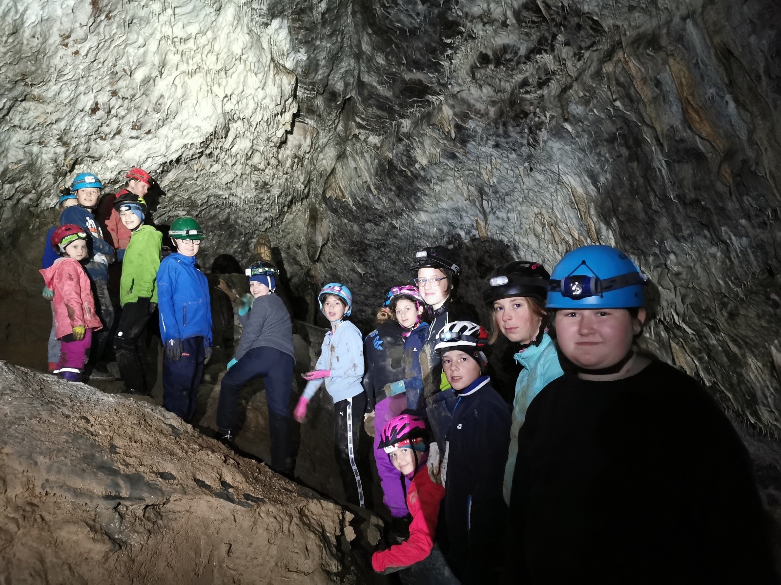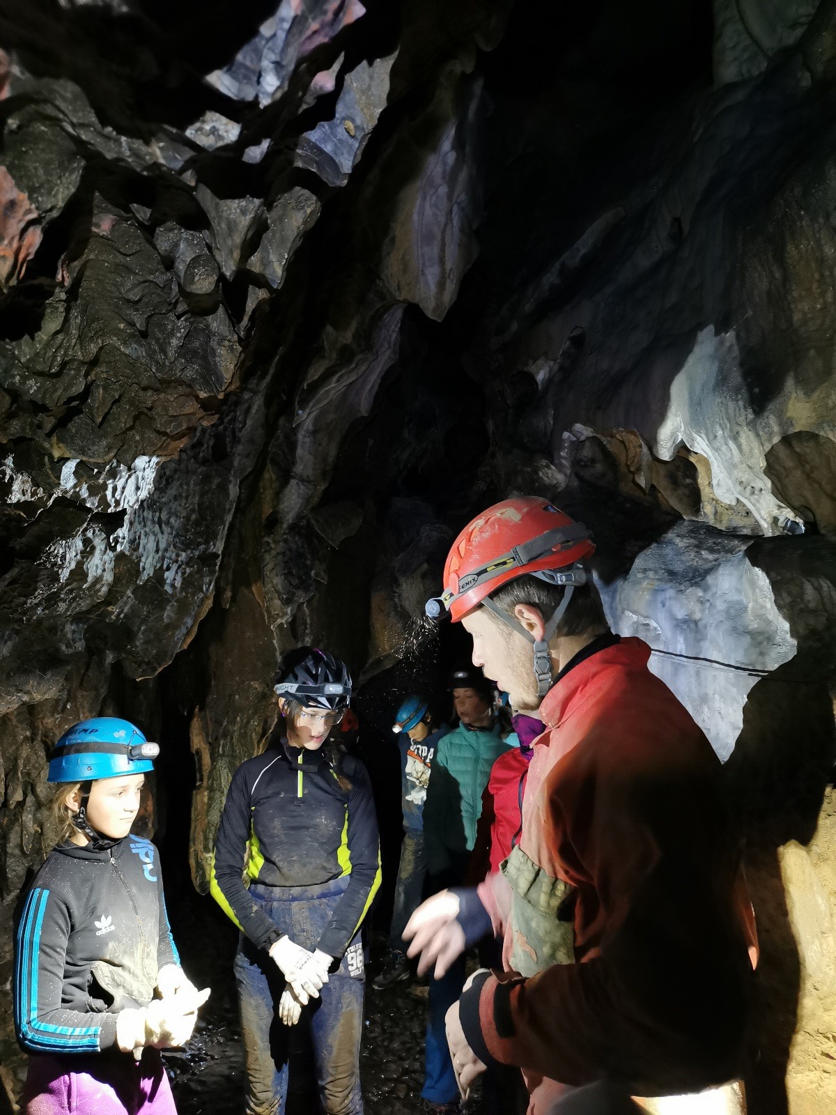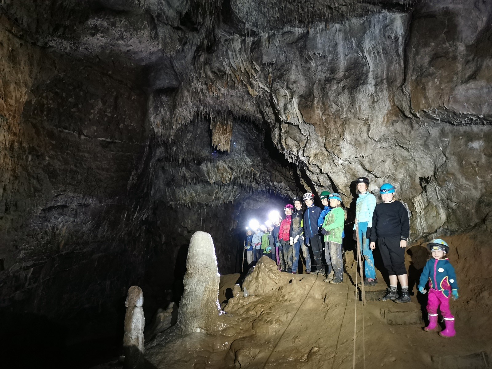Ráno byl budíček v 7 hodin, následovala rozcvička, služba nachystala snídani pro všechny (rohlíky s máslem a marmeládou), sbalili jsme si věci na celý den a vyrazili v jeskyňářském směr Hádek, a dále pak údolím Říčky k první jeskyni, kterou byla 64 metrů dlouhá Pekárna. Na rozehřátí dobrý, následovala další s označením Ř-14. V 11 hodin jsme měli sraz u Ochozské jeskyně, která je dlouhá cca 2 km, s Glumem – skautem a jeskyňářem v jedné osobě. Ten nám umožnil dvouhodinový průzkum korytem Hostěnického potoka. Vody bylo celkem dost, a protože jsme neměli gumáky, většina měla mokro v botách. Veřejnost se sem může podívat 1-2x do roka na dny otevřených dveří, jinak je jeskyně veřejnosti nepřístupná. Celkem tomu rozumím – brčka, krápníky, a vůbec krasová výzdoba, rostoucí desítky, stovky, tisíce let, mohou být během chvilky zničeny neohleduplnými návštěvníky. Každopádně my jsme si největší jeskyni jižní části Moravského krasu užili a nic nezničili 😊
