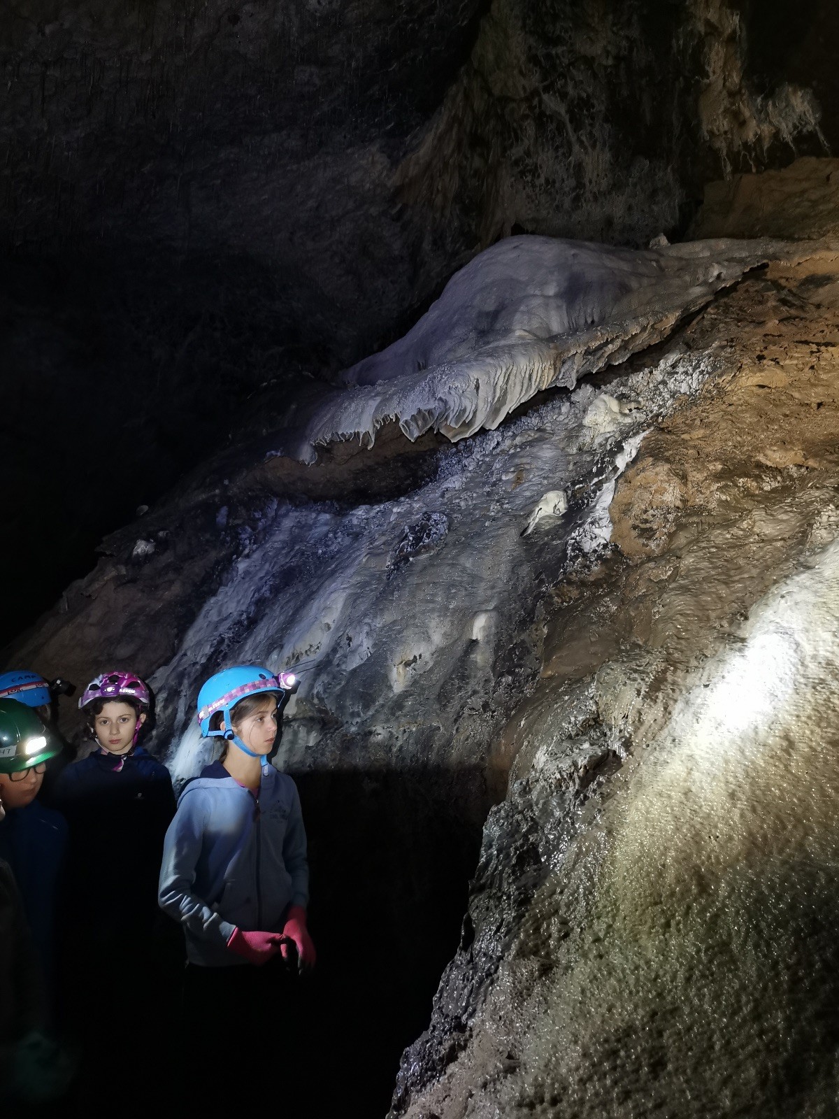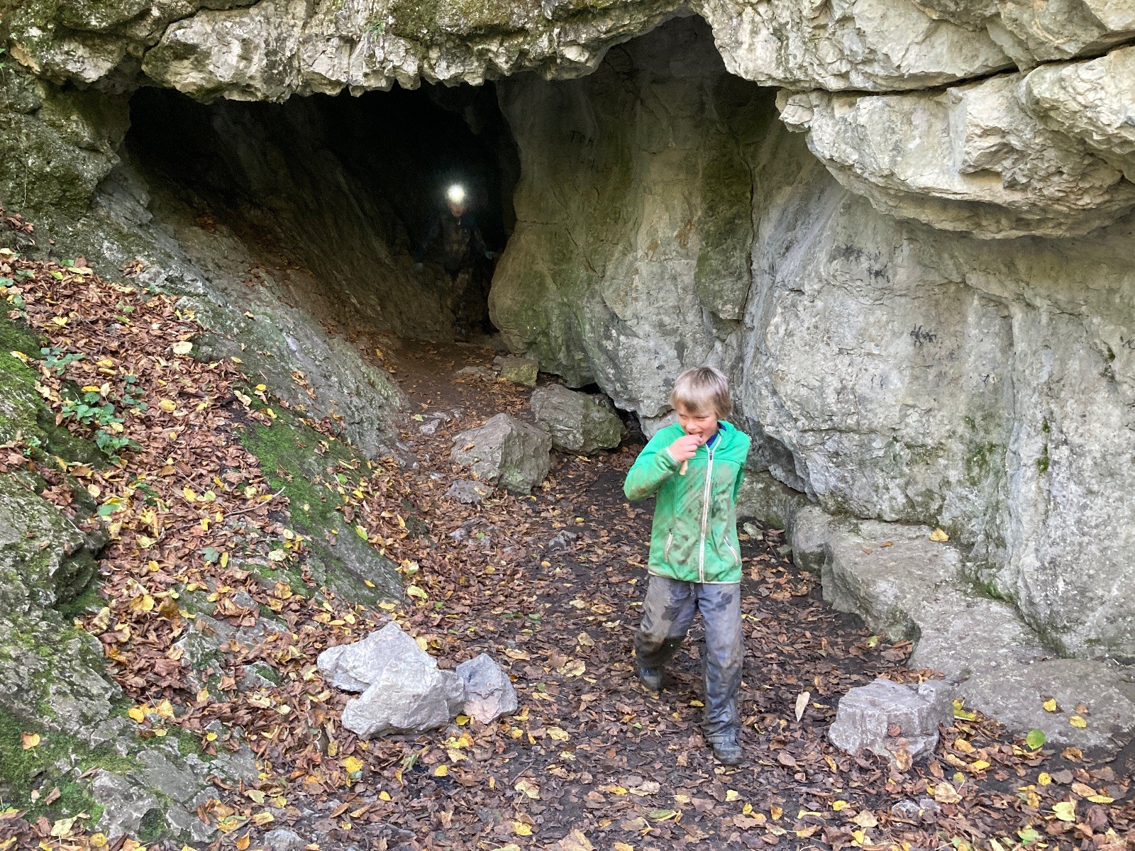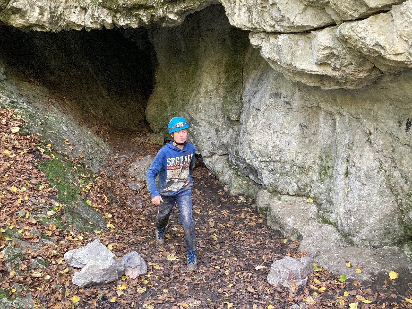 Ráno byl budíček v 7 hodin, následovala rozcvička, služba nachystala snídani pro všechny (rohlíky s máslem a marmeládou), sbalili jsme si věci na celý den a vyrazili v jeskyňářském směr Hádek, a dále pak údolím Říčky k první jeskyni, kterou byla 64 metrů dlouhá Pekárna. Na rozehřátí dobrý, následovala další s označením Ř-14. V 11 hodin jsme měli sraz u Ochozské jeskyně, která je dlouhá cca 2 km, s Glumem – skautem a jeskyňářem v jedné osobě. Ten nám umožnil dvouhodinový průzkum korytem Hostěnického potoka. Vody bylo celkem dost, a protože jsme neměli gumáky, většina měla mokro v botách. Veřejnost se sem může podívat 1-2x do roka na dny otevřených dveří, jinak je jeskyně veřejnosti nepřístupná. Celkem tomu rozumím – brčka, krápníky, a vůbec krasová výzdoba, rostoucí desítky, stovky, tisíce let, mohou být během chvilky zničeny neohleduplnými návštěvníky. Každopádně my jsme si největší jeskyni jižní části Moravského krasu užili a nic nezničili 😊