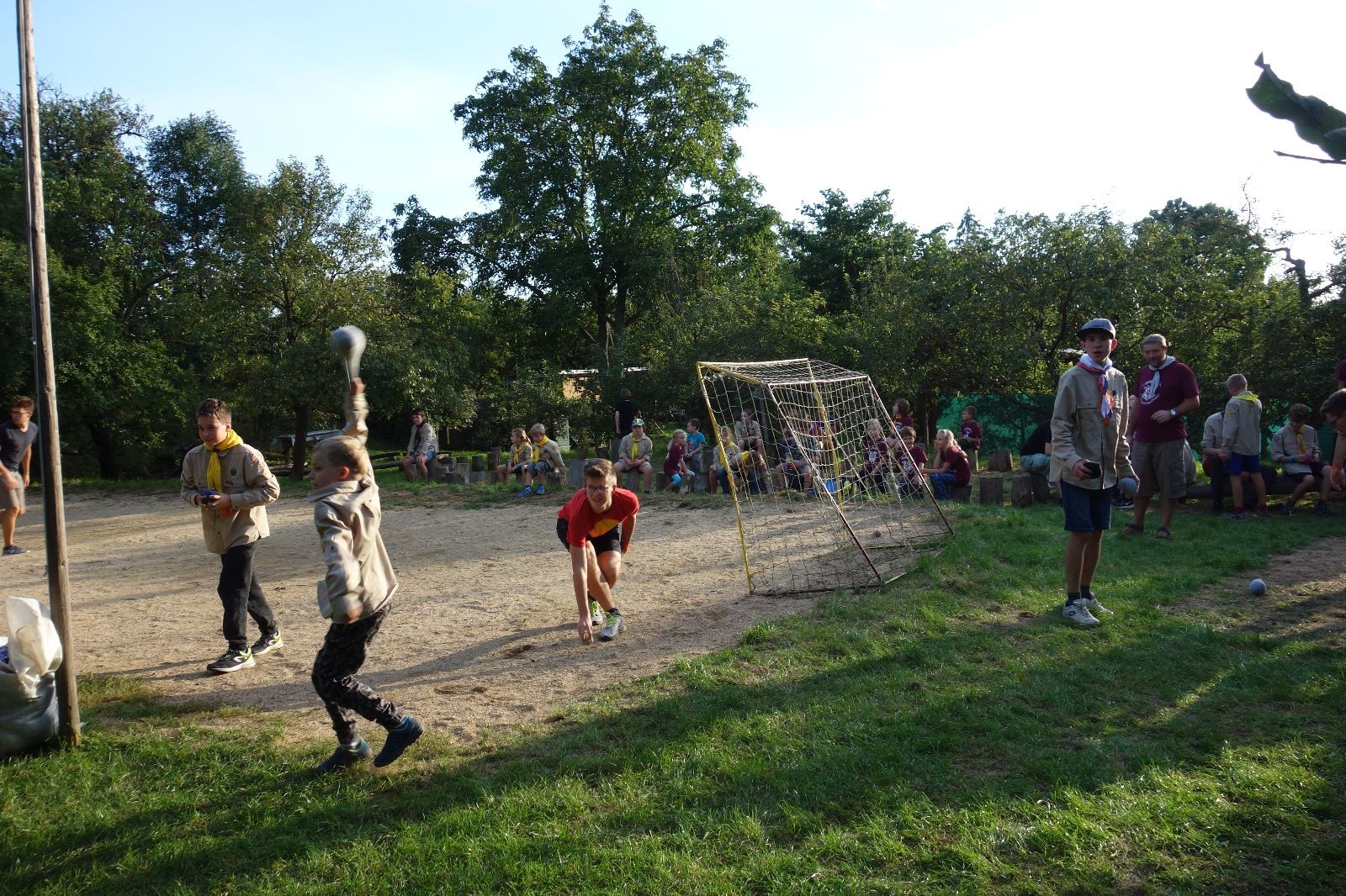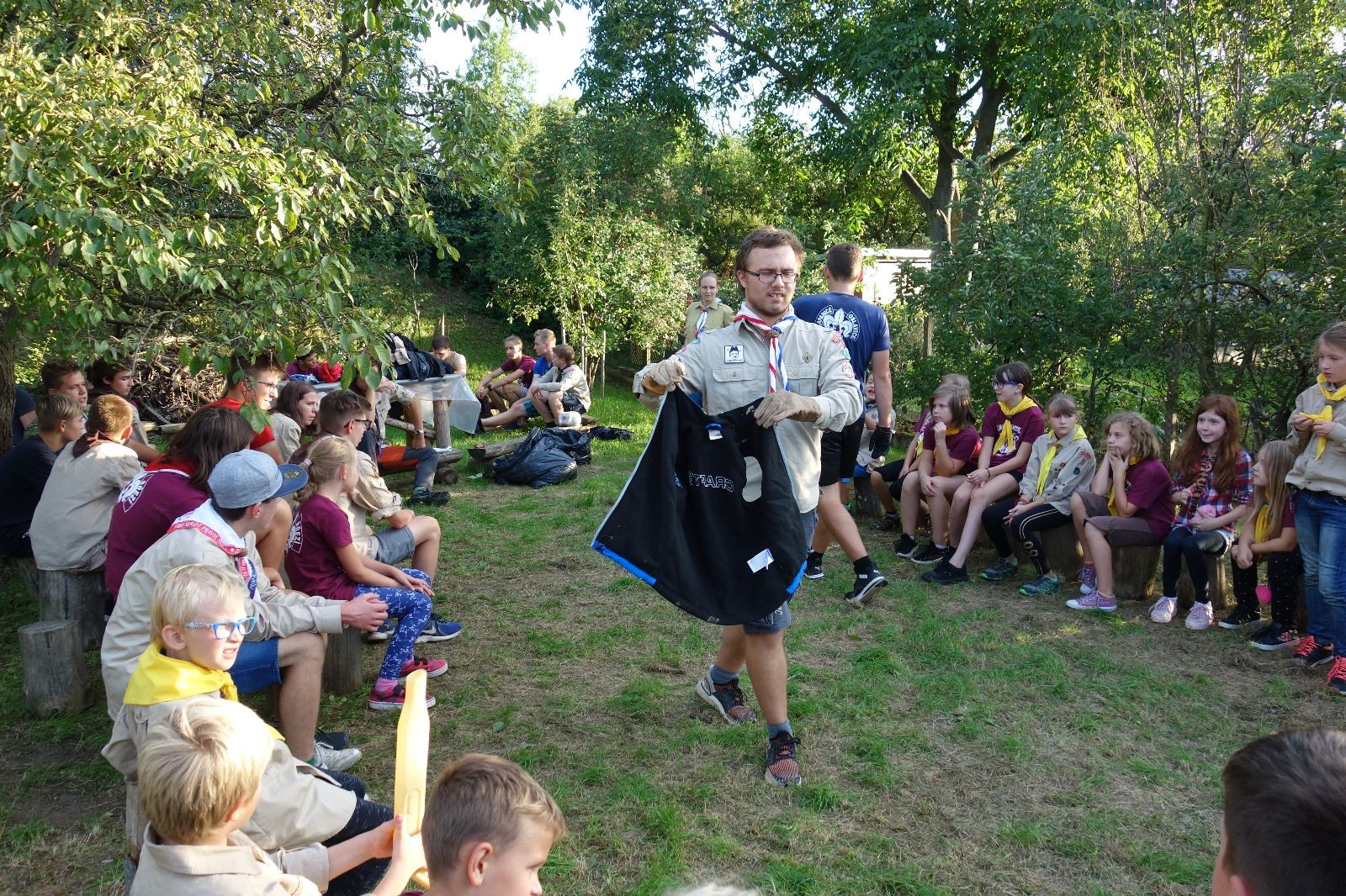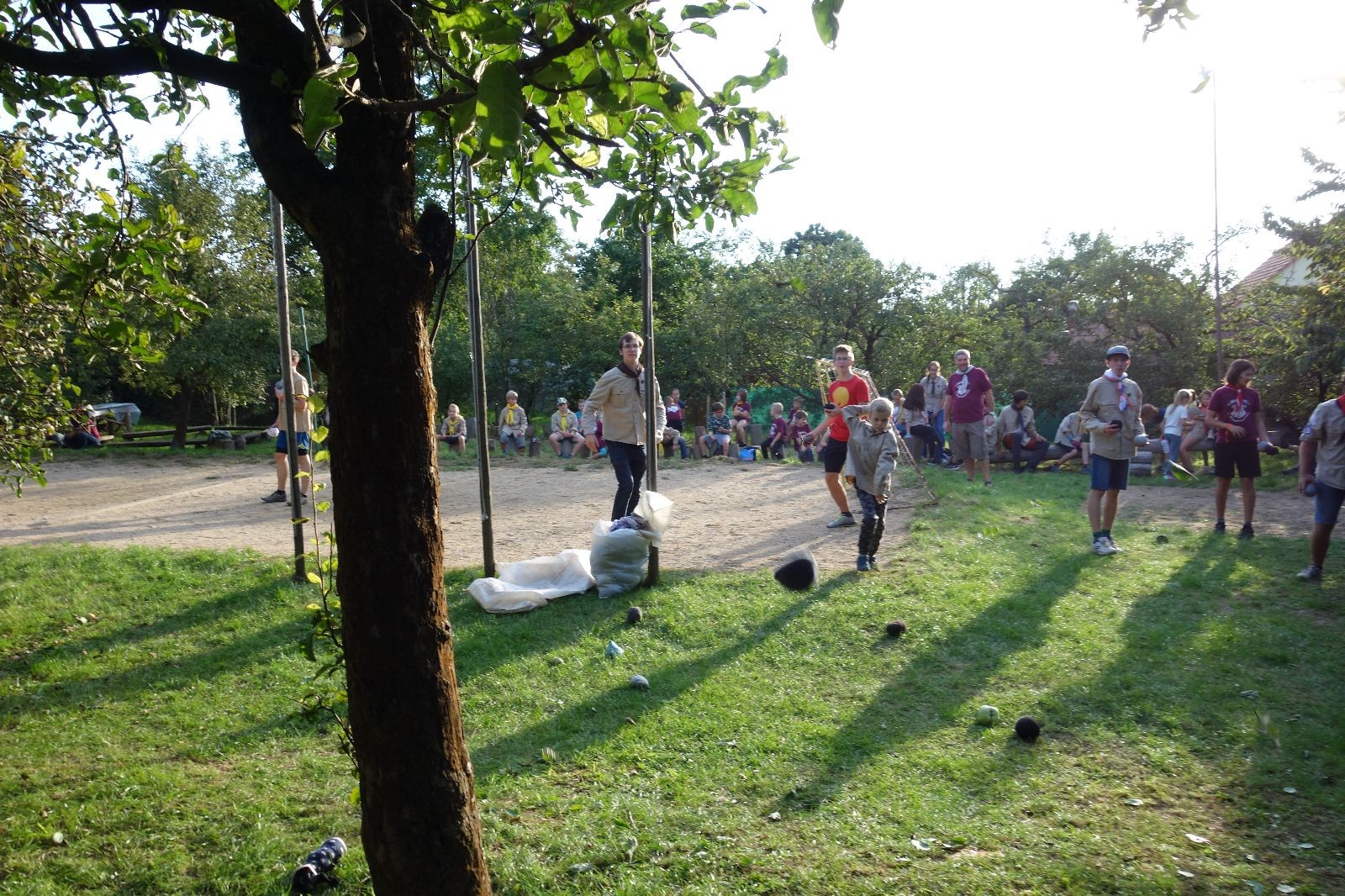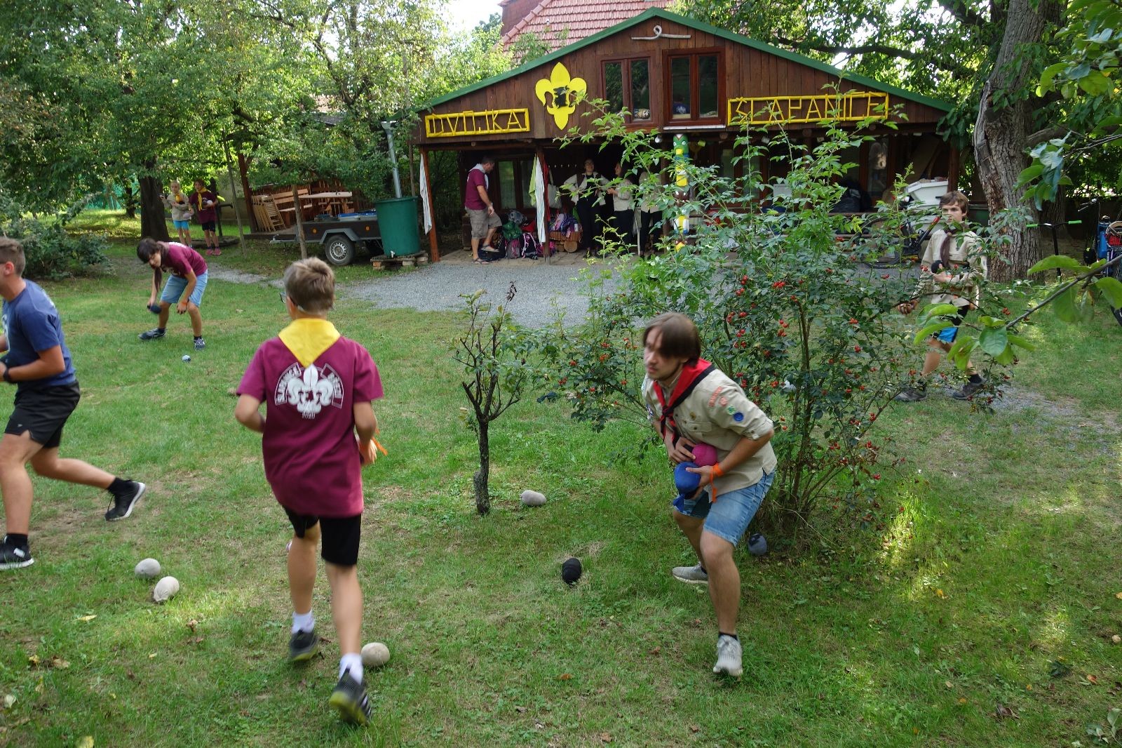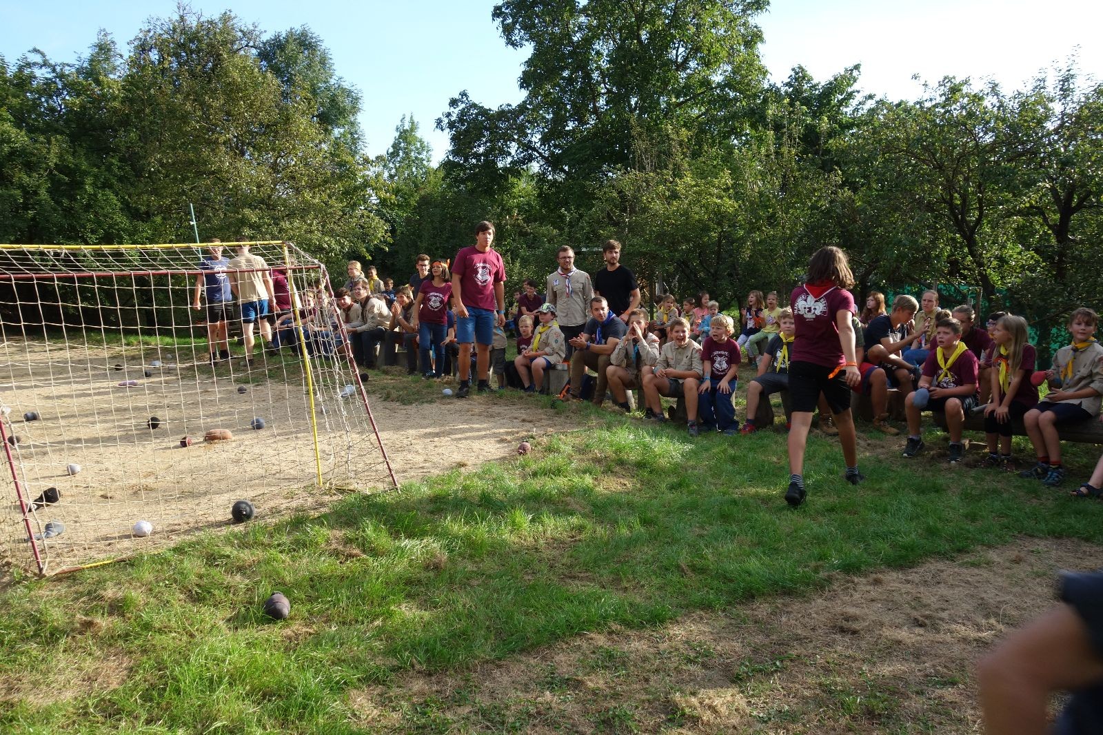 A potom – zlatý hřeb každé oddílové schůzky, ať už zahajovací nebo jiné – bojovka s hadrovými koulemi. Tentokrát proti sobě hráli modří a oranžoví. Kromě toho, že silné rány poshazovaly skoro všechny hrušky ze stromů, se bojovníci strefovali i do svých protivníků. První kolo vyhráli oranžoví, v druhém modří dorovnali na 1:1. V rozhodujícím třetím kole o něco líp mířili a uhýbali hadrovým střelám zase modří. Třikrát hurá pro modré vítěze a hlavně dvě sladké čočky. Tohle ale ještě nebyl konec schůzky. Protože jako každý rok se nám po táboře na Boudě nakupila spousta věcí, které postrádaly svého majitele, proběhla tradiční potáborová dražba, jejíž tváří byli Kanec s Bráchou. Část věcí se vrátila svým majitelům, zbytek ještě smutně leží na Boudě (kdo něco ještě postrádá, přijďte se podívat). S poslední zapomenutou ponožkou odbila taky poslední minuta zahajovací schůzky. Už jen svěsit vlajku, rozloučit se a všichni jsme se odebrali domů.