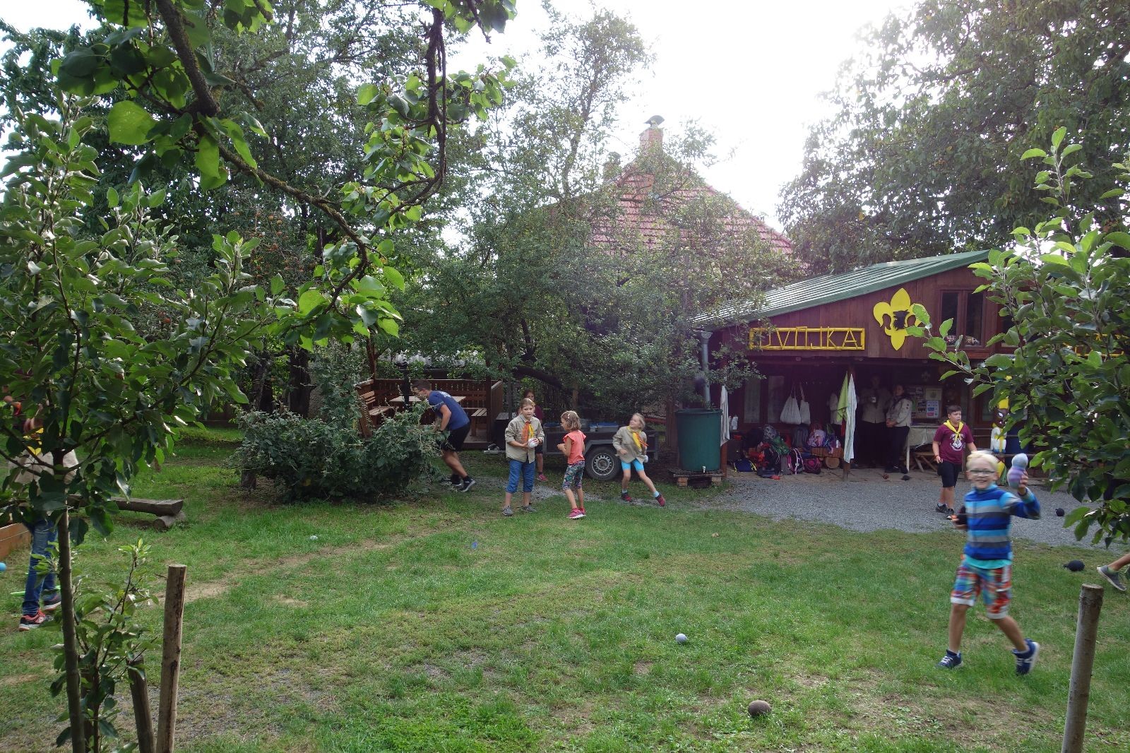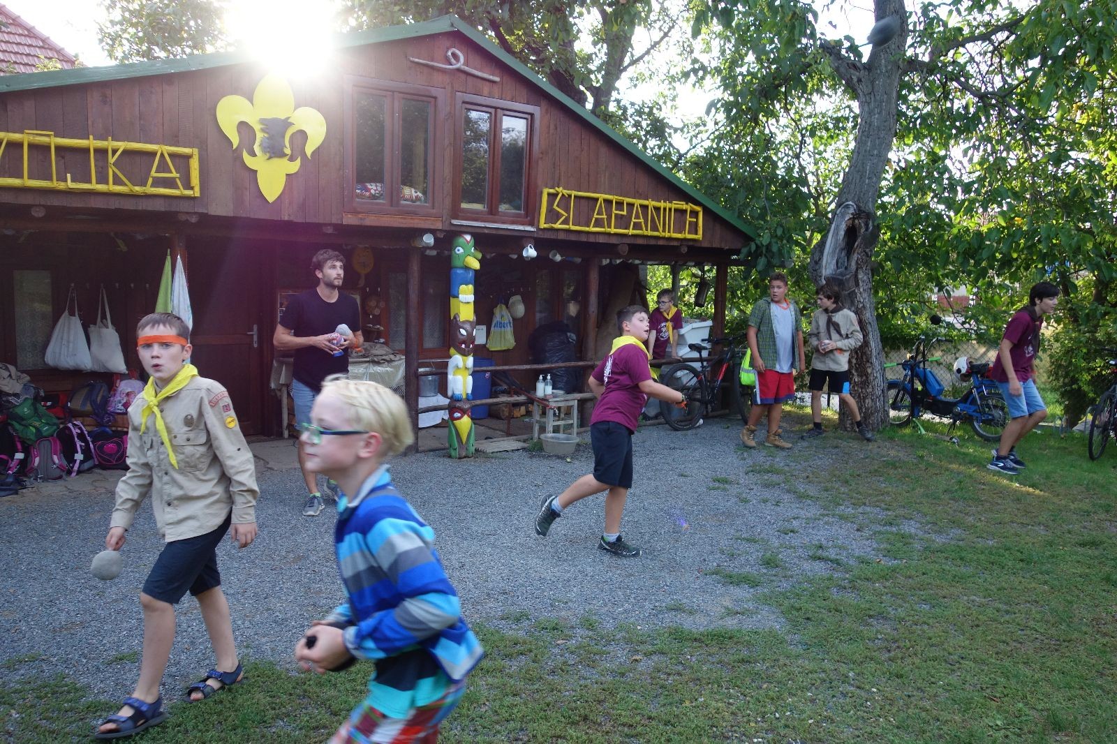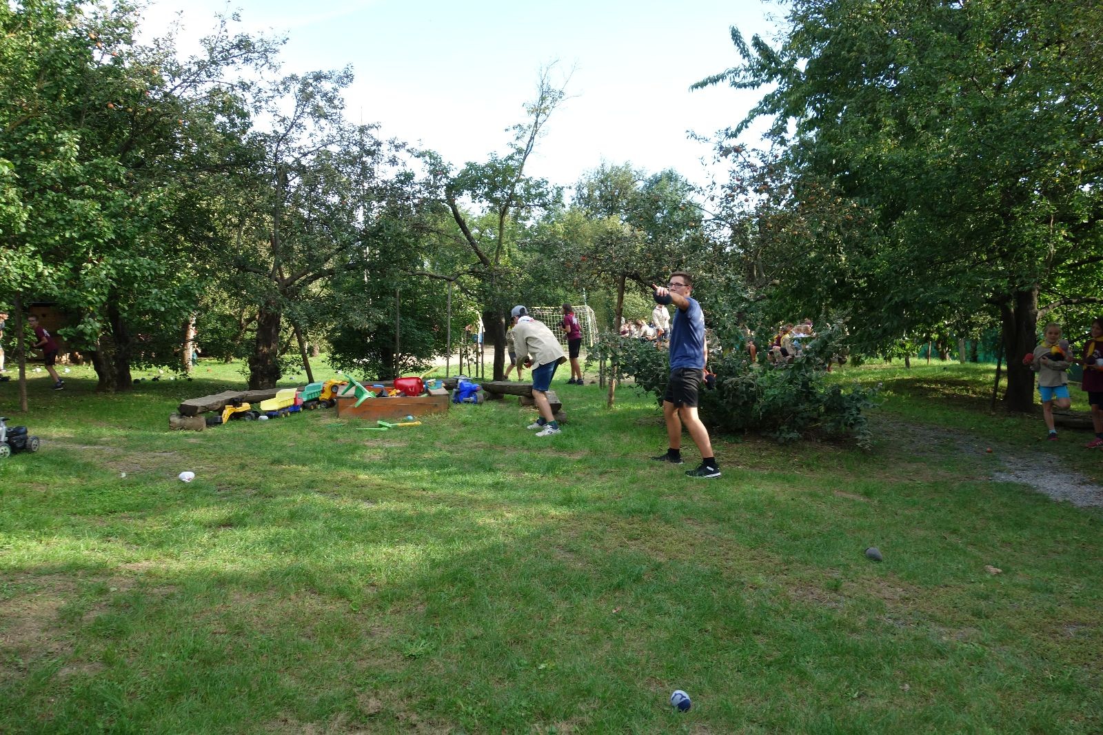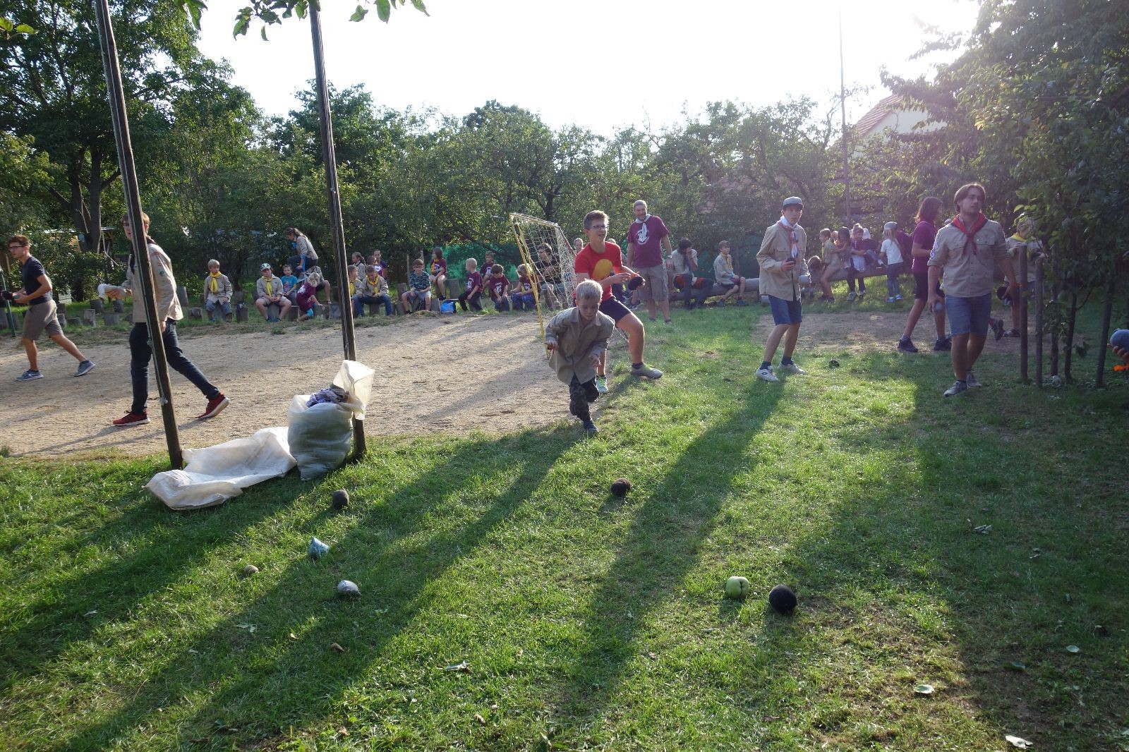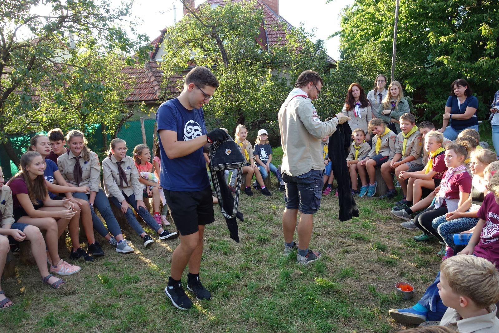 A potom – zlatý hřeb každé oddílové schůzky, ať už zahajovací nebo jiné – bojovka s hadrovými koulemi. Tentokrát proti sobě hráli modří a oranžoví. Kromě toho, že silné rány poshazovaly skoro všechny hrušky ze stromů, se bojovníci strefovali i do svých protivníků. První kolo vyhráli oranžoví, v druhém modří dorovnali na 1:1. V rozhodujícím třetím kole o něco líp mířili a uhýbali hadrovým střelám zase modří. Třikrát hurá pro modré vítěze a hlavně dvě sladké čočky. Tohle ale ještě nebyl konec schůzky. Protože jako každý rok se nám po táboře na Boudě nakupila spousta věcí, které postrádaly svého majitele, proběhla tradiční potáborová dražba, jejíž tváří byli Kanec s Bráchou. Část věcí se vrátila svým majitelům, zbytek ještě smutně leží na Boudě (kdo něco ještě postrádá, přijďte se podívat). S poslední zapomenutou ponožkou odbila taky poslední minuta zahajovací schůzky. Už jen svěsit vlajku, rozloučit se a všichni jsme se odebrali domů.