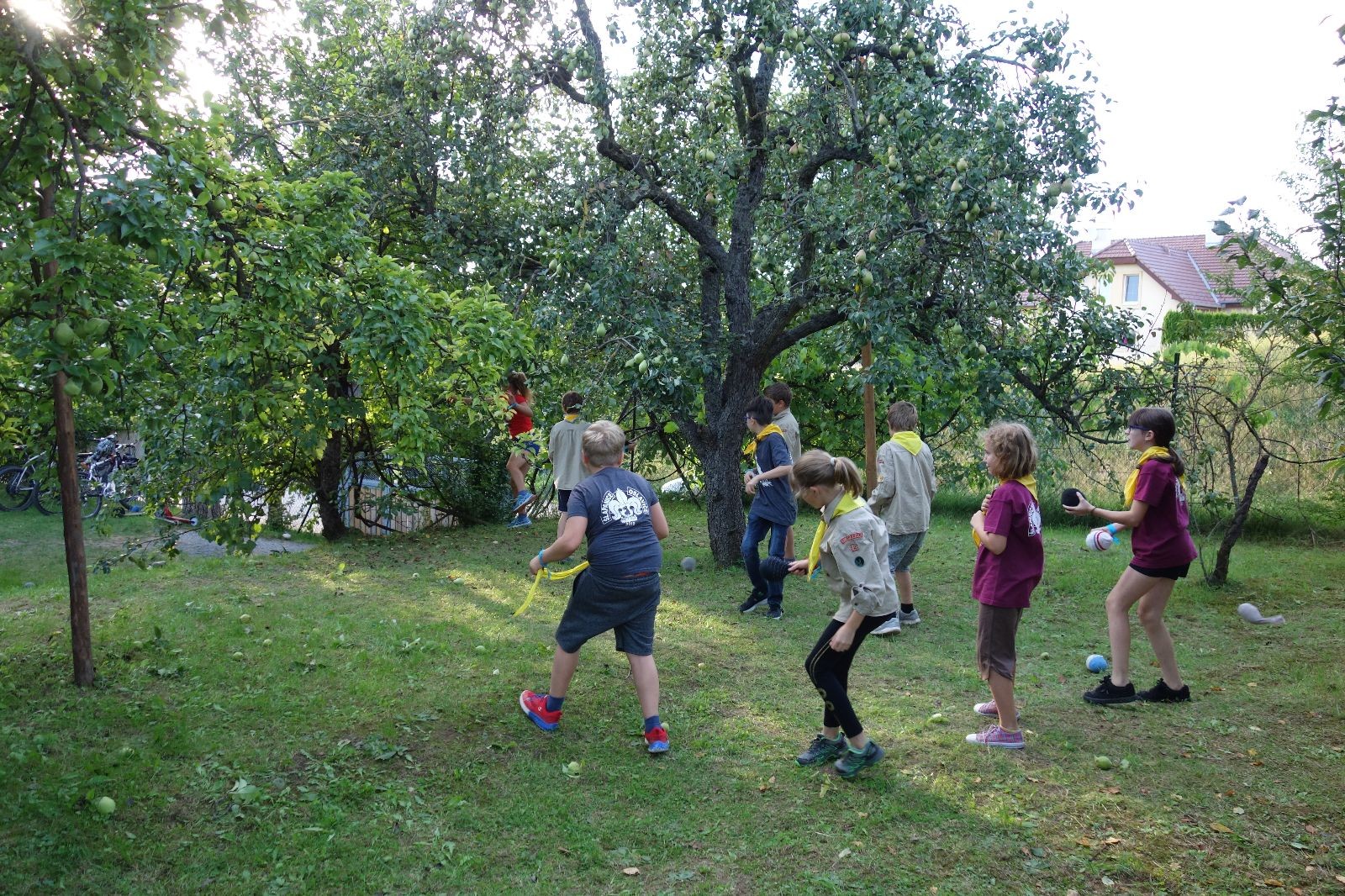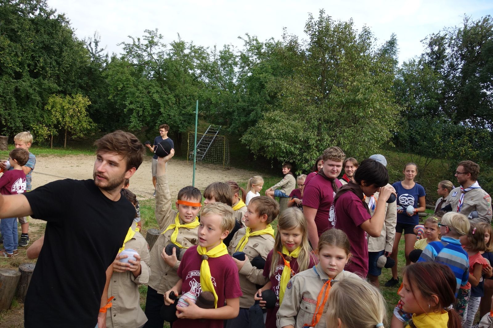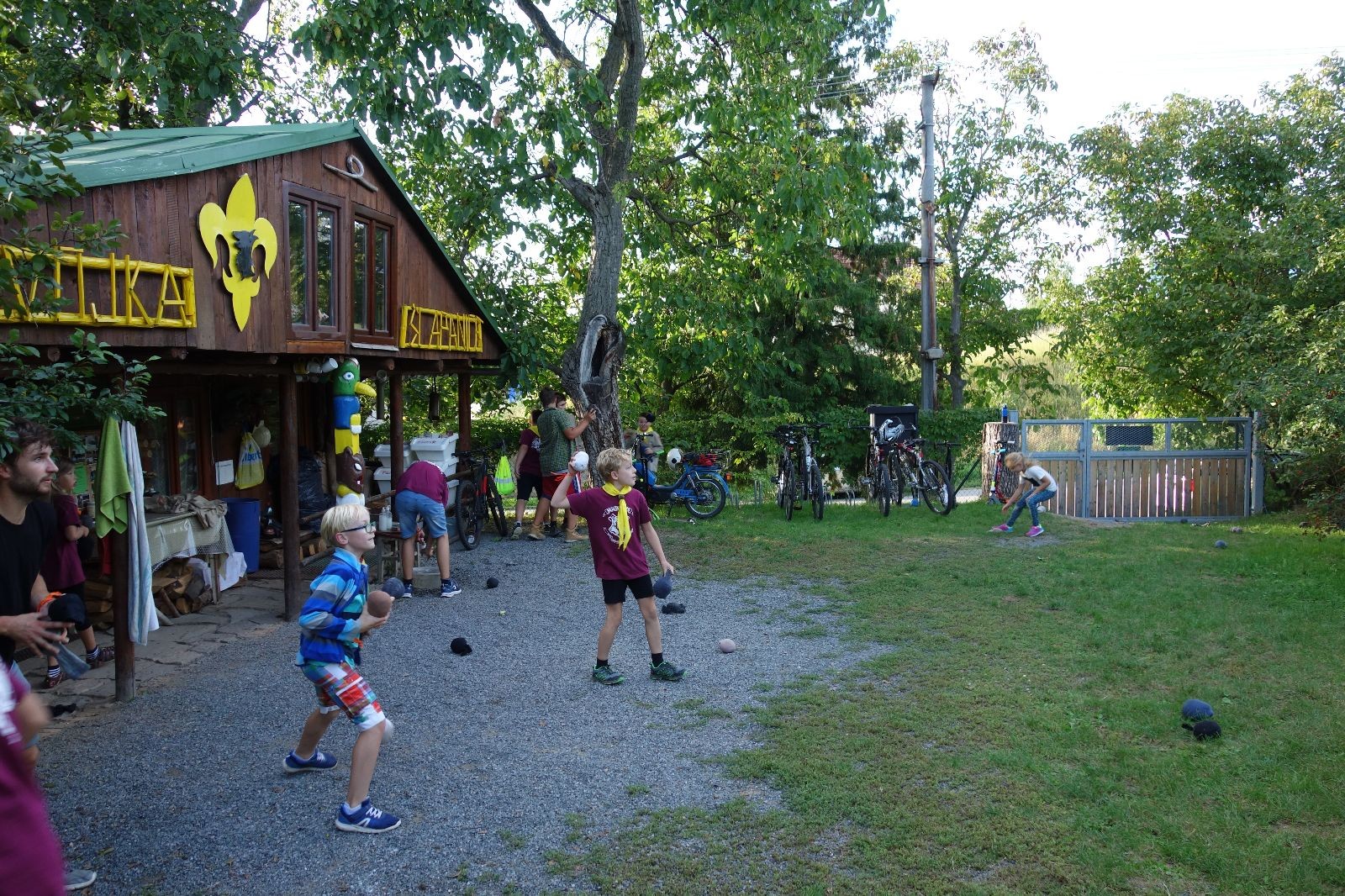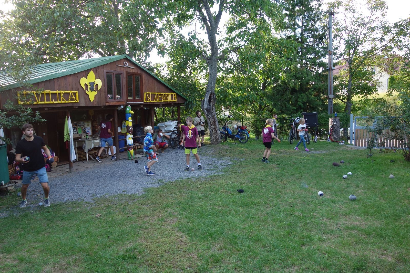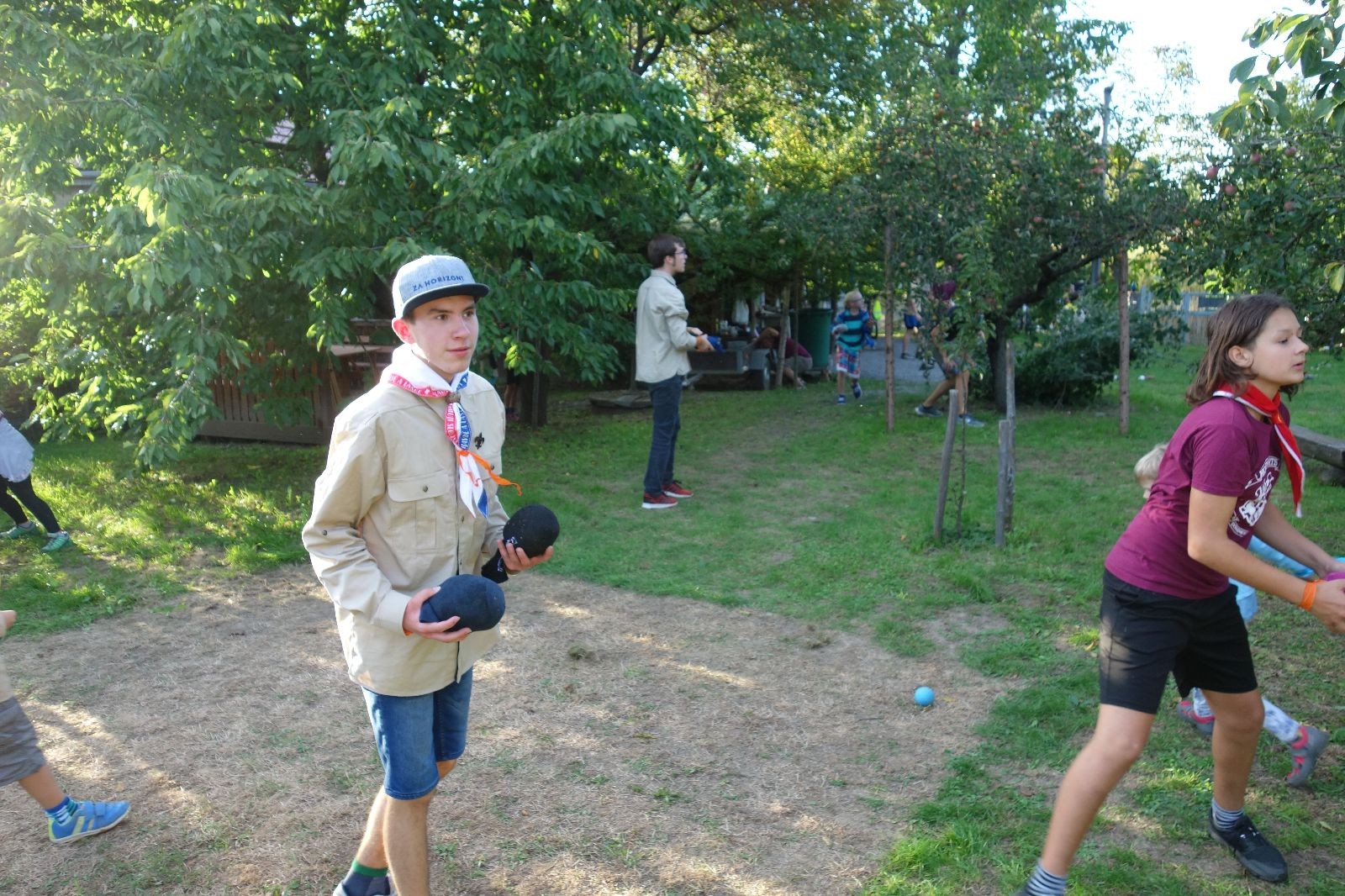 A potom – zlatý hřeb každé oddílové schůzky, ať už zahajovací nebo jiné – bojovka s hadrovými koulemi. Tentokrát proti sobě hráli modří a oranžoví. Kromě toho, že silné rány poshazovaly skoro všechny hrušky ze stromů, se bojovníci strefovali i do svých protivníků. První kolo vyhráli oranžoví, v druhém modří dorovnali na 1:1. V rozhodujícím třetím kole o něco líp mířili a uhýbali hadrovým střelám zase modří. Třikrát hurá pro modré vítěze a hlavně dvě sladké čočky. Tohle ale ještě nebyl konec schůzky. Protože jako každý rok se nám po táboře na Boudě nakupila spousta věcí, které postrádaly svého majitele, proběhla tradiční potáborová dražba, jejíž tváří byli Kanec s Bráchou. Část věcí se vrátila svým majitelům, zbytek ještě smutně leží na Boudě (kdo něco ještě postrádá, přijďte se podívat). S poslední zapomenutou ponožkou odbila taky poslední minuta zahajovací schůzky. Už jen svěsit vlajku, rozloučit se a všichni jsme se odebrali domů.