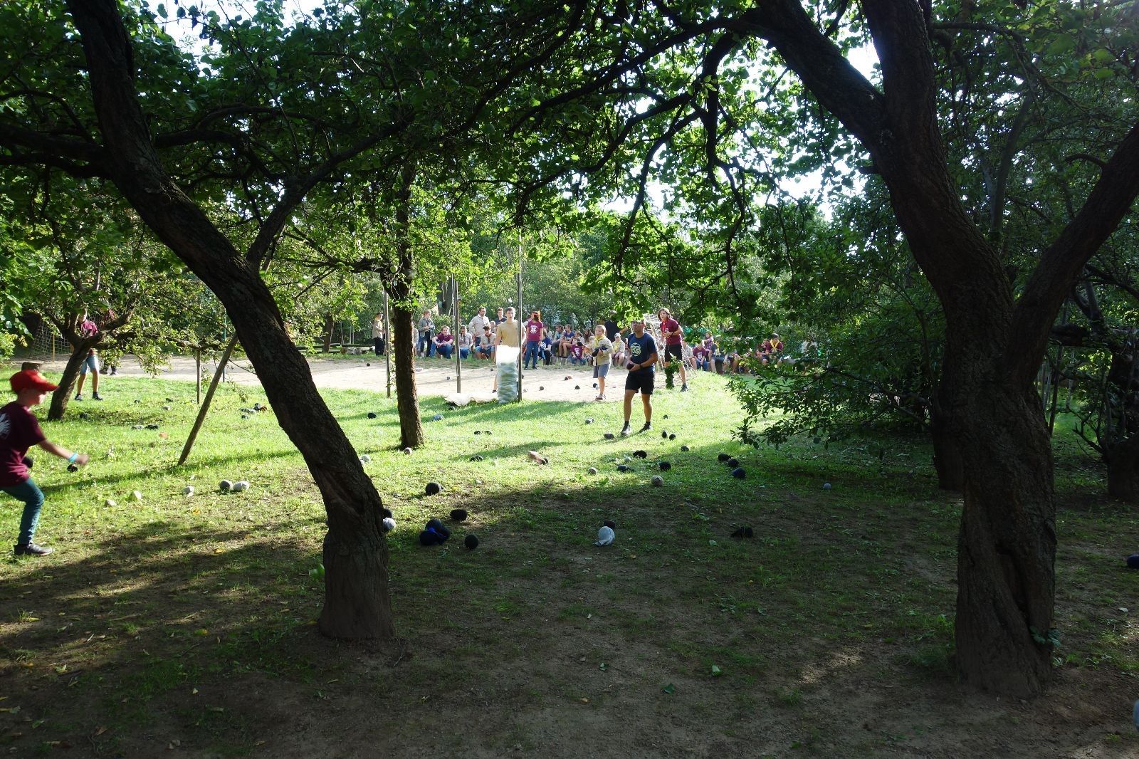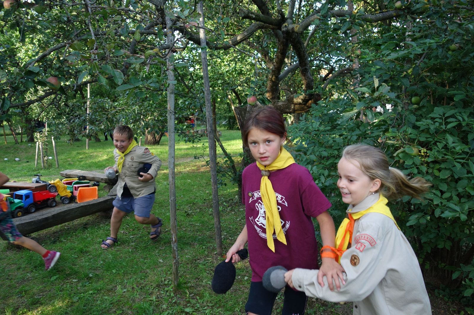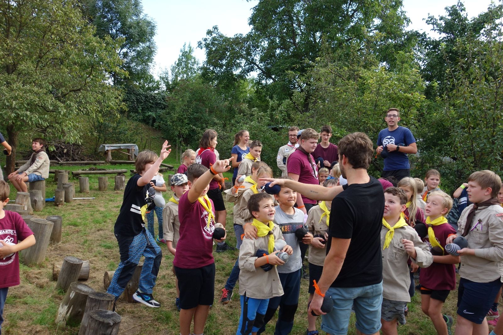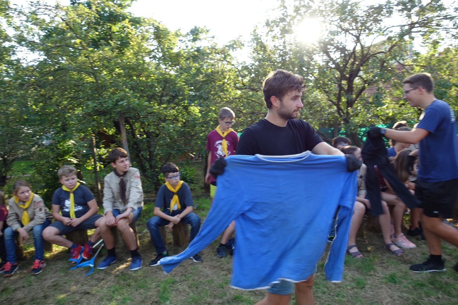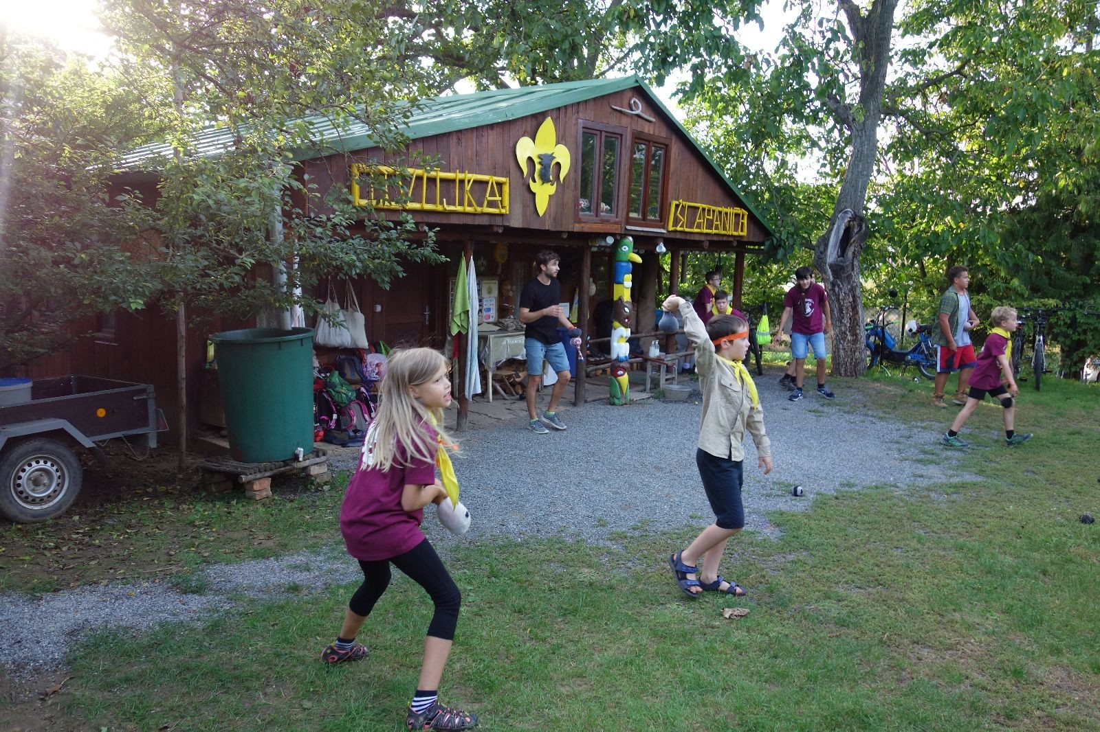 A potom – zlatý hřeb každé oddílové schůzky, ať už zahajovací nebo jiné – bojovka s hadrovými koulemi. Tentokrát proti sobě hráli modří a oranžoví. Kromě toho, že silné rány poshazovaly skoro všechny hrušky ze stromů, se bojovníci strefovali i do svých protivníků. První kolo vyhráli oranžoví, v druhém modří dorovnali na 1:1. V rozhodujícím třetím kole o něco líp mířili a uhýbali hadrovým střelám zase modří. Třikrát hurá pro modré vítěze a hlavně dvě sladké čočky. Tohle ale ještě nebyl konec schůzky. Protože jako každý rok se nám po táboře na Boudě nakupila spousta věcí, které postrádaly svého majitele, proběhla tradiční potáborová dražba, jejíž tváří byli Kanec s Bráchou. Část věcí se vrátila svým majitelům, zbytek ještě smutně leží na Boudě (kdo něco ještě postrádá, přijďte se podívat). S poslední zapomenutou ponožkou odbila taky poslední minuta zahajovací schůzky. Už jen svěsit vlajku, rozloučit se a všichni jsme se odebrali domů.