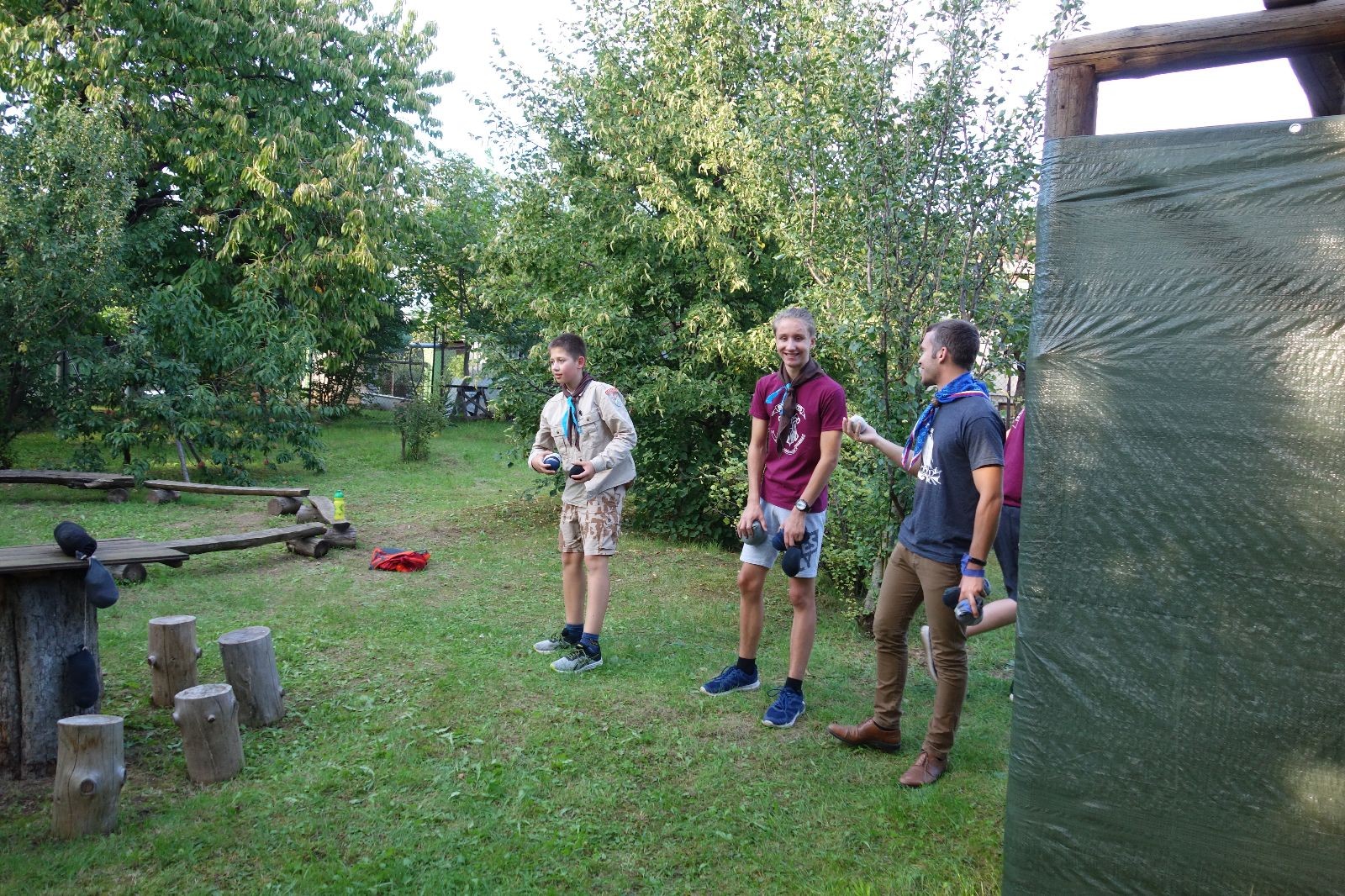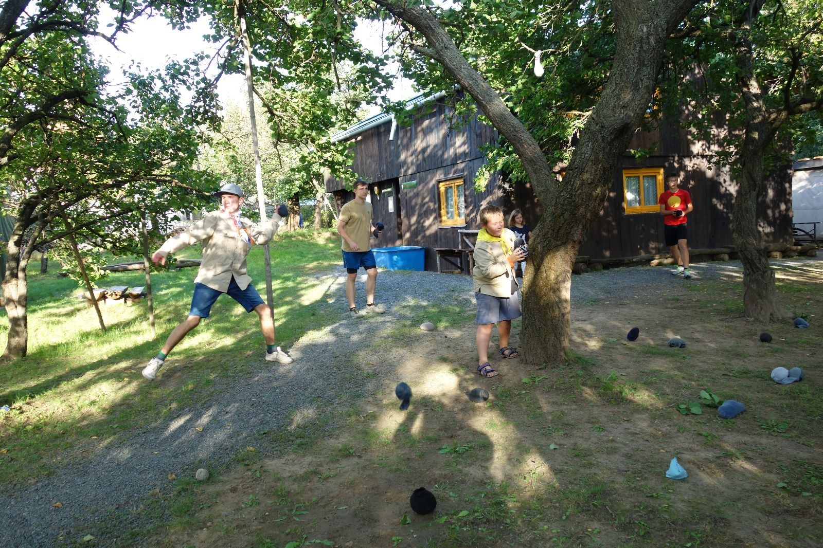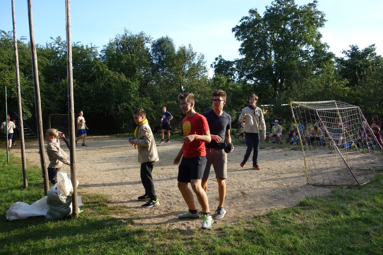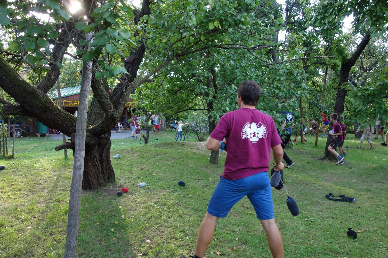 A potom – zlatý hřeb každé oddílové schůzky, ať už zahajovací nebo jiné – bojovka s hadrovými koulemi. Tentokrát proti sobě hráli modří a oranžoví. Kromě toho, že silné rány poshazovaly skoro všechny hrušky ze stromů, se bojovníci strefovali i do svých protivníků. První kolo vyhráli oranžoví, v druhém modří dorovnali na 1:1. V rozhodujícím třetím kole o něco líp mířili a uhýbali hadrovým střelám zase modří. Třikrát hurá pro modré vítěze a hlavně dvě sladké čočky. Tohle ale ještě nebyl konec schůzky. Protože jako každý rok se nám po táboře na Boudě nakupila spousta věcí, které postrádaly svého majitele, proběhla tradiční potáborová dražba, jejíž tváří byli Kanec s Bráchou. Část věcí se vrátila svým majitelům, zbytek ještě smutně leží na Boudě (kdo něco ještě postrádá, přijďte se podívat). S poslední zapomenutou ponožkou odbila taky poslední minuta zahajovací schůzky. Už jen svěsit vlajku, rozloučit se a všichni jsme se odebrali domů.