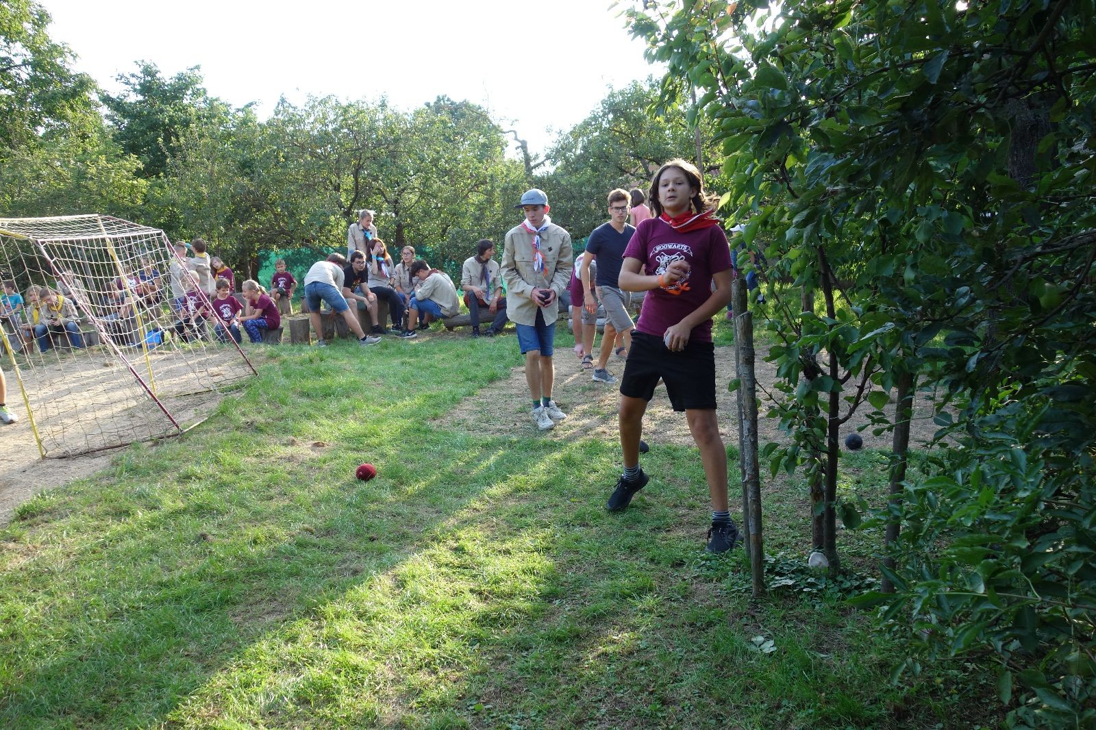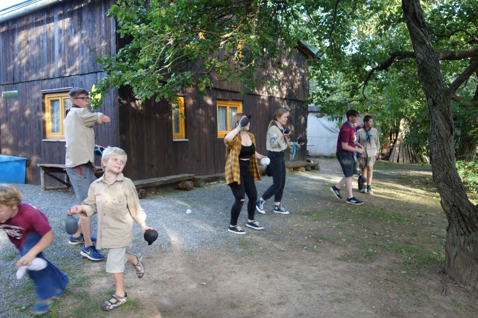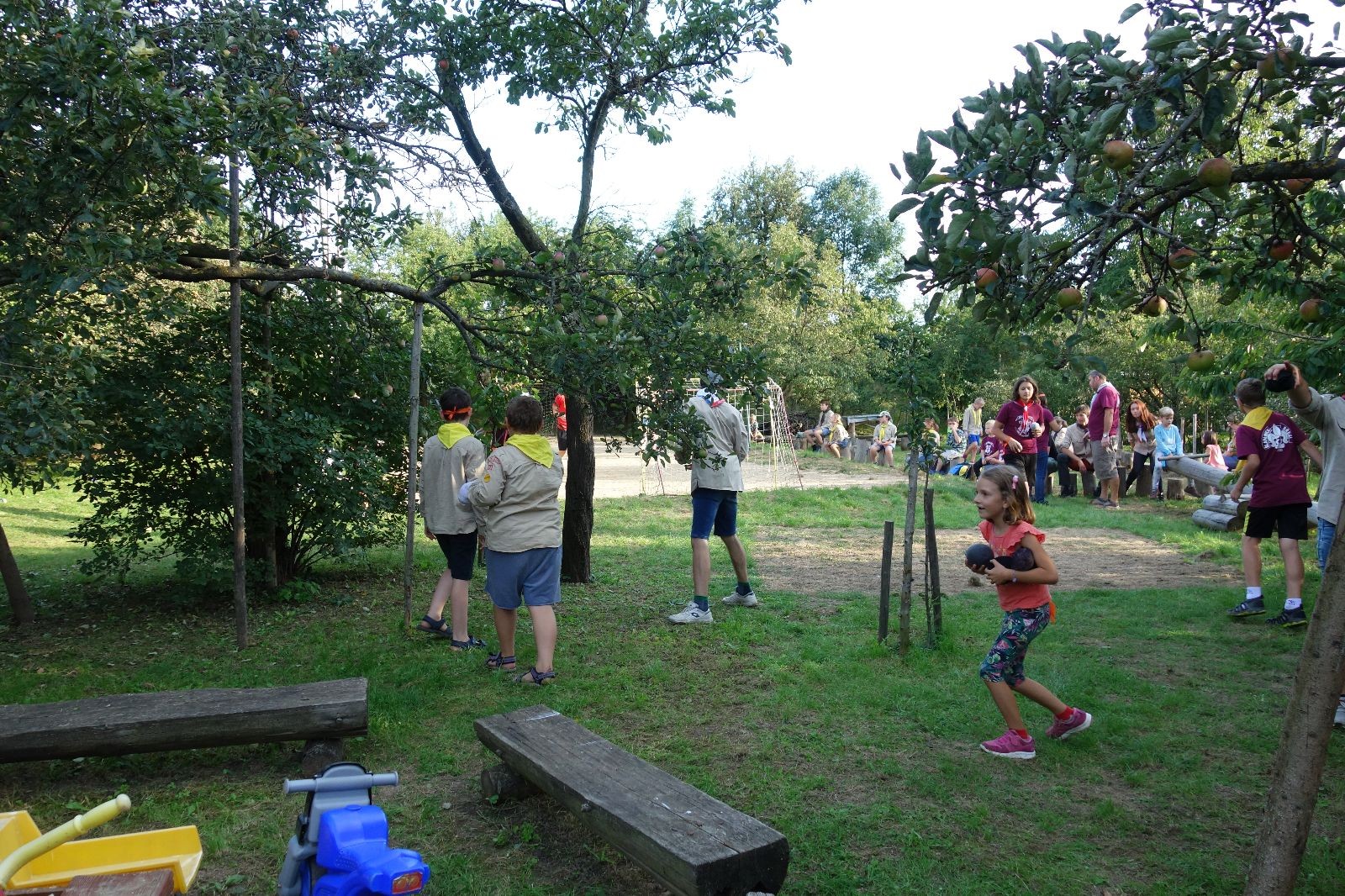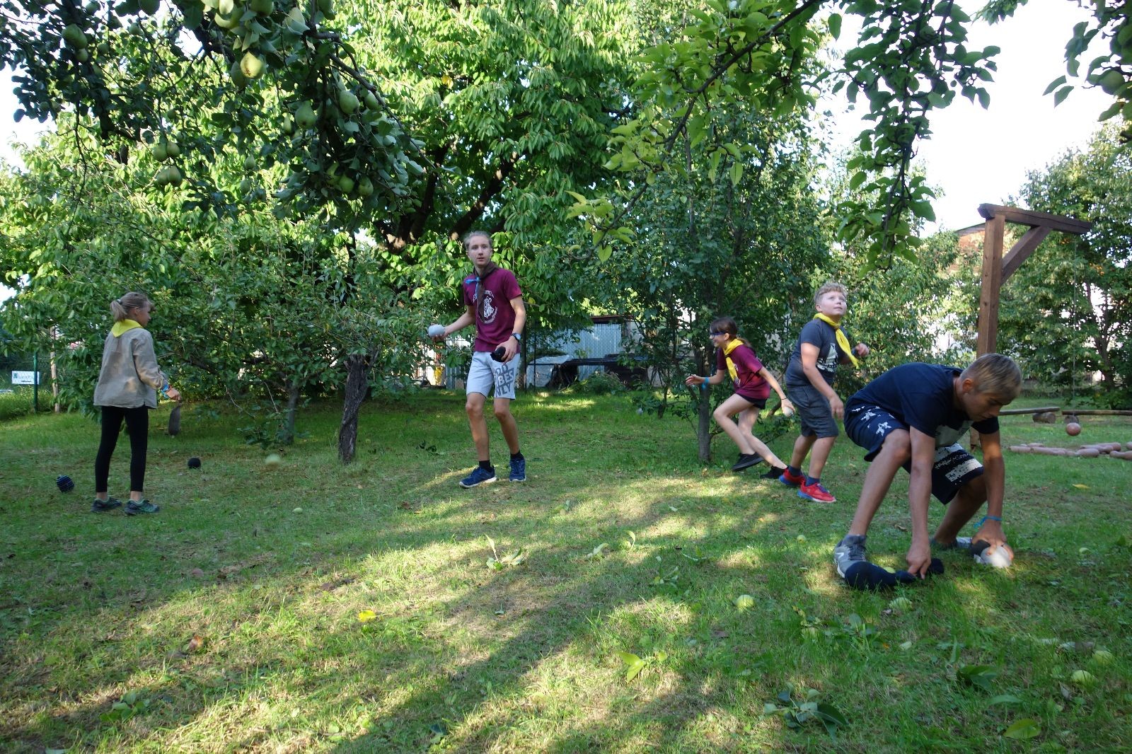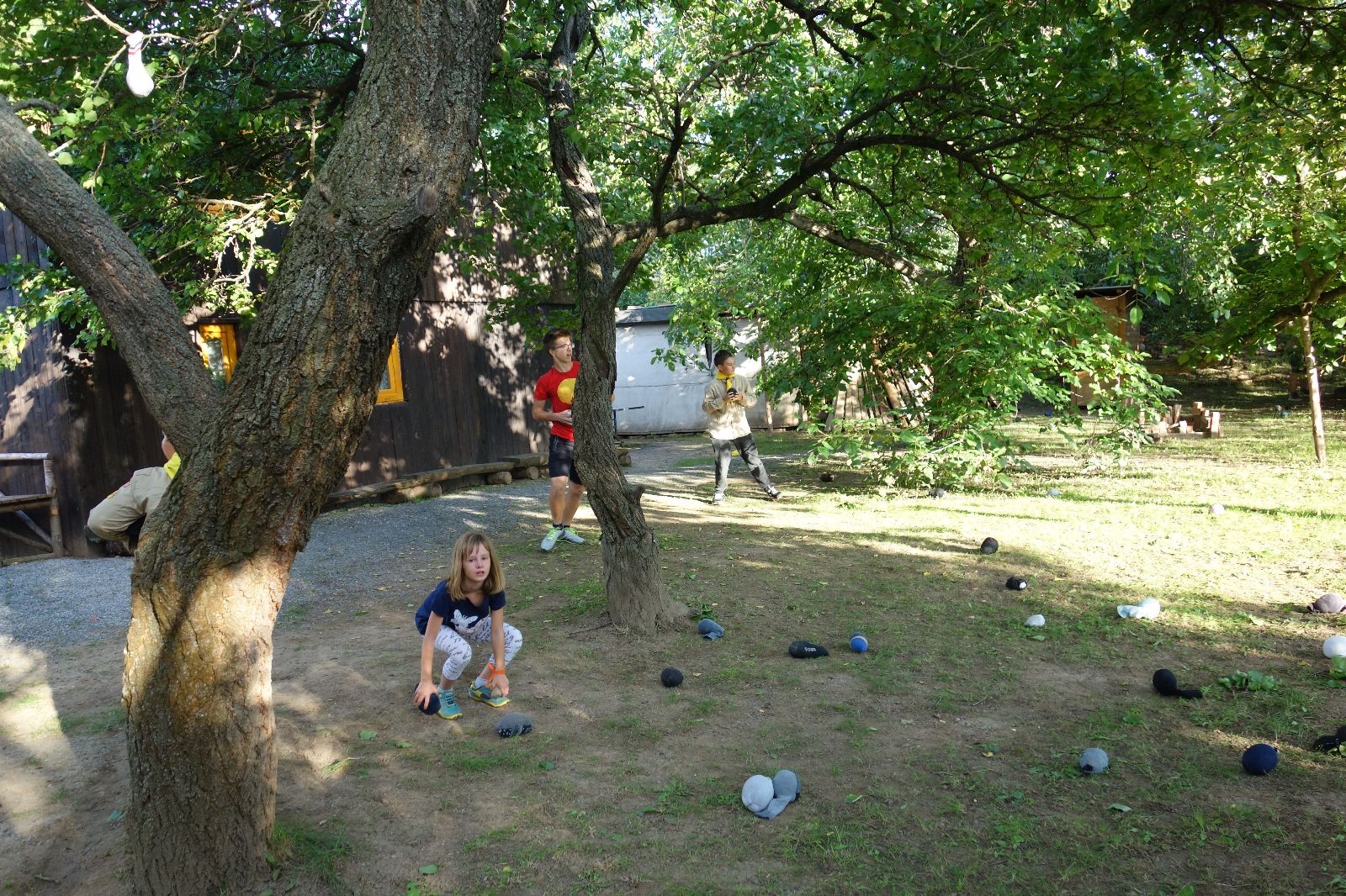 A potom – zlatý hřeb každé oddílové schůzky, ať už zahajovací nebo jiné – bojovka s hadrovými koulemi. Tentokrát proti sobě hráli modří a oranžoví. Kromě toho, že silné rány poshazovaly skoro všechny hrušky ze stromů, se bojovníci strefovali i do svých protivníků. První kolo vyhráli oranžoví, v druhém modří dorovnali na 1:1. V rozhodujícím třetím kole o něco líp mířili a uhýbali hadrovým střelám zase modří. Třikrát hurá pro modré vítěze a hlavně dvě sladké čočky. Tohle ale ještě nebyl konec schůzky. Protože jako každý rok se nám po táboře na Boudě nakupila spousta věcí, které postrádaly svého majitele, proběhla tradiční potáborová dražba, jejíž tváří byli Kanec s Bráchou. Část věcí se vrátila svým majitelům, zbytek ještě smutně leží na Boudě (kdo něco ještě postrádá, přijďte se podívat). S poslední zapomenutou ponožkou odbila taky poslední minuta zahajovací schůzky. Už jen svěsit vlajku, rozloučit se a všichni jsme se odebrali domů.