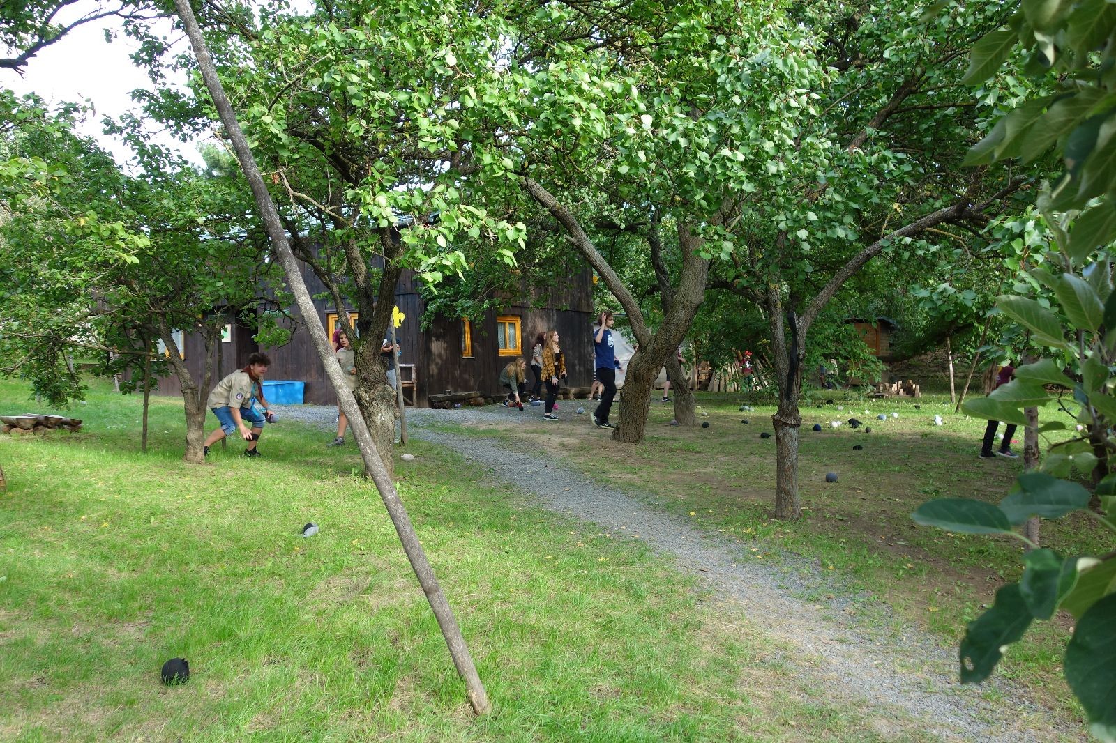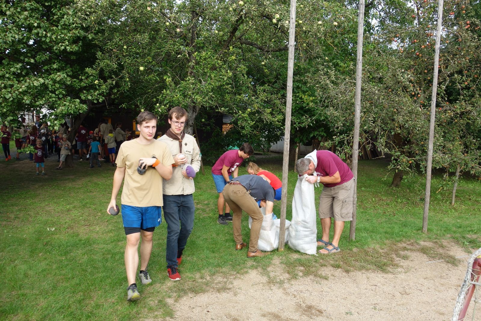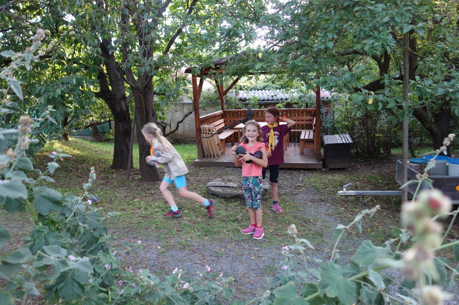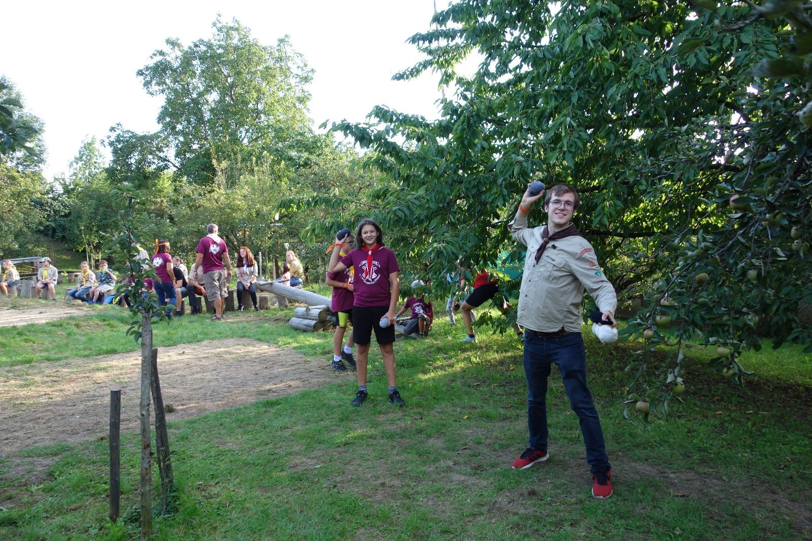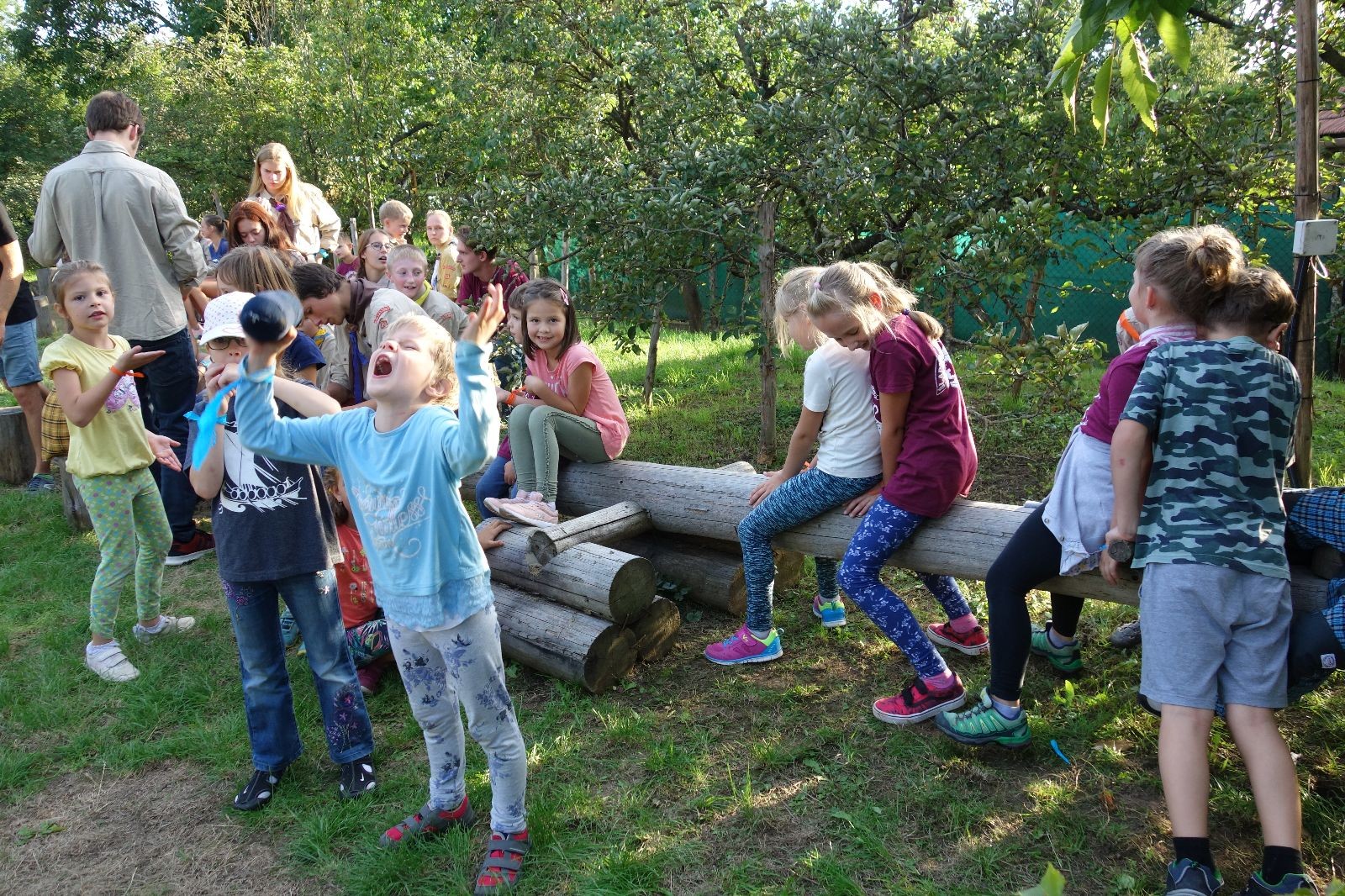 A potom – zlatý hřeb každé oddílové schůzky, ať už zahajovací nebo jiné – bojovka s hadrovými koulemi. Tentokrát proti sobě hráli modří a oranžoví. Kromě toho, že silné rány poshazovaly skoro všechny hrušky ze stromů, se bojovníci strefovali i do svých protivníků. První kolo vyhráli oranžoví, v druhém modří dorovnali na 1:1. V rozhodujícím třetím kole o něco líp mířili a uhýbali hadrovým střelám zase modří. Třikrát hurá pro modré vítěze a hlavně dvě sladké čočky. Tohle ale ještě nebyl konec schůzky. Protože jako každý rok se nám po táboře na Boudě nakupila spousta věcí, které postrádaly svého majitele, proběhla tradiční potáborová dražba, jejíž tváří byli Kanec s Bráchou. Část věcí se vrátila svým majitelům, zbytek ještě smutně leží na Boudě (kdo něco ještě postrádá, přijďte se podívat). S poslední zapomenutou ponožkou odbila taky poslední minuta zahajovací schůzky. Už jen svěsit vlajku, rozloučit se a všichni jsme se odebrali domů.