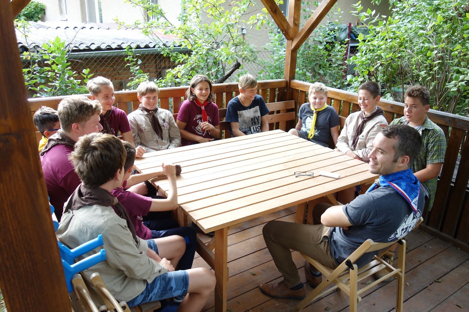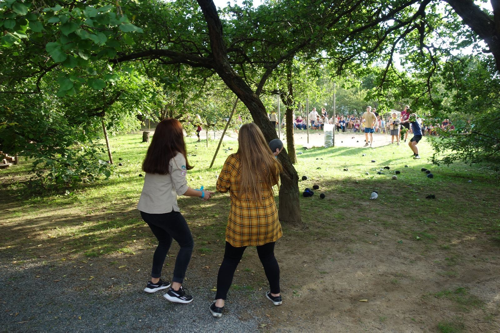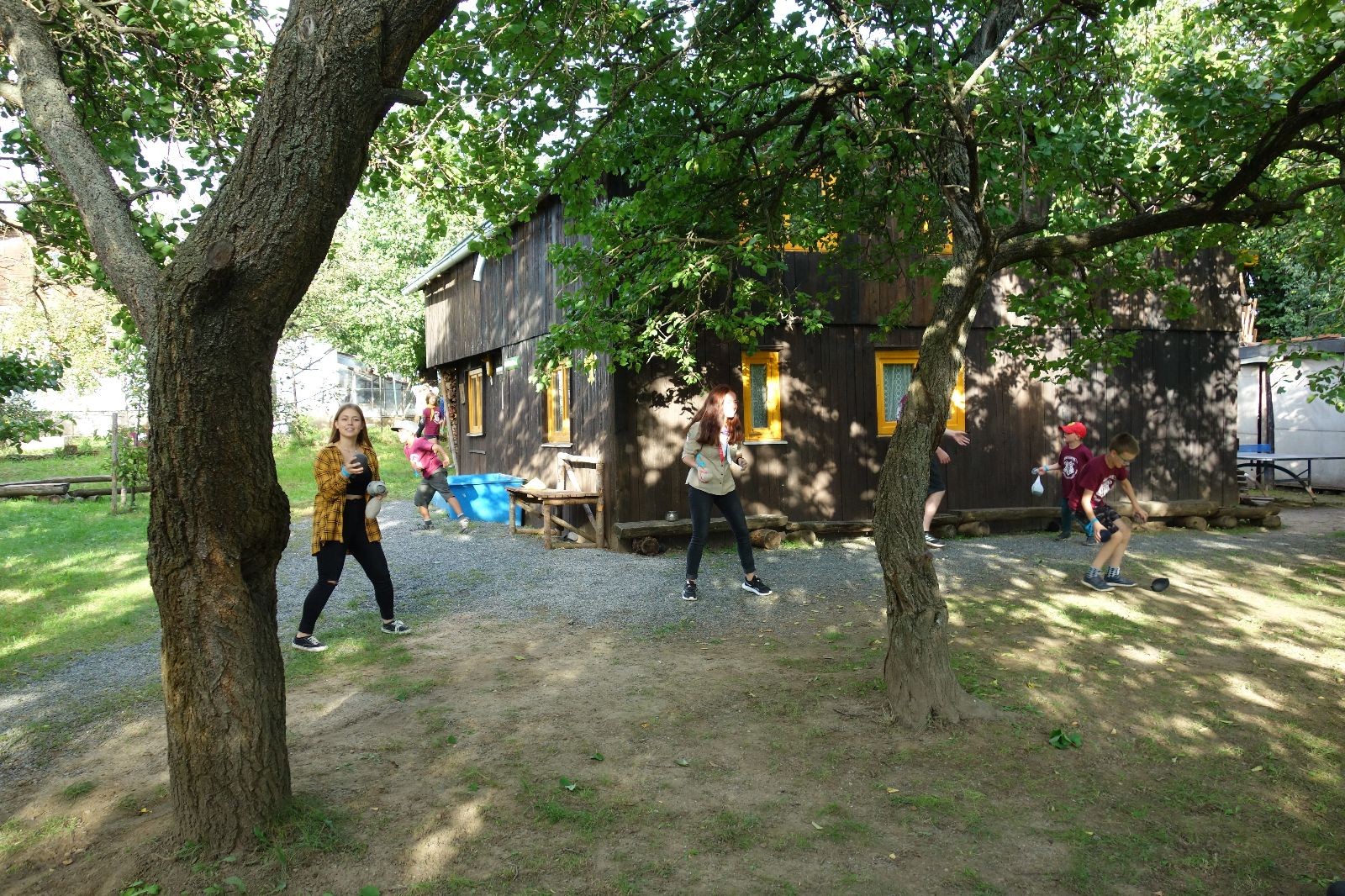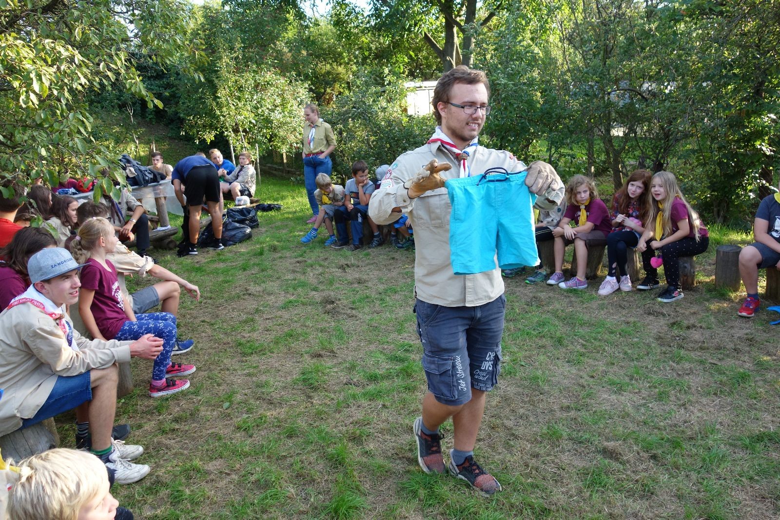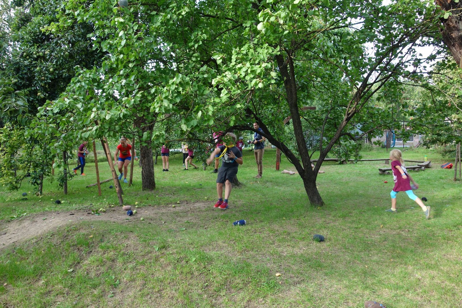 A potom – zlatý hřeb každé oddílové schůzky, ať už zahajovací nebo jiné – bojovka s hadrovými koulemi. Tentokrát proti sobě hráli modří a oranžoví. Kromě toho, že silné rány poshazovaly skoro všechny hrušky ze stromů, se bojovníci strefovali i do svých protivníků. První kolo vyhráli oranžoví, v druhém modří dorovnali na 1:1. V rozhodujícím třetím kole o něco líp mířili a uhýbali hadrovým střelám zase modří. Třikrát hurá pro modré vítěze a hlavně dvě sladké čočky. Tohle ale ještě nebyl konec schůzky. Protože jako každý rok se nám po táboře na Boudě nakupila spousta věcí, které postrádaly svého majitele, proběhla tradiční potáborová dražba, jejíž tváří byli Kanec s Bráchou. Část věcí se vrátila svým majitelům, zbytek ještě smutně leží na Boudě (kdo něco ještě postrádá, přijďte se podívat). S poslední zapomenutou ponožkou odbila taky poslední minuta zahajovací schůzky. Už jen svěsit vlajku, rozloučit se a všichni jsme se odebrali domů.