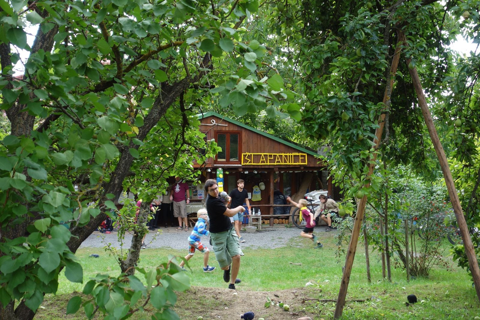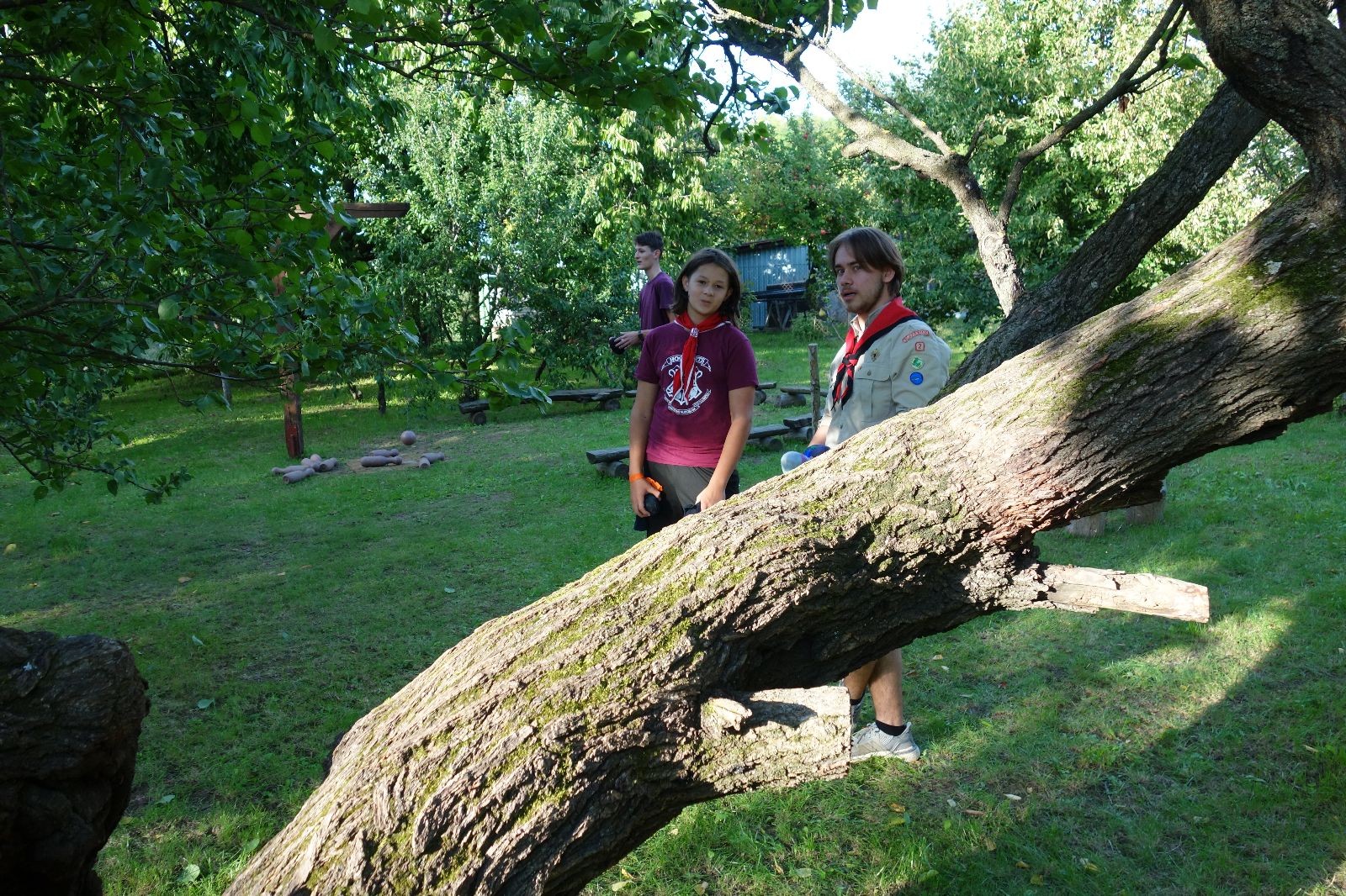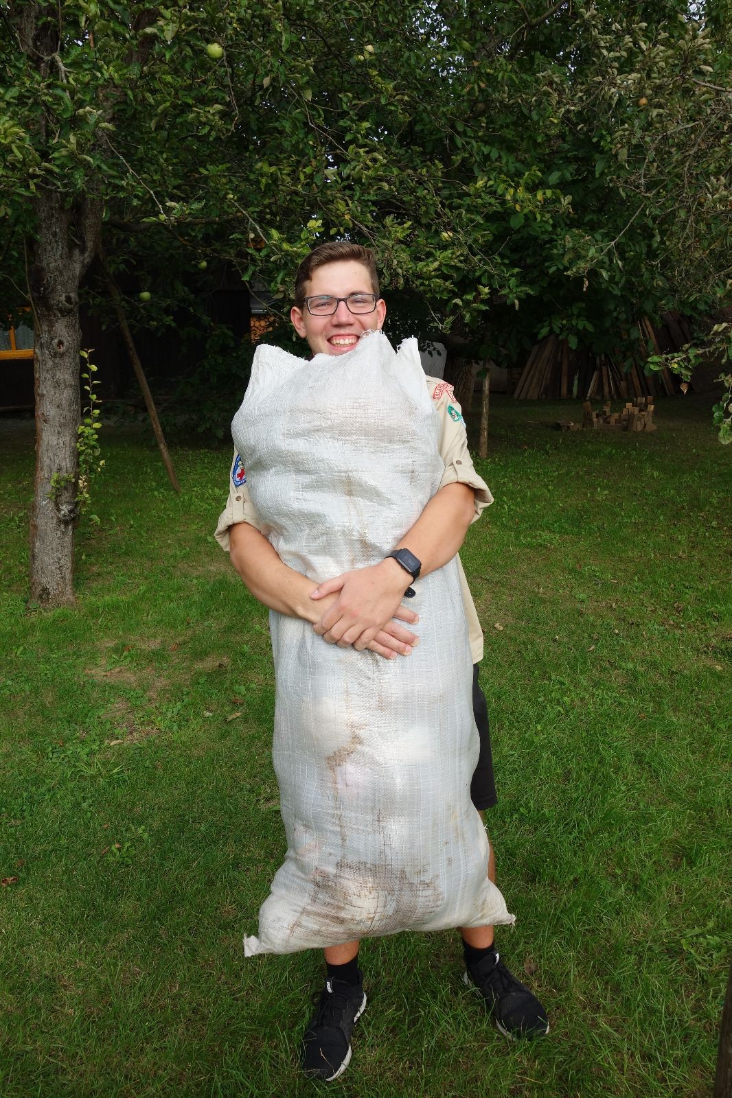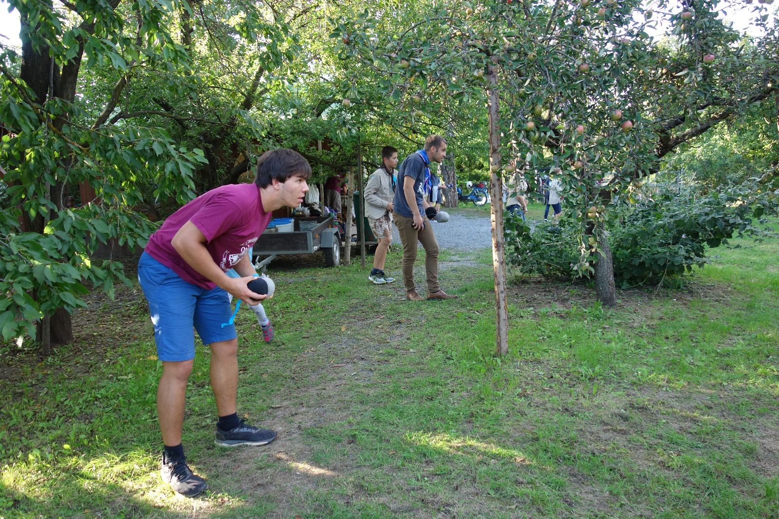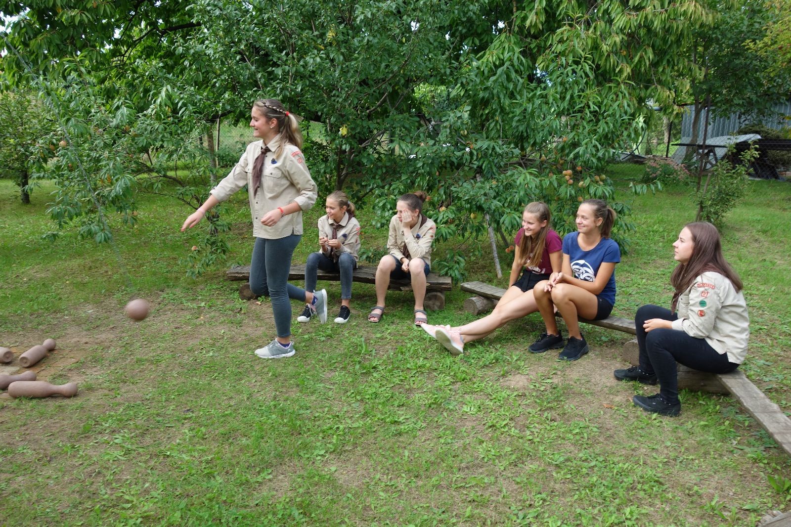 A potom – zlatý hřeb každé oddílové schůzky, ať už zahajovací nebo jiné – bojovka s hadrovými koulemi. Tentokrát proti sobě hráli modří a oranžoví. Kromě toho, že silné rány poshazovaly skoro všechny hrušky ze stromů, se bojovníci strefovali i do svých protivníků. První kolo vyhráli oranžoví, v druhém modří dorovnali na 1:1. V rozhodujícím třetím kole o něco líp mířili a uhýbali hadrovým střelám zase modří. Třikrát hurá pro modré vítěze a hlavně dvě sladké čočky. Tohle ale ještě nebyl konec schůzky. Protože jako každý rok se nám po táboře na Boudě nakupila spousta věcí, které postrádaly svého majitele, proběhla tradiční potáborová dražba, jejíž tváří byli Kanec s Bráchou. Část věcí se vrátila svým majitelům, zbytek ještě smutně leží na Boudě (kdo něco ještě postrádá, přijďte se podívat). S poslední zapomenutou ponožkou odbila taky poslední minuta zahajovací schůzky. Už jen svěsit vlajku, rozloučit se a všichni jsme se odebrali domů.