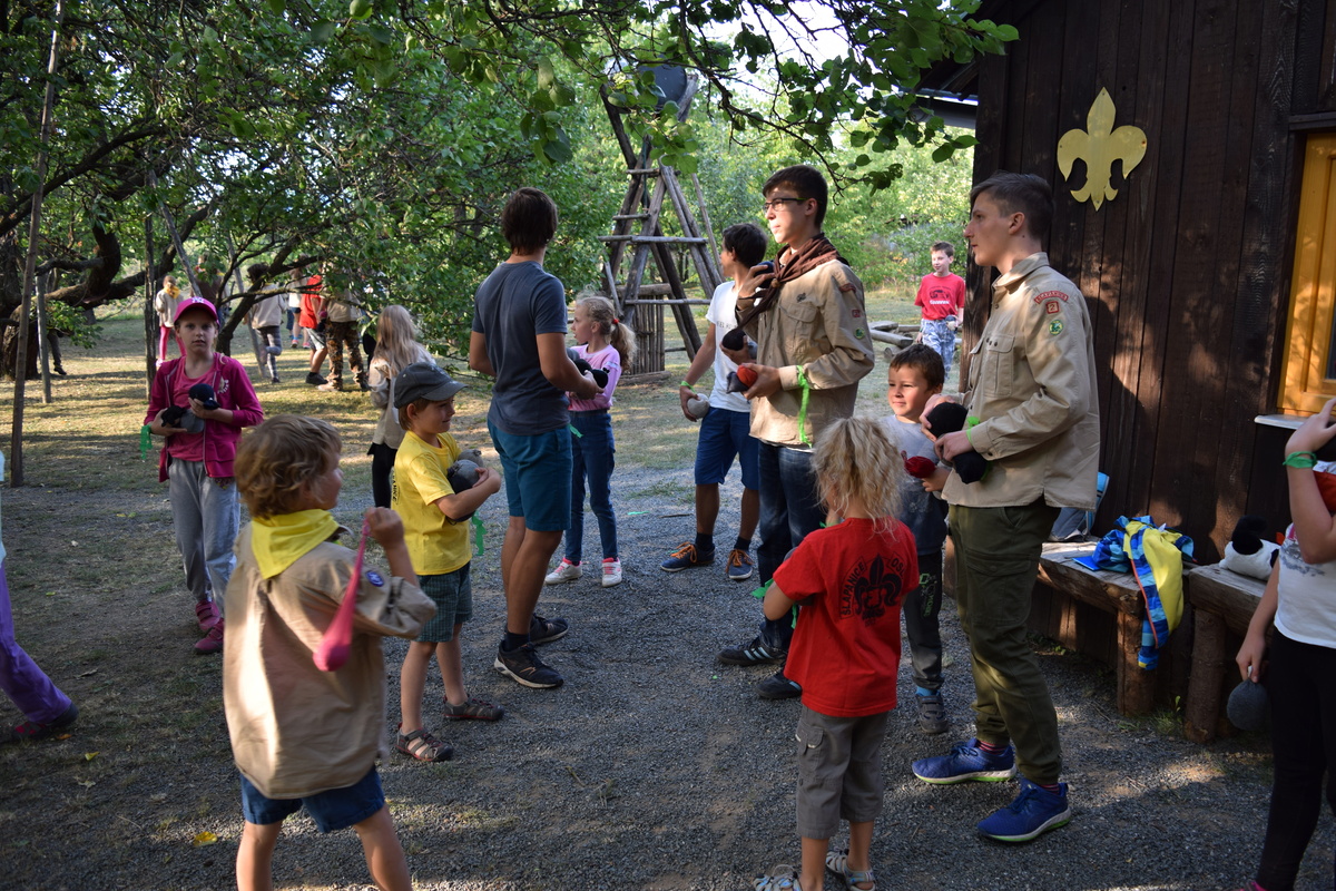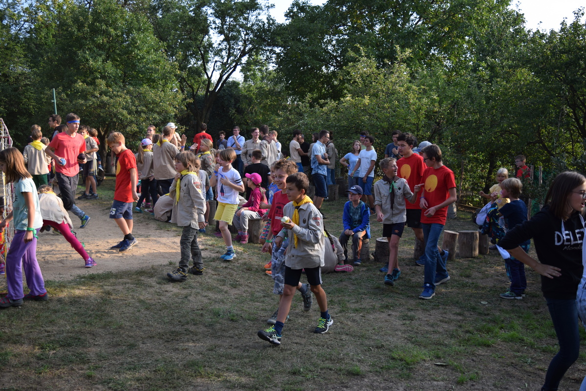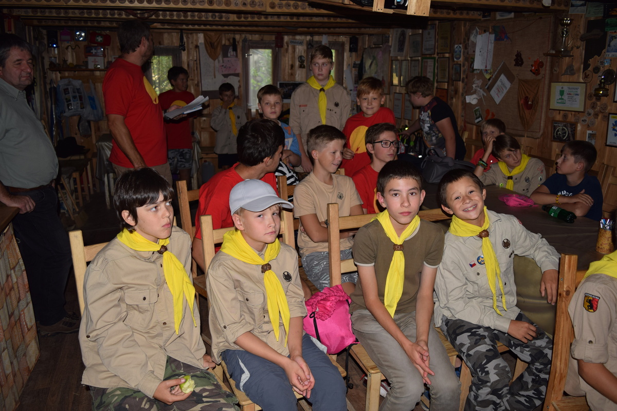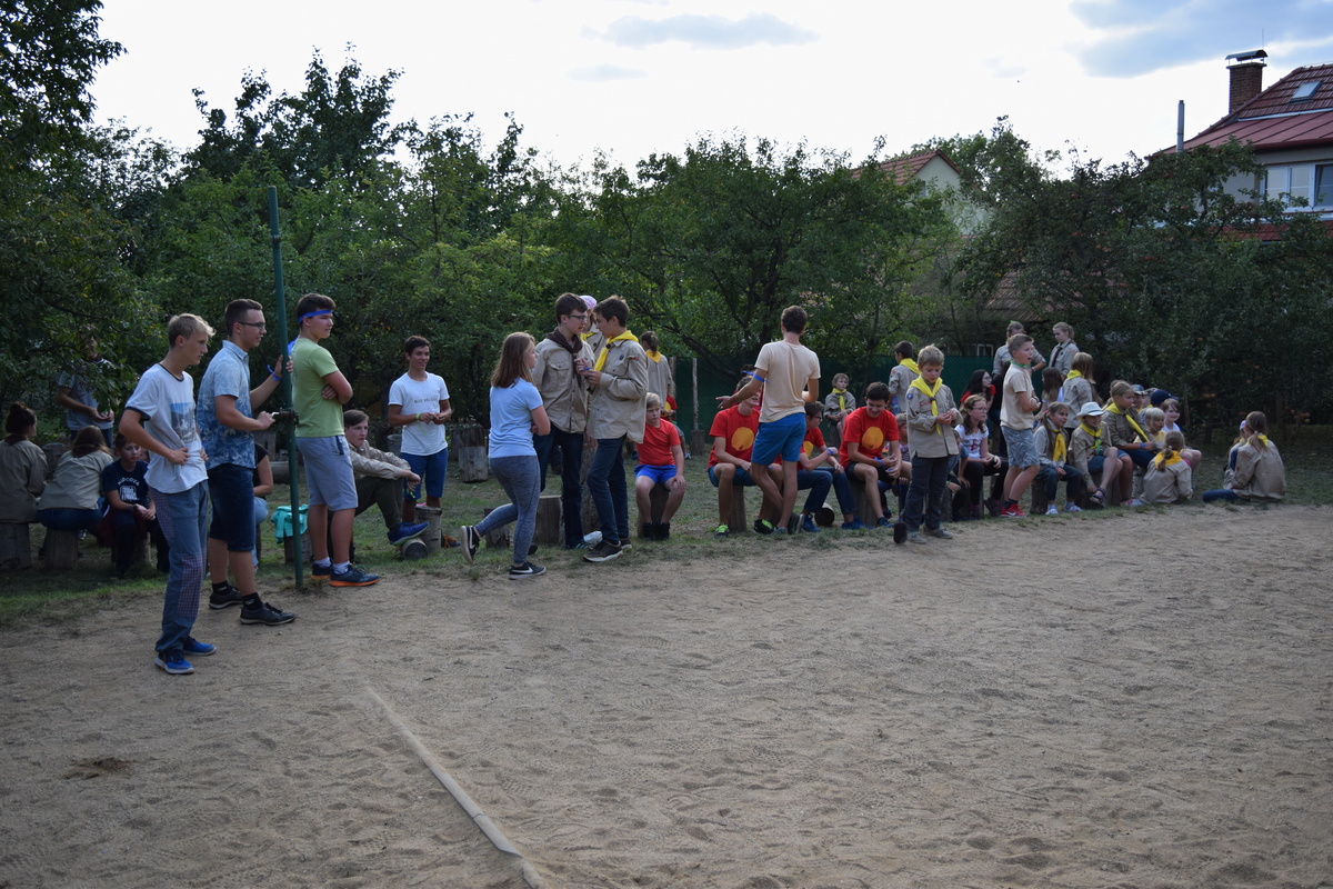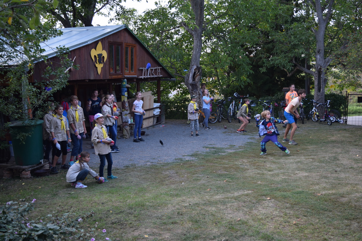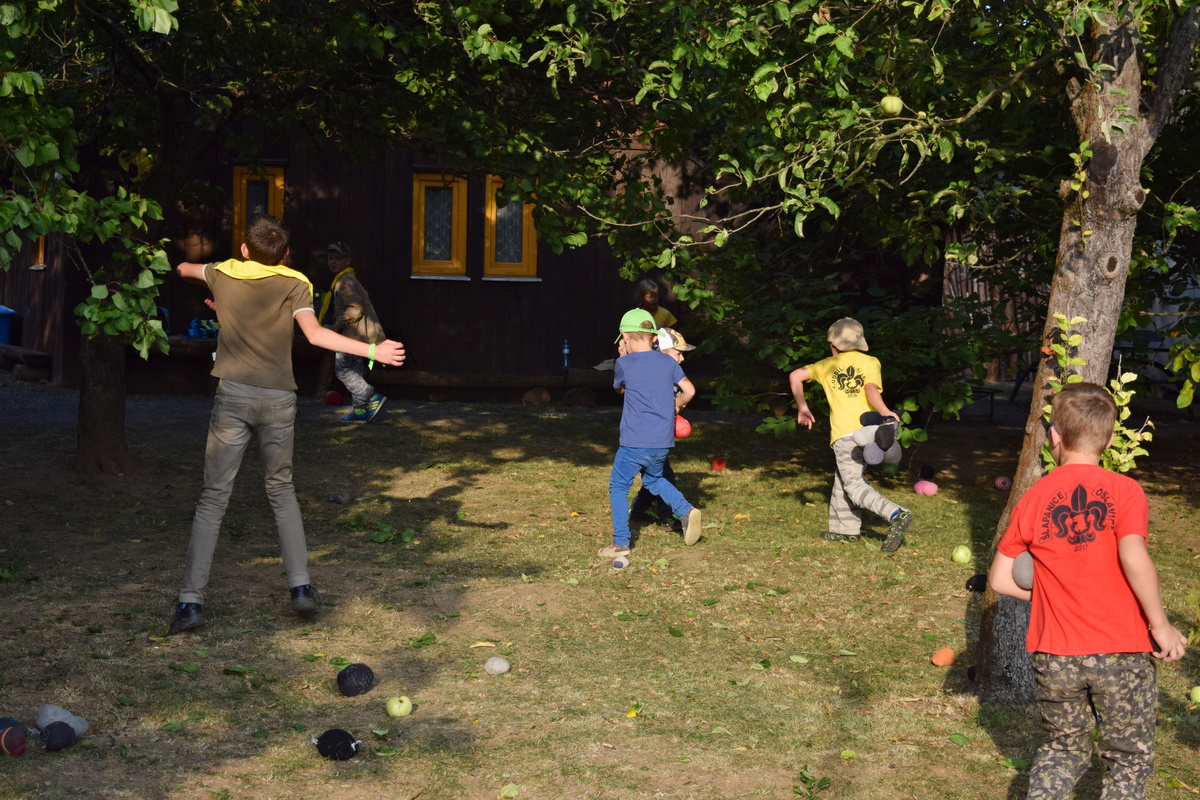 „Činnost nebo uspořádaná akce pro veřejnost je dotována městem Šlapanice“. V pátek 8.9.2017 od 16:00 proběhla tradiční zahajovací schůzka, kterou vždy započíná náš oddíl podzimní činnost. Účast byla naprosto nečekaná, počítejte se mnou: 17 vedoucích, 16 Svišťů, 15 Veverek, 14 Vlků, 13 Kudlanek, 11 Tygrů, 10 Draků, 9 Pum, 8 Sršňů a 6 členů nové družinky, která ještě nemá název. Celkem 119 lidiček a to nepočítám přihlížející rodiče čerstvých nováčků :-). Započali jsme jako obvykle nástupem, vlajku vztyčil Corado. Poté se slova ujali Brácha s Petrem a jali se organizovat oblíbenou "Seznamovačku. Skvělá hra, jen lidí je nějak moc. Být jich tak polovina, asi by si to všichni dost užili. Jakmile zakončí Petr poslední kolo, zjednávám klid a oznamuji, kde bude mít kdo družinovou schůzku. Svišti uhánějí spolu s Fí a Mony k pink-pongovému stolu, Pumy se sunou do Nové Boudy, nováčci spolu s Kloubem, Roxym a Kosťou do Boudy Staré, Kudlanky jdou do Trojky, Veverky na "Koulí hexagon" u sprchy, Tygři tradičně ke kuželkám, Vlci zůstávají u ohniště, Draci letí k pískovišti, Sršni zůstávají na špalcích ... no ještě že tady na základně máme těch míst k setkání dost :-). Jak tak postupně krátké družinové schůzky končí, jde vždy trojice družinek do Trojky shlédnout Kašův trailer z letošního tábora a hned poté členové zamíří k jednomu z generálů: Kloub šikuje svoji zelenou armádu vedle Nové Boudy, Kosťa řadí svoje modré na hřišti. Každý fasuje tři hadrovky, starší seznamují ty mladší s pravidly a může se hrát. Rodičové po pár minutách vyklízejí pole, základnou se valí jeden útok za druhým. První kolo vítězí modří s velkou převahou, prorazili totiž pravé křídlo soupeřů a vzali je do kleští. Výměna stran, druhé kolo. Situace se opakuje, jen v opačném gardu. Hezké bylo, jak si Bengi zahrál asi jednu vteřinu (tolik času od úvodního hvizdu uplynulo, než dostal zásah) a smějící se Brácha ho překonal asi tak o další vteřinu, než to koupil pro změnu on. Nerozhodně, 1:1. Musí se hrát třetí kolo, V něm vítězí zelení a tak Babů dává 2 lentilky coby odměnu jim, poraženým pak po jedné. Sbíráme koule, generálové je uklízejí a už se u ohniště šikují dvě dvojice zkušených dražitelů. Co se bude dražit? No přece zapomenuté věci z tábora a z předtáborových schůzek. Jsou toho dvě velké bedny. I přes značnou snahu se daří rozdat jen snad čtvrtinu věcí. Co se zbytkem? No uvidíme... A protože se čas nachýlil, zakončuji schůzku, členstvo se loučí a pomalu rozchází ke svým domovům. Vedoucí ještě uklízejí a kolem půl sedmé je už na základně opět klid a mír. Ne na dlouho. Hukan něco po sedmé naváží plot, tyče, dráty a cement, protože celý víkend budeme sundávat starý a osazovat nový plot. A nejen to! Starou nehezkou bránu nahradí krásná nová, na zakázku dělaná. Tak nám držte palce, ať všechno klapne. Jura