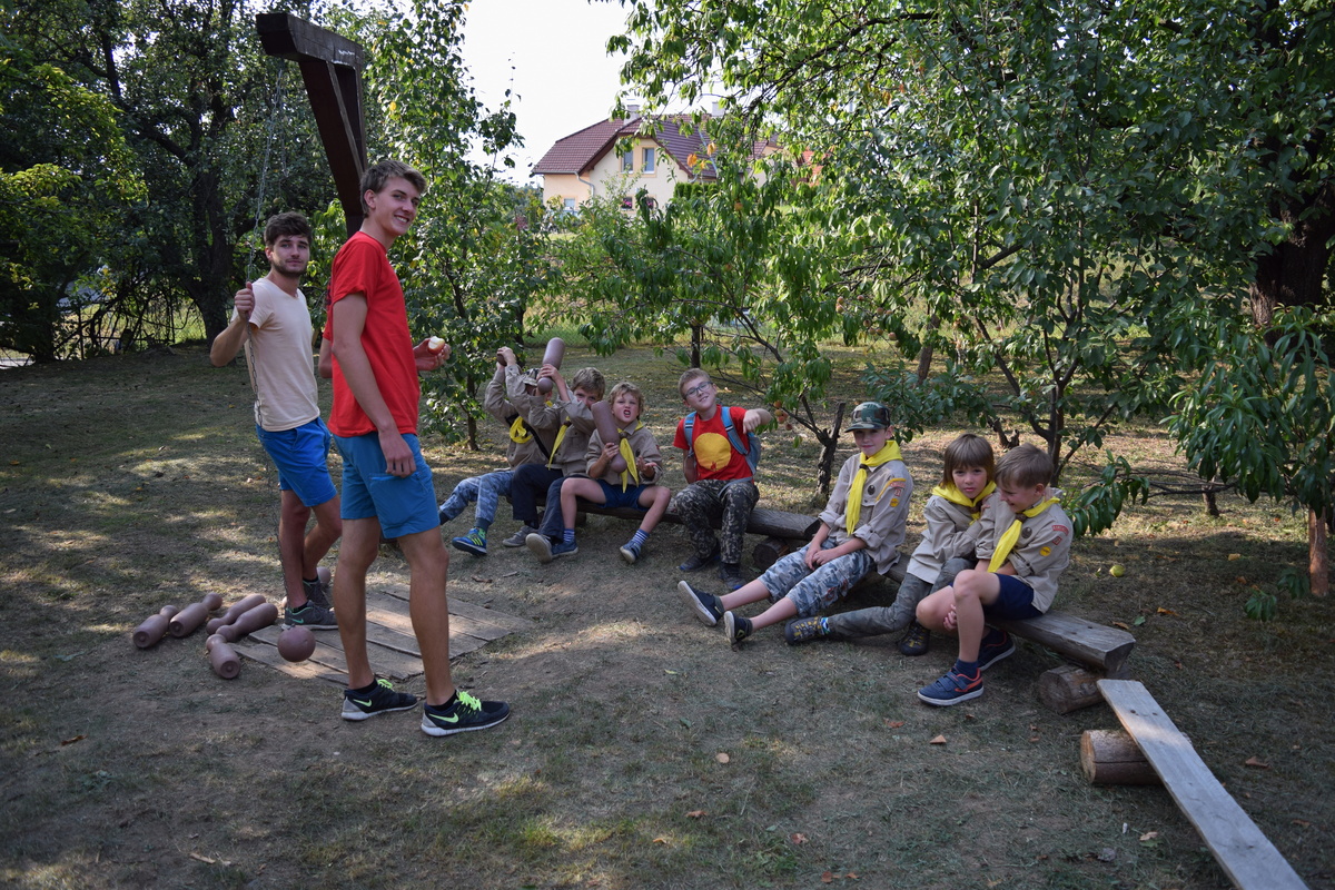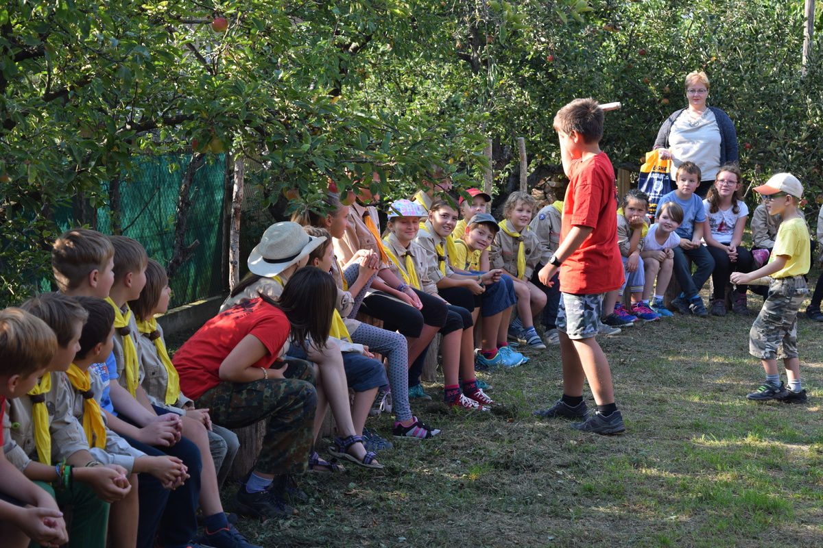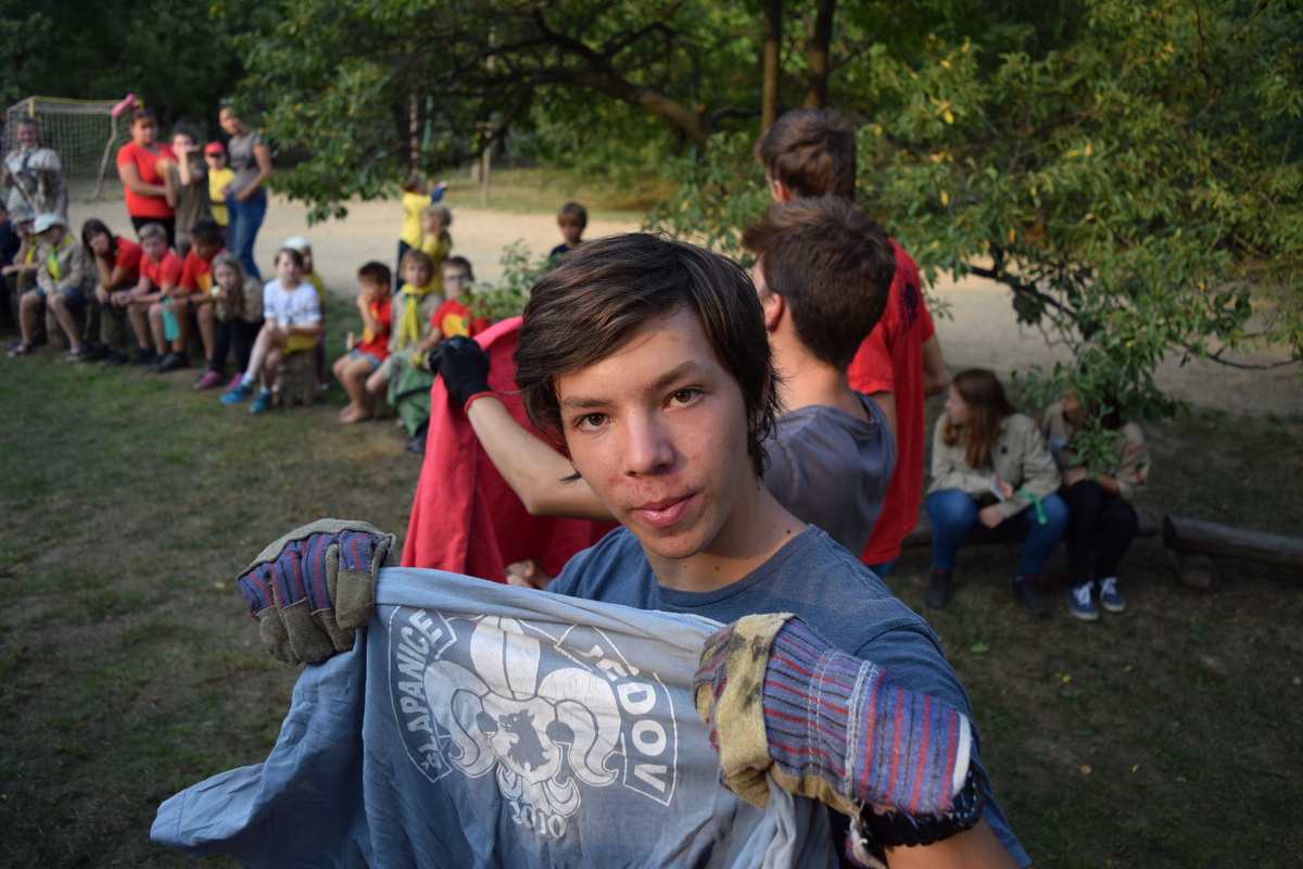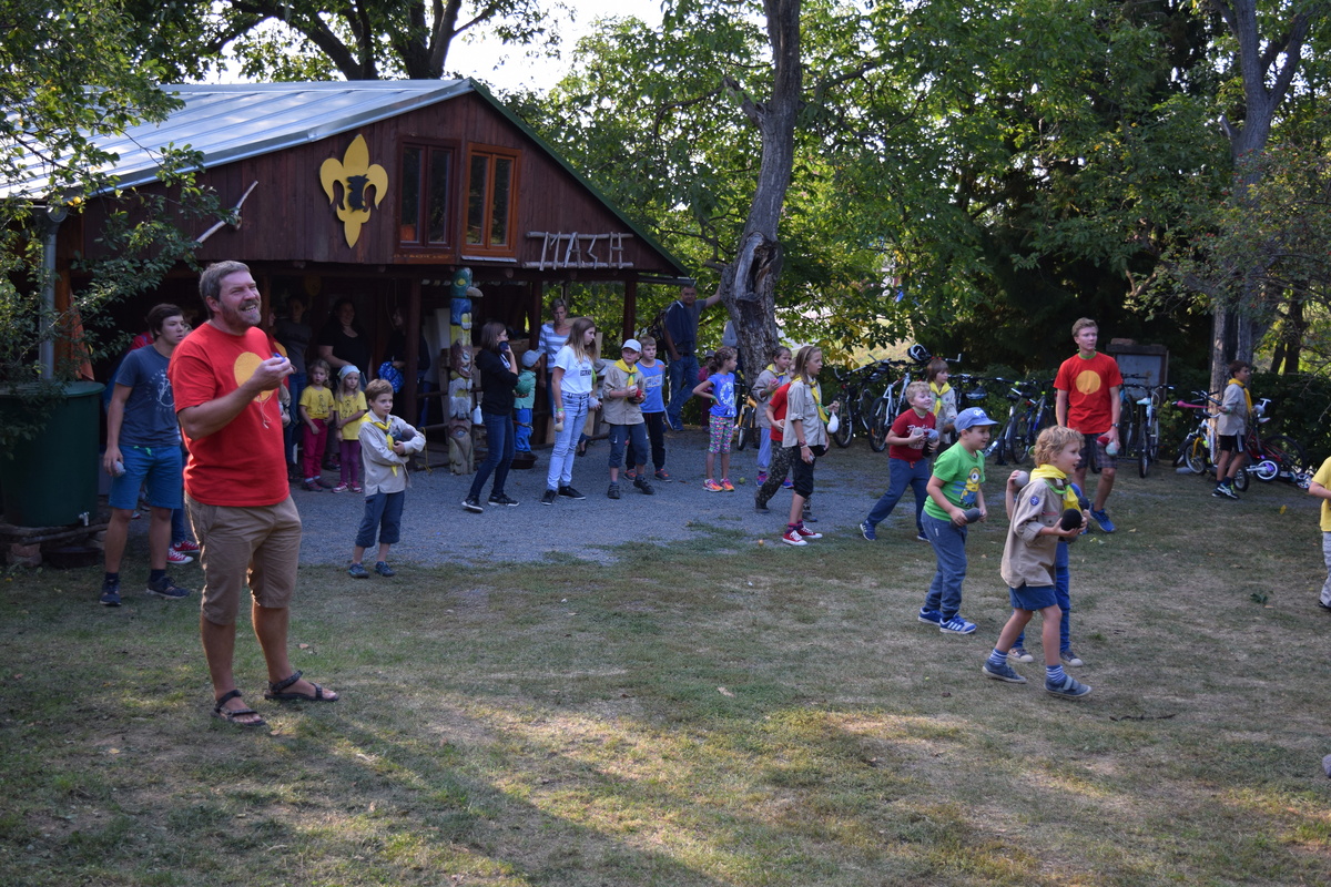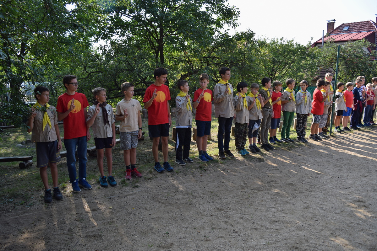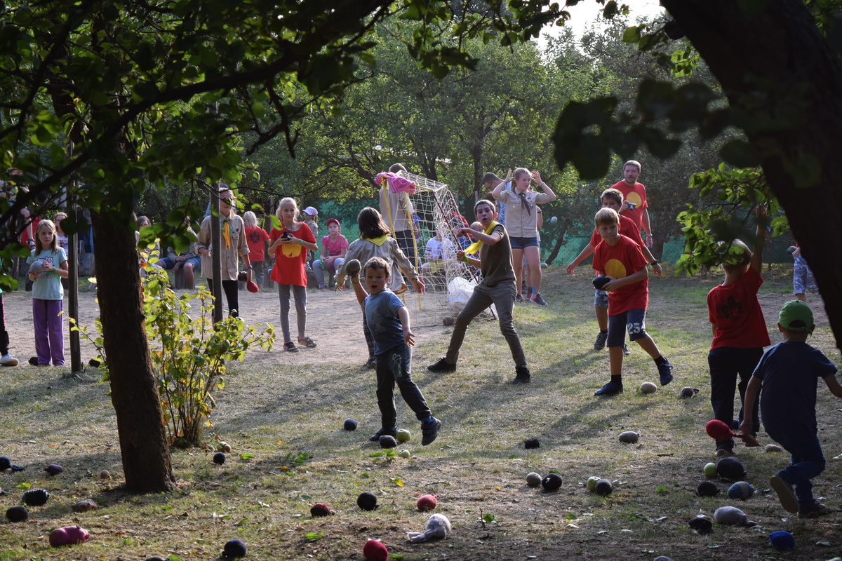 „Činnost nebo uspořádaná akce pro veřejnost je dotována městem Šlapanice“. V pátek 8.9.2017 od 16:00 proběhla tradiční zahajovací schůzka, kterou vždy započíná náš oddíl podzimní činnost. Účast byla naprosto nečekaná, počítejte se mnou: 17 vedoucích, 16 Svišťů, 15 Veverek, 14 Vlků, 13 Kudlanek, 11 Tygrů, 10 Draků, 9 Pum, 8 Sršňů a 6 členů nové družinky, která ještě nemá název. Celkem 119 lidiček a to nepočítám přihlížející rodiče čerstvých nováčků :-). Započali jsme jako obvykle nástupem, vlajku vztyčil Corado. Poté se slova ujali Brácha s Petrem a jali se organizovat oblíbenou "Seznamovačku. Skvělá hra, jen lidí je nějak moc. Být jich tak polovina, asi by si to všichni dost užili. Jakmile zakončí Petr poslední kolo, zjednávám klid a oznamuji, kde bude mít kdo družinovou schůzku. Svišti uhánějí spolu s Fí a Mony k pink-pongovému stolu, Pumy se sunou do Nové Boudy, nováčci spolu s Kloubem, Roxym a Kosťou do Boudy Staré, Kudlanky jdou do Trojky, Veverky na "Koulí hexagon" u sprchy, Tygři tradičně ke kuželkám, Vlci zůstávají u ohniště, Draci letí k pískovišti, Sršni zůstávají na špalcích ... no ještě že tady na základně máme těch míst k setkání dost :-). Jak tak postupně krátké družinové schůzky končí, jde vždy trojice družinek do Trojky shlédnout Kašův trailer z letošního tábora a hned poté členové zamíří k jednomu z generálů: Kloub šikuje svoji zelenou armádu vedle Nové Boudy, Kosťa řadí svoje modré na hřišti. Každý fasuje tři hadrovky, starší seznamují ty mladší s pravidly a může se hrát. Rodičové po pár minutách vyklízejí pole, základnou se valí jeden útok za druhým. První kolo vítězí modří s velkou převahou, prorazili totiž pravé křídlo soupeřů a vzali je do kleští. Výměna stran, druhé kolo. Situace se opakuje, jen v opačném gardu. Hezké bylo, jak si Bengi zahrál asi jednu vteřinu (tolik času od úvodního hvizdu uplynulo, než dostal zásah) a smějící se Brácha ho překonal asi tak o další vteřinu, než to koupil pro změnu on. Nerozhodně, 1:1. Musí se hrát třetí kolo, V něm vítězí zelení a tak Babů dává 2 lentilky coby odměnu jim, poraženým pak po jedné. Sbíráme koule, generálové je uklízejí a už se u ohniště šikují dvě dvojice zkušených dražitelů. Co se bude dražit? No přece zapomenuté věci z tábora a z předtáborových schůzek. Jsou toho dvě velké bedny. I přes značnou snahu se daří rozdat jen snad čtvrtinu věcí. Co se zbytkem? No uvidíme... A protože se čas nachýlil, zakončuji schůzku, členstvo se loučí a pomalu rozchází ke svým domovům. Vedoucí ještě uklízejí a kolem půl sedmé je už na základně opět klid a mír. Ne na dlouho. Hukan něco po sedmé naváží plot, tyče, dráty a cement, protože celý víkend budeme sundávat starý a osazovat nový plot. A nejen to! Starou nehezkou bránu nahradí krásná nová, na zakázku dělaná. Tak nám držte palce, ať všechno klapne. Jura