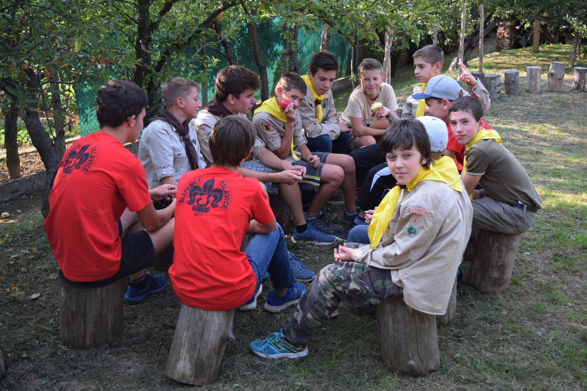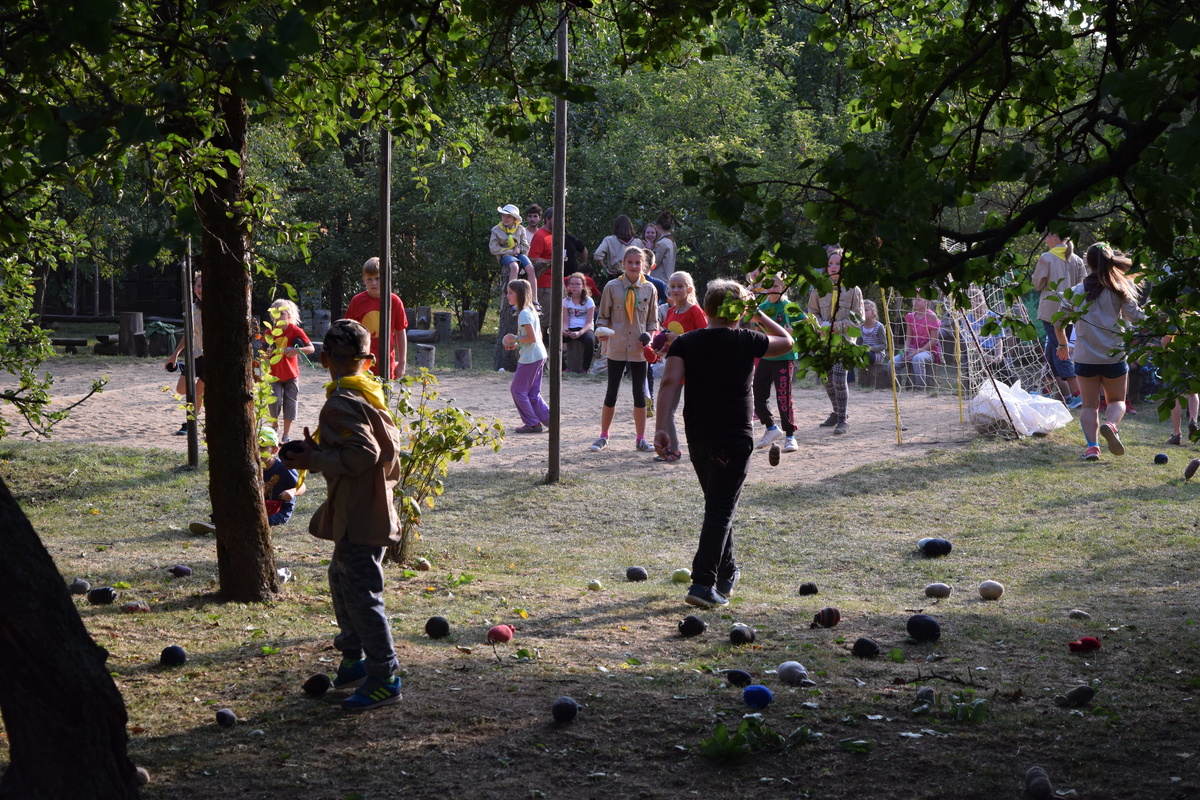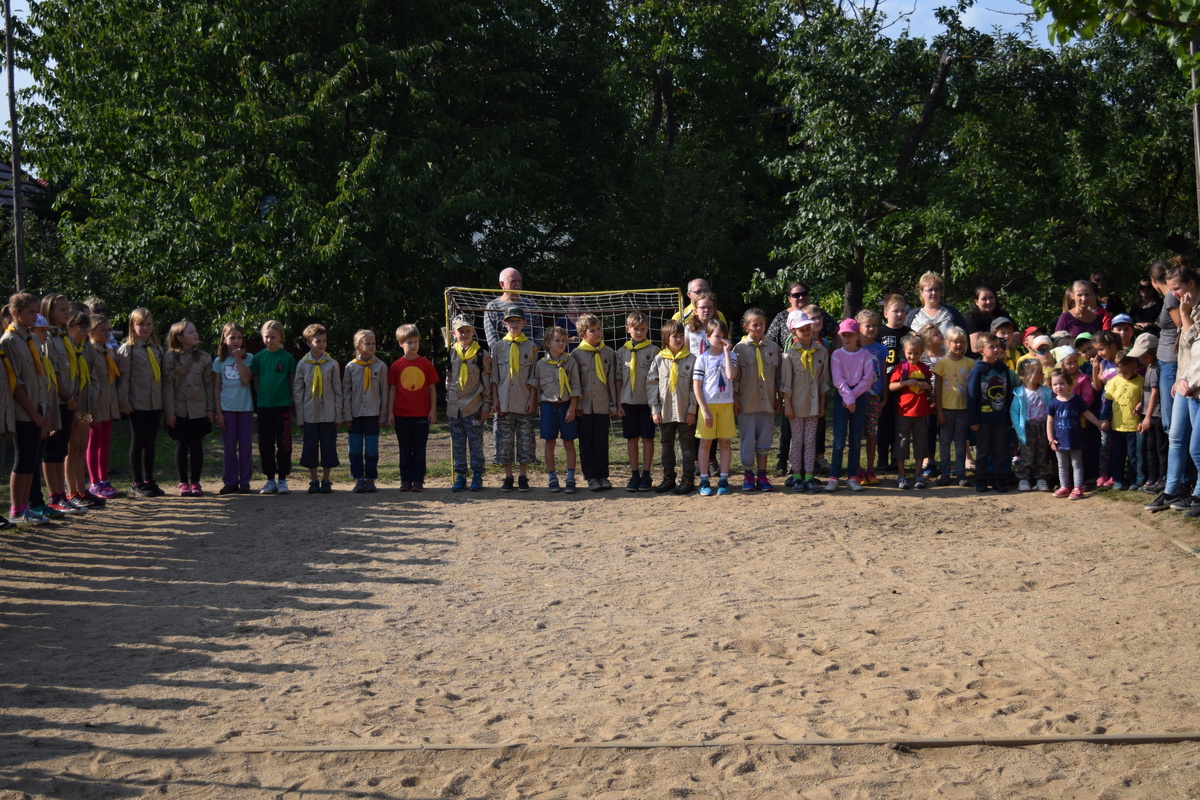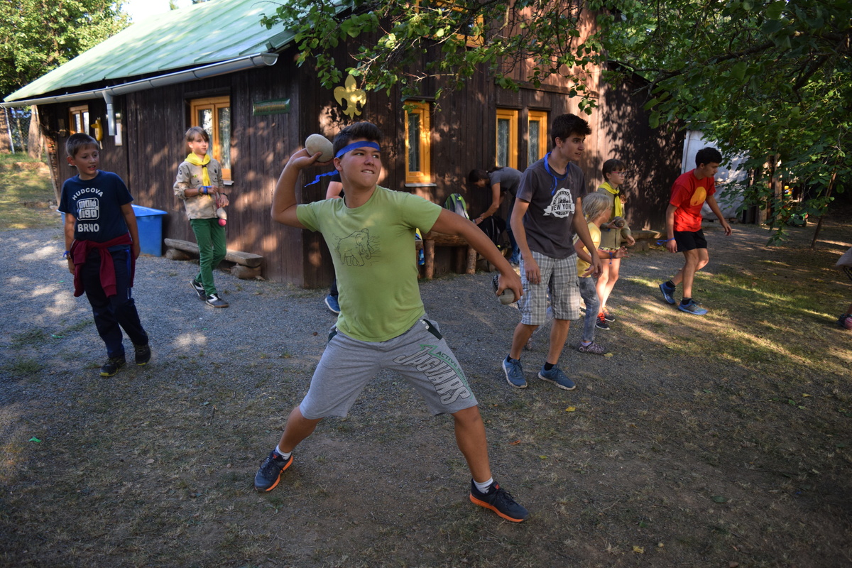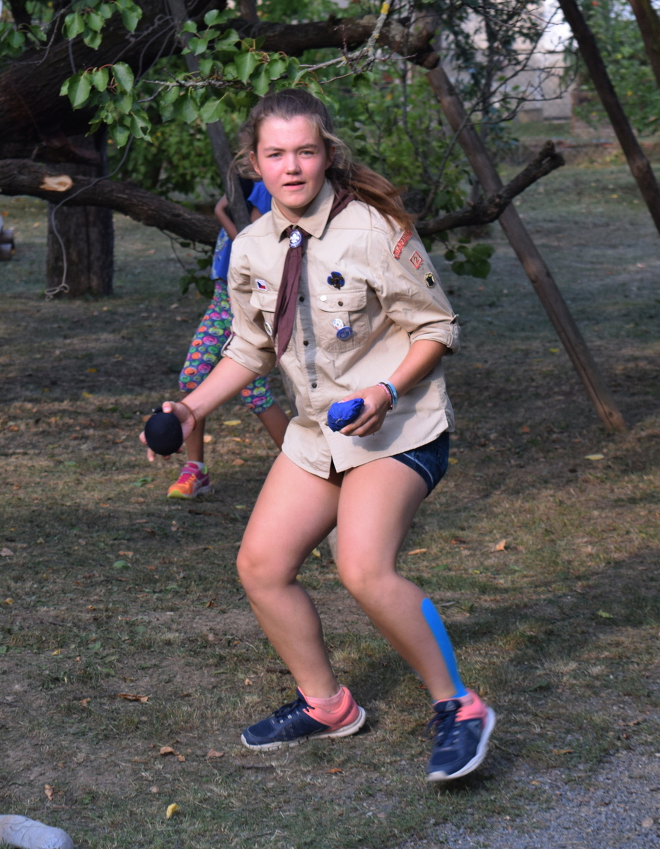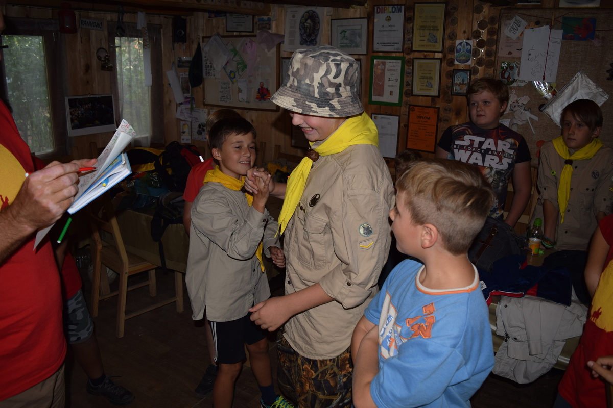„Činnost nebo uspořádaná akce pro veřejnost je dotována městem Šlapanice“. V pátek 8.9.2017 od 16:00 proběhla tradiční zahajovací schůzka, kterou vždy započíná náš oddíl podzimní činnost. Účast byla naprosto nečekaná, počítejte se mnou: 17 vedoucích, 16 Svišťů, 15 Veverek, 14 Vlků, 13 Kudlanek, 11 Tygrů, 10 Draků, 9 Pum, 8 Sršňů a 6 členů nové družinky, která ještě nemá název. Celkem 119 lidiček a to nepočítám přihlížející rodiče čerstvých nováčků :-). Započali jsme jako obvykle nástupem, vlajku vztyčil Corado. Poté se slova ujali Brácha s Petrem a jali se organizovat oblíbenou "Seznamovačku. Skvělá hra, jen lidí je nějak moc. Být jich tak polovina, asi by si to všichni dost užili. Jakmile zakončí Petr poslední kolo, zjednávám klid a oznamuji, kde bude mít kdo družinovou schůzku. Svišti uhánějí spolu s Fí a Mony k pink-pongovému stolu, Pumy se sunou do Nové Boudy, nováčci spolu s Kloubem, Roxym a Kosťou do Boudy Staré, Kudlanky jdou do Trojky, Veverky na "Koulí hexagon" u sprchy, Tygři tradičně ke kuželkám, Vlci zůstávají u ohniště, Draci letí k pískovišti, Sršni zůstávají na špalcích ... no ještě že tady na základně máme těch míst k setkání dost :-). Jak tak postupně krátké družinové schůzky končí, jde vždy trojice družinek do Trojky shlédnout Kašův trailer z letošního tábora a hned poté členové zamíří k jednomu z generálů: Kloub šikuje svoji zelenou armádu vedle Nové Boudy, Kosťa řadí svoje modré na hřišti. Každý fasuje tři hadrovky, starší seznamují ty mladší s pravidly a může se hrát. Rodičové po pár minutách vyklízejí pole, základnou se valí jeden útok za druhým. První kolo vítězí modří s velkou převahou, prorazili totiž pravé křídlo soupeřů a vzali je do kleští. Výměna stran, druhé kolo. Situace se opakuje, jen v opačném gardu. Hezké bylo, jak si Bengi zahrál asi jednu vteřinu (tolik času od úvodního hvizdu uplynulo, než dostal zásah) a smějící se Brácha ho překonal asi tak o další vteřinu, než to koupil pro změnu on. Nerozhodně, 1:1. Musí se hrát třetí kolo, V něm vítězí zelení a tak Babů dává 2 lentilky coby odměnu jim, poraženým pak po jedné. Sbíráme koule, generálové je uklízejí a už se u ohniště šikují dvě dvojice zkušených dražitelů. Co se bude dražit? No přece zapomenuté věci z tábora a z předtáborových schůzek. Jsou toho dvě velké bedny. I přes značnou snahu se daří rozdat jen snad čtvrtinu věcí. Co se zbytkem? No uvidíme... A protože se čas nachýlil, zakončuji schůzku, členstvo se loučí a pomalu rozchází ke svým domovům. Vedoucí ještě uklízejí a kolem půl sedmé je už na základně opět klid a mír. Ne na dlouho. Hukan něco po sedmé naváží plot, tyče, dráty a cement, protože celý víkend budeme sundávat starý a osazovat nový plot. A nejen to! Starou nehezkou bránu nahradí krásná nová, na zakázku dělaná. Tak nám držte palce, ať všechno klapne. Jura