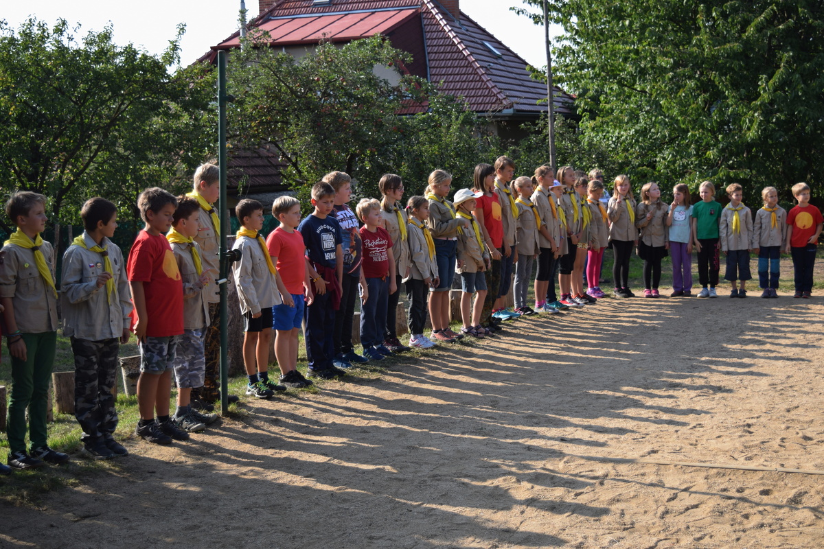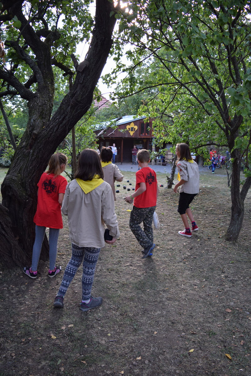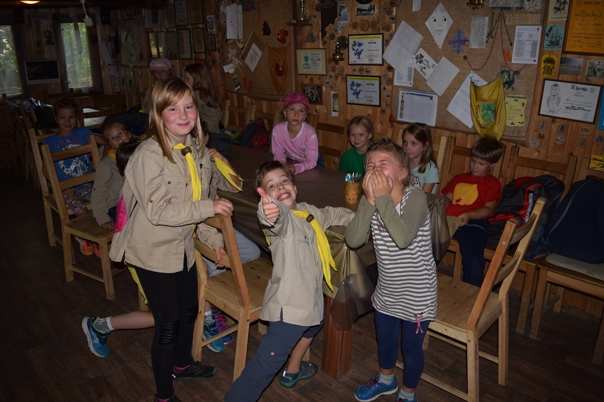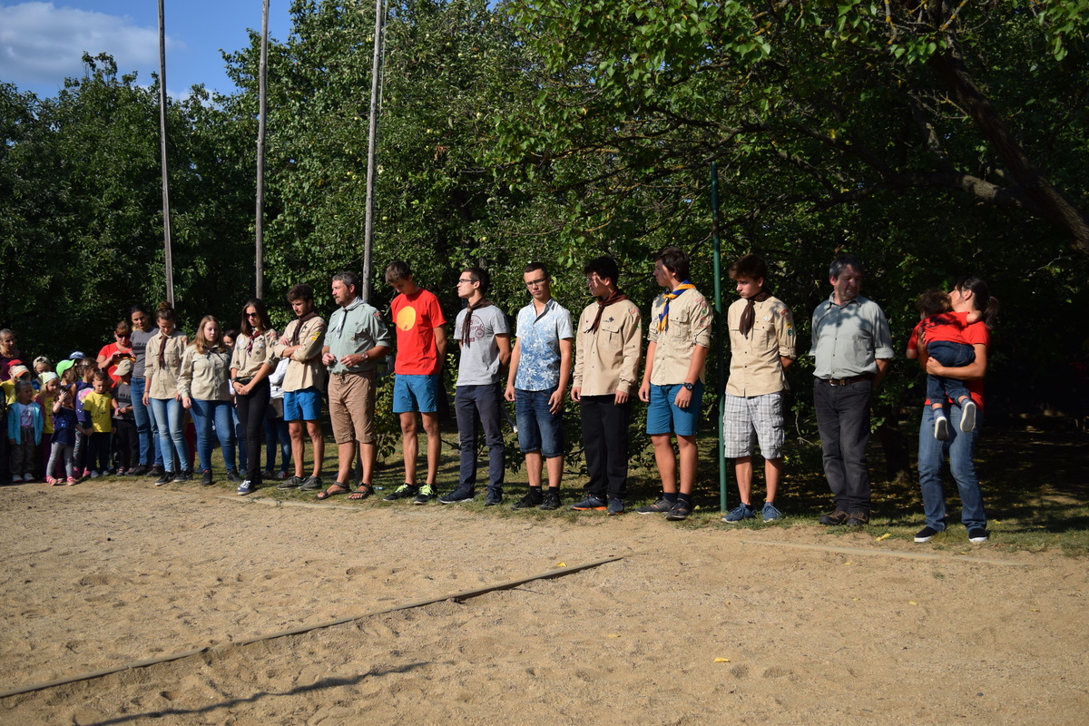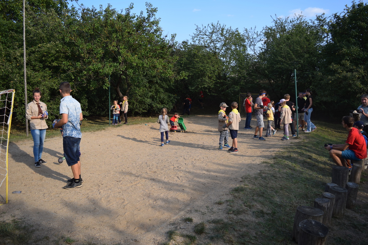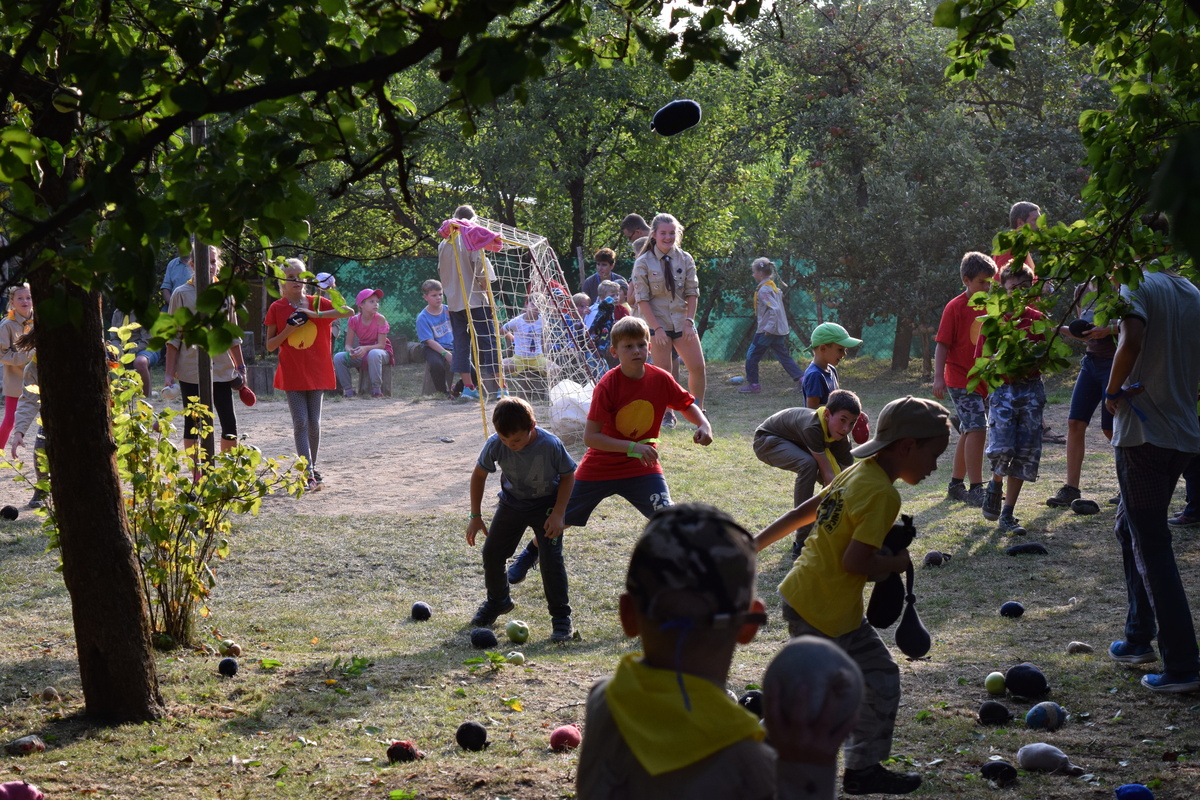 „Činnost nebo uspořádaná akce pro veřejnost je dotována městem Šlapanice“. V pátek 8.9.2017 od 16:00 proběhla tradiční zahajovací schůzka, kterou vždy započíná náš oddíl podzimní činnost. Účast byla naprosto nečekaná, počítejte se mnou: 17 vedoucích, 16 Svišťů, 15 Veverek, 14 Vlků, 13 Kudlanek, 11 Tygrů, 10 Draků, 9 Pum, 8 Sršňů a 6 členů nové družinky, která ještě nemá název. Celkem 119 lidiček a to nepočítám přihlížející rodiče čerstvých nováčků :-). Započali jsme jako obvykle nástupem, vlajku vztyčil Corado. Poté se slova ujali Brácha s Petrem a jali se organizovat oblíbenou "Seznamovačku. Skvělá hra, jen lidí je nějak moc. Být jich tak polovina, asi by si to všichni dost užili. Jakmile zakončí Petr poslední kolo, zjednávám klid a oznamuji, kde bude mít kdo družinovou schůzku. Svišti uhánějí spolu s Fí a Mony k pink-pongovému stolu, Pumy se sunou do Nové Boudy, nováčci spolu s Kloubem, Roxym a Kosťou do Boudy Staré, Kudlanky jdou do Trojky, Veverky na "Koulí hexagon" u sprchy, Tygři tradičně ke kuželkám, Vlci zůstávají u ohniště, Draci letí k pískovišti, Sršni zůstávají na špalcích ... no ještě že tady na základně máme těch míst k setkání dost :-). Jak tak postupně krátké družinové schůzky končí, jde vždy trojice družinek do Trojky shlédnout Kašův trailer z letošního tábora a hned poté členové zamíří k jednomu z generálů: Kloub šikuje svoji zelenou armádu vedle Nové Boudy, Kosťa řadí svoje modré na hřišti. Každý fasuje tři hadrovky, starší seznamují ty mladší s pravidly a může se hrát. Rodičové po pár minutách vyklízejí pole, základnou se valí jeden útok za druhým. První kolo vítězí modří s velkou převahou, prorazili totiž pravé křídlo soupeřů a vzali je do kleští. Výměna stran, druhé kolo. Situace se opakuje, jen v opačném gardu. Hezké bylo, jak si Bengi zahrál asi jednu vteřinu (tolik času od úvodního hvizdu uplynulo, než dostal zásah) a smějící se Brácha ho překonal asi tak o další vteřinu, než to koupil pro změnu on. Nerozhodně, 1:1. Musí se hrát třetí kolo, V něm vítězí zelení a tak Babů dává 2 lentilky coby odměnu jim, poraženým pak po jedné. Sbíráme koule, generálové je uklízejí a už se u ohniště šikují dvě dvojice zkušených dražitelů. Co se bude dražit? No přece zapomenuté věci z tábora a z předtáborových schůzek. Jsou toho dvě velké bedny. I přes značnou snahu se daří rozdat jen snad čtvrtinu věcí. Co se zbytkem? No uvidíme... A protože se čas nachýlil, zakončuji schůzku, členstvo se loučí a pomalu rozchází ke svým domovům. Vedoucí ještě uklízejí a kolem půl sedmé je už na základně opět klid a mír. Ne na dlouho. Hukan něco po sedmé naváží plot, tyče, dráty a cement, protože celý víkend budeme sundávat starý a osazovat nový plot. A nejen to! Starou nehezkou bránu nahradí krásná nová, na zakázku dělaná. Tak nám držte palce, ať všechno klapne. Jura