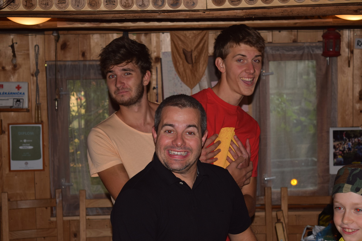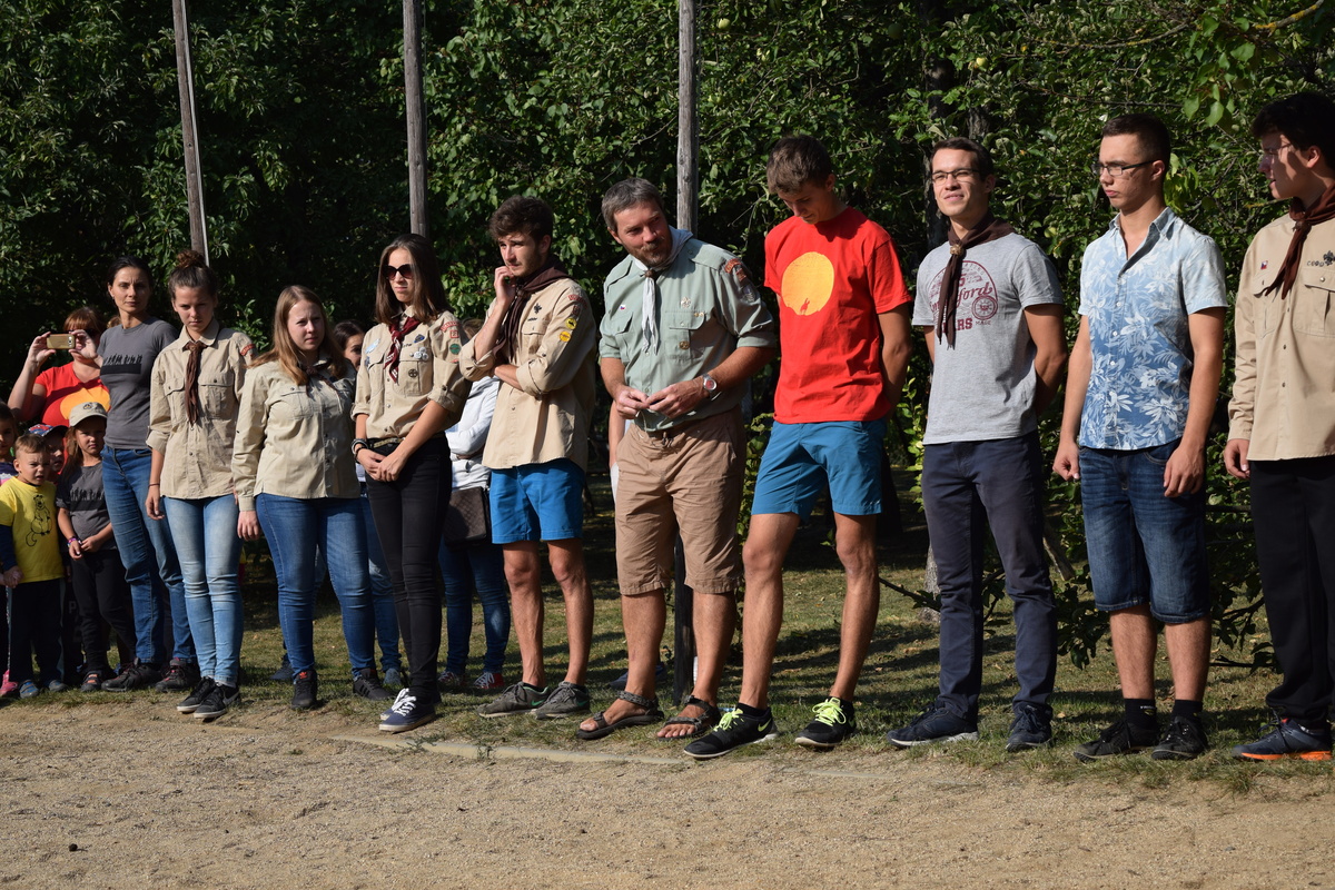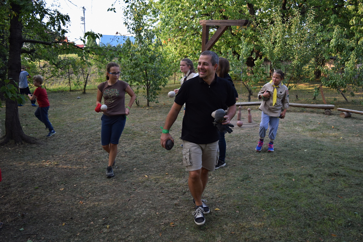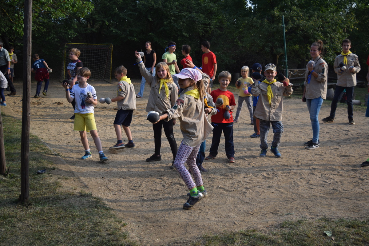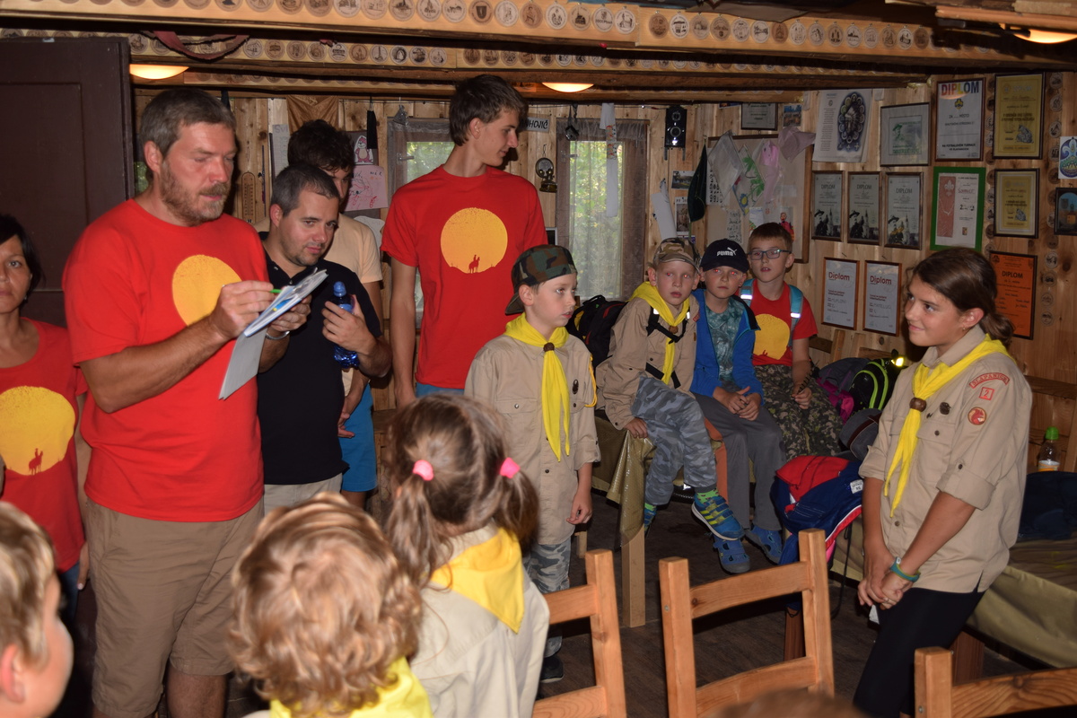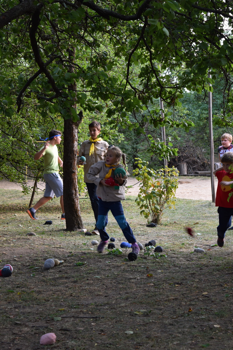 „Činnost nebo uspořádaná akce pro veřejnost je dotována městem Šlapanice“. V pátek 8.9.2017 od 16:00 proběhla tradiční zahajovací schůzka, kterou vždy započíná náš oddíl podzimní činnost. Účast byla naprosto nečekaná, počítejte se mnou: 17 vedoucích, 16 Svišťů, 15 Veverek, 14 Vlků, 13 Kudlanek, 11 Tygrů, 10 Draků, 9 Pum, 8 Sršňů a 6 členů nové družinky, která ještě nemá název. Celkem 119 lidiček a to nepočítám přihlížející rodiče čerstvých nováčků :-). Započali jsme jako obvykle nástupem, vlajku vztyčil Corado. Poté se slova ujali Brácha s Petrem a jali se organizovat oblíbenou "Seznamovačku. Skvělá hra, jen lidí je nějak moc. Být jich tak polovina, asi by si to všichni dost užili. Jakmile zakončí Petr poslední kolo, zjednávám klid a oznamuji, kde bude mít kdo družinovou schůzku. Svišti uhánějí spolu s Fí a Mony k pink-pongovému stolu, Pumy se sunou do Nové Boudy, nováčci spolu s Kloubem, Roxym a Kosťou do Boudy Staré, Kudlanky jdou do Trojky, Veverky na "Koulí hexagon" u sprchy, Tygři tradičně ke kuželkám, Vlci zůstávají u ohniště, Draci letí k pískovišti, Sršni zůstávají na špalcích ... no ještě že tady na základně máme těch míst k setkání dost :-). Jak tak postupně krátké družinové schůzky končí, jde vždy trojice družinek do Trojky shlédnout Kašův trailer z letošního tábora a hned poté členové zamíří k jednomu z generálů: Kloub šikuje svoji zelenou armádu vedle Nové Boudy, Kosťa řadí svoje modré na hřišti. Každý fasuje tři hadrovky, starší seznamují ty mladší s pravidly a může se hrát. Rodičové po pár minutách vyklízejí pole, základnou se valí jeden útok za druhým. První kolo vítězí modří s velkou převahou, prorazili totiž pravé křídlo soupeřů a vzali je do kleští. Výměna stran, druhé kolo. Situace se opakuje, jen v opačném gardu. Hezké bylo, jak si Bengi zahrál asi jednu vteřinu (tolik času od úvodního hvizdu uplynulo, než dostal zásah) a smějící se Brácha ho překonal asi tak o další vteřinu, než to koupil pro změnu on. Nerozhodně, 1:1. Musí se hrát třetí kolo, V něm vítězí zelení a tak Babů dává 2 lentilky coby odměnu jim, poraženým pak po jedné. Sbíráme koule, generálové je uklízejí a už se u ohniště šikují dvě dvojice zkušených dražitelů. Co se bude dražit? No přece zapomenuté věci z tábora a z předtáborových schůzek. Jsou toho dvě velké bedny. I přes značnou snahu se daří rozdat jen snad čtvrtinu věcí. Co se zbytkem? No uvidíme... A protože se čas nachýlil, zakončuji schůzku, členstvo se loučí a pomalu rozchází ke svým domovům. Vedoucí ještě uklízejí a kolem půl sedmé je už na základně opět klid a mír. Ne na dlouho. Hukan něco po sedmé naváží plot, tyče, dráty a cement, protože celý víkend budeme sundávat starý a osazovat nový plot. A nejen to! Starou nehezkou bránu nahradí krásná nová, na zakázku dělaná. Tak nám držte palce, ať všechno klapne. Jura