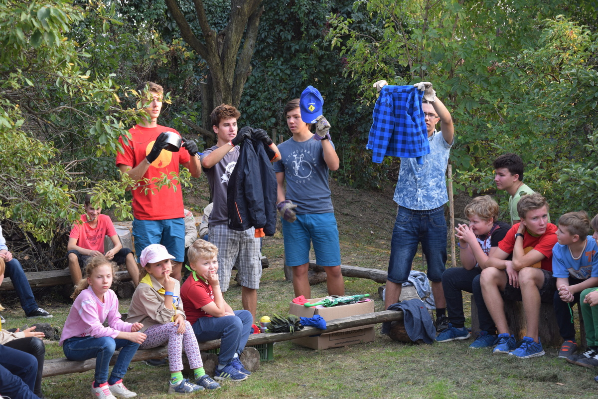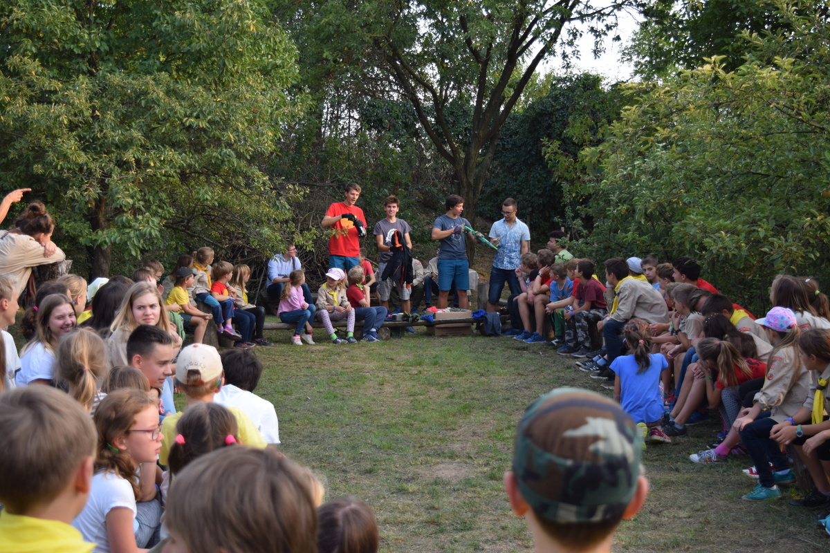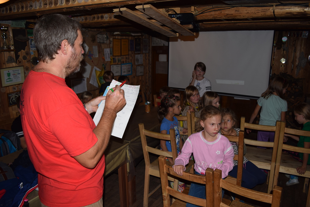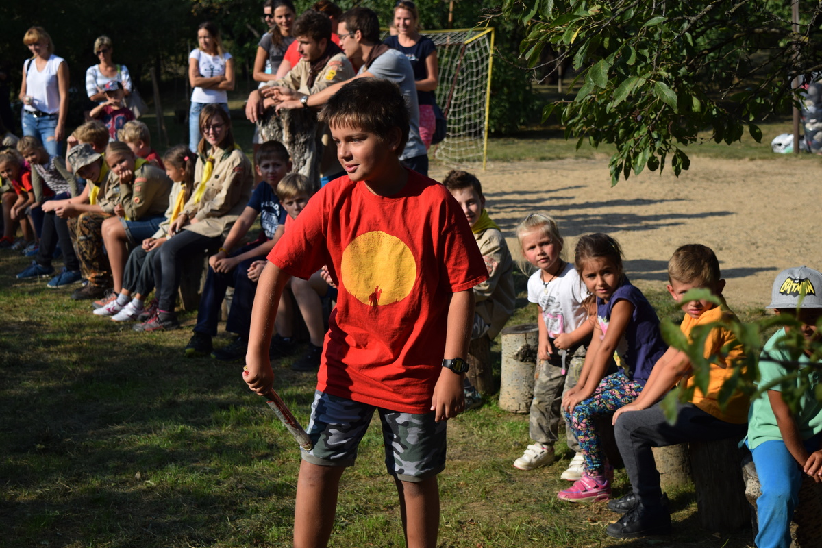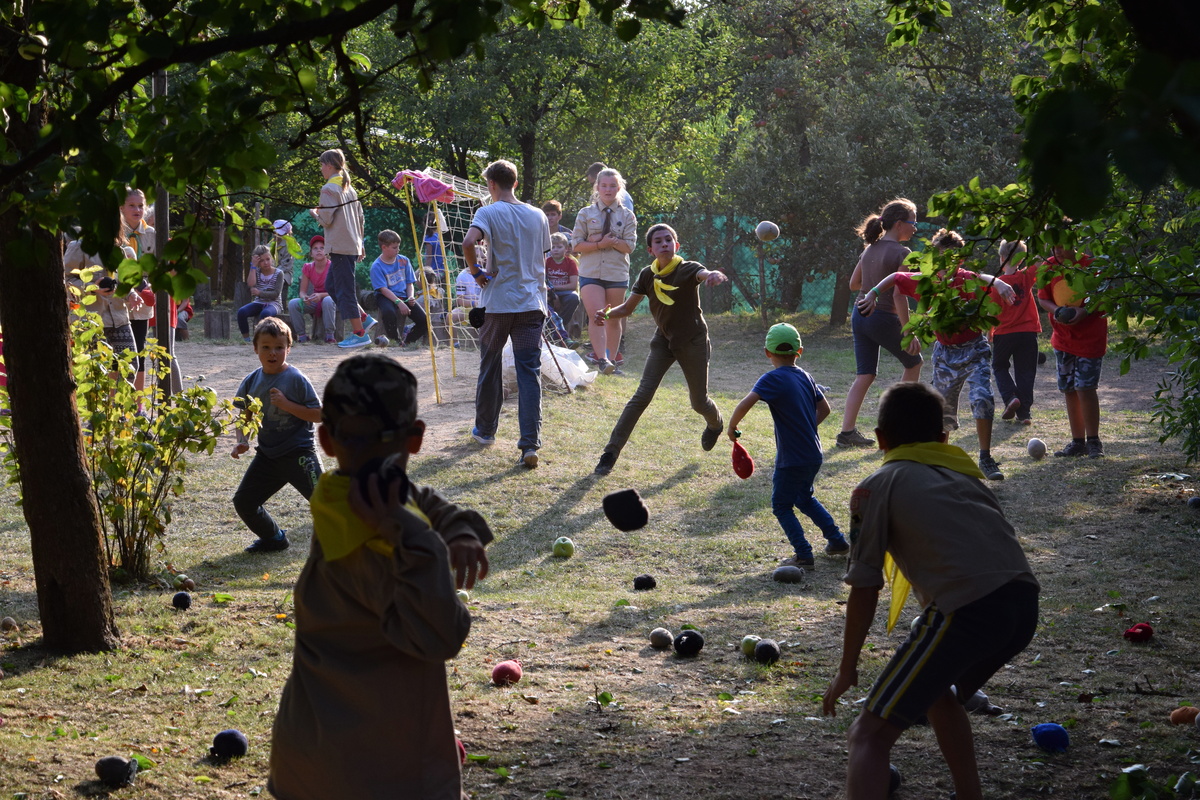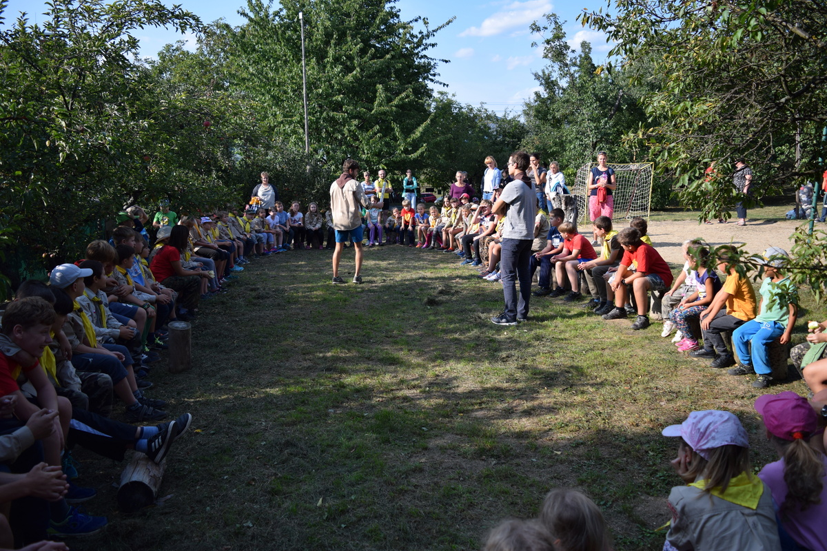 „Činnost nebo uspořádaná akce pro veřejnost je dotována městem Šlapanice“. V pátek 8.9.2017 od 16:00 proběhla tradiční zahajovací schůzka, kterou vždy započíná náš oddíl podzimní činnost. Účast byla naprosto nečekaná, počítejte se mnou: 17 vedoucích, 16 Svišťů, 15 Veverek, 14 Vlků, 13 Kudlanek, 11 Tygrů, 10 Draků, 9 Pum, 8 Sršňů a 6 členů nové družinky, která ještě nemá název. Celkem 119 lidiček a to nepočítám přihlížející rodiče čerstvých nováčků :-). Započali jsme jako obvykle nástupem, vlajku vztyčil Corado. Poté se slova ujali Brácha s Petrem a jali se organizovat oblíbenou "Seznamovačku. Skvělá hra, jen lidí je nějak moc. Být jich tak polovina, asi by si to všichni dost užili. Jakmile zakončí Petr poslední kolo, zjednávám klid a oznamuji, kde bude mít kdo družinovou schůzku. Svišti uhánějí spolu s Fí a Mony k pink-pongovému stolu, Pumy se sunou do Nové Boudy, nováčci spolu s Kloubem, Roxym a Kosťou do Boudy Staré, Kudlanky jdou do Trojky, Veverky na "Koulí hexagon" u sprchy, Tygři tradičně ke kuželkám, Vlci zůstávají u ohniště, Draci letí k pískovišti, Sršni zůstávají na špalcích ... no ještě že tady na základně máme těch míst k setkání dost :-). Jak tak postupně krátké družinové schůzky končí, jde vždy trojice družinek do Trojky shlédnout Kašův trailer z letošního tábora a hned poté členové zamíří k jednomu z generálů: Kloub šikuje svoji zelenou armádu vedle Nové Boudy, Kosťa řadí svoje modré na hřišti. Každý fasuje tři hadrovky, starší seznamují ty mladší s pravidly a může se hrát. Rodičové po pár minutách vyklízejí pole, základnou se valí jeden útok za druhým. První kolo vítězí modří s velkou převahou, prorazili totiž pravé křídlo soupeřů a vzali je do kleští. Výměna stran, druhé kolo. Situace se opakuje, jen v opačném gardu. Hezké bylo, jak si Bengi zahrál asi jednu vteřinu (tolik času od úvodního hvizdu uplynulo, než dostal zásah) a smějící se Brácha ho překonal asi tak o další vteřinu, než to koupil pro změnu on. Nerozhodně, 1:1. Musí se hrát třetí kolo, V něm vítězí zelení a tak Babů dává 2 lentilky coby odměnu jim, poraženým pak po jedné. Sbíráme koule, generálové je uklízejí a už se u ohniště šikují dvě dvojice zkušených dražitelů. Co se bude dražit? No přece zapomenuté věci z tábora a z předtáborových schůzek. Jsou toho dvě velké bedny. I přes značnou snahu se daří rozdat jen snad čtvrtinu věcí. Co se zbytkem? No uvidíme... A protože se čas nachýlil, zakončuji schůzku, členstvo se loučí a pomalu rozchází ke svým domovům. Vedoucí ještě uklízejí a kolem půl sedmé je už na základně opět klid a mír. Ne na dlouho. Hukan něco po sedmé naváží plot, tyče, dráty a cement, protože celý víkend budeme sundávat starý a osazovat nový plot. A nejen to! Starou nehezkou bránu nahradí krásná nová, na zakázku dělaná. Tak nám držte palce, ať všechno klapne. Jura