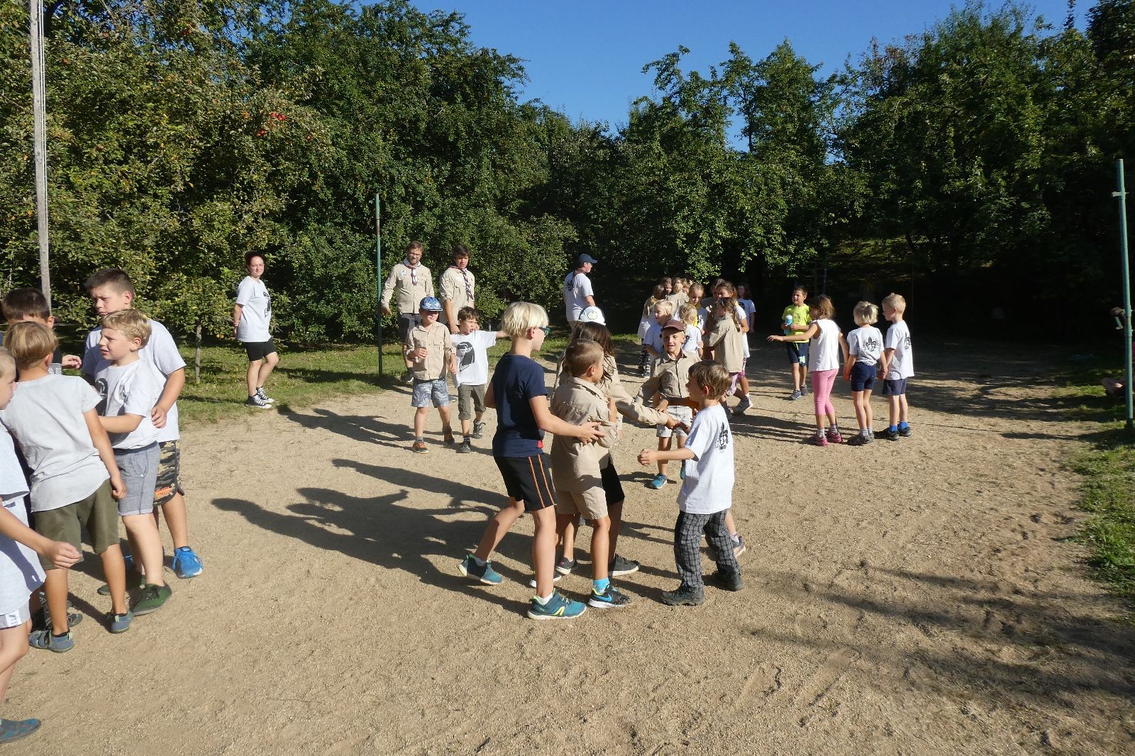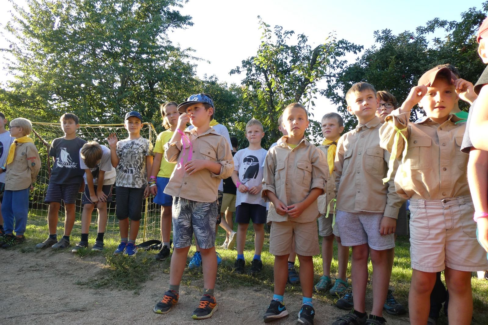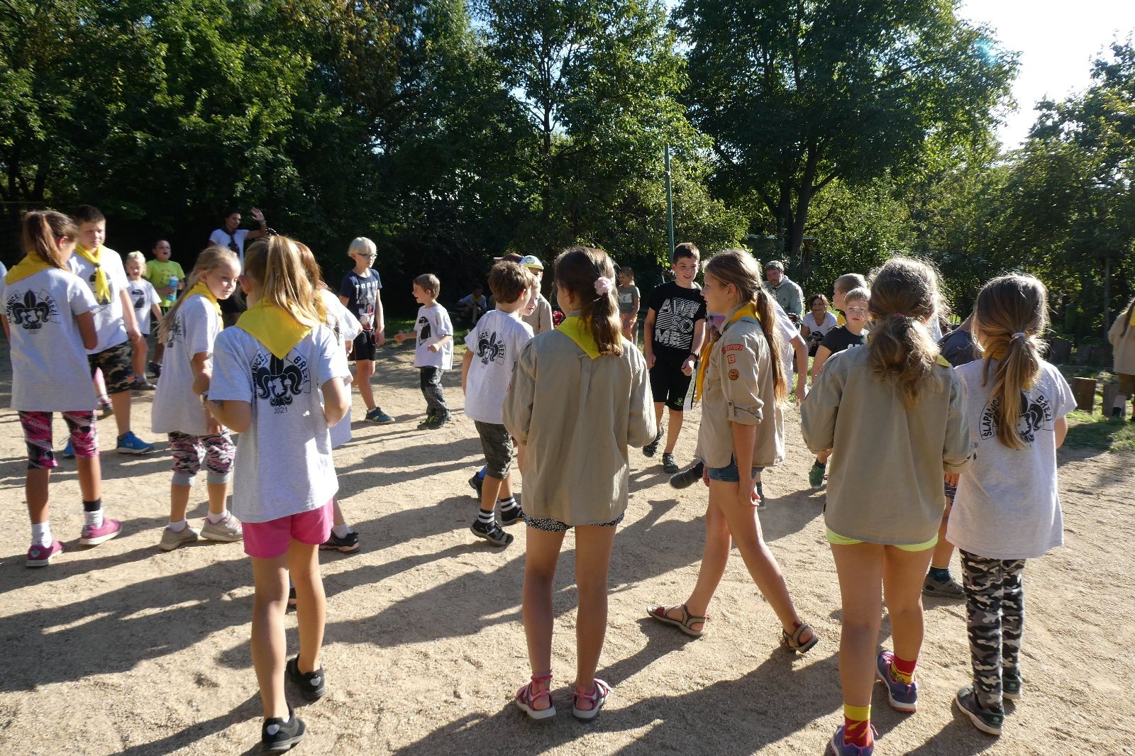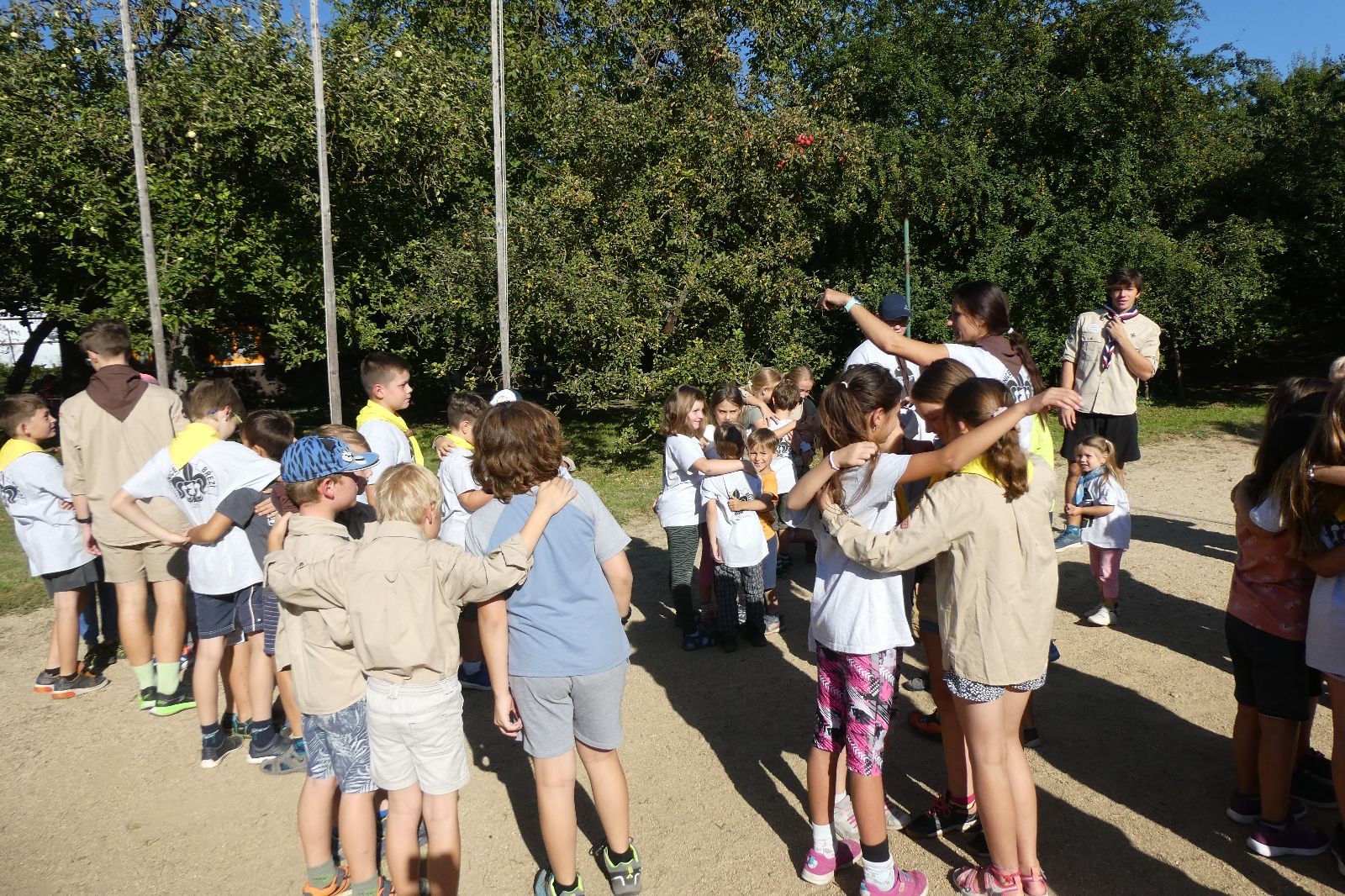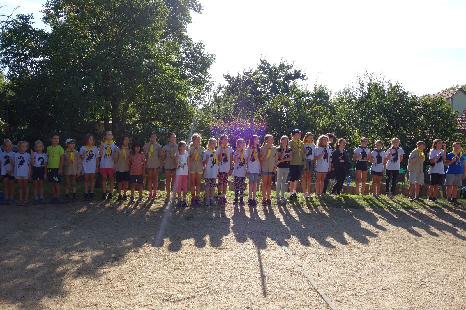 Po slavnostním nástupu v krojích nebo táborových tričkách a vyvěšení oddílové vlajky jsme se rozdělili na starší (Kudlanky, Sršni, Veverky, Vlci, Tygři) a mladší (Nováčci, Svišti, Tučňáci, Žraloci, Kobři, Sovičky), abychom si odděleně zahráli pár her na rozhýbání. Třeba molekuly 😊.