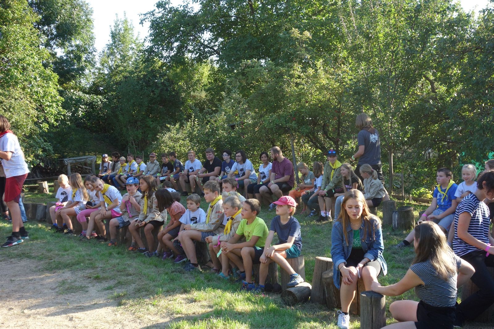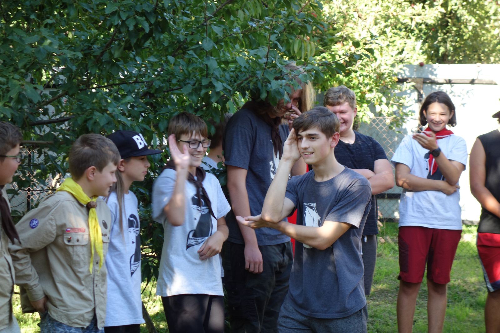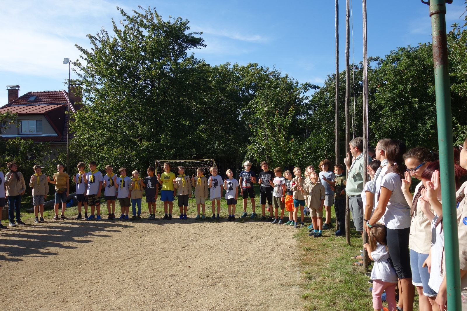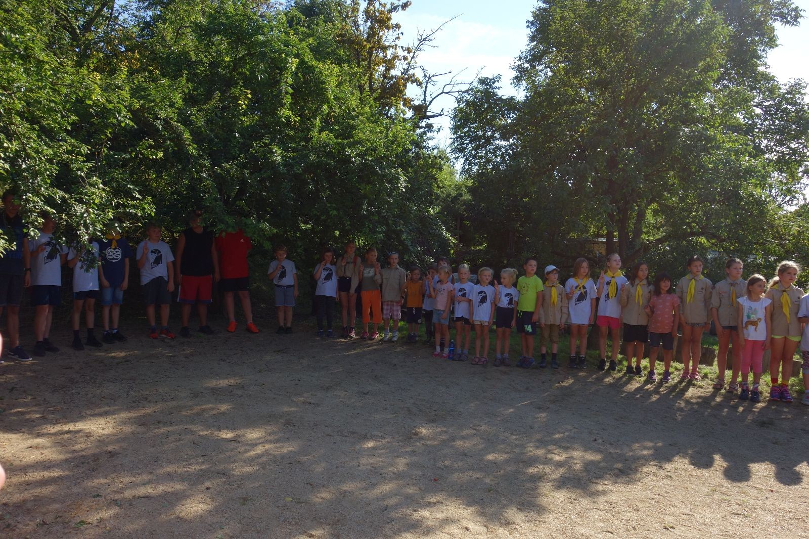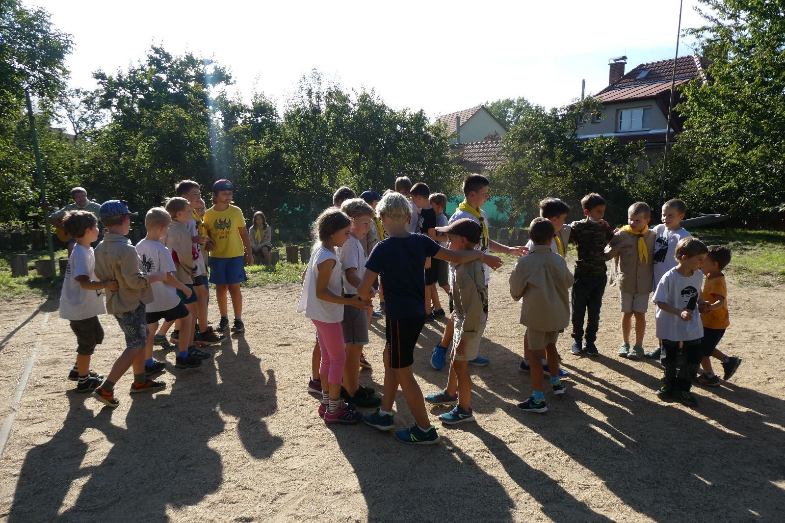 Po slavnostním nástupu v krojích nebo táborových tričkách a vyvěšení oddílové vlajky jsme se rozdělili na starší (Kudlanky, Sršni, Veverky, Vlci, Tygři) a mladší (Nováčci, Svišti, Tučňáci, Žraloci, Kobři, Sovičky), abychom si odděleně zahráli pár her na rozhýbání. Třeba molekuly 😊.