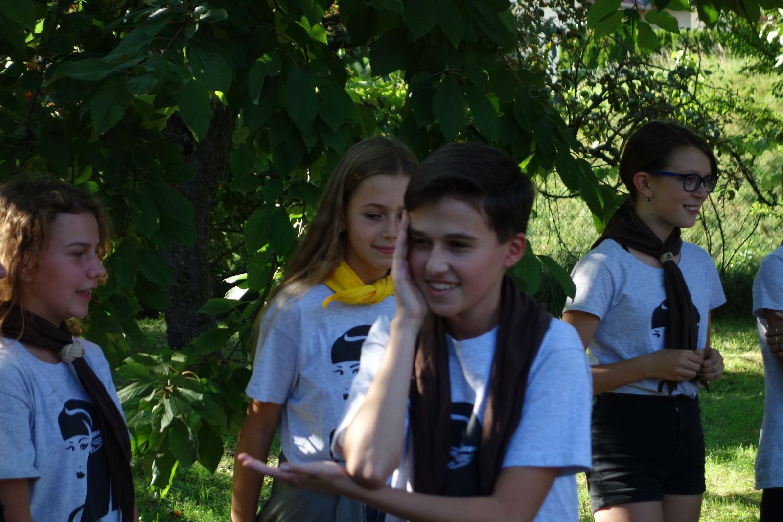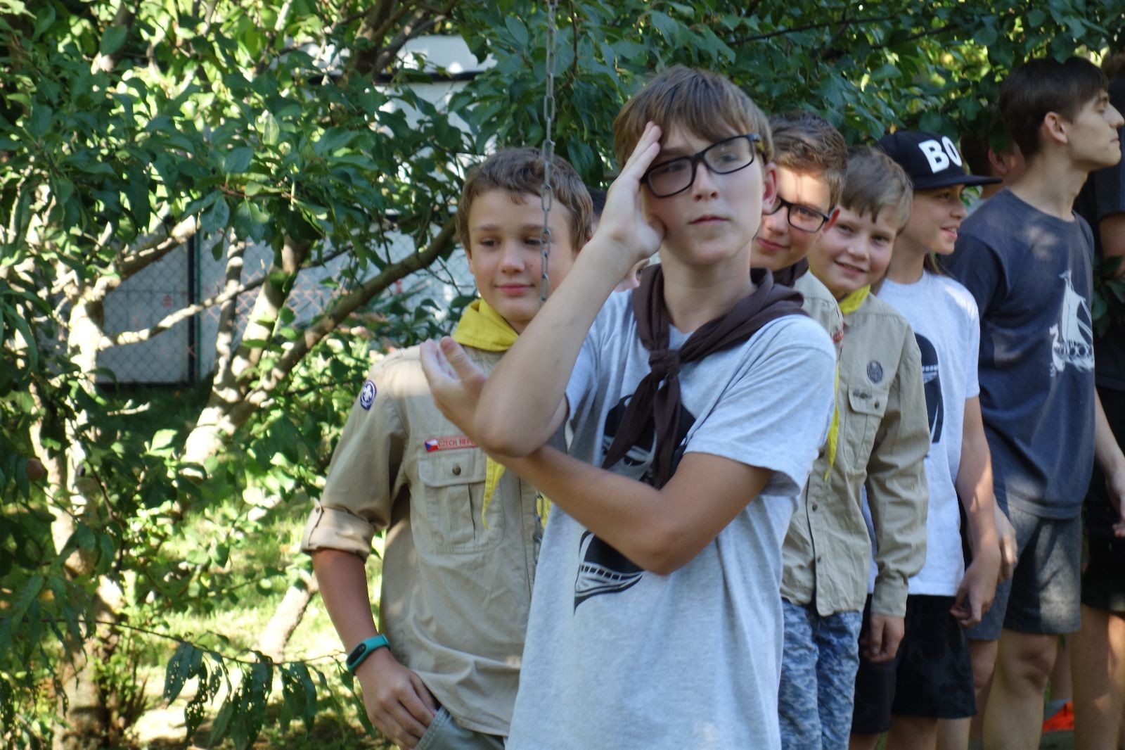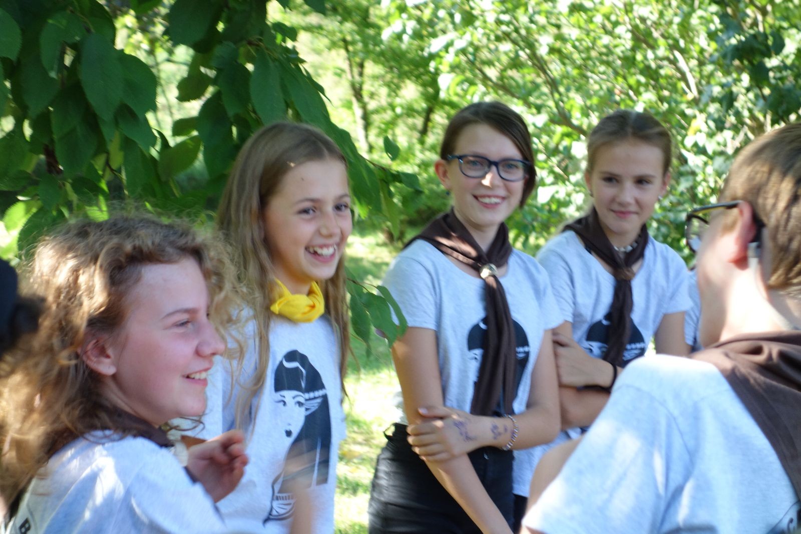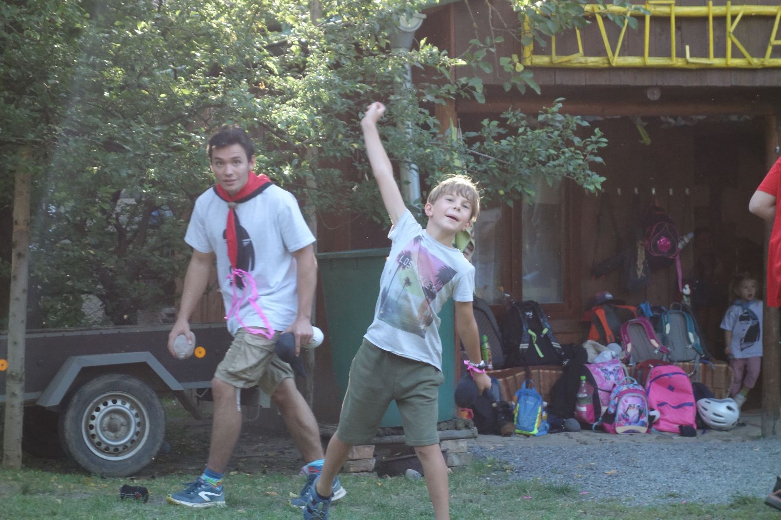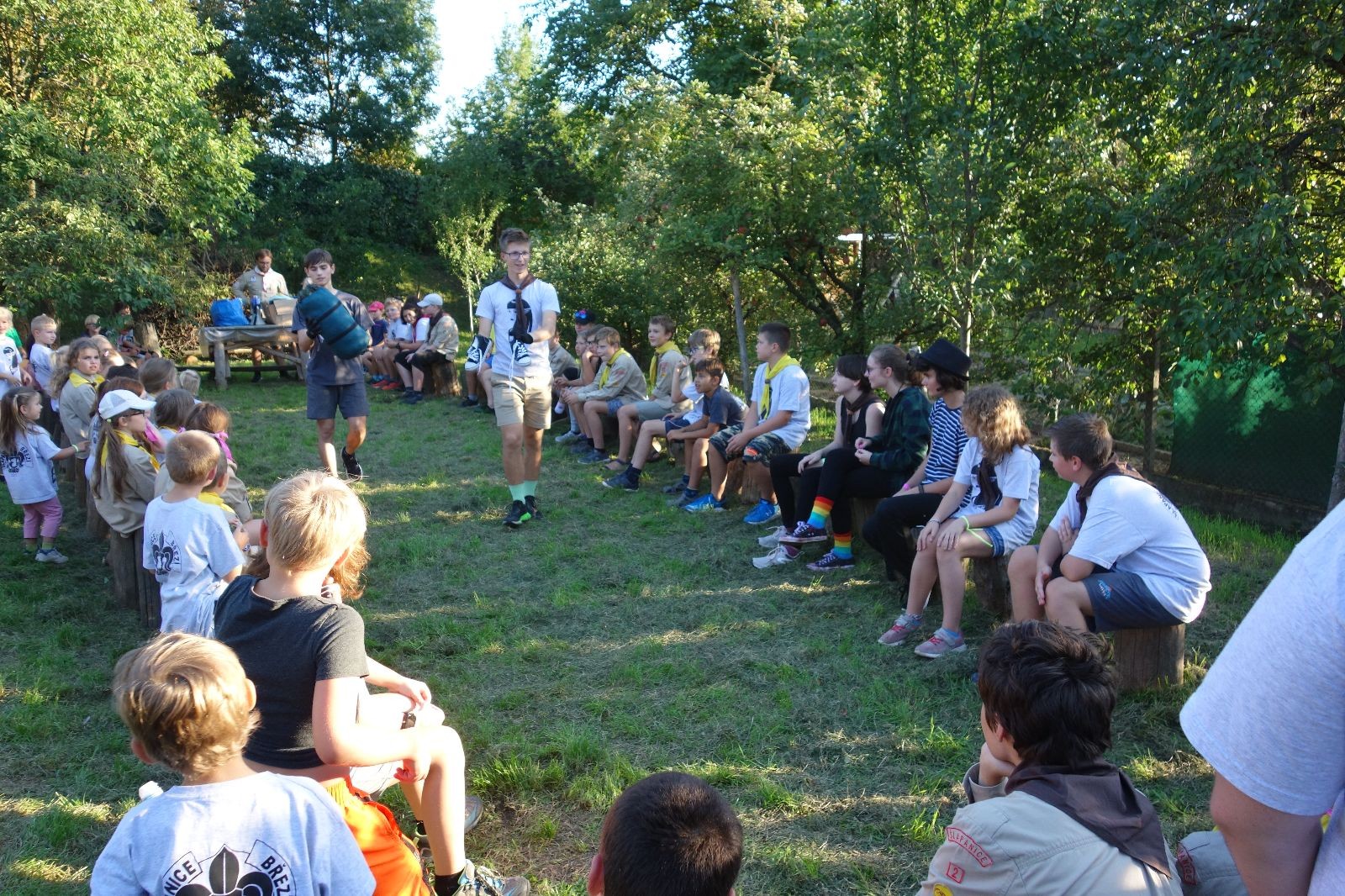 Po slavnostním nástupu v krojích nebo táborových tričkách a vyvěšení oddílové vlajky jsme se rozdělili na starší (Kudlanky, Sršni, Veverky, Vlci, Tygři) a mladší (Nováčci, Svišti, Tučňáci, Žraloci, Kobři, Sovičky), abychom si odděleně zahráli pár her na rozhýbání. Třeba molekuly 😊.