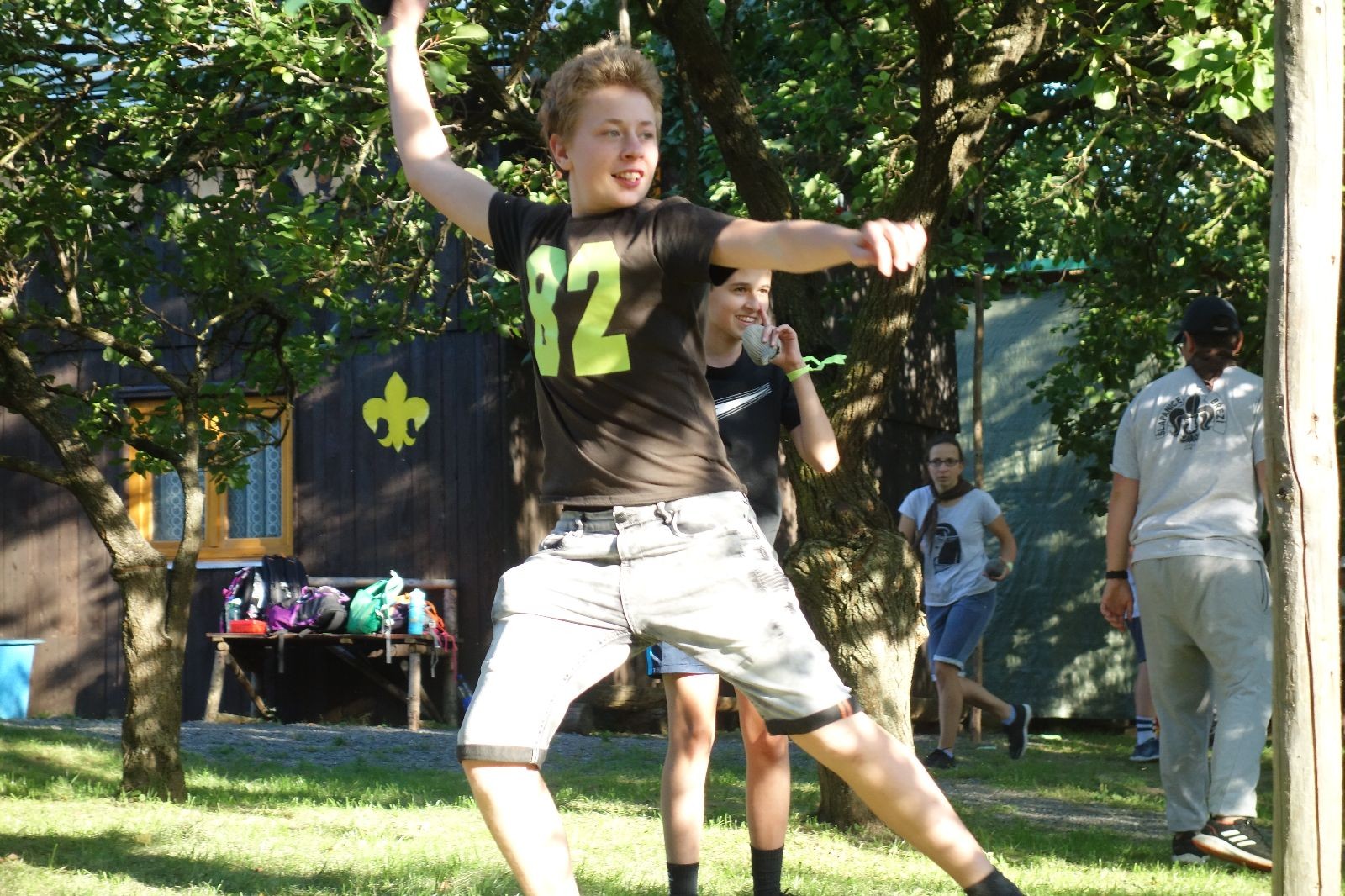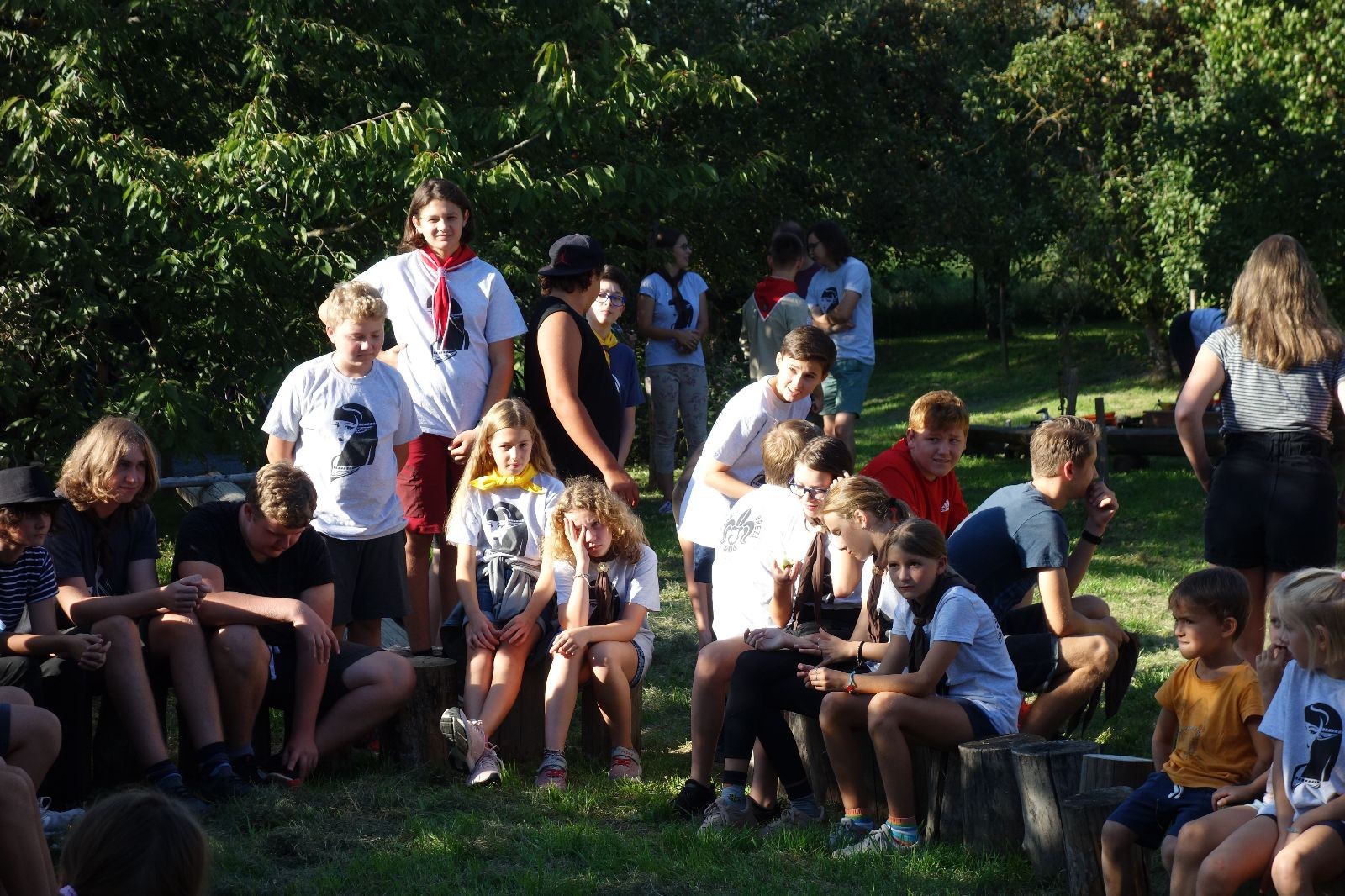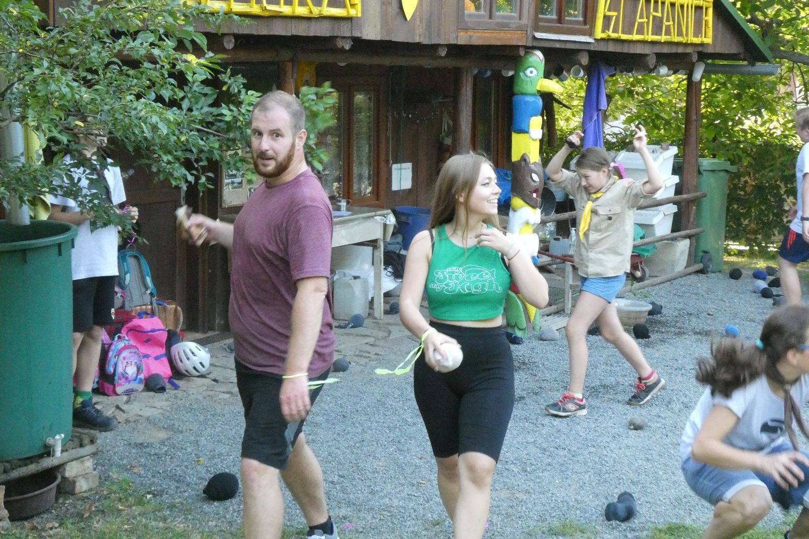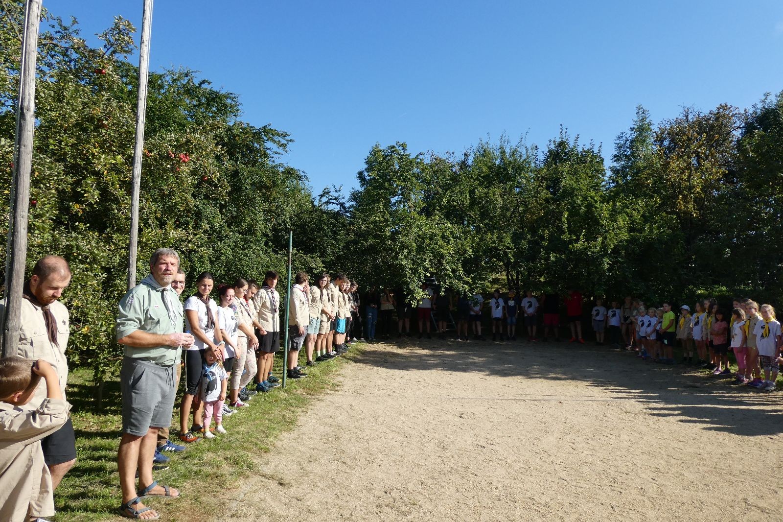 Po slavnostním nástupu v krojích nebo táborových tričkách a vyvěšení oddílové vlajky jsme se rozdělili na starší (Kudlanky, Sršni, Veverky, Vlci, Tygři) a mladší (Nováčci, Svišti, Tučňáci, Žraloci, Kobři, Sovičky), abychom si odděleně zahráli pár her na rozhýbání. Třeba molekuly 😊.