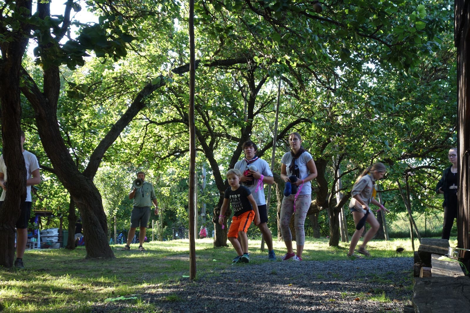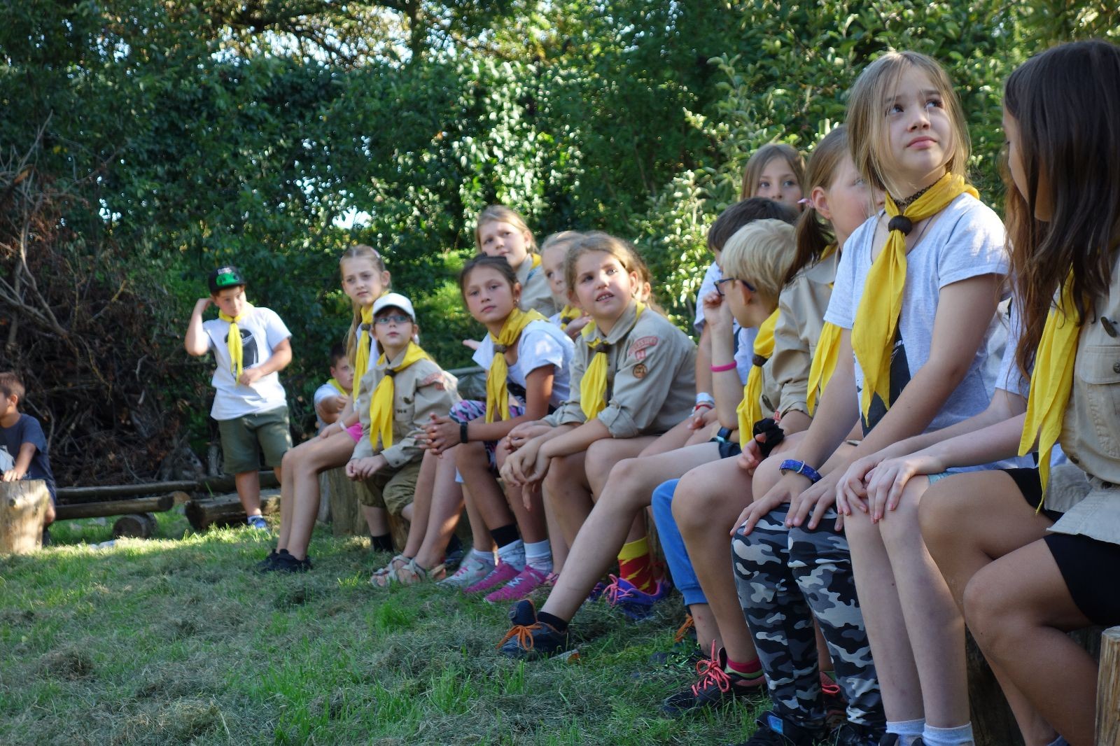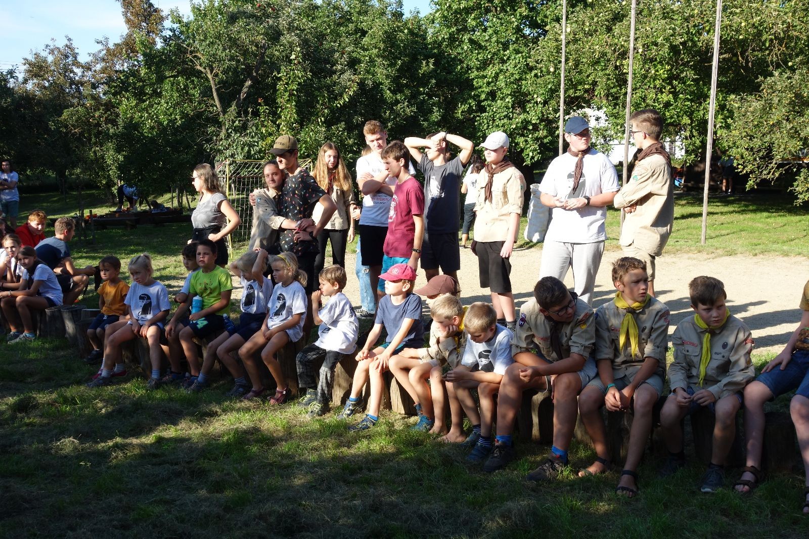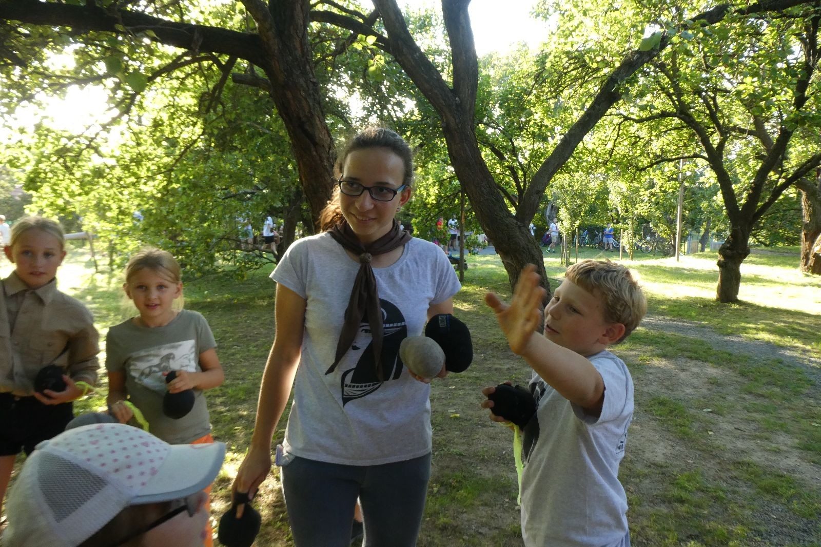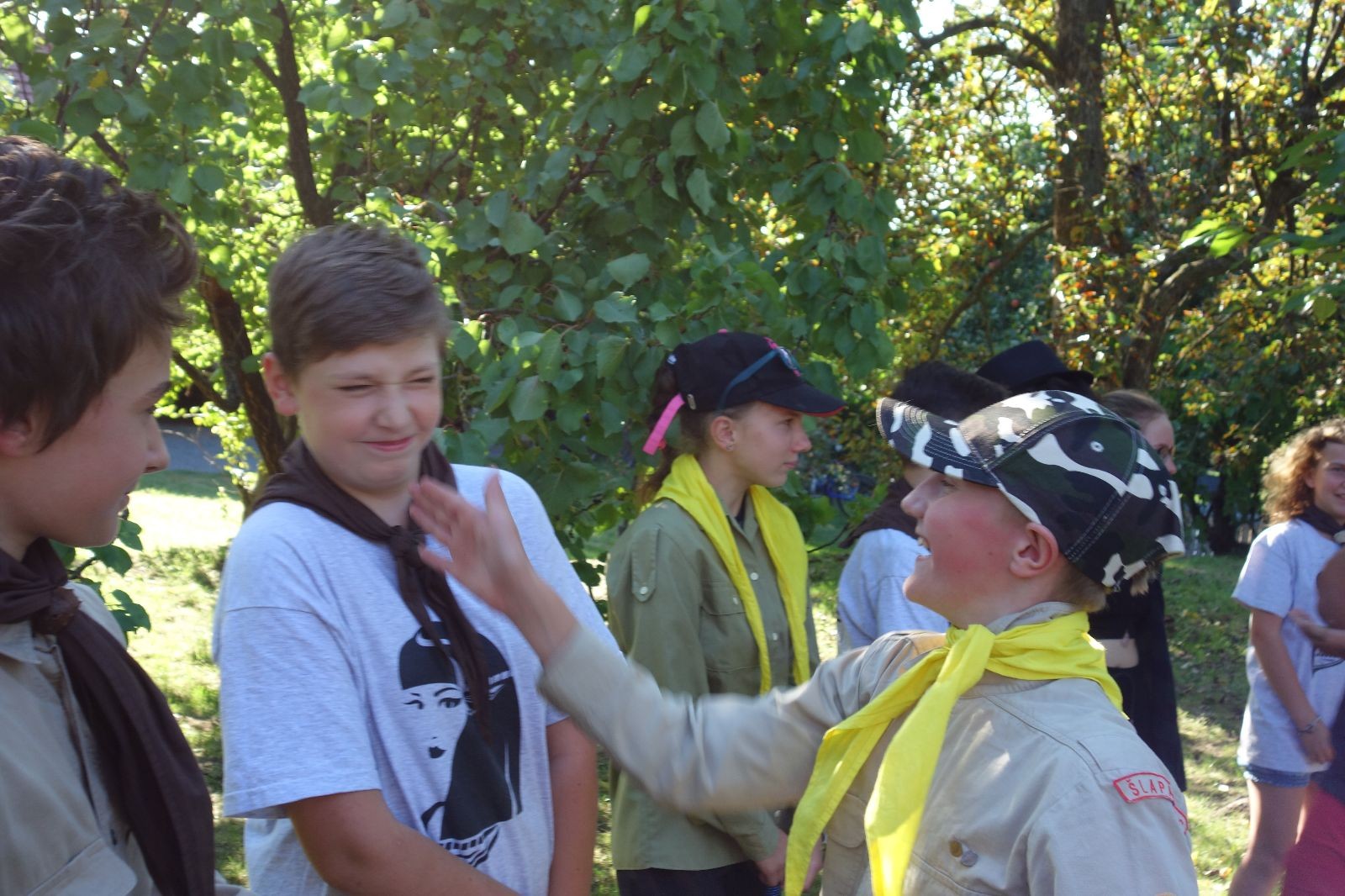 Po slavnostním nástupu v krojích nebo táborových tričkách a vyvěšení oddílové vlajky jsme se rozdělili na starší (Kudlanky, Sršni, Veverky, Vlci, Tygři) a mladší (Nováčci, Svišti, Tučňáci, Žraloci, Kobři, Sovičky), abychom si odděleně zahráli pár her na rozhýbání. Třeba molekuly 😊.