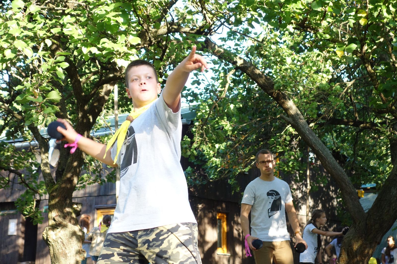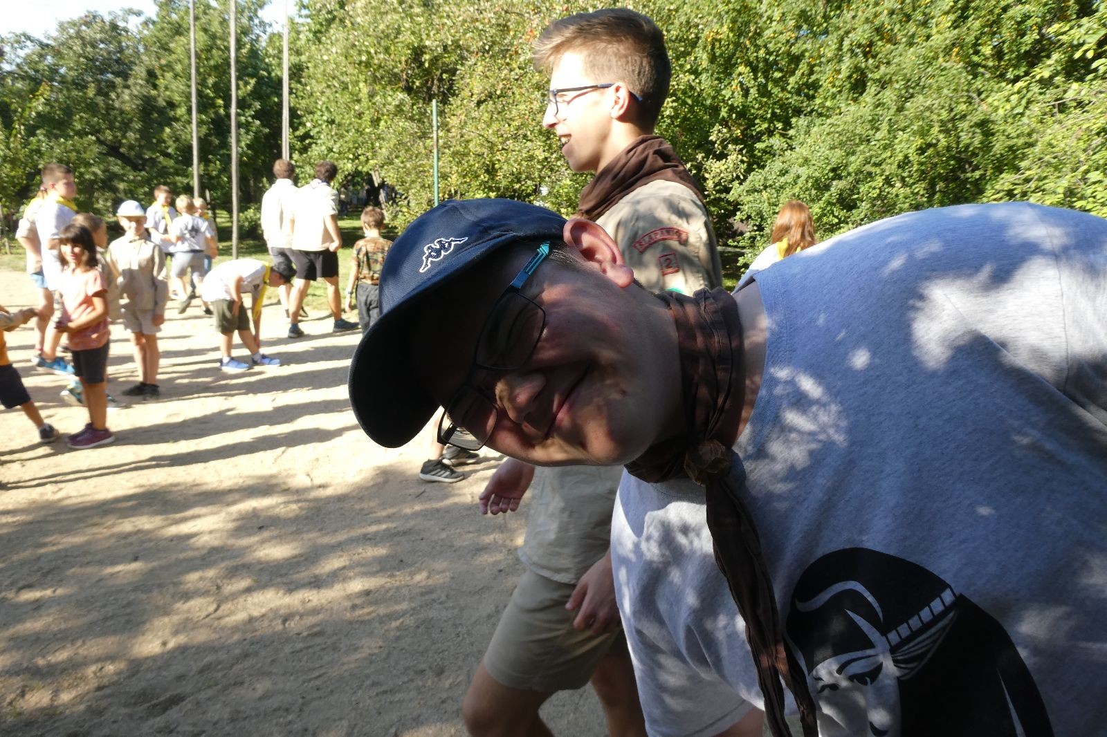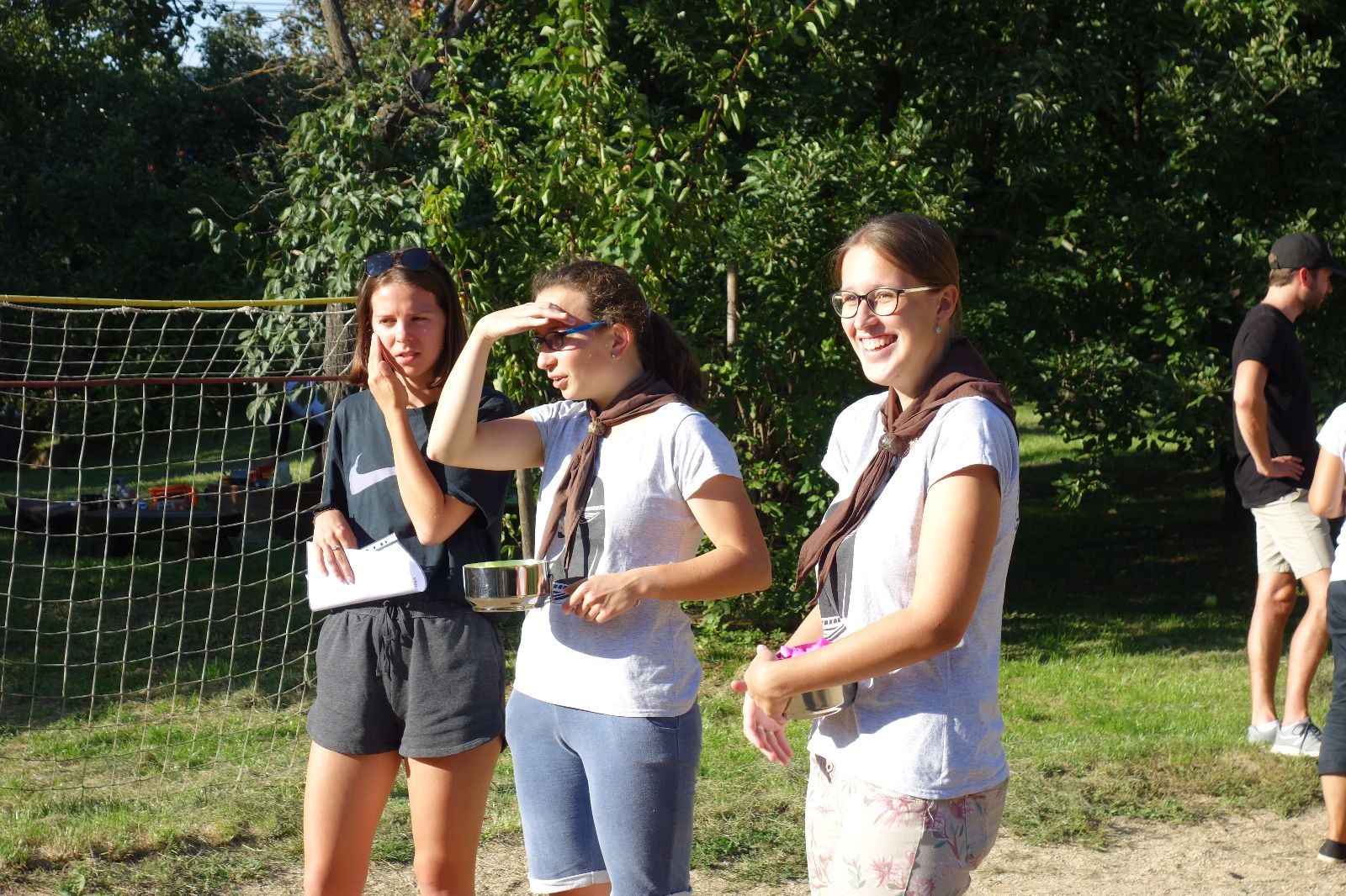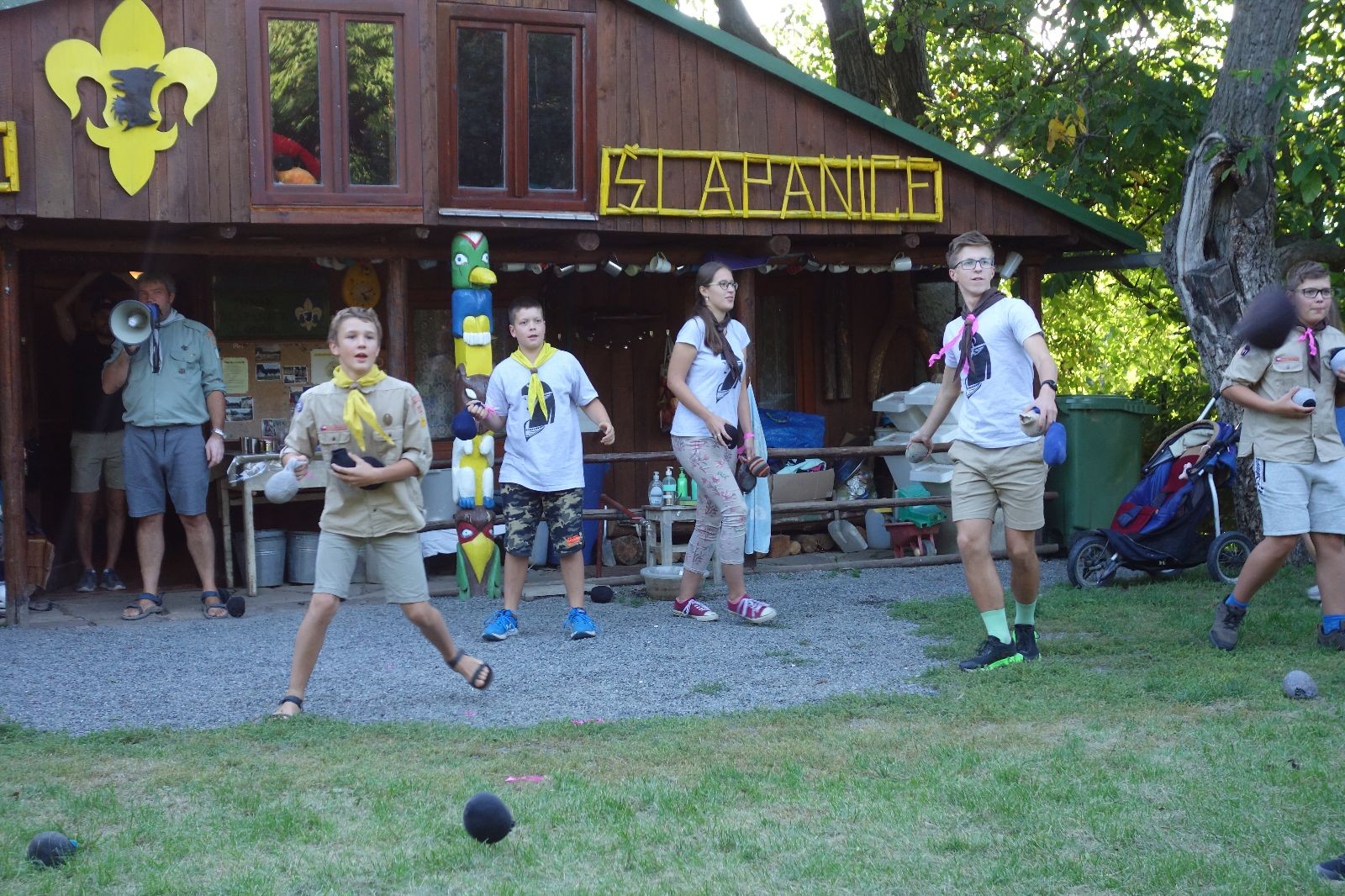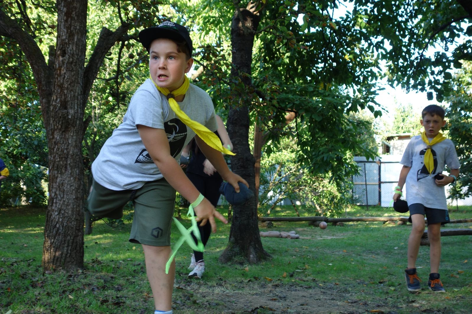 Po slavnostním nástupu v krojích nebo táborových tričkách a vyvěšení oddílové vlajky jsme se rozdělili na starší (Kudlanky, Sršni, Veverky, Vlci, Tygři) a mladší (Nováčci, Svišti, Tučňáci, Žraloci, Kobři, Sovičky), abychom si odděleně zahráli pár her na rozhýbání. Třeba molekuly 😊.