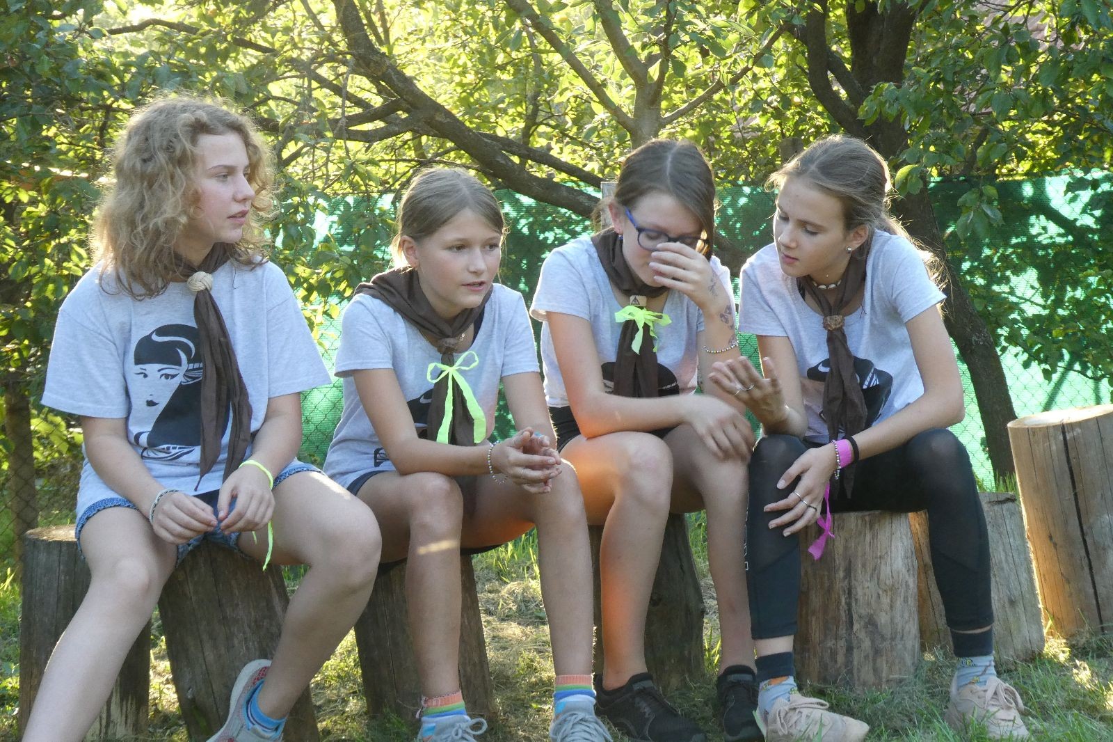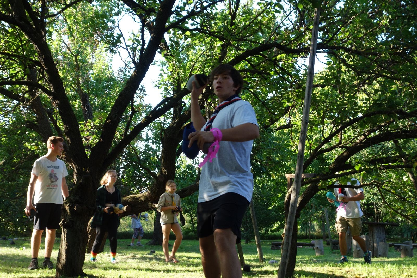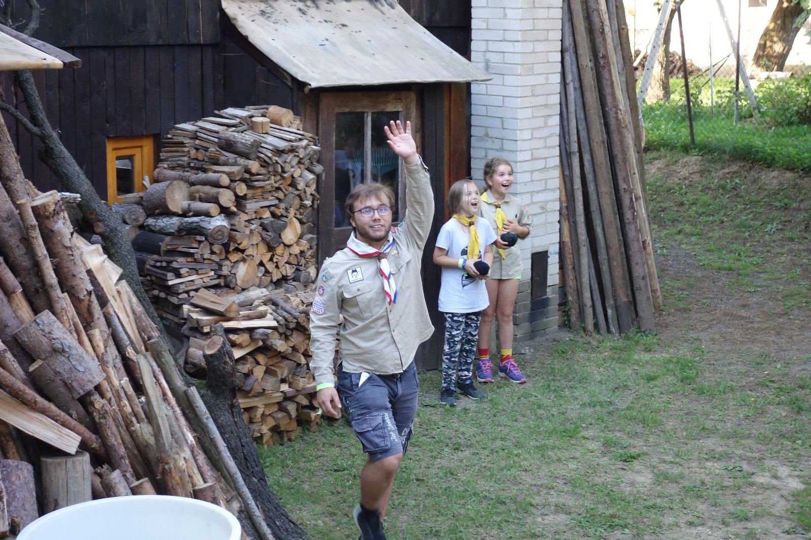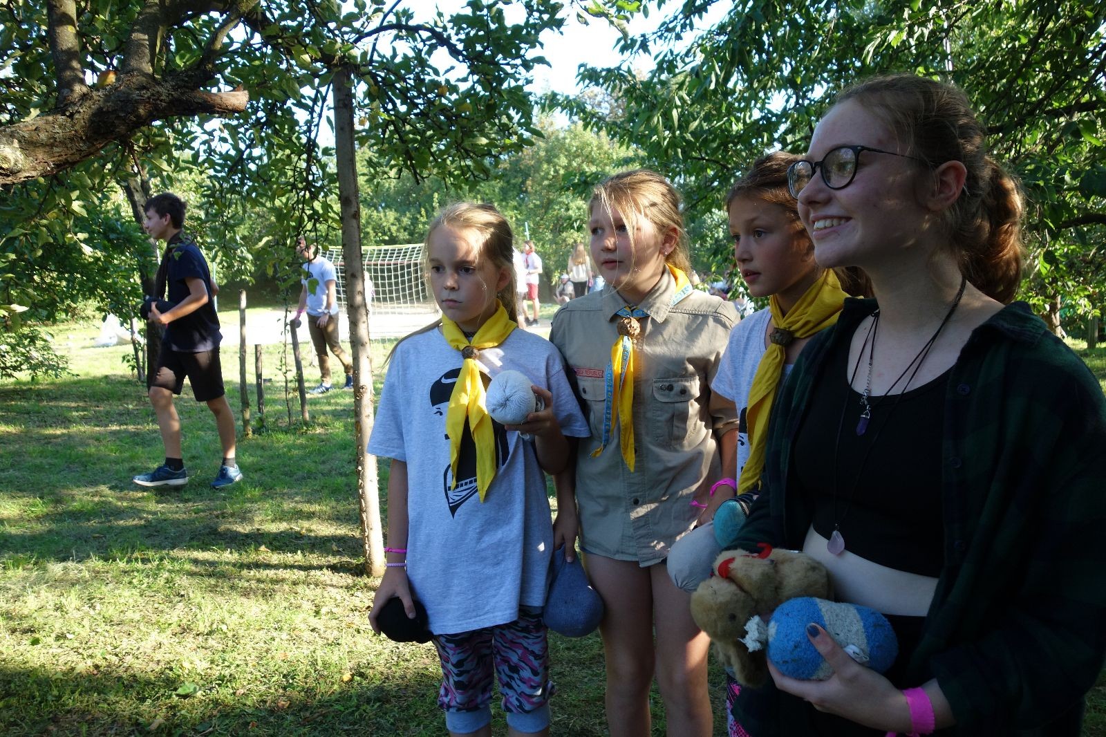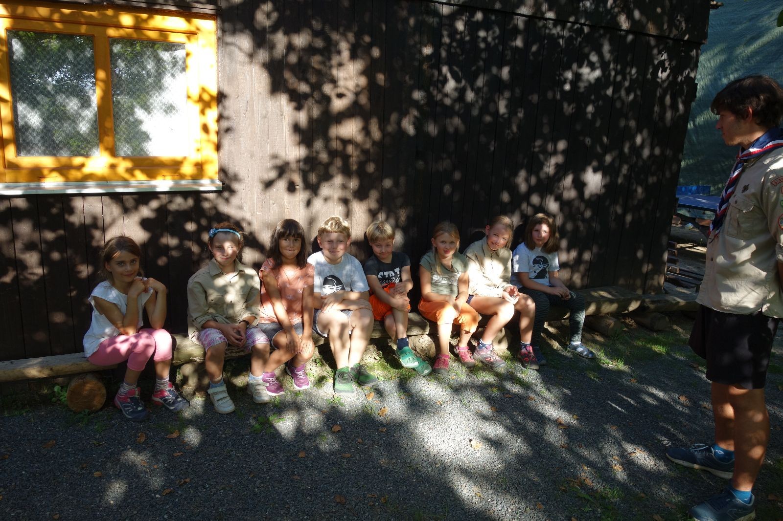 Po slavnostním nástupu v krojích nebo táborových tričkách a vyvěšení oddílové vlajky jsme se rozdělili na starší (Kudlanky, Sršni, Veverky, Vlci, Tygři) a mladší (Nováčci, Svišti, Tučňáci, Žraloci, Kobři, Sovičky), abychom si odděleně zahráli pár her na rozhýbání. Třeba molekuly 😊.