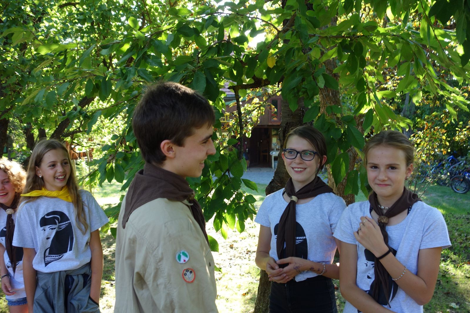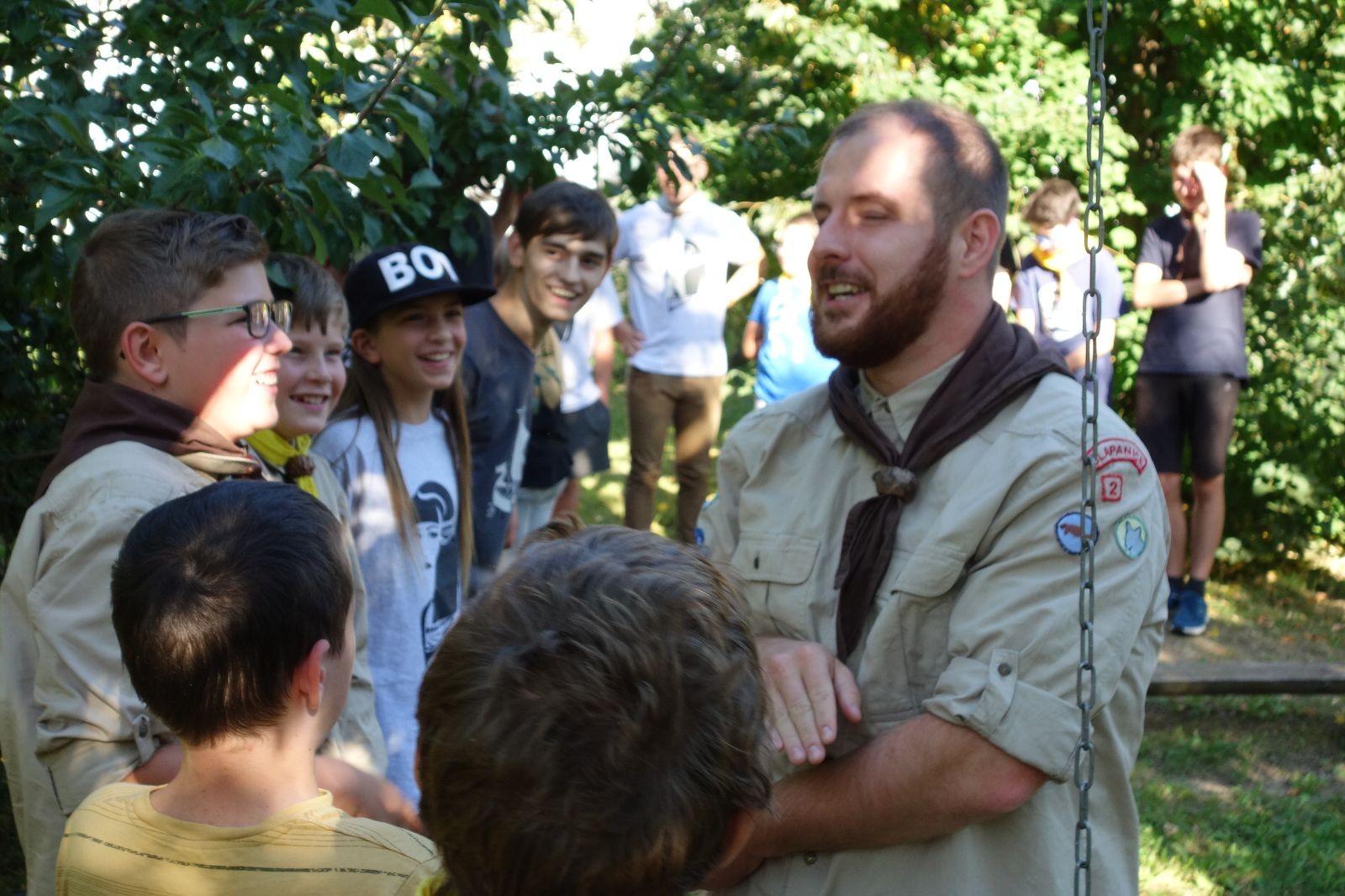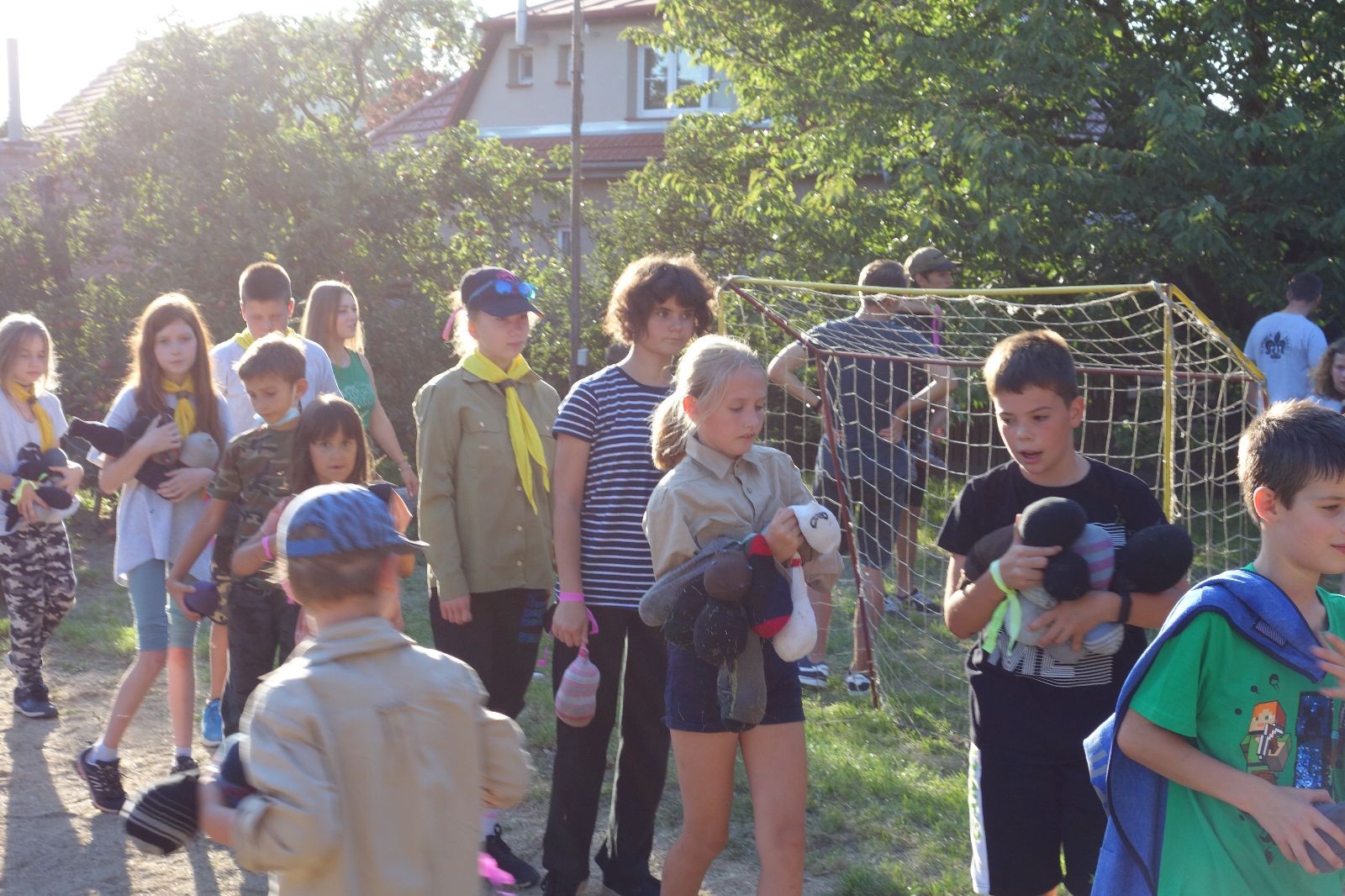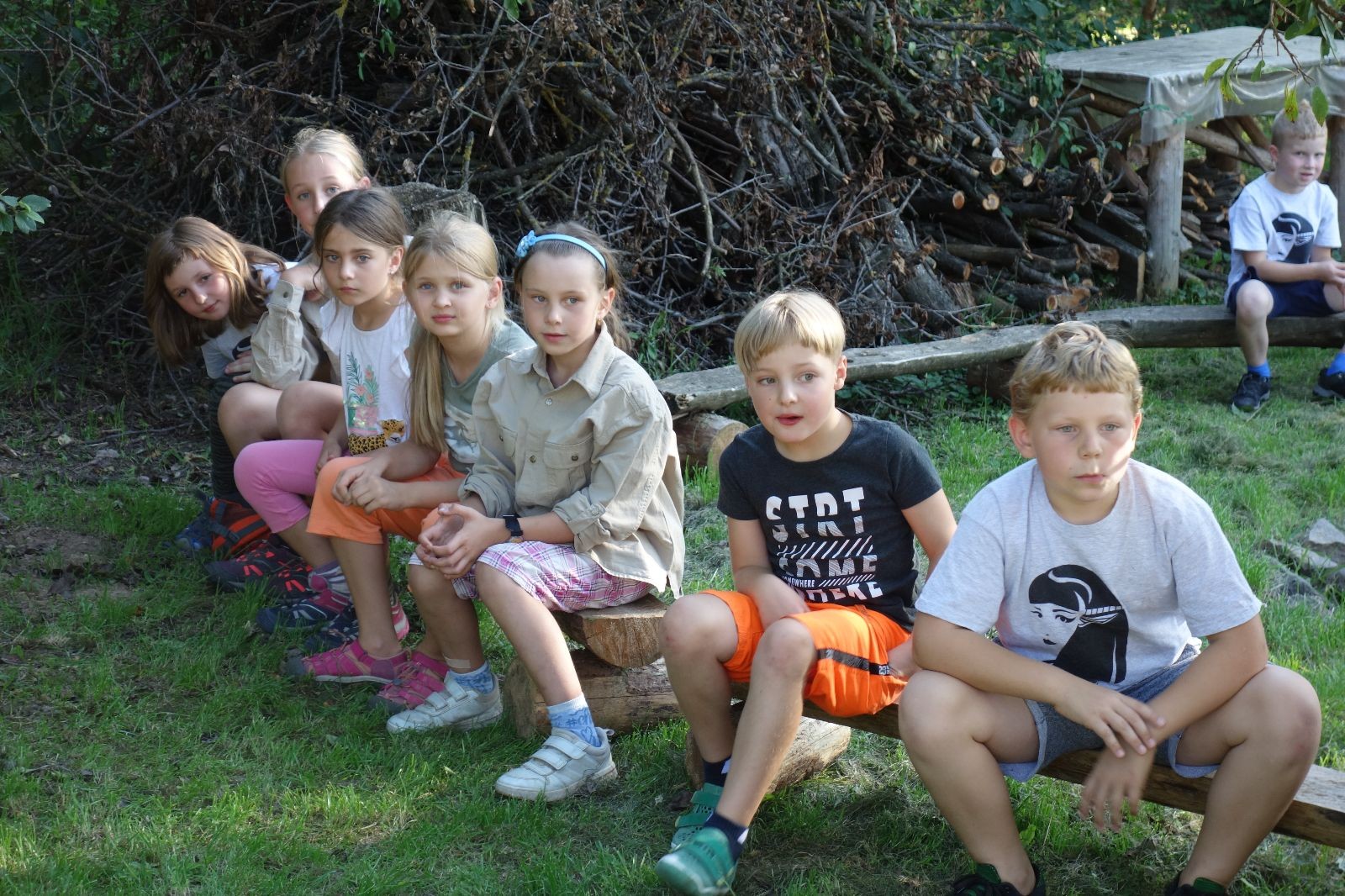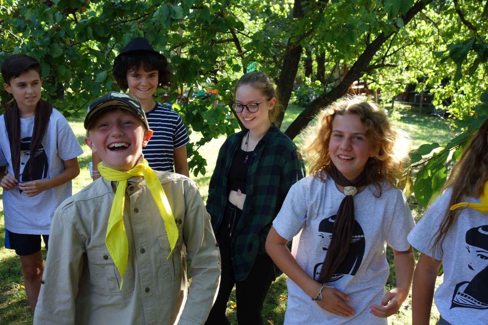 Po slavnostním nástupu v krojích nebo táborových tričkách a vyvěšení oddílové vlajky jsme se rozdělili na starší (Kudlanky, Sršni, Veverky, Vlci, Tygři) a mladší (Nováčci, Svišti, Tučňáci, Žraloci, Kobři, Sovičky), abychom si odděleně zahráli pár her na rozhýbání. Třeba molekuly 😊.
