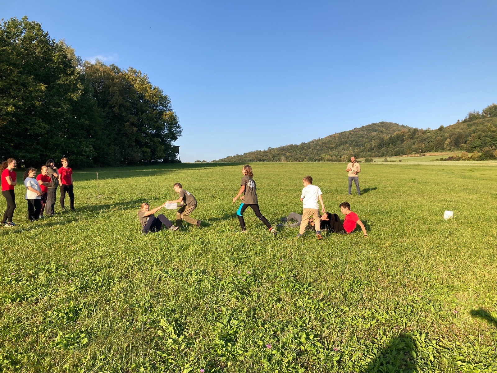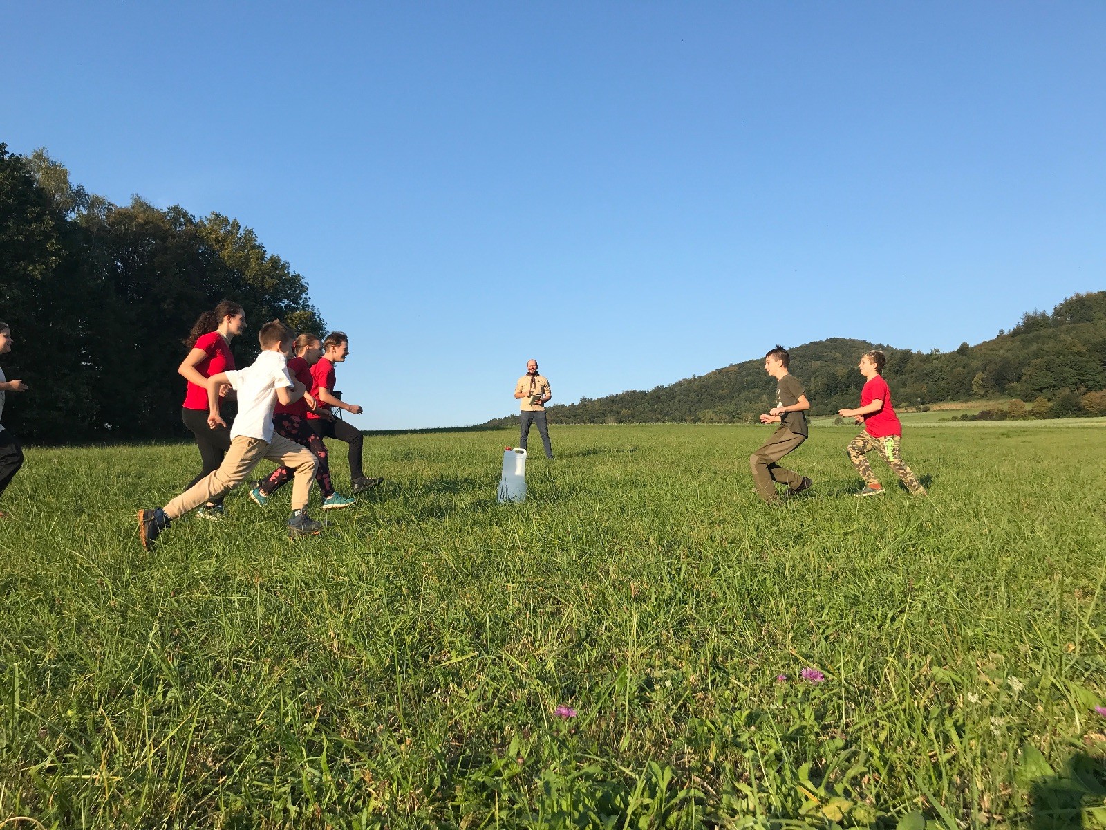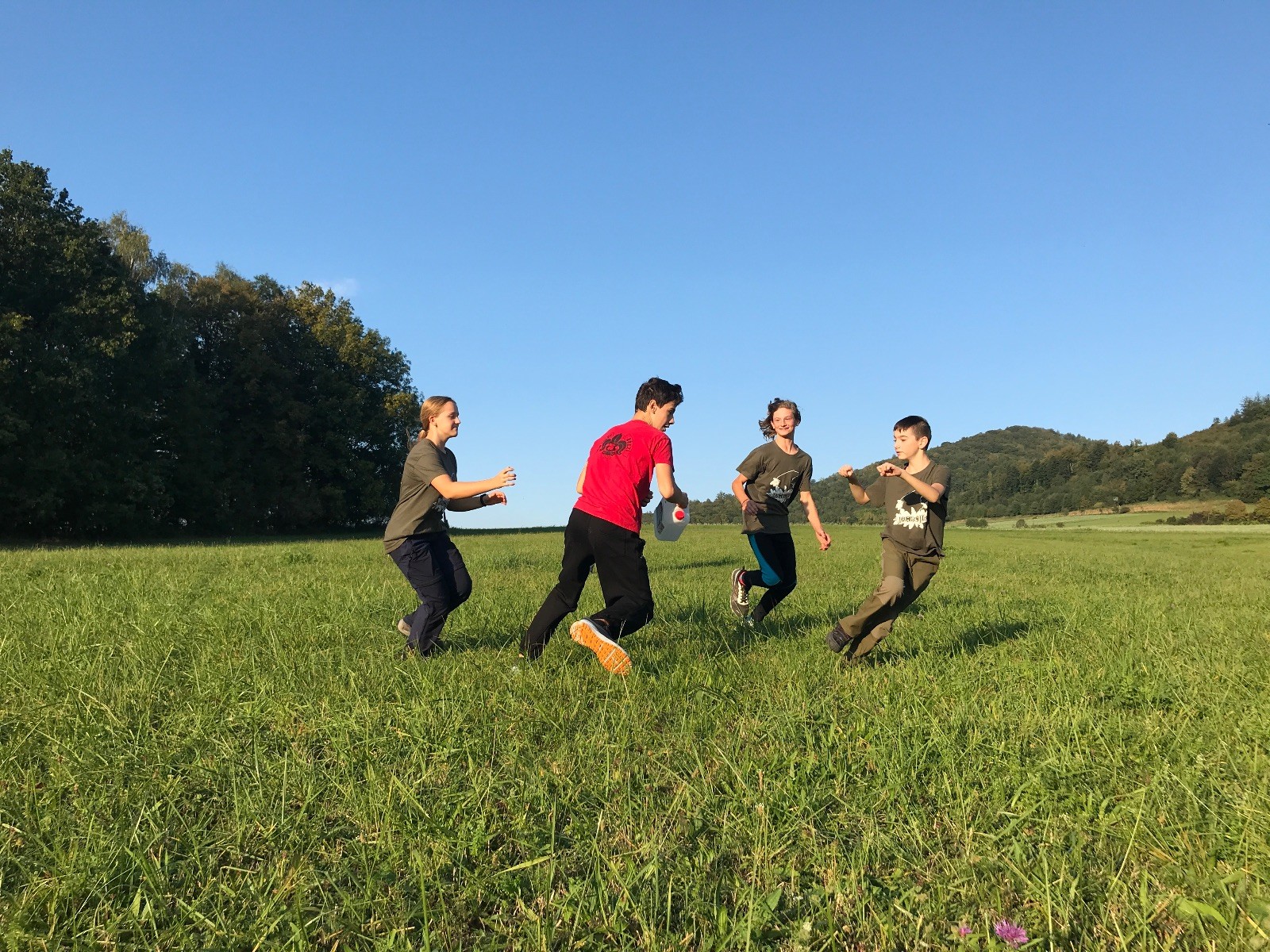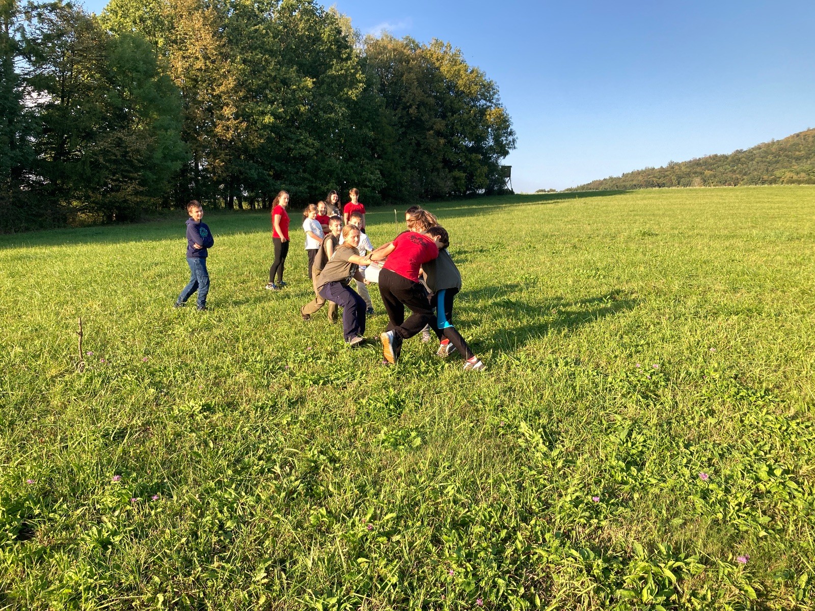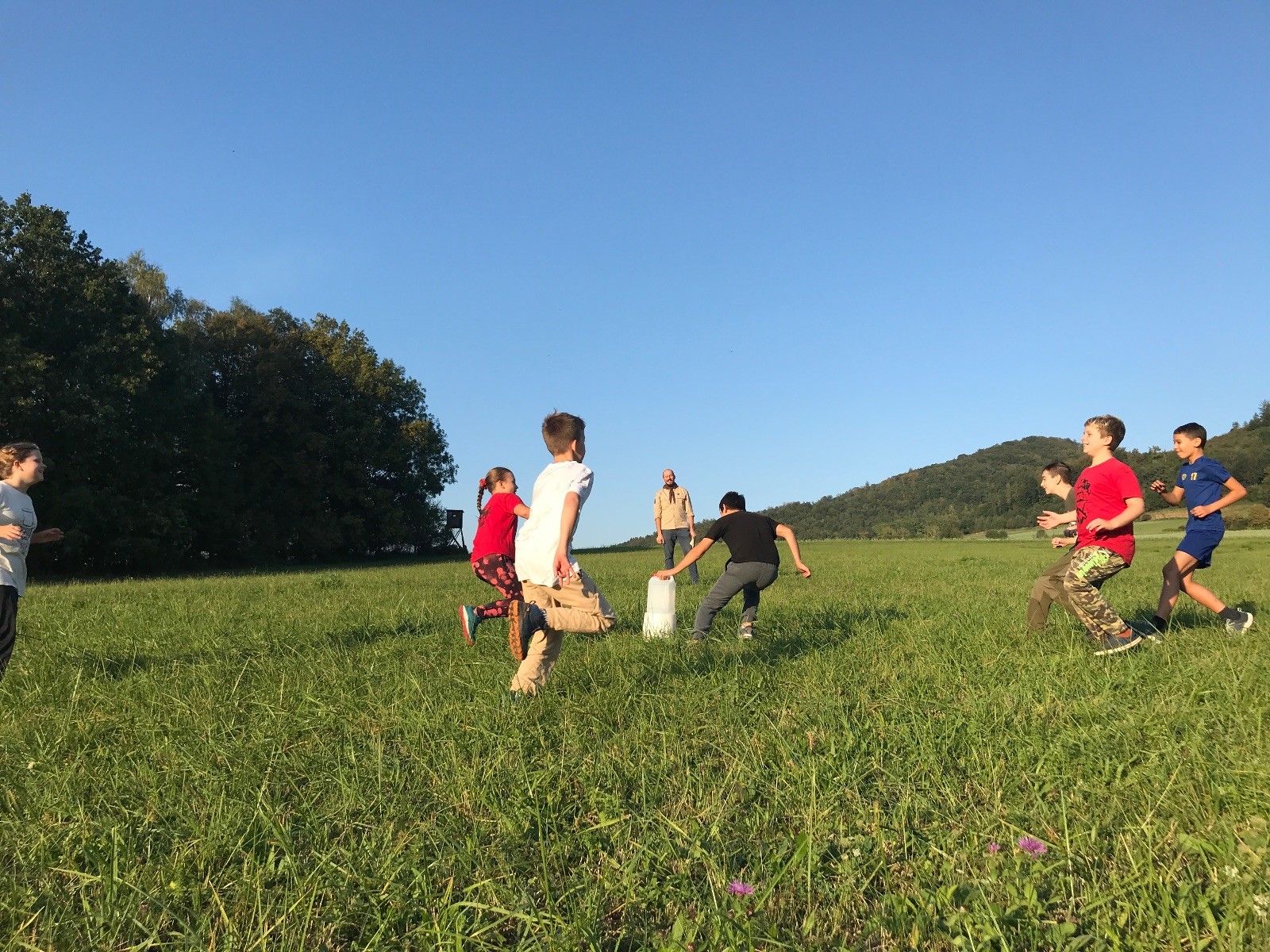 Startli jsme klasicky vyvěšením vlajky, nechali vzkaz pro opozdilce a vydali se na louku. Tam jsme si já a Páťa rozdělily týmy a podle kanystru, který byl položen doprostřed louky, jsme poznali, co nás čeká. Klepeto upřesnil, že se jedná o “plnotučný” kanystr, ale všichni staří pardáli podle pravidel pochopili, že to je úplně obyčejný hardcore. A ten mají Lišky opravdu v oblibě. Takže jsme se do toho s radostí vrhli. Začali jsme s čísly a pak přešli na verzi “vyběhne každý kdo…”. V průběhu se k nám připojili i Valča, Ondra a Janča. Zahráli jsme několik kol a v každém jsme o kanystr bojovali jako o život. Takže následný družiňák na odpočnutí celkem bodnul.